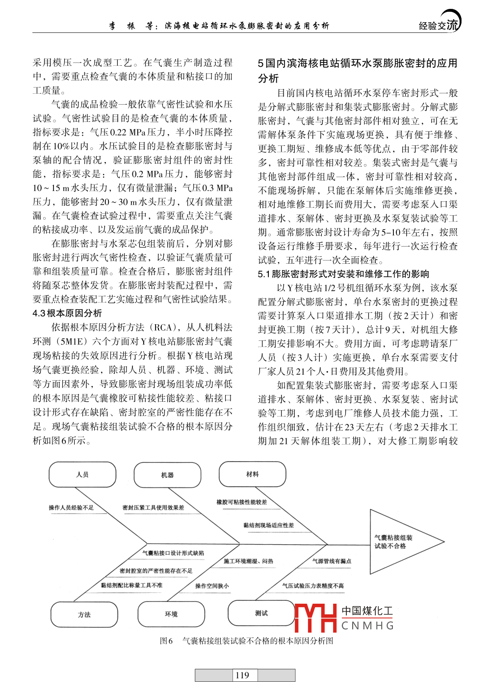 經(jīng)驗交流機電工程技術(shù)2015年第44卷第04期DOI: 10. 3969 /j. issn. 1009- -9492. 2015. 04. 032濱海核電站循環(huán)水泵膨脹密封的應用分析李振,易琳,張宇(中廣核工程有限公司,廣東深圳518124)摘要:從描述循環(huán)水泵膨脹密封氣囊技術(shù)改進入手,分析了膨脹密封現(xiàn)場組裝成功率低的原因,討論了不同形式膨脹密封對循環(huán)水泵安裝和維修:工作的影響,提出了國內(nèi)部分核電站循環(huán)水泵膨脹密封的應用建議。關鍵詞:核電站;循環(huán)水泵;膨脹密封;安裝;維修;應用中圖分類號: TM623.4文獻標識碼: A文章編號: 1009 - 9492(2015) 04- 0116-06Application & Analysis of the Inflatable Seal of the Circulating W aterPump in a Coastal Nuclear Power PlantLI Zhen,YI Lin, ZHANG Yu(China Guangdong Nuclear Power Engineering Co. Ltd, Shenzhen518124, China)Abstract: Based on the technical adaptation on the inflatable seal of circulating water pump, the reasons for the low success rate of theinflatable seal on site assembly has been described in the paper. The efects of diferent forms of the inflatable seal on the intallation andmaintenance work for the circulating water pump has also been analyzed and the application of the inflatable seal has been suggested insome domestic coastal nuclear power plants.Key words: nuclear power plant; circulating water pump; inflate seal; installation; maintenance; application1背景Y核電站1/2號機組循環(huán)水泵在安裝與調(diào)試期國內(nèi)濱海核電站循環(huán)水泵一般設置中空充氣間多次發(fā)生膨脹密封氣囊故障,后經(jīng)兩次技術(shù)改式膨脹密封,膨脹密封主要功能是水泵檢修期進解決了問題。本文總結(jié)了循環(huán)水泵膨脹密封故間,在不必抽掉泵入口渠道海水的情況下,通過障處理過程和氣囊粘接工藝的技術(shù)改進,分析了投入壓縮空氣,使密封膨脹與泵軸緊密貼合將海不同形式膨脹密封對循環(huán)水泵安裝和維修工作的水隔絕,便于泵軸封等部件的維護檢修,減少循影響以及國內(nèi)部分核電站循環(huán)水泵膨脹密封的應環(huán)水泵檢修工期與工作量。膨脹密封依據(jù)密封間用情況。隙尺寸、流體壓力、膨脹收縮率等進行結(jié)構(gòu)設2膨脹密封氣囊的現(xiàn)場更換計"。根據(jù)膨脹密封氣囊截面形狀,可分為圓形、Y核電站1/2號機組循環(huán)水泵按照水泵、齒輪梯形、矩形、0形等。按設計有無粘接口,可分箱、電機、潤滑油站等形式發(fā)貨,水泵結(jié)構(gòu)如圖為粘接式和整圈式。根據(jù)氣囊與密封其他部件的1所示。膨脹密封氣囊由某橡膠院分包設計供組裝形式,可定義為分解式和集裝式。膨脹密封貨,膨脹密封組件與泵芯組裝后發(fā)運。作為停車密封,在循環(huán)水泵設計選型時通常與主2012年3月下旬,1號機組循環(huán)水泵軸密封形式結(jié)合考慮。一般主軸密封選擇機械密(1CRFOO群Vr 1中國煤化工. 做膨脹密封氣密封的水泵,以配置集裝式膨脹密封為主,而選擇性試驗時THCNMH(:決定現(xiàn)場實施密填料密封的水泵,以配置分解式膨脹密封為好。封拆卸和氣囊更換,到4月上司,現(xiàn)場做了兩次復收稿日期: 2014-11-11116李振等:濱海核電站循環(huán)水泵膨脹密封的應用分析.經(jīng)驗交流裝,由泵廠人員和橡膠院人員實施,但兩次試驗都660 mm,截面形狀為“A”字形。最初氣囊陽、不合格。4月中旬橡膠院做技術(shù)改進,5月初按改陰端頭采用對接形式粘接(如圖2所示)。根據(jù)進的粘接方法現(xiàn)場重新粘接試驗,發(fā)現(xiàn)下層氣囊合陽、陰端頭不同位置的受力情況以及對粘接強度格,而上層氣囊不合格,最后經(jīng)兩次修整后成功。的不同要求,選用兩種膠黏劑。A型膠黏劑為可賽新1480,用于圖2所示的交叉線區(qū)域; B型膠黏劑為雙組份膠黏劑,組分一是葛洲壩牌LDJ-281,組分二是聚異氰酸酯,組分- -與組分二按10: 1的重量比配制,用于圖2所示斜線區(qū)域。從粘接區(qū)域看,陽端頭外圍接觸面積大,粘接質(zhì)量容易保證,而其他接觸面積較小,特別是交叉線區(qū)域,由于粘接時難以施加外力,粘接力不強,粘接質(zhì)量難以控制。1號機組循環(huán)水泵氣囊漏點多發(fā)生在此區(qū)域。另外,從膨脹密封組件結(jié)構(gòu)看(如圖3所示),其上、下層氣囊與隔環(huán)、支撐環(huán)、底座等組成氣腔,在隔環(huán)與支撐環(huán)之間,包括下層密封支撐環(huán)與密封底座之間為金屬面接觸,雖然氣囊可壓縮,但嚴密性能較難保證,成為氣密性的薄弱環(huán)節(jié)。橡膠院第一次粘接工藝改進方式是: 在氣囊的陽端頭與陰端頭對接處的內(nèi)部粘接一塊膠皮;端頭粘接時,陽端頭內(nèi)部放置--塊鹽芯作為支圖1循環(huán)水 泵結(jié)構(gòu)示意圖回顧1號機組循環(huán)水泵氣囊更換過程,從4月9日拆除密封開始,共經(jīng)歷5次復裝試驗,使用6根氣囊,歷時1個月。(a)陽端頭.(b)陰端頭2012年5月中旬,泵廠按照第一次改進工藝圖2陽陰端 頭示意圖組裝2號機循環(huán)水泵膨脹密封,發(fā)現(xiàn)密封氣密性仍不合格,為此要求橡膠院做第二次改進并在現(xiàn)場實施氣囊更換。在8月份,現(xiàn)場按新工藝裝配. 0型圈了兩臺循環(huán)水泵膨脹密封,4根氣囊粘接都獲成功。但在其后更換1號機循環(huán)水泵(1CRF002PO)膨脹密封氣囊(因供氣管線管嘴腐密封壓蓋蝕斷裂導致膨脹密封進水)時,由于泵廠新派人上部隔環(huán)員操作不熟練,又發(fā)生膨脹密封試驗不合格,最上層密封支撐環(hu