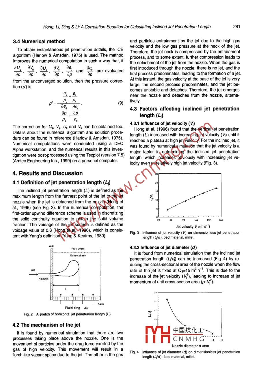 CHINA PARTICUOLOGY Vol. 3, No. 5, 279- 285, 2005A CORRELATION EQUATION FOR CALCULATING INCLINEDJET PENETRATION LENGTH IN A GAS-SOLID FLUIDIZED BEDRuoyu Hong'", Haibing Li, Jianmin Ding* and Hongzhong Li2'Department of Chemistry and Chemical Engineering, Soochow University, Suzhou 215006, P. A. China2Institute of Process Engineering, Chinese Academy of Sciences, Bejing 100080, P. A. China"Laboratory of Solid Waste Energy, Guangzhou Institute of Energy Conversion,Chinese Academy of Sciences, Guangzhou 510640, P. A. China*IBM, HYDA/050-3 C202, 3605 Highway 52 North, Rochester, MN 55901, USA*Author to whom correspondence should be adressed. E-mail: rhong@ suda.edu.cnAbstract Numerical simulation of gas-solid flow in a two-dimensional fuidized bed with an inclined jet was per-formed. The numerical model is based on the two-fluid model of gas and solids phase in which the solids constitutiveequations are based on the kinetic theory of granular flow. The improved ICE algorithm, which can be used for both lowand high-velocity fluid flow, were used to solve the model equations. The mechanism of jet formation was analyzed usingboth numerical simultions and experiments. The emergence and movement of gas bubbles were captured numericallyand experimentally. The influences of jet velocity, nozzle diameter, nozzle inclination and jet postion on jet penetrationlength were obtained. A semi-empirical expression was derived and the parameters were correlated from experimentaldata. The correlation equation, which can be easily used to obtain the inclined jet penetration length, was compared withour experimental data and published correlation equations.Keywords fluidized bed, jet, penetration length, two fluid model1. Introduction2. ExperimentalThe ash-agglomerating fluidized-bed coal gasification2.1 Experimental apparatus and bed materialstechnology is being developed for utilizing pulverized coalOur previous experimental apparatus (Hong et al., 1996)in an eficient and environmentally acceptable manner. For with only a vertical jet was modified to include an inclinedthis purpose, many problems related to multiphase hydro- jet, as shown in Fig. 1. The thickness of the two-dimensionaldynamics should be resolved. The inclined jet will be used fluidized bed is 25 mm and its width 314 mm. The width ofin the coal gasifier to reduce slag formation on the the central jet tube is 20 mm. In the separating zone, theV-shaped gas distributor. Among all the important hydro- angle between the tube surtace and the vertical direction isdynamic phenomena of the fluidized-bed gasifir, the jet 9 degree. At the bottom of the fuidized bed, there is a 45penetration lengh is the crux (Hong et al, 1996; Hong&L, degree angled dstributor with an aperture density of 1%.1996; Hong & Li, 1997; Hong et al., 2003; Hong et al., 2005;AlBlake et al, 1990; Merry, 1971). While our previous atten-tion was focused on vertical jet (Hong et al, 1996), doublejets (Hong et al, 2003) and downward jet (Hong et al,R|2005), inclined jet penetration will be scrutinized in thepresent investigation since the inclined jet has not been asmuch investigated as the other jets.0Our previous two-luid model (Hong et al, 2003; 2005),which has fewer model parameters, is used here in simu-lating the inclined jet in a gasifier. Because the jet velocityis high, the model equations are solved by the improvedICE (implicit continuum Eulerian) method at instantaneoustime steps. The motions of gas and solids were demon-strated from the simulations. The infuence of jet velocity,Fig. 1 Flow diagram of the 2-D experimental setup. (1 rotameters; 2V-shaped gas distributor; 3 2-D fluidized bed; 4 inclined gas jetnozzle diameter, inclination angle, and nozzle location on! camera; 7 gas com-the inclined jet penetration length was analyzed. Based on中國煤化工numerical simulation, a semi-empirical expression wasderived. The parameters of the expression were obtainedMillet,TYHCNMHGwereusedasfuby correlating experimental data and ilustrated with idization material respectively in the experiments. Theirmeasured data under various conditions.physical properties are shown in Table 1.280CHINA PARTICUOLOGY Vol. 3, No.5, 2005Table 1 Physical properties of bed materialswhere p.=P,ar and Ea=1.MaterialsMiletSilica sand 1# Silica sand 2#Momentum equations for phase k(k=g ors; 1=g or s; 1*k),T。/(mm)1.432.25(,0,)+.(,0.O,)= -&,Vp。+ B(0,-0,)+V.G+p.g.A% /(kgm3)878808817(2p.(kg.m-9)1 0421582The derivation of the two-phase model equations, thU(m-s~).611.78.determination of the model parameters and the solution ofUm/(m-s~)0.520.640.45these equations are given in detail by Hong & Li, (1996). Itwas also found that these equations could be simplified toThe incipient fuidization velocity (Um) in Table 1 was those of Davidson's (Hong et al, 1996). The model equa-obtained from measuring the bed pressure drop (△p) as a tions were solved previously by the improved IPSA methodfunction of fluidization velocity (U) when Op became in- (Hong et al., 1996). A computer program with this modeldependent of U.has been used to calculate the vertical jet penetrationlength (Hong et al, 1996). In the present study, the pro-2.2 Experimental operation rangegram was modified using the improved ICE method toThe central jet velocity (4) should be higher than the simulate the inclined jet penetration in a fluidized bed.particle terminal velocity (U), but not too high to cause3.2 Constitutional equationschanneling in the bed. The gas velocity above the gasdistributor should be high enough to ensure the incipient Gas-phase stress tensorfluidization of particles. The gas flow rate of the central jetand the two V-shaped distributors in the present experi-者。= 2a,4S。,(3ments are given in Table 2.where(4Table 2 Experimental parameters for measuring 4 (Un=1.5 ms-1 ,h0=270 mm)Solid-phase stress tensorParametersMilletSicasand1# Silia sand2#τ=[-P,+e5V U.j+2a,uS,.(5Nozzle diameter/mm 5,7,8,10 5,7,8,10 5, 8, 10Inclination ang