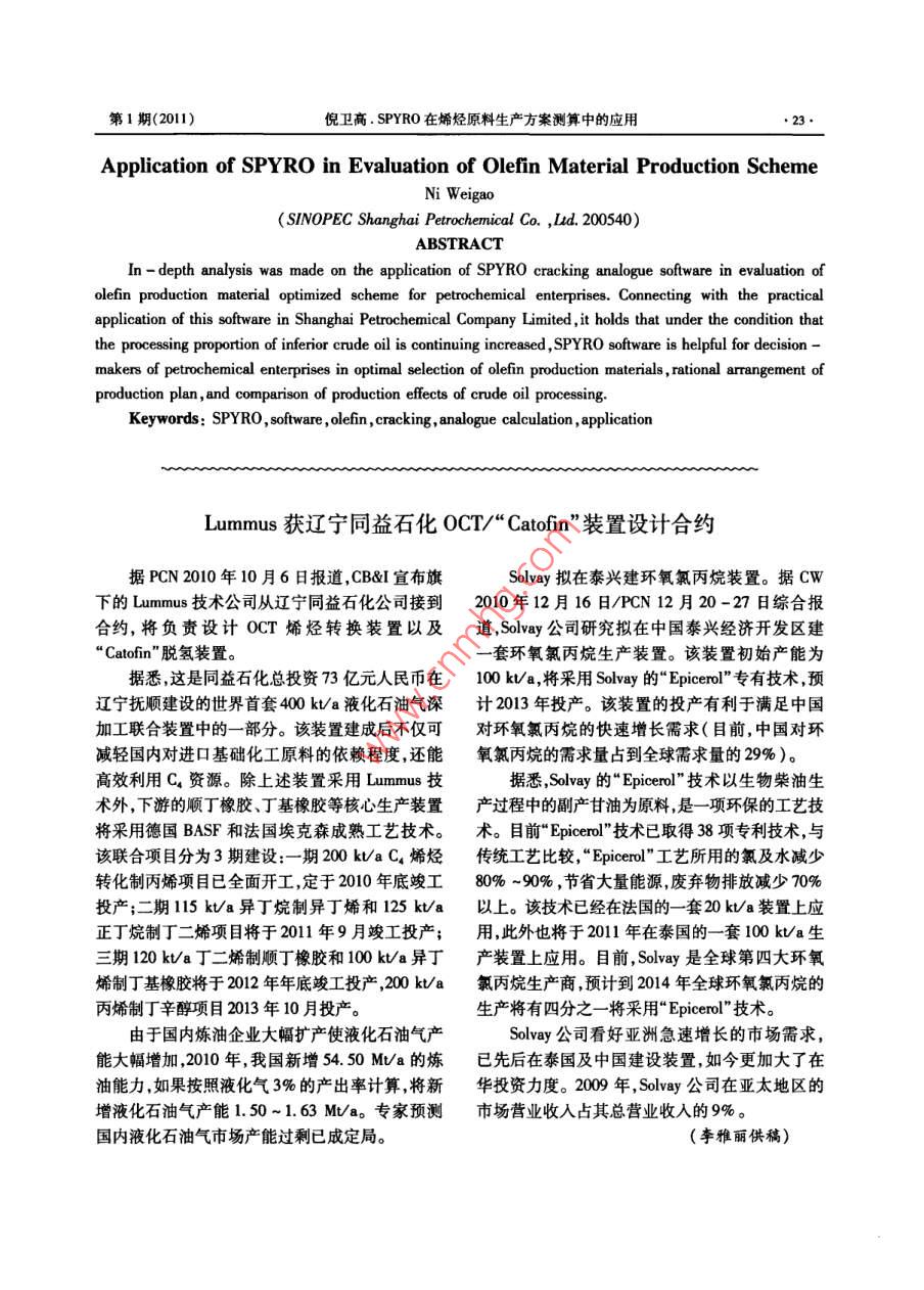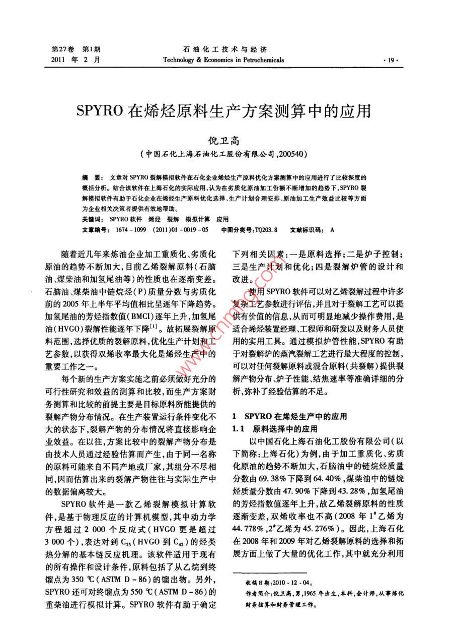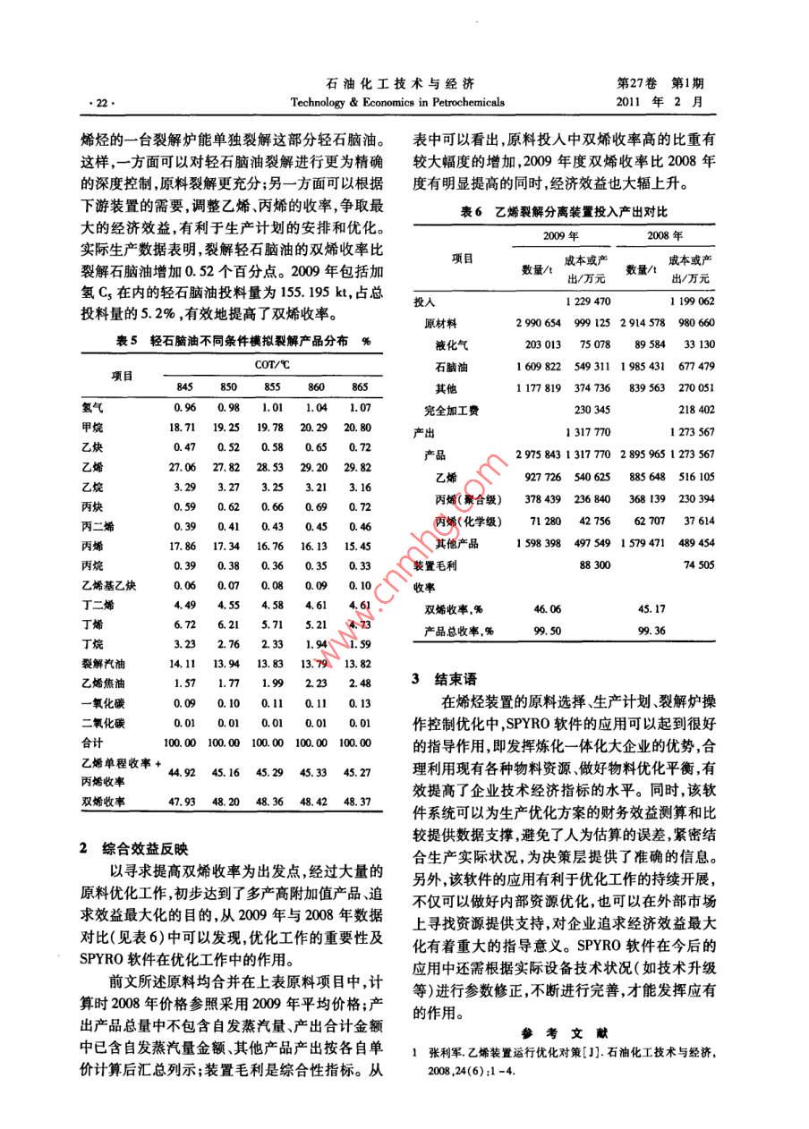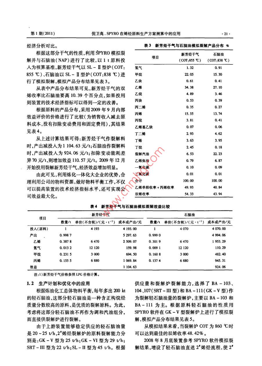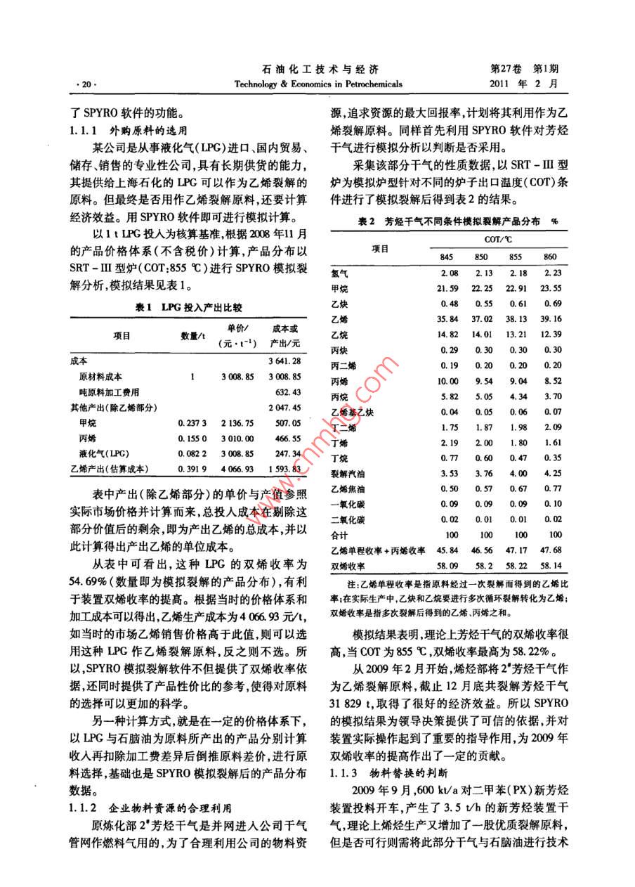 第27卷第1期石油化工技術與經(jīng)濟2011年2月Technology & Economics in Petrochemicals●19.SPYRO在烯烴原料生產(chǎn)方案測算中的應用倪衛(wèi)高(中國石化上海石油化工股份有限公司,200540)摘要:文章對SPYRO裂解模擬軟件在石化企業(yè)烯烴生產(chǎn)原料優(yōu)化方案測算中的應用進行了比較探度的概括分析。結合該軟件在上海石化的實際應用,認為在劣質化原油加工份額不斷增加的趨勢下,SPYRO裂.解模擬軟件有助于石化企業(yè)在烯烴生產(chǎn)原料優(yōu)化選擇、生產(chǎn)計劃合理安排、原油加工生產(chǎn)效益比較等方面為企業(yè)相關決策者提供有效地幫助。關鍵詞: SPYRO軟件 烯烴裂解模擬計算應用文章編號: 1674- 1099 (2011)01 -0019-05中圖分類號:TQ203.8 文獻標識碼: A隨著近幾年來煉油企業(yè)加工重質化、劣質化下列相關因素:一是原料選擇;二是爐子控制; .原油的趨勢不斷加大,目前乙烯裂解原料(石腦三是生產(chǎn)計劃和優(yōu)化;四是裂解爐管的設計和油、煤柴油和加氫尾油等)的性質也在逐漸變差。改進。石腦油、煤柴油中鏈烷烴(P)質量分數(shù)與劣質化使用SPYRO軟件可以對乙烯裂解過程中許多前的2005年上半年平均值相比呈逐年下降趨勢。復雜工藝參數(shù)進行評估并且對于裂解工藝可以提加氫尾油的芳烴指數(shù)值( BMCI)逐年上升,加氫尾供有價值的信息,從而可明顯地減少操作費用,是油( HVGO)裂解性能逐年下降”。故拓展裂解原適合烯烴裝置經(jīng)理、工程師和研發(fā)以及財務人員使料范圍,選擇優(yōu)質的裂解原料,優(yōu)化生產(chǎn)計劃和工用的實用工具。通過模擬爐管性能,SPYRO有助藝參數(shù),以獲得雙烯收率最大化是烯烴生產(chǎn)中的于對裂解爐的蒸汽裂解工藝進行最大程度的控制,重要工作之一??梢詫θ魏瘟呀庠匣蚧旌显?共裂解)提供裂每個新的生產(chǎn)方案實施之前必須做好充分的解產(chǎn)物分布、爐子性能、結焦速率等準確詳細的分可行性研究和效益的測算和比較,而生產(chǎn)方案財析,彌補了經(jīng)驗估算的不足。務測算和比較的前提主要是目標原料所能提供的裂解產(chǎn)物分布情況。在生產(chǎn)裝置運行條件變化不1 SPYRO 在烯烴生產(chǎn)中的應用大的狀態(tài)下,裂解產(chǎn)物的分布情況將直接影響企.1 原料選擇中的應用業(yè)效益。在以往,方案比較中的裂解產(chǎn)物分布是以中國石化上海石油化工股份有限公司(以由技術人員通過經(jīng)驗估算而產(chǎn)生,由于同一名稱下簡稱:上海石化)為例,由于加工重質化、劣質的原料可能來自不同產(chǎn)地或廠家,其組分不盡相化原油的趨勢不斷加大,石腦油中的鏈烷烴質量同,因而估算出來的裂解產(chǎn)物往往與實際生產(chǎn)中分數(shù)由 69. 38%下降到64. 40% ,煤柴油中的鏈烷的數(shù)據(jù)偏離較大。烴質量分數(shù)由47. 90%下降到43.28% ,加氫尾油SPYRO軟件是一款乙烯裂解模擬計算軟的芳烴指數(shù)值逐年上升,故乙烯裂解原料的性質件,是基于物理反應的計算機模型,其中動力學逐漸變差 ,雙烯收率也不高(2008年1" 乙烯為方程超過2 000個反應式(HVCO更是超過44. 778% ,2*乙烯為45. 276%)。因此,上海石化3 000個) ,表達對到C2s(HVGO到C2)的烴類在2008年和2009年對乙烯裂解原料的選擇和拓熱分解的基本鏈反應機理。該軟件適用于現(xiàn)有.展方面.上做了大量的優(yōu)化工作,其中就充分利用的所有操作和設計條件,原料包括了從乙烷到終餾點為350 C(ASTM D-86)的餾出物。另外,收稿日期:2010-12 -04。.SPYRO還可對終餾點為550 C( ASTM D- 86)的作者簡介:倪衛(wèi)高,男,1965年出生,本科,會計師,從事煉化重柴油進行模擬計算。SPYRO 軟件有助于確定財務櫝算和財務管理工作。石油化工技術與經(jīng)濟第27卷第1期●20.Technology & Economics in Petrochemicals2011年2月了SPYRO軟件的功能。源,追求資源的最大回報率,計劃將其利用作為乙1.1.1 外購原料的選用.烯裂解原料。同樣首先利用SPYR0軟件對芳烴某公司是從事液化氣(LPG)進口、國內(nèi)貿(mào)易、干氣進行模擬分析以判斷是否采用。儲存、銷售的專業(yè)性公司,具有長期供貨的能力,采集該部分千氣的性質數(shù)據(jù),以SRT-II型其提供給上海石化的LPG可以作為乙烯裂解的.爐為模擬爐型針對不同的爐子出口溫度(COT)條原料。但最終是否用作乙烯裂解原料,還要計算件進行了模擬裂解后得到表2的結果。經(jīng)濟效益。用SPYRO軟件即可進行模擬計算。表2芳烴千氣不同條件模擬裂解產(chǎn)品分布%以1 t LPG投人為核算基準,根據(jù)2008年11月coT/C的產(chǎn)品價格體系(不含稅價)計算,產(chǎn)品分布以項目85060SRT - II型爐( COT:855 C )進行SPYRO模擬裂氫氣2.08 2.13 2.18 2. 23解分析,模擬結果見表1。甲烷21.59 22.25 22.91 23. s5表1 LPG 投入產(chǎn)出比較乙炔0.48 0.55 0.61 0.69乙烯35.84 37.02 38.13 39. 16單價/成本或數(shù)量/t(元州產(chǎn)出/元乙烷14.8214.01 13.21 12. 39丙炔0.290.30 0. 300.30成本3641.28丙二烯0.19 0.20 0.20 0. 20原材料成本3 008.853 008. 85丙烯8.52噸原料加工費用632. 43丙烷5.82 5.05 4.34 3.70其他產(chǎn)出(除乙烯部分)2 047.45乙烯基乙炔0.040.07烷0.2373 2 136. 75507. 05丁二烯1.75 1.87 1.98 2.09丙0.1550 3 010.00466. 55丁烯2. 191.801.61液化氣(LPG)0.0822 3 008.85丁烷0.77 0.60 0.47 0.35乙烯產(chǎn)出(估算成本)0.3919 4 066.931 593.83裂解汽油3.534.25表中產(chǎn)出(除乙烯部分)的單價與產(chǎn)值參照乙烯焦油0.50 0.57 0.67 0.77