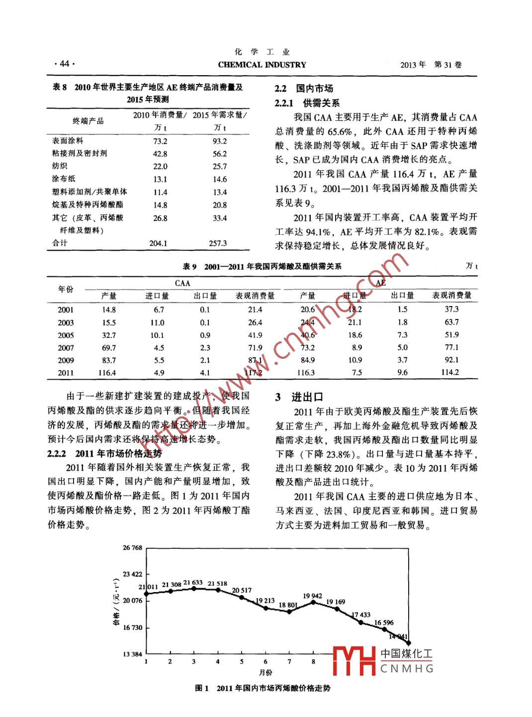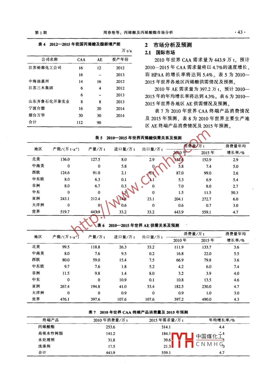 第31卷第1期化學(xué)工業(yè)2013年1月CHEMICAL INDUSTRY丙烯酸及丙烯酸酯市場(chǎng)分析周春艷,殷雪松2(1中國(guó)石油吉林石化公司研究院,吉林市132021;2中國(guó)石油吉林石化公司電石廠,吉林市132021)摘要:介紹了國(guó)內(nèi)外丙烯酸及丙烯酸酯的生產(chǎn)和市場(chǎng)現(xiàn)狀,預(yù)測(cè)了丙烯酸及丙烯酸酯的市場(chǎng)發(fā)展趨勢(shì),并提出發(fā)展建議。關(guān)鍵詞:丙烯酸;丙烯酸酯;市場(chǎng)調(diào)查;市場(chǎng)需求分析;預(yù)測(cè)文章編號(hào):1673-9647(2013)1-0041-05中圖分類號(hào):TQ2131文獻(xiàn)標(biāo)識(shí)碼:A丙烯酸是重要不飽和有機(jī)酸,丙烯酸酯是附2015年全球CAA市場(chǎng)需求將以年均47%的速度加值很高的石油化工深加工產(chǎn)品。丙烯酸主要用于增長(zhǎng),高純丙烯酸(HPAA或GAA)的年均增長(zhǎng)生產(chǎn)各種酯類,部分用于生產(chǎn)高吸水性樹脂,其率將達(dá)到54%。余作為共聚單體直接生產(chǎn)各種聚合物。丙烯酸及1生產(chǎn)現(xiàn)狀及預(yù)測(cè)丙烯酸酯近幾年發(fā)展迅速,2011年底全球酯化級(jí)11全球丙烯酸(CAA)和通用丙烯酸酯(AE)的產(chǎn)能分表1為2011年世界CAA和AE的產(chǎn)能。美國(guó)、別達(dá)到5328萬t/a和468.7萬t/a,我國(guó)產(chǎn)能分歐洲和中國(guó)(含臺(tái)灣)是全球主要CAA生產(chǎn)地區(qū),別達(dá)到123.7萬ta和141.6萬t/a。預(yù)計(jì)2010中國(guó)是近年CAA生產(chǎn)發(fā)展最快的國(guó)家。表12011年世界丙烯酸及酯生產(chǎn)能力國(guó)家公司及地址CAA/(萬ta-)美國(guó)6陶氏化學(xué)( Deer Park,TX)414(Taft, LA)18阿科瑪( Clear lake,TX)28巴斯夫( Free Port,TX)18StoHaas Monomer (Deer Park, TX)16.5墨西哥陶氏化學(xué)( Coatzacoalcos,Ⅴ aracruz)巴西巴斯夫( guaratinggueta, Sao Paulo)Proquigel Quimica SA(Candeias, Bahia)比利時(shí)巴斯夫( Antwerpen)法國(guó)阿科瑪( Carling- Saint, Avold)27.6德國(guó)巴斯夫( Ludwigshafen)陶氏化學(xué)(Bohn)66捷克Monmentic Performance Materials(Sokolov)俄羅斯AO Akrilat (Dzerzhinsk)中國(guó)煤化工表2為2012—2015年全球丙烯酸及丙烯酸酯收稿日期:2012CNMHG作者簡(jiǎn)介:周春艷(1971-),女,四川省人,高級(jí)工程師,主要新增產(chǎn)能統(tǒng)計(jì)資料1從事丙烯酸及酯和甲基丙烯酸甲酯的信息情報(bào)工作。業(yè)42CHEMICAL INDUSTRY013年第31卷續(xù)表國(guó)家公司及地址CAA/(萬ta)AE/(萬ta-)南非Sasol Dia Acrylates(Sasolburg11.5日本出光石化(知多)5三菱化學(xué)(四日)日本觸媒(姬路)大分化學(xué)(大分)6東亞合成(名古屋)11.4印尼日本觸媒(芝勒貢)韓國(guó)LG化學(xué)(麗珠)LG化學(xué)(麗水)128新加坡新加坡丙烯酸( Pulau sakra)馬來西亞巴斯夫(關(guān)丹)中國(guó)臺(tái)塑(臺(tái)灣林園)5.18.4臺(tái)塑(臺(tái)灣麥寮)10.8大陸123.7141.6合計(jì)532.8468.7表22012-2015年全球丙烯酸及丙烯酸酯新增產(chǎn)能裝置地點(diǎn)CAA產(chǎn)能/(萬ta)AE產(chǎn)能/(萬ta)投產(chǎn)年份沙特丙烯酸單體公司沙特朱拜勒14.514.52013沙特 Damman7石化公司沙特朱拜勒2014LG化學(xué)韓國(guó)麗水日本觸媒日本姬路印尼芝勒貢2013巴斯夫巴西巴伊亞16日本東亞合成日本大分2013合計(jì)12國(guó)內(nèi)表32011年我國(guó)丙烯酸及酯生產(chǎn)能力及產(chǎn)量迅速,201年起國(guó)內(nèi)迎來一個(gè)裝置建設(shè)的高峰企多產(chǎn)能力/(萬1產(chǎn)量個(gè)我國(guó)近年丙烯酸及丙烯酸酯的產(chǎn)能發(fā)展極其CAAAF期,其中包括淅江衛(wèi)星集團(tuán)2011年2月和8月分北京東方化工廠844848234別投產(chǎn)的兩套6萬 t/a Caa裝置、2012年投產(chǎn)的浙江衛(wèi)星公司21119940155968江蘇裕廊化工有限公司的16萬 t/a caa裝置和中沈陽(yáng)蠟化公司8812989000134700海油公司的14萬t/aCAA裝置等。截至20ll年江蘇裕廊化工205174805100283公司末,我國(guó)CAA產(chǎn)能已經(jīng)達(dá)到1237萬ta,AE產(chǎn)吉林石化公司3.23.5能達(dá)到141.6萬t/a。表3為2011年我國(guó)丙烯酸上海華誼丙烯26236779243552及丙烯酸酯的生產(chǎn)能力及產(chǎn)量。酸公司2011年我國(guó)CAA裝置的開工率為935%,AE南京揚(yáng)巴公司1615.5153000155500裝置的開工率為821%,較2010年分別提高3.1寧波臺(tái)塑公司16145070146365和07個(gè)百分點(diǎn)。山東齊魯石化0.6112開泰公司中國(guó)煤化工未來我國(guó)還有多套CAA裝置將陸續(xù)建成,表4山東正和集團(tuán)為2012—2015年我國(guó)丙烯酸及丙烯酸酯新增產(chǎn)能CNMHGO 36752蘭州石化公司預(yù)測(cè)2合計(jì)123.7141.611646151163160第1期周春艷等:丙烯酸及丙烯酸酯市場(chǎng)分析43表42012-2015年我國(guó)丙烯酸及酯新增產(chǎn)能2市場(chǎng)分析及預(yù)測(cè)萬ta21國(guó)際市場(chǎng)公司名稱CAAAE投產(chǎn)年份2010年世界CAA需求量為4439萬t,預(yù)計(jì)江蘇裕廊化工公司160122010205年CAA需求量將以47%的速度增長(zhǎng),而HPAA的增長(zhǎng)率將達(dá)到54%。表5為2010中海油惠州20122015年世界各地區(qū)丙烯酸供需情況及預(yù)測(cè)。江蘇三木集團(tuán)20122010年AE需求量為3972萬t,預(yù)計(jì)20102015年的年均增長(zhǎng)率將達(dá)到43%。表6為2010山東齊魯石化開泰實(shí)業(yè)2015年世界各地區(qū)AE供需情況及預(yù)測(cè)寧波臺(tái)塑2014表7為2010年世界CAA終端產(chǎn)品消費(fèi)情況煙臺(tái)萬華2014及2015年預(yù)測(cè),表8為2010年世界主要生產(chǎn)地合計(jì)l12區(qū)AE終端產(chǎn)品消費(fèi)情況及2015年預(yù)測(cè)。表520102015