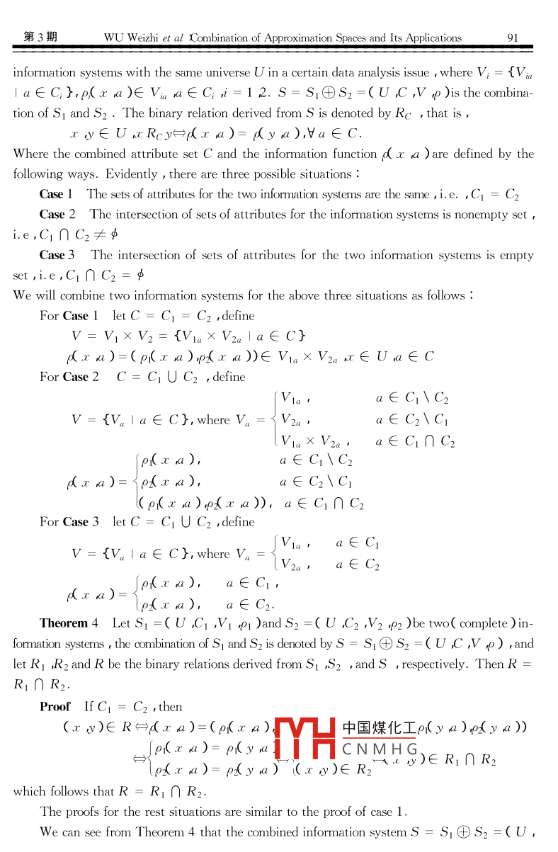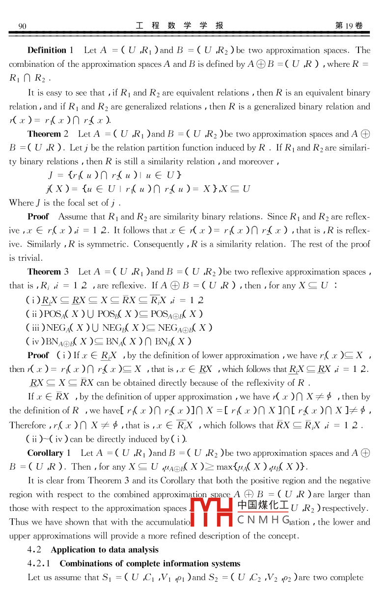 第19卷第3期工程數(shù)學(xué)學(xué)報Vol.19 No.32002年08月JOURNAL OF ENGINEERING MATHEMATICSAug.2002Article ID :1005-3085( 2002 )03-0086-09Combination of Approximation Spacesand Its ApplicationsWU Wei-zhil2 ,MI Ju-sheng13,ZHANG Wen-xiu'( 1-Institute for Information and System Sciences , Faculty of Science ,Xi' an Jiaotong University ,Xi' an 710049 ;2- Information College , Zhejiang Ocean University , Zhoushan , Zhejiang 316004 ;3-College of Mathematics and Information Sciences , Hebei Normal University , Shijazhuang 050016 )Abstract : The combinations of approximation spaces in the rough set theory are studied. Their applications to in-formation systems are discussed. It is proved that with the accumulation of more available information ,the lower and upper approximations will provide a more refine description of the concept.Keyworks : Rough sets ; Approximation spaces ; Data analysis ; Information systemsClassification : AMS 2000 )65L07 65N12CLC number :O235Document code : A1 IntroductionThe rough set theory1~3] ,a new mathematical approach to data analysis and data min-ing , has recently received wider attention on the research areas in both of the real -life applica-tions and the theory itself. In the rough set theory , the approximation space based on a binaryequivalence relation on a universe or a partition of the universe is a primitive notion. A approxi-mation space represents an available information in the rough set data analysis. The lower andupper approximation operators used to describe a given concept are constructed by this notion.The concept of accumulation of information has been studied extensively in different theo-ries of uncertain reasoning such as probability theory and D-S evidence theory4- -6]. Many ap-plications of rough set theory use information o中國煤化工rHence , informa-tion accumulation has received little attention inMYHCNMHGinmanyapcationsof the intelligent information systems , the available information may come from different* Received date 2001-03-12. Biography :WU Weizh( Born 1964 ) ,male , doctoral student , associate pro-fessor , majoring in rough set , random set and set valued stochas-tic process.第3期WU Weizhi et al Combination of Approximation Spaces and Its Applications87sources. Thus combination of information may be necessary to make decisions based on all theavailable information. With the accumulation of more information , the lower and upper ap-proximations will be able intuitively to provide a more refined description of the concept.This paper studies the combination of approximation spaces in the rough set theory. Wewill discuss a simple situation where all the pieces of information use the same universe. Its ap-plication to complete and incomplete information systems will be discussed in detail.2 Generalized Rough Set ModelsLet U denote a finite and nonempty set called the universe ,R∈U X U denote a binaryrelation on U. A binary relation may be more conveniently represented by a set-valued mappingr :U→2U: r(x)= {y∈U | xRy}r( x )consists of all R- related elements of x called the relation neighborhood of x and r is re-ferred to as the relation neighborhood operatorof R. The pairA =( U ,R )is referred to as ageneralized approximation space. If R is reflexive and symmetric , then R is referred to as asimilarity relation.Using the mapping r , we can define two unary set- theoretic operators R and R :RX={x∈UI八(x)∈X};RX={x∈U1r(x)∩X≠φ}The pair( RX ,RX )is referred to as the generalized rough set of X induced by R. R and R arereferred to as the generalized lower and upper approximation operators respectively. With therelation neighborhood operator r , we can define another mappingj 20→2u :j(X)= {x∈U|八(x)= X}.X∈UIt is easy to check that j satisfies the following properies :∪{j(X)1 x∈U}= U :X≠Y→j(X)∩j( Y)= φAny set X satisfyingj( X )≠φ is referred to as a local elementofj . LetJ = {XS U1j(X )≠φ},then{j( X )| X∈J }is a partition of the universe U ,thus we callj the relation parti-tion function of RTheorem 1 If R is a reflexive binary relation , thenJ = {(u)lu∈U};((u))Er(u), Vu∈UProof It is evidently from the definitionof j thatX∈J if and onlyifX∈{(u)| u∈U}ThereforeJ={r(u)|u∈U}For all u∈Uandx∈j(r( u )) ,it isclear thatr(x )= r( u ). By the reflexivity of R,wehavethatx∈r(x),thenx∈r(u),whichfollowsthatj(r(u))Sr(u).The generalized lower and upper appoximat中國煤化工d by the relation par-tition function j ,and vice versa[ 7]:YHCNMHGRX=∪{j(Y)1Y∈X}RX=∪{j(Y)|Y∩X≠φ}j(X)= RX\∪{RY | YCX}If( U 20 P )is a probability space and r is a reflexive relation on U , define88工程數(shù)學(xué)學(xué)報第19卷m( X)= P(j(X)).B(X)= P(RX ),L( X)= P( RX )Then we know from[ 7 ]that m is a mass function on U ,B and L are belief and plausible func-tions defined on U ,moreover ,any belief function defined on U can be represented by a proba-bility measure of a lower approximation with respect to some approximation space.Based on the lower and upper approximationsof a set X E U , the universe U can be di-vided into three disjoint regions , the positive region POS( X ) , the bounded region or thedoubtful region BN( X ) ,and the negative region NEGA( X ) :POS,( X)= R(X )BN( X)= R(X)- R(X )NEGA( X)= U- R( X)One can say with certainty that any element x∈POSA( X )belongs to X , and that any ele-mentx∈NEGA( X )does not belong to X , but one can not decide with certainty whether ornot an elementx∈BNa( X )belongs toX .3 Approximation of Sets in Information SystemsThe rough set model is useful in the analysis of data presented in terms of an ( complete )information system. An ( complete ) information system can be defined by a quadruple S =(UA,Vp).WhereU is a nonempty finite set of objects called universe ;A is a nonempty finite set of attributes ;V= {Va| a∈A },Va is a nonempty set of values of an attributea∈A ;ρ :U X X→V is an information function.The notion o