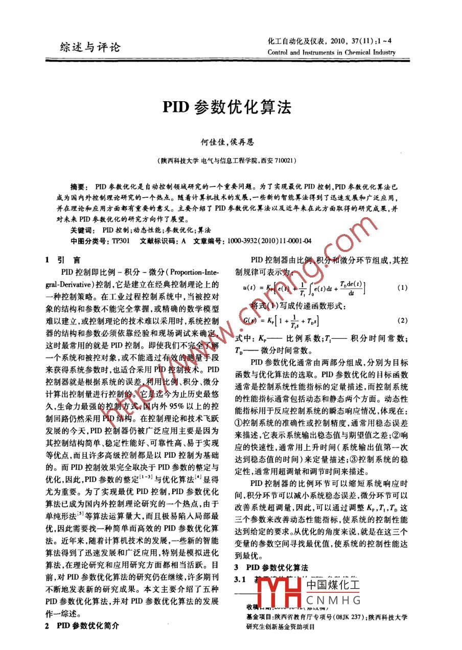 化工自動(dòng)化及儀表,2010, 37(1);1 -4綜述與評(píng)論Control and Instruments in Chemical IndustryPID參數(shù)優(yōu)化算法何佳佳,侯再恩(陜西科技大學(xué)電氣與信息工程學(xué)院,西安71021)摘要: PI參教優(yōu)化是 自動(dòng)控制領(lǐng)域研究的一個(gè)重要問題。為了實(shí)現(xiàn)最優(yōu)PID控制,PID參教優(yōu)化算法巳成為國(guó)內(nèi)外控制理論研究的一個(gè)熱點(diǎn)。隨著計(jì)算機(jī)技術(shù)的發(fā)展,一些新的智能算法得到了迅速發(fā)展和廣泛應(yīng)用,.并在理論和應(yīng)用方面都有重要的意義。主要介紹了PID參敏優(yōu)化算法以及近年來在此方面取得的研究成果,并對(duì)未來PID參數(shù)優(yōu)化的研究方向作了展望。關(guān)鍵詞: PID 控制;動(dòng)態(tài)性能;參數(shù)優(yōu)化;算法中圈分類號(hào): TP301文獻(xiàn)標(biāo)識(shí)碼:A 文章編號(hào): 1003020120100010PID控制器由比例、積分和微分環(huán)節(jié)組成,其控1引言PID控制即比例-積分-微分( Proportion-Inte-制規(guī)律可表示為:gal-Deivative)控制,它是建立在經(jīng)典控制理論上的() =K[()+卡[(cu+oud()]-種控制策略。在工業(yè)過程控制系統(tǒng)中,當(dāng)被控對(duì)將式(1)寫成傳遞函數(shù)形式:象的結(jié)構(gòu)和參數(shù)不能完全掌握,或精確的數(shù)學(xué)模型難以建立,或控制理論的技術(shù)難以采用時(shí),系統(tǒng)控制C(x) =K,[1+亦+叫(2)器的結(jié)構(gòu)和參數(shù)必須依靠經(jīng)驗(yàn)和現(xiàn)場(chǎng)調(diào)試來確定,式中: K,--比例系數(shù);T-積分時(shí)間常 數(shù);這時(shí)最常用的就是PID控制。即使我們不完全了解T,- -微分時(shí)間常 數(shù)。-個(gè)系統(tǒng)和被挖對(duì)象,或不能通過有效的測(cè)量手段PID參數(shù)優(yōu)化通常由兩部分組成,分別為目標(biāo)來獲得系統(tǒng)參數(shù)時(shí),也適合采用PID控制技術(shù)。PID函數(shù)與優(yōu)化算法的選取。PID 參數(shù)優(yōu)化的目標(biāo)函數(shù)控制器就是根據(jù)系統(tǒng)的誤差,利用比例、積分、微分通常是控制系統(tǒng)性能指標(biāo)的定最描述,而控制系統(tǒng)計(jì)算出控制量進(jìn)行控制的。它是迄今為止歷史最悠的性能指標(biāo)通常包括動(dòng)態(tài)和靜態(tài)兩個(gè)方面。動(dòng)態(tài)性久,生命力最強(qiáng)的控制方式,國(guó)內(nèi)外95%以上的控能指標(biāo)用于反應(yīng)控制系統(tǒng)的瞬態(tài)響應(yīng)情況,體現(xiàn)在:制回路仍然采用PID結(jié)構(gòu)。在控制理論和技術(shù)飛躍①控制系統(tǒng)的準(zhǔn)確性或控制精度,通常用穩(wěn)態(tài)誤差發(fā)展的今天, PID控制器仍被廣泛應(yīng)用主要是因?yàn)閬砻枋?它表示系統(tǒng)輸出穩(wěn)態(tài)值與期望值之差;②晌其控制結(jié)構(gòu)簡(jiǎn)單穩(wěn)定性能好、可靠性高、易于實(shí)現(xiàn)應(yīng)的快速性,通常用上升時(shí)間(系統(tǒng)輸出值第一次等優(yōu)點(diǎn),而且許多高級(jí)控制都是以PID控制為基礎(chǔ)達(dá)到穩(wěn)態(tài)值的時(shí)間)來定量描述;③控制系統(tǒng)的穩(wěn)的。而PID控制效果完全取決于PID參數(shù)的整定與定性,通常用超調(diào)量和調(diào)節(jié)時(shí)間來描述。優(yōu)化,因此,PID參數(shù)的整定"-1與優(yōu)化算法'I顯得PID控制器的比例環(huán)節(jié)可以縮短系統(tǒng)響應(yīng)時(shí)尤為重要。為了實(shí)現(xiàn)最優(yōu)PID控制,PID參數(shù)優(yōu)化間,積分環(huán)節(jié)可以減小系統(tǒng)穩(wěn)態(tài)誤差,微分環(huán)節(jié)可以算法已成為國(guó)內(nèi)外控制理論研究的一個(gè)熱點(diǎn),由于改善系統(tǒng)超調(diào)量,因此,可以通過調(diào)整Kp,TI,Tp這單純形法'|等算法運(yùn)算量大,而且極易陷入局部最三個(gè)參數(shù)來改善動(dòng)態(tài)性能指標(biāo),使系統(tǒng)的控制性能優(yōu),因此需要找- -種簡(jiǎn)單而高效的PID參數(shù)優(yōu)化算達(dá)到給定的要求。從優(yōu)化的角度來說,就是在這三個(gè)法。近年來,隨著計(jì)算機(jī)技術(shù)的發(fā)展,一些新的智能變量的參數(shù)空間尋找最優(yōu)值,使系統(tǒng)的控制性能達(dá)算法得到了迅速發(fā)展和廣泛應(yīng)用,特別是模擬進(jìn)化到最優(yōu)。算法,在理論研究和應(yīng)用研究方面都相當(dāng)活躍。目3 PID參數(shù)優(yōu)化算法前,對(duì)PID參數(shù)優(yōu)化算法的研究仍在繼續(xù),許多期刊中國(guó)煤化工不斷地發(fā)表新的研究成果。本文主要介紹了五種PID參數(shù)優(yōu)化算法,并對(duì)PID參數(shù)優(yōu)化算法的發(fā)展收J(rèn)TYCHCNMHG作一綜述?;痦?xiàng)目:陜西省教廳專項(xiàng)號(hào)(08]K 237);陜西科技大學(xué)2 PID 參數(shù)優(yōu)化簡(jiǎn)介研究生創(chuàng)新基金資助項(xiàng)目●2.化工自動(dòng)化及儀表第37卷遺傳算法(Genetic Algoithm, GA)是一種新發(fā)覓食的螞蟻在自己經(jīng)過的路上留下一定數(shù)量的信息展起來的優(yōu)化算法,它起源于60年代對(duì)自然和人工素,信息素一方面會(huì)隨著時(shí)間的流逝而揮發(fā),另一方自適應(yīng)系統(tǒng)的研究,是模擬生物在自然環(huán)境中的遺面,當(dāng)有其他的螞蟻再次經(jīng)過該路徑時(shí)會(huì)再次留下傳和進(jìn)化進(jìn)程而形成的一種自適應(yīng)全局優(yōu)化慨率搜信息素以加強(qiáng)該處的信息素。