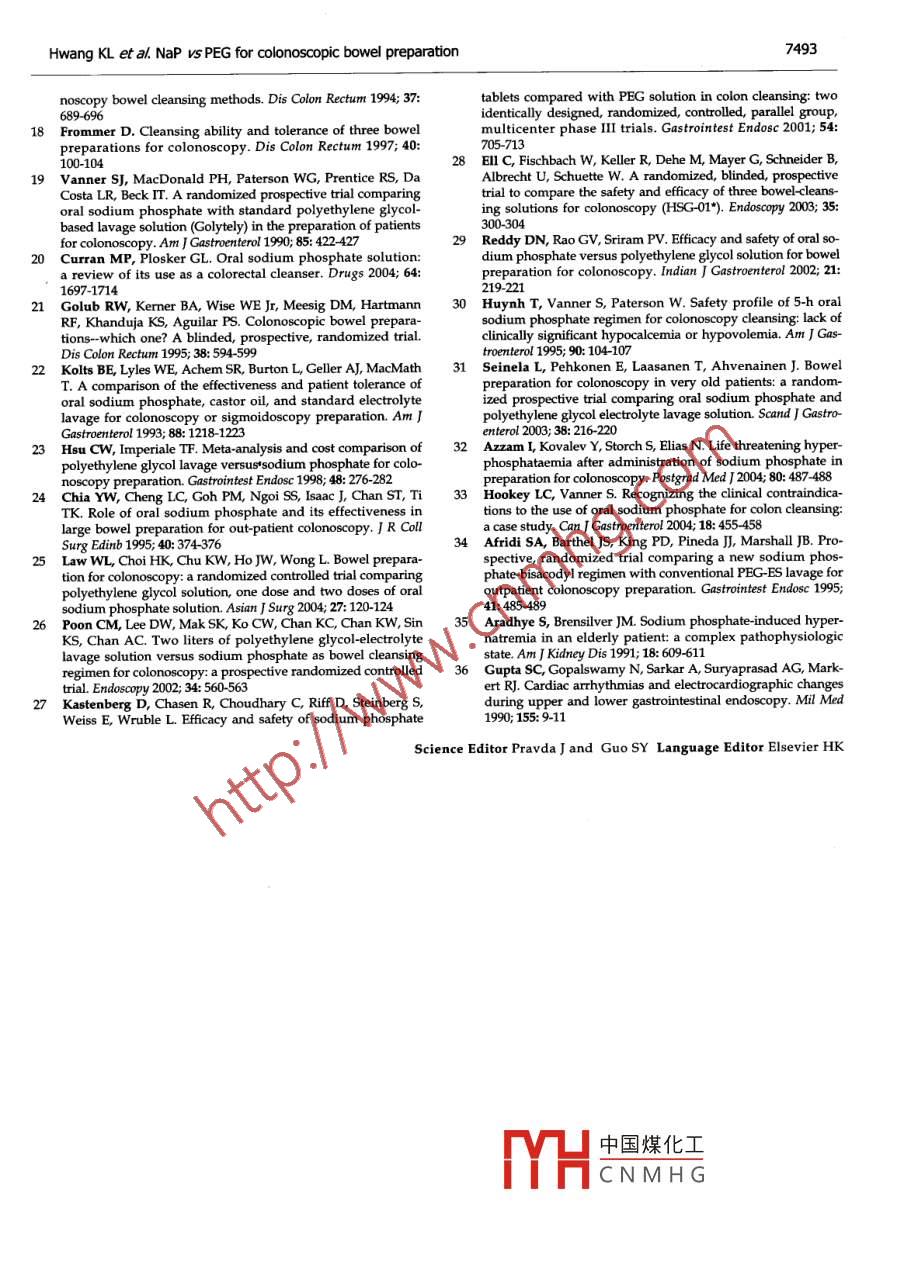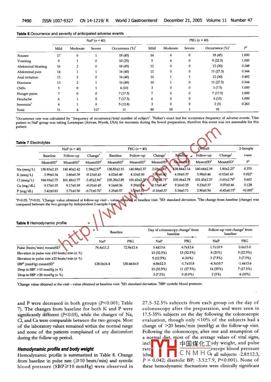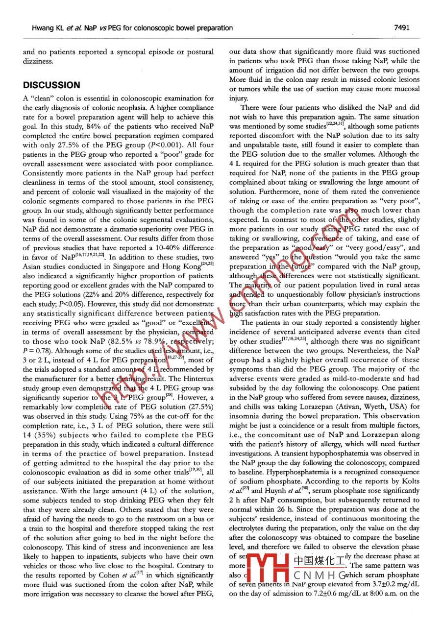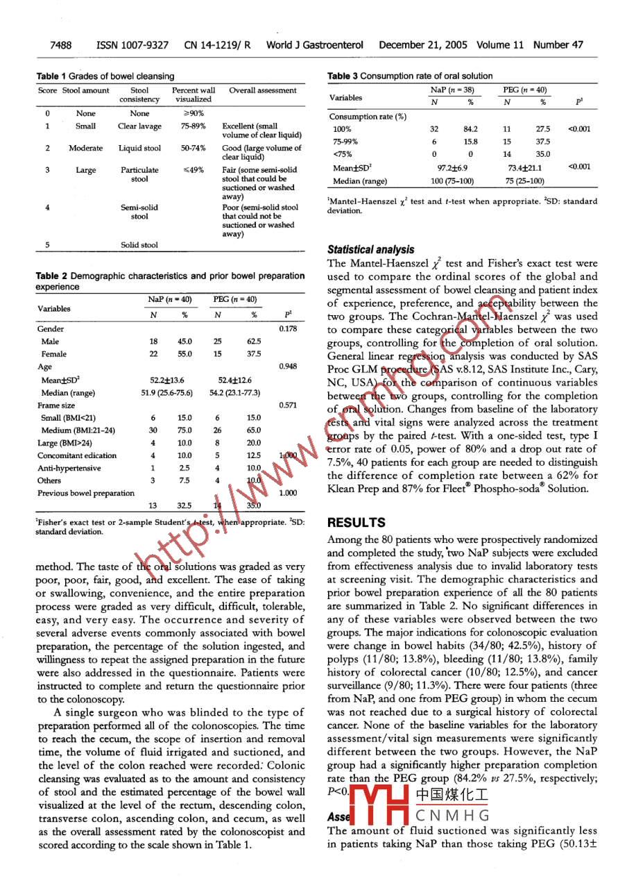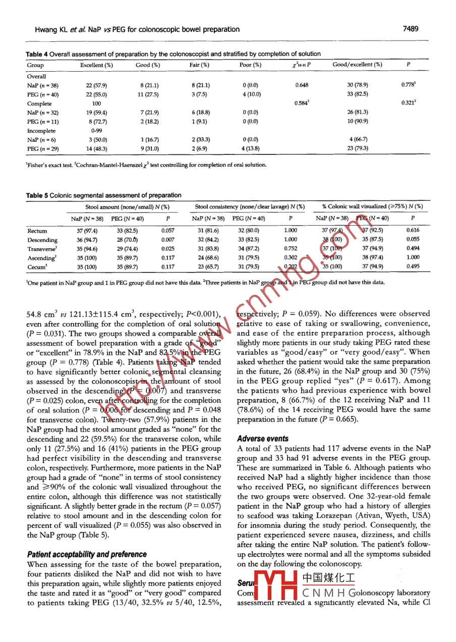 PO Box 2345, Beijing 100023, ChinaWorld I Gastroenterol 2005;11(47:7486-7493www.wjgnet.comWorld Journal of Gastroenterology ISSN 1007-9327wjg@wignet.comELSEVIER◎2005 The wjG Press and Elsevier Inc. All rights reserved.●CLINTCAL RESEARCH●Prospective rando mized comparison of oral sodiumphosphate and polyethylene glycol lavage for colonoscopypreparationKai-in Hwang, Wlliam Tzu-Liang Chen, Koung-Hong Hsiao, Hong-Chang Chen, Ting-Ming Huang, Chien-Ming Chiu,Ger-Haur HsuKai-Lin Hwang, Department of Public Health, Chung Shantransverse (94.6% vs 74.4%, P = 0.025) colon. lightlyMedical University, Taichung 402, Taiwan; Center for Clinicalmore patients graded the taste of NaP as "good" or "veryTrials, ChangHua Christian Hospital, Changhua 500, Taiwan,good" compared to the PEG patients (32.5% Vs 12.5%;ChinaP = 0.059). Patients' willingness to take the same prepa-William Tzu-Liang Chen, Koung-Hong Hsiao, Hong-Changration in the future was 68.4% in the NaP compared toChen, Ting-Ming Huang, Chien-Ming Chiu, Ger-Haur Hsu,75% in the PEG group (P = 0.617). There was a signif-Division of Colorectal Surgery at ChangHua Christian Hospital,cant increase in serum sodium and a significant decreaseChanghua 500, Taiwan, ChinaThis study was conducted at the Division of Colorectal Surgery atin phosphate and chloride levels in NaP group on the dayfollowing the colonoscopy without any dlinical sequelae.ChangHua Christian Hospital, Changhua 500, Taiwan, ChinaCorrespondence to: Dir. William Tzu-Liang Chen, Division ofProlonged (>24 h) hemodynamic changes were also ob-Colorectal Surgery, ChangHua Christian Hospital, 135 Nanhsiaoserved in 20-35% subjects of either group.Street, Changhua, 500, Taiwan, China. 37599@cch.org.twTelephone: +886- 4-7238595 Fax: +886-4-7227945CONCLUSION: Both bowel cleansing agents provedReceived: 2005-04-07Accepted: 2005-07-08to be similar in safety and effectiveness, while NaP ap-peared to be more cost-effective. After identifying andexcluding patients with potential risk factors, sodiumphosphate should become an alternative preparation forAbstractpatients undergoing elective colonoscopy in the Taiwan-AIM: To compare the effectiveness, patient acceptability,ese population. ,and physical tolerability of two oral lavage solutions priorG 2005 The W)G Press and Elsevier Inc. AIl rights reserved.to colonoscopy in a Taiwanese population.METHODS: Eighty consecutive patients were random-Key words: Colonoscopy; Bowel preparation; Sodiumized to receive either standard 4 L of polyethylene glycolphosphate; Polyethylene glycol(PEG) or 90 mL of sodium phosphate (NaP) in a splitHwang KL, Chen WTL, Hsiao KH, Chen HC, Huang TM,regimen of two 45 mL doses separated by 12 h, prior toChiu CM, Hsu GH. A prospective randomized comparisoncolonoscopic evaluation. The primary endpoint was theof oral sodium phosphate and polyethylene glycol lavagepercent of subjects who had completed the preparation.for colonoscopy preparation. World J Gastroentero/ 2005;Secondary endpoints included colonic dleansing evalu-11(47): 7486-7493ated with' an overall assessment and segmental evalua-http://www.wjgnet.com/1007-9327/11/7486.asption, the tolerance and acceptability assessed by a self-administered structured questionnaire, and a safety pro-file such as any unexpected adverse events, electrolytetests, physical exams, vital signs, and body weights.INTRODUCTIONRESULTS: A significantly higher completion rate wasColonoscopy has become an essential procedure for thefound in the NaP group compared to the PEG groupdetection and treatment of colonic lesions; therefore,(84.2% vs 27.5%, P<0.001). The amount of fluid SuC-cleansing the bowel for adequate visualization of thetioned was significantly less in patients taking NaP VSmucosa during colonoscopic examination isPEG (50.13+54.8 cc vs 121.13+115.4 c, P<0.001),important. In the past two decades, various boweleven after controlling for completion of the oral solutionpreparation methods have been proposed including castor(P = 0.031). The two groups showed a comparabledinhenulmathanes, phenolphthalein,overall assessment of bowel preparation with a rate of"good" or "excellent" in 78.9% of patients in the NaPand中國煤化工tion with a low residuegroup and 82.5% in PEG group (P = 0.778). Patientsdiet'TYH.CNMHGansing agents, cleansingenembowel preparations .taking NaP tended to have significantly better colonicThe introduction of polyethylene glycol (PEG) in 1980,segmental cleansing relative to stool amount observedin the descending (94.7% Vs 70%, P = 0.007) andan osmotically balanced solution, gradually replaced the7487Hwang KL et al. NaP vs PEG for colonoscopic bowel preparationrigorous traditional 2 d preparation of enemas, a。MATERIALS AND METHODSliquid diet, and laxatives in various combinationsPatients and methodsAlthough PEG provided safe and effective bowel cleansing,From August 2003 to December 2003, 80 consecutivethe patient was required to take 3-4 Lof a salty tastingpatients who underwent elective colonoscopy weresolution within a short period of time'e61. As repotted,enolled in this study. Eligible patients who had given5-15% of patients were unable to finish the prescribedwritten informed consent were randomized to receivedosagelhio, potenialy resuling in a pootly cleansed coloneither the standard 4 L of PEG (Klean Prep solution;and inadequate colonoscopic assessment'Helsinn Birex Pharmaceuticals Ltd, UK) or 90 mL of NaPOral sodium phosphate (NaP), a highly osmotic(Fleet' Phospho soda*; C.B. Fleet Company, Inc, USA),cathattic containing monobasic and dibasic sodiumin a split regimen of two 45 mL doses separated by 12 h,phosphate, was first evaluated by Vanner et al' in 1990prior to the colonoscopic evaluation. Colonoscopy wasby comparing it with PEG solutions. The mechanism ofscheduled after 8:00 a.m. for all the subiects, and studyNaP is through the osmotic effect of phosphate. Thissubjects werc asked to report to the endoscopy room bydraws large amounts of water into t