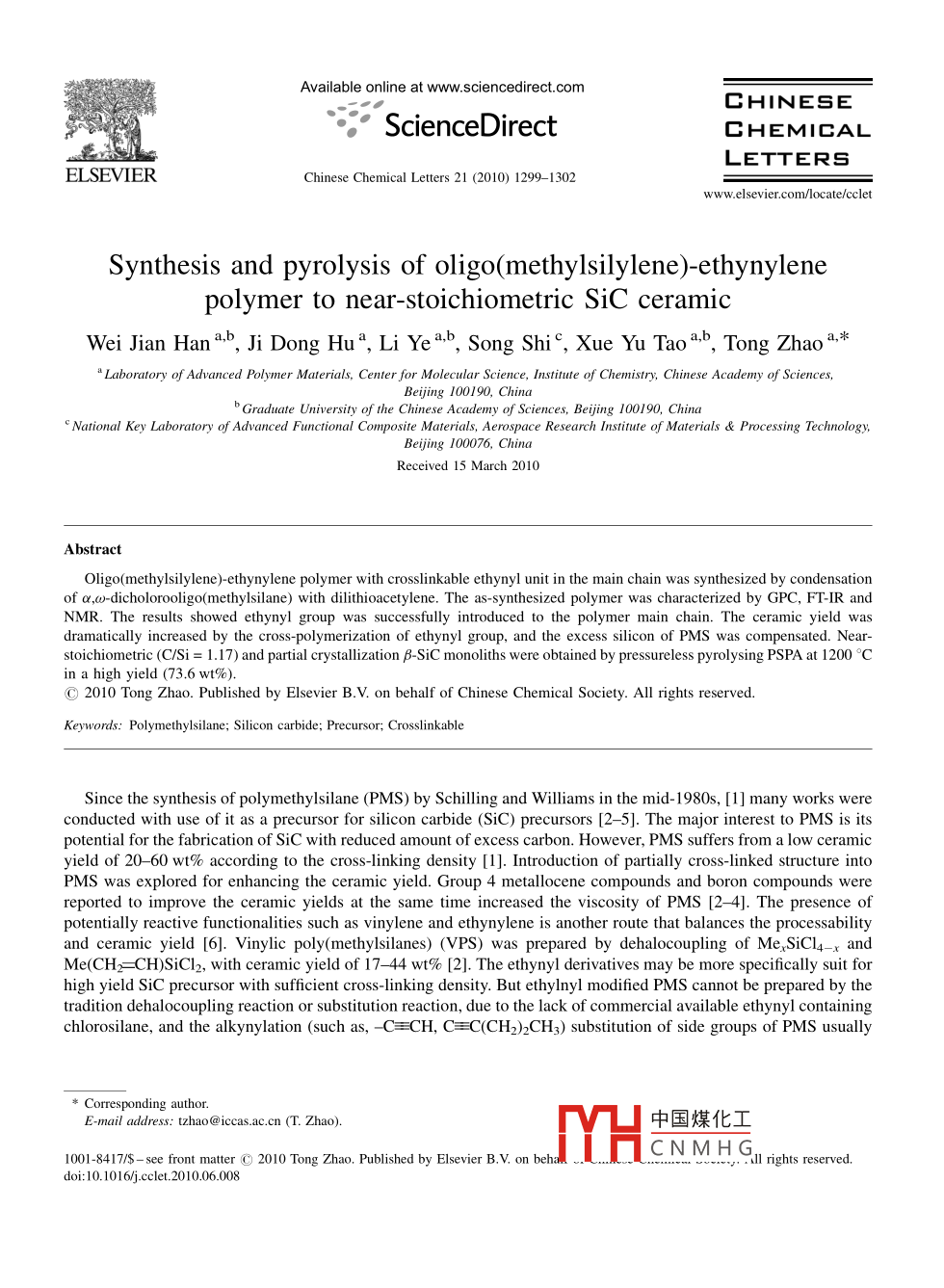 Available online at www.sciencedirect.comCHINESEScienceDirectC HEMICALL .ETTERSELSEVIERChinese Chemical Letters 21 (2010) 1299- 1302www.elsevier.com/locate/ccletSynthesis and pyrolysis of oligo(methylsilylene )-ethynylenepolymer to near-stoichiometric SiC ceramicWei Jian Hana,b, Ji Dong Hu", Li Yea,b, Song Shir, Xue Yu Tao a,b, Tong Zhao a,*a Laboratory of Advanced Polymer Materials, Center for Molecular Science, Institute of Chemistry; Chinese Academy of Sciences,Beijing 100190, Chinab Graduate University of the Chinese Academy of Sciences, Beijing 100190, China。National Key Laboratory of Advanced Functional Composite Materials, Aerospace Research Institute of Materials & Processing Technology,Beijing 1076, ChinaReceived 15 March 2010AbstractOligo(methylsilylene )-ethynylene polymer with crosslinkable ethynyl unit in the main chain was synthesized by condensationof a,w-dicholorooligo(methylsilane) with dilithioacetylene. The as- synthesized polymer was characterized by GPC, FT-IR andNMR. The results showed ethynyl group was succesfully introduced to the polymer main chain. The ceramic yield wasdramatically increased by the cross-polymerization of ethynyl group, and the excess silicon of PMS was compensated. Near-stoichiometric (C/Si = 1.17) and partial crystallization β- SiC monoliths were obtained by pressureless pyrolysing PSPA at 1200 °Cin a high yield (73.6 wt%).C 2010 Tong Zhao. Published by Elsevier B.V. on behalf of Chinese Chemical Society. All rights reserved.Keywords: Polymethylsilane; Silicon carbide; Precursor; CrosslinkableSince the synthesis of polymethylsilane (PMS) by Schilling and Williams in the mid- 1980s, [1] many works wereconducted with use of it as a precursor for silicon carbide (SiC) precursors [2-5]. The major interest to PMS is itspotential for the fabrication of SiC with reduced amount of excess carbon. However, PMS suffers from a low ceramicyield of 20- -60 wt% according to the cross-linking density [1]. Introduction of partially cross-linked structure intoPMS was explored for enhancing the ceramic yield. Group 4 metallocene compounds and boron compounds werereported to improve the ceramic yields at the same time increased the viscosity of PMS [2- -4]. The presence ofpotentially reactive functionalities such as vinylene and ethynylene is another route that balances the processabilityand ceramic yield [6]. Vinylic poly(methylsilanes) (VPS) was prepared by dehalocoupling of MexSiCl4- -x andMe(CH-=CH)SiCl2, with ceramic yield of 17-44 wt% [2]. The ethynyl derivatives may be more specifically suit forhigh yield SiC precursor with sufficient cross-linking density. But ethylnyl modified PMS cannot be prepared by thetradition dehalocoupling reaction or substitution reaction, due to the lack of commercial available ethynyl containingchlorosilane, and the alkynylation (such as, -C=CH, C=C(CH2)2CH3) substitution of side groups of PMS usually* Corresponding author.E-mail address: tzhao@ iccas.ac.cn (T. Zhao).中國煤化工1001-8417/$ - see front matter◎2010 Tong Zhao. Published by Elsevier B.V. on beh;MHCNMH G,M_tyl rights reserved.doi: 10.1016/.cclet.2010.06.0081300W.J. Han et al./ Chinese Chemical Ltters 21 (2010) 1299- 1302given a low oxidation potential results, which is related to the highly delocalized σ backbone of polysilanes [7]. In thispaper, a novel ethynyl-modified PMS (PSPA) was synthesized for the first time by the condensation reaction of Q,w-dichlorooligo(methylsilane) and dilithioacetylene.1. ExperimentalAll experiments were carried out under a nitrogen atmosphere. Solvents were distilled from sodium/benzophenoneprior to use. All other chemicals were purchased from Aldrich or Acros Co. and used as received. 'H, 13C, and 29Sinuclear magnetic resonance spectra (NMR) were obtained on a Bruker DMS 300 MHz spectrometer using CDCl3 assolvent. Fourier transform infrared spectra (FT-IR) were recorded on a Bruker 27 spectrometer. The molecular weightof the polymer samples were determined by gel permeation chromatography (GPC) with tetrahydrofuran as the eluentat 35。C. Sample detection was taken with a Waters 24 10 refractive index detector. Thermogravimetric analysis (TGA)was carried out on a Netzsch STA 409PC instrument in nitrogen atmosphere with a ramping rate of 10。C/min fromroom temperature (RT) to 1000。C. X-ray powder diffraction (XRD) measurements were obtained using Cu Karadiation (40 kV, 200 mA, λ = 0.154056) with a Rigaku D/MAX 2400 diffractometer. Silicon content was determinedby optical emission spectrometry with inductively coupled plasma excitation (OES-ICP, Thermo iCAP 6300). Carbonand oxygen contents were analyzed by carrier gas heat extraction (CGHE, LECO C, S-analyzer 244 and N,O-determinator TC 600).The PSPA precursor as a new acetylene containing PMS was synthesized by a three-step reaction as shown inScheme 1. Firstly, a,w-dichlorooligo(methylsilane) 1 was prepared by the Wurtz-type reductive dehalogenationreaction of excess MeHSiCl2 and sodium [1]. Dilithioacetylene 2 was prepared by the reaction of n-BuLi andtrichloroethylene. Then PSPA precursor was synthesized by the condensation reaction of 1 and 2.a,w-Dichlorooligo(methylsilane) 1: dry toluene (80 mL) and sodium metal (0.32 mol, 7.36g) were added to a500 ml three neck fask, and heated to 110 °C, then stirred rapidly for 10 min. The system was cooled down to 90 °C,and MeHSiCl2 (0.20 mol, 20.81 mL) was added dropwise over 40 min, then the solution turned blue and furtherrefuxed for 4 h.Dilithioacetylene (LiC=CLi) 2 was prepared by the procedure described in the literature [8PSPA precursor: 0.04 mol 2 was added drop wise to 1 in 30 min at - 10 °C. After addition, the mixture wasgradually warmed to room temperature and further reacted for 12 h. The obtained slurry was filtered under nitrogenatmosphere, and an orange solution was obtained. After removing the solvent under vacuum, 5.2 g red viscous liquidpolymer was obtained with a yield of 59%. FT-IR (KBr, cm~ ): v 3286 (