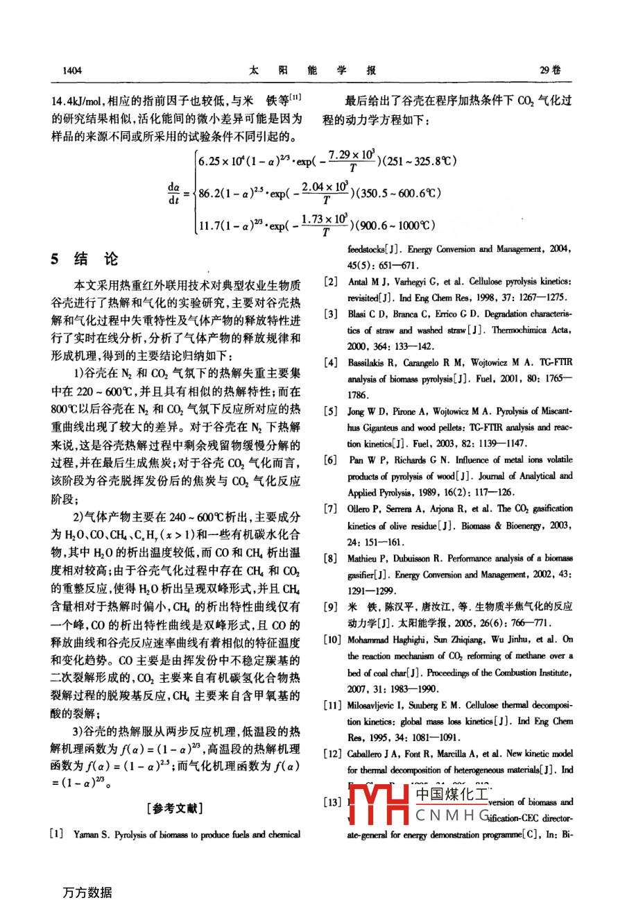 第29卷第1l期太陽能學報Vol 29. No 11200年11月ACTA ENERGIAE SOLARIS SINICANo,,2008文章編號:0254009%6(2008)11139907谷殼熱解/氣化的熱重紅外聯用分析付鵬,胡松,向軍,孫路石,石金明,張軍營(華屮科技大學煤燃燒國家重點實驗室,武漢430074)摘要:利用熱重分析(TGA)和傅里葉紅外光譜(FTR)聯用技術對典型生物質熱解和氣化特性及其氣體產物的釋放規(guī)律進行了研究,并確定了其熱解和氣化機理。研究表明,谷殼在N2和CO2氣氛下的熱解失重主要集中在220600℃,并且具有相似的熱解特性;在800℃以后谷殼在N和CO2氣氛下反應所對應的熱重曲線出現了較大的差異。氣體產物主要在240-6℃析出主要成分為H2O、CO、CH、CH2(x>1)和一些有機碳水化合物其中HO的析出溫度較低,而CH4和C0析出溫度相對較高;由于谷殼氣化過程中存在CH和CO2重整反應使得H2O析出呈現雙峰形式,并且CH含量相對于熱解時偏小,CH的析出特性曲線僅有一個峰,CO的析出特性曲線是雙峰形式,且CO的釋放曲線和谷殼反應速率曲線有著相似的特征溫度和變化趨勢。谷殼的熱解服從兩步反應機理,低溫段的熱解機理函數為f(a)=(1-a)2,高溫段的熱解機理函數為f(a)=(1-a)23;而氣化機理函數為f(a)=(1鍵詞:谷殼;熱解;氣化; TG-FTTR中圖分類號:TK6文獻標識碼:A0引言的熱解和氣化提供足夠的動力學信息。 TG-FTIR聯用技術已在生物質和煤等燃料的利用研究中得到廣在生物質能利用和轉化的各種工藝中生物質泛應用“。 Bassilakis等4對生物質熱裂解產物進熱解和氣化技術可以將生物質原料轉化為能量密度行熱重紅外聯用分析,提出了7種生物質樣品的產高的液體和氣體燃料從而提升了生物質的利用品物生成模型。Jmg等對兩種生物質分別進行了味和應用途徑。生物質熱解和氣化機理的研究不僅TG-FTIR聯用分析,研究了不同升溫速率對各種氣有助于了解生物質熱解和氣化過程演變情況,而且為優(yōu)化生物質熱解和氣化產物組成和品質運行條體產物生成的影響。Pan等也利用TFTR聯用件優(yōu)化、反應器選型和工程放大設計等提供重要的研究了陽離子對木材熱裂解氣體產物的催化作用。理論依據。本文采用熱重紅外聯用技術對典型農業(yè)生物質盡管采用TCA對生物質熱解和氣化動力學分谷殼進行了熱解和氣化的實驗研究,主要對谷完熱析提供包括反應溫度、反應級數和動力學活化能等解和氣化過程中失重特性及氣體產物的釋放特性進有關生物質熱解和氣化動力學參數的重要信息但行了實時在線分析,對生物質熱解和氣化機理的動是對生物質熱解和氣化過程中氣體產物釋放特性的力學特性有了進一步的了解,有助于研究其熱解和了解仍然十分有限3。在熱解和氣化過程中氣體氣化機理從而更好地提高生物質熱解和氣化目標產物的實時在線分析被認為與生物質熱解和氣化機產物的產量。理極為相關,有助于史好地了解和掌握其機理。熱1實驗重紅外聯用技術不僅可以分析樣品在熱解和氣化過程中的質量變化特性,也能對氣體產物的形成和1,1生物質的元素分析與工業(yè)分析釋放特性進行快速在線分析,為低升溫速率下樣品實驗選用的典型生物質樣為谷殼,將生物質破中國煤化工收稿日期:20070620基金項目:國家重點基礎研究發(fā)展規(guī)劃(93)項目(200cB21704);國家高技CNMH通訊作者:胡松(1973-),男,博土:、副教授、碩士生導師,主要從事非催化氣固反應動力學方面的研究。fupsklee@yahoo.com.cn太能學報29卷碎至25m~1mm范圍內,封存直至在德國 Bayreuth本實驗中,生物質在熱解和氣化過程中的碳轉大學進行實驗。工業(yè)分析和元素分析分別在Eum化率為:CA 3000( HEKAtech, Italy )FA TGA-2000( Navas Instru(1)ments,spin)上進行,有關數據見表1。表1谷殼樣的工業(yè)分析和元素分析(單位:%(w))生物質半焦的氣化反應性由式(2)來確定:Table 1 The proximate and ultimate analysis of rice huskdm 11 da(2)工業(yè)分析元素分析V A [C][H][N][o][s]式中,m—反應初態(tài)生物質樣的質量;m反應6.7361.2314.9617.0938.455.220.4555.88中某一時刻的剩余質量;m—灰分質量。12實驗設備及程序將美國 Thermo Cahn公司的 TherMax500高溫高2谷殼熱解和氣化特性分析與比較壓熱分析儀和芬蘭 Tenet公司的 GASMET FTIR D X圖2和圖3分別為谷殼N2熱解和CO2氣化過4000便攜式紅外氣體分析儀聯用,試驗流程見圖1。程中失重量碳轉化率和反應速率與時間關系圖。TG的出口氣體通過導管引入到FT/ R gas analyzer從圖2和圖3中可以看出,當溫度低于200℃時,主中,實時跟蹤檢測,以期同時獲得樣品的熱失重特性要是水分的析出,是生物質的干燥過程,在DG曲線和氣體產物的析出特性。本實驗取樣品約500mg,上表現出一定量的失重,在該溫度區(qū)間谷殼發(fā)生解載氣為高純度N2(9.9%)和CO2(99.2%),流量均聚及“玻璃化轉變”現象即原料的改性,有小分子量為200ml/min,采用該流量的目的是為了使過程中釋的化合物釋放出來,這個過程較緩慢。谷殼失重主放的氣體產物以最快的速度被送入溫度稍低的FT要集中在20~600℃,在該溫度區(qū)間的失重主要是IR氣室內進行檢測分析,從而減少氣體產物發(fā)生二由于生物質裂解成小分子氣體和大分子可冷凝的揮次分解的可能性。從室溫以20℃/min的升溫速率加發(fā)分而造成的。谷殼熱解開始于220℃,之后隨溫度熱到1000℃,然后停留30min直至反應結東。為了的升高,失重迅速增加,反應速率迅速加快,并在避免半揮發(fā)性氣體產物潛在的冷凝和吸收測