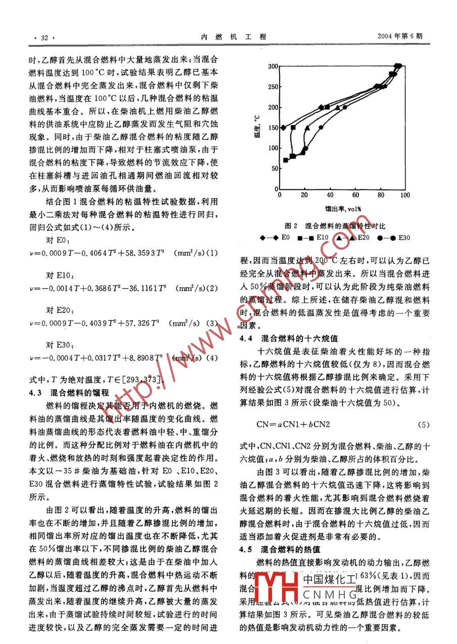 第25卷第6期內(nèi)燃機工程VoL 25 No 62004年12月Chinese Internal Combustion Engine EngineeringDec. 200文章編號:1000-0925(2004)06-030-04250112乙醇-柴油混合燃料的理化特性的研究于世濤,郭英男2,卓斌,劉金山2,楊林(1.上海交通大學汽車電子技術研究所,上海200030;2.吉林大學內(nèi)燃機研究所)Study on the Physical and Chemical Characteristics of Ethanol-Diesel Blend FuelsYU Shi-tao, GUO Ying-nan, ZHUO Bin', LIU Jin-shan, Yang Lin(1. The Institute of Automotive Electronic Technology, Shanghai Jiaotong University, Shanghai 200030, China;2. The Institute of Internal Combustion Engine, Jilin University)Abstract: In order to help the study of using the ethanol-diesel blend fuel on a diesel engine, the mainphysical and chemical characteristics of ethanol-diesel blend fuel lueve investigated in this paper. The lowheating value, cetane number of the blends with different ethanol fractions are calculated by using the experiential formula, Experiments of distillation and viscosity were done to study the distillation characteristics andviscosity characteristics of different ethanol-diesel blend fuels (E0, E10, E20, E30), and several experientialformulas are formulated based on the results of viscosity experiment: The solubility experiment is done tostudy the solubility of different ethanol-diesel blends(EO-E100), besides, the effects of solvent on the solubility curve of different ethanol-diesel blends are also studied. The studies show that the low heat value, cetane number, viscosity of the blends decrease with the increasing content of ethanol in the blends; The distil-lation characteristics of the blends is very high in the low range of temperature; Solvent can better the solu-bility of ethanol-diesel blend fuels.摘要:為了有助于開展乙醇柴油混合燃料在發(fā)動機上的應用研究,本文開展了不同乙醇摻混比例柴油乙醇混合燃料的主要理化特性的研究。采用數(shù)值計算的方法研究了不同乙醇摻混比例對混合燃料的低熱值、十六烷值的影響;開展燃料的蒸餾特性試驗、粘溫特性試驗,研究了不同乙醇摻混比例(E0,E10,E20,E30)對混合燃料的蒸餾特性、粘溫特性的影響,并對混合燃料的粘溫特性試驗結果進行數(shù)值回歸;釆用相溶特性試驗研究了不冋乙醇摻混比例的混合燃料(E0-E100的相溶特性,以及助溶劑對混合燃料相溶特性曲線的影響。研究結果表明:隨著乙醇摻混比例的增加,混合燃料的低熱值、十六烷值、粘度逐漸降低,混合燃料的低溫蒸餾特性較強,助溶劑可有效解決乙醇柴油的相溶問題。關鍵詞:內(nèi)燃機;柴油乙醇混合燃料;粘度;蒸餾特性;助溶劑Key Words: I C Engine; Ethanol-Diesel Blend Fuel; Viscosity; DistillationCharacteristic; Solvent中圖分類號:TK407.9文獻標識碼:A1概述普遍關注的問題。乙醇作為一種可再生含氧生物燃料,被認為是一種比較有前景的代用燃料。隨著汽車保有量的增加,石油短缺及排放污染問題日益突出,尋求清潔的石油替代燃料成為人們yhA中國煤化工、巴西和歐共體等國一汽油(E7.7,E10CNMHG收稿日期:200402-20作者簡介:于世濤(1977-),男,博士生,主要研究方向為內(nèi)燃機代用燃料與排放,Ema: seawave@ sjtu. edu,cn2004年第6期20)多年,然而乙醇在柴油機上的應用技術還不成3試驗裝量和方法熟,這主要是由于乙醇與柴油之間存在較大理化性質(zhì)的差異。本文針對與發(fā)動機應用相關的柴油乙醇采用GB265型石油產(chǎn)品運動粘度測定儀,按照混合燃料理化特性進行的研究結果表明:隨著乙醇GB/T265試驗方法進行混合燃料粘溫特性試驗;遵摻混比例的增加,混合燃料的十六烷值、熱值、粘度循GB/T6536試驗方法在蒸餾儀上進行混合燃料蒸逐漸降低;混合燃料的低溫蒸餾特性較強;助溶劑可餾特性試驗;采用水浴、冰柜化學試驗臺進行混合燃有效解決乙醇柴油的相溶問題。料的相溶特性試驗。2醇類燃料的物化特性4混合燃料的理化性質(zhì)醇類是烴基(一R)與羥基(-OH組成的化合4.1冷濾點物,從本質(zhì)上決定了醇類可成為替代石油系燃料的冷濾點是評價燃料油低溫性能的指標。對于柴內(nèi)燃機燃料,而羥基的存在又決定了它有很多不同油乙醇混合燃料,由于乙醇的凝點為-114°C,因而于石油系燃料的特性。燃料在內(nèi)燃機燃燒做功過程混合燃料的冷濾點不會因乙醇的摻人而下降,反而是一個復雜的物理化學變化過程,燃料的著火燃燒還會保持較好的低溫使用性能。特性取決于其揮發(fā)性、沸點、汽化熱、閃點、著火溫4.2混合燃料的粘度度、辛烷值、十六烷值、粘度等一系列物理化學特在柴油機中,燃油在供油系統(tǒng)中起著潤滑和防性漏作用,燃油的粘度是發(fā)動機燃料一個重要的評價指標,燃料的粘溫曲線(粘度隨溫度變化關系)是燃表1幾種燃料的主要理化特性比較料、特別是代用燃料重要的品質(zhì)特性??紤]到發(fā)性質(zhì)汽油柴油動機燃油系統(tǒng)工作溫度范圍,本文以一35#柴油為化學式Cle-23C3HsOH基礎油,在20~100°C的溫度范圍內(nèi),對E0、E10、分子量95~120180~20046E20、E30(符號E后面的數(shù)字表示乙醇在混合燃料含氧量,%0.434.8中的體積百分比)混合燃料進行粘溫特性試驗,試驗比重07~0.780.82~0.880.79結果如圖1所示。理論空燃比kg/kg14.2~15.114.49.0沸點,C0~200175~36078.5凝點,C114粘度(20C),mPas0.42低熱值,M/kg43.542.526.77汽化潛熱,kJ/k冒L辛烷值RON84~94111十六烷值0~1040~55著火極限,vol%1.4~7.61.58~8.24.3~19自燃溫度,C220~260200~220420閃點,"C20406080100120t,°C表1列出了乙醇燃料與柴油、汽油的理化特性,可以看出,乙醇的辛烷值較高,閃點
