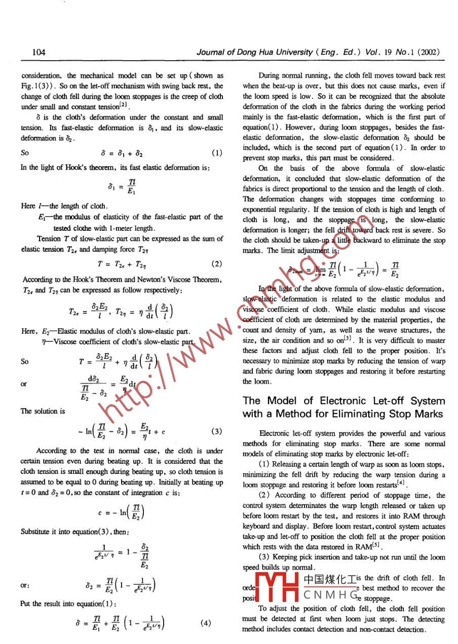 Journal of Dong Hua University (Eng. Ed.) Vol. 19 No.1 (2002) 103An Analysis and Prevention of Stop Marks in WeavingCHEN Ge (陳革), LIN Shen (林申), CHEN Ming (陳明)College of Mechanical Engineering , Dong Hua University , Shanghai , 200051The cause of stop marks of fabrics in weaving isback ail swing motion under stabilityu'Besides, if the loomintroduced, and the floating displacement of the clothcannot stop immediately when the ends of warp breaks, or somefell during loom stoppage is a primary cause of stopwefts are missing to be inserted into the shed, they all lead to themarks. The stop marks caused by fabric system arethin place in the fabrics.analyzed. A new method to eliminate stop marks busing the electronic let-off system is presented. This newAn Analysis of Creep of Cloth Fell Causedmethod needn't any special detecting equipment, it canby the Fabric Systemcontrol the fell position by the powerful control program,so the cost is decreased greatly. The method is soDuring loom stoppages, the cloth fell creeps to a newflexible that can be applied to weaving all kinds ofposition because of viscoelastic properties of the warp and cloth.fabrics.The creep depends on the time of loom stoppages. The longerKeywords: loom, stop marks, creep of cloth fell, electronicloom stoppages may lead to more severe marks. Before the loomlet-of.start up, if the cloth fell moves toward back rail, the operatorshould take up the cloth a ltte at first, while the cloth fell movestoward breast beam, the operator should turn the take-upIntroductionmechanism backward to free cloh up a certain degree. However,it is very hard for the operator to control cloth fell position to thStop marks mean the distance between two adjacent picks ofproper position, and the stop marks is very difficult to be avoided.the weft in fabric is wider or narrower than the normal, which is aSo the viscose elastic properties of warp and clouh must beprimary cloth defect of woven fabrics. It's hard to mend them,analyzed at first.and they decrease the quality of fabric. On modem looms withOn the let-off mechanism with swing back rest, the warp andhigh operating speed, the problem of stop marks seems to be morecloh can be recognized to be under the small and constant tension,severe. Up to now,loom producers are looking for variousand normally the warp tension equals the cloth tension in balance.methods to eliminate stop marks.So the warp and cloth system (shown as Fig. 1(a)) can beexpressed as Fig. 1(b). If the creep of the cloth fell is the onlyCause of Stop MarksBack rest\A major cause of stop marks has been recognized as the cloth昌fell creep due to viscoelastic properties of warp and cloth during+loom stoppages, and the clouh fell floats a litle from normalposition. Since the warp and cloth are under tension, the lengths(a) Warp and cloth systcmof warp and cloth stretch a small different amount of variation to7'create a creep, which affects the position of the cloth fell. The引ww[Iw{creep is relative with stoppage time. So longer loom stoppages才EYLw-E:L w-may lead to more severe stop mars.2. Further more, the creepis connected with the fabric strucure, type of yarms, the lengths of(b) Mechanical model of warp and clothcloth and warp under tension in the loom, the air condition of theweaving shed and so on[3]. .There are also ouher factors that lead to stop marks. The reedyw[may not reach its nommal speed in the first cycle at starting,Ecausing the initial beat-up speed to be less than the normal speed.(c) Mcchanical model of fabrieFurther more, the lower speed can't make the reed reach itsdynamic front position, which reduces cloth fll's displacement a中國煤化Iwam and cdothlot at beat-up. The oscillations of the back rail may also lead tostop marks, as it takes a few cycles of loom revolution before theMHCNMHGReceived Feb. 22, 2001104 .Jourmal of Dong Hua University (Eng. Ed.) Vol. 19 No.1 (2002)consideration, the mechanical model can be set up ( shown asDuring nommal running, the cloth fell moves toward back restFig. 1(3)). So on the let-off mechanism with swing back rest, thewhen the beat-up is over, but this does not cause marks, even ifchange of cloth fell during the loom stoppages is the creep of cloththe loom speed is low. So it can be recognized that the absoluteunder small and constant tensionl2].deformation of the cloth in the fabrics during the working periodδ is the cloh's deformation under the constant and smallmainly is the fast-elastic deformation, which is the frst part oftension. Its fast-elastic defornation is δ, and its slow-elasticequation(1). However, during loom stoppages, besides the fast-deformation is 8.elastic deformation, the slow- elastic deformation 員should beincluded, which is the second part of equation(1). In order to .Saδ = 81+82(1)prevent stop marks, this part must be considered.In the light of Hook's theorem, its fast elastic deformation is: :On the basis of the above formula of slow elasticdeformation, it concluded that slow elastic defommation of theTδ=Efabrics is direct proportional to the tension and the length of cloth.The deformation changes with stoppages time conforming toHere -the length of cloth.exponential regularity. If the tension of cloth is high and length ofE- -the modulus of elasticity of the fast-elastic part of thecloth is long, and the stoppage is long, the slow-elastictested cloche with 1-mer length.defommation is longer; the fell drift toward back rest is severe. ScTension T of slow-elastic part can be expressed as the sum ofthe cloth should be taken-up a litle backward to eliminate the stopelastic tension T2e and damping force T2ηmarks. The limit adjustment is:T= T2。+ T2n(2)8mm= lim (1-刻)=號According to the Hook's Theorem and Newton's Viscose Theorem,T2e and T2n can be expressed as follow respectively:In the light of the above formula of slow-elastic deformation,slow elastic deformation is related to the elastic modulus andT2.=些, T2n=;,最(部)viscose c
