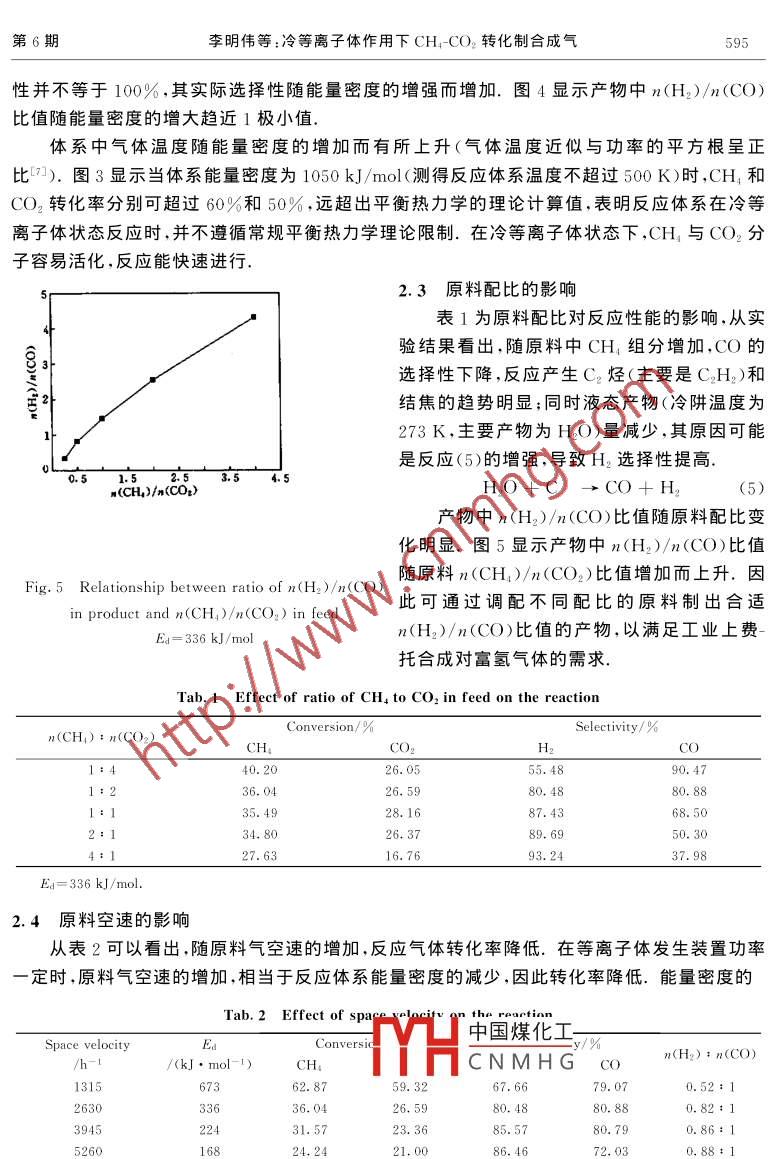 第17卷第6期應(yīng)用化學(xué)Vol. 17 No 62000年12月CHINESE JOURNAL OF APPLIED CHEMISTRYDec. 200冷等離子體作用下CH4CO2轉(zhuǎn)化制合成氣李明偉*劉昌俊許根慧(天津大學(xué)一碳化工國(guó)家重點(diǎn)實(shí)驗(yàn)室天津300072)摘要在常溫常壓條件下,利用電暈放電,使CH1CO2混合氣轉(zhuǎn)化生成合成氣.結(jié)果表明,該過(guò)程中CH和CO2的轉(zhuǎn)化率與反應(yīng)體系能量密度、原料氣配比和流速等有關(guān),在0.1MPa氣壓,能量密度為1050kJ/mol(反應(yīng)體系溫度低于500K),n(CH):n(CO2)=1:2條件下CH1和CO2的轉(zhuǎn)化率分別超過(guò)60%和50%,超出了熱力學(xué)平衡轉(zhuǎn)化率的限制.通過(guò)調(diào)配原料的配比,可以得到不同n(H2)/n(CO)比值的產(chǎn)物.對(duì)該體系的反應(yīng)機(jī)理進(jìn)行了探討關(guān)鍵詞合成氣,冷等離子體,電暈放電,甲烷,二氧化碳中圖分類號(hào):O622.1;TE646;TQ039CH4和CO2是兩種重要的溫室氣體,二者化學(xué)穩(wěn)定性很高,通過(guò)常規(guī)方法難以直接轉(zhuǎn)化為有用的產(chǎn)品.CH4經(jīng)CO2重整制合成氣是熱力學(xué)上可行的反應(yīng),可同時(shí)利用兩種C1資源為了抑制積炭等副反應(yīng)的發(fā)生,一般需在低壓或高溫下進(jìn)行,能耗很大.冷等離子體技術(shù)能在常溫常壓條件下有效地將能量輸入到反應(yīng)體系中,激活惰性分子使之反應(yīng),利用該技術(shù)使CH和CO2轉(zhuǎn)化制合成氣,在常溫常壓下具有較高的CH和CO2轉(zhuǎn)化率,通過(guò)調(diào)整原料配比等,可制取合適η(H2)n(CO比值的合成氣,滿足后續(xù)反應(yīng)如費(fèi)托合成的需要.國(guó)外已開(kāi)展冷等離子體CH4-CO2反應(yīng)制合成氣的研究23,但多采用復(fù)雜的無(wú)聲放電反應(yīng)裝置需要高頻電源產(chǎn)生等離子體,固體產(chǎn)物(積炭等)易堵塞反應(yīng)器.我們采用結(jié)構(gòu)簡(jiǎn)單的直流電暈放電裝置使CH4與CO2發(fā)生反應(yīng),CH4和CO2轉(zhuǎn)化率較高實(shí)驗(yàn)部分實(shí)驗(yàn)在常溫常壓下進(jìn)行,冷等離子體反應(yīng)裝置見(jiàn)文獻(xiàn)[4,5],利用上海102G型氣相色譜儀(碳分子篩色譜柱,熱導(dǎo)池檢測(cè)器,高純Ar作載氣)定量分析產(chǎn)物,利用四極質(zhì)譜( BalzersMSC200型,EⅠ源,電子倍增器檢測(cè))在線定性檢測(cè)反應(yīng)產(chǎn)物2結(jié)果與討論2.1CO2CH4反應(yīng)體系的平衡熱力學(xué)分析CH4CO2是一復(fù)雜的反應(yīng)體系,通過(guò)色譜和質(zhì)譜判斷反應(yīng)產(chǎn)物主要是H2、CO和H2O.隨著原料氣中CH組分的增加,有C2H2和結(jié)焦出現(xiàn).如果忽略其他產(chǎn)物,該體系包含4個(gè)獨(dú)立反應(yīng),可能的反應(yīng)過(guò)程為中國(guó)煤化工CH+COCNMHGCO,+H,eCO+H,O2CH- C2H2+ 3H20003數(shù)據(jù)006-12修回國(guó)家自然科學(xué)基金(29776037)、教育部?jī)?yōu)秀年輕教師基金資助課題應(yīng)用化學(xué)第17卷C,H,+2C+H如果根據(jù)常規(guī)旳平衡熱力學(xué)計(jì)算〔熱力學(xué)數(shù)據(jù)來(lái)源于文獻(xiàn)[6],原料中n(CH)n(CO2)=1:2,體系壓力為0.1MPa,氣體為理想氣體),當(dāng)忽略C2H2、結(jié)焦等對(duì)反應(yīng)平衡組成的影響時(shí),CH4、CO2、CO、H2和H2O體系的平衡組成如圖1所示,低于50K時(shí),CH4和CO幾乎不能轉(zhuǎn)化,超過(guò)800K后,二者平衡轉(zhuǎn)化率隨溫度的上升增加很快,溫度升高至1000K后,CH4幾乎完全轉(zhuǎn)化.圖2為溫度對(duì)平衡體系H2CO2摩爾比的影響,從圖中可分析出,按反應(yīng)(1)配比過(guò)量的CO2會(huì)因反應(yīng)(2)而繼續(xù)轉(zhuǎn)化,其平衡轉(zhuǎn)化率隨溫度升高而提高.產(chǎn)物中H的平衡組成隨溫度升高而增大,但增加程度逐漸減小,當(dāng)超過(guò)1000K后,由于反應(yīng)(2)增強(qiáng)產(chǎn)生較多的H2O,使H2選擇性和n(H2)/n(CO)比值下降.0.612001400T/KFig. 1 Relationship bet ween constitutionFig 2 Plot of n(H2)/n(CO)and reaction temperature of CH:-CO2ratio vs reaction temperature osystemCH:-CO2 equilibrium system1.CO2;2.CH4;3.CO;4.H2;5.H2O2.2能量密度對(duì)反應(yīng)的影響能量密度代表了反應(yīng)體系的能量場(chǎng)強(qiáng)度.圖3為能量密度對(duì)CH4和CO2轉(zhuǎn)化率的影響實(shí)驗(yàn)表明,隨著反應(yīng)體系能量密度的增強(qiáng),CH4和CO2的轉(zhuǎn)化率隨之增大,但增大程度在高能量密度處放緩,最后趨近于1極限值.由于實(shí)際反應(yīng)體系中有C2H2、結(jié)焦等出現(xiàn),CO的選擇0.8中國(guó)煤化工E/(kJ·mol-1)CNMHGOig. 3 Effect of energy density on theFig 4 Effect of energy density on thconversions of Ch, (a) and CO,(b)ratio of H, to CO in product萬(wàn)方數(shù)掘):n(CO2)=1:2n(CH4):n(CO2)=1:2第6期李明偉等:冷等離子體作用下CH4-CO2轉(zhuǎn)化制合成氣性并不等于100%,其實(shí)際選擇性隨能量密度的增強(qiáng)而增加.圖4顯示產(chǎn)物中n(H2)/n(CO)比值隨能量密度的增大趨近1極小值.體系中氣體溫度隨能量密度的增加而有所上升(氣體溫度近似與功率的平方根呈正比m).圖3顯示當(dāng)體系能量密度為1050kJ/mol測(cè)得反應(yīng)體系溫度不超過(guò)500K)時(shí),CH4和CO2轉(zhuǎn)化率分別可超過(guò)60%和50%,遠(yuǎn)超出平衡熱力學(xué)的理論計(jì)算值,表明反應(yīng)體系在冷等離子體狀態(tài)反應(yīng)時(shí),并不遵循常規(guī)平衡熱力學(xué)理論限制.在冷等離子體狀態(tài)下,CH4與CO2分子容易活化,反應(yīng)能快速進(jìn)行2.3原料配比的影響表1為原料配比對(duì)反應(y