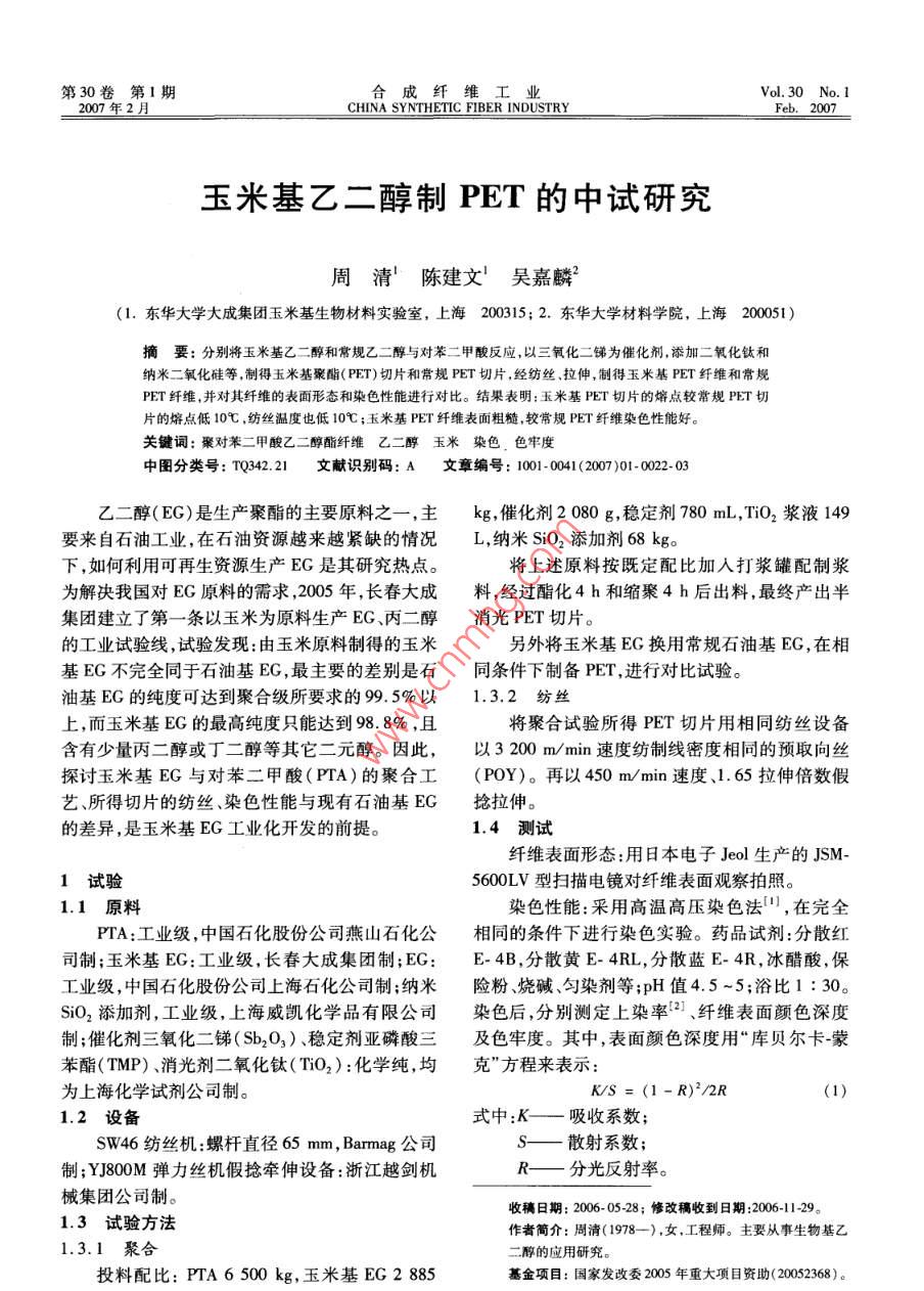 玉米基乙二醇制PET的中試研究