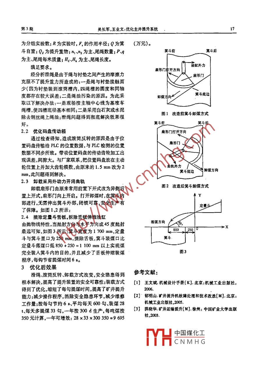 2007年第3期淮南職業(yè)技術學院學報NO.3 ,2007第7卷(總第24期)JOURNAL OF HUINAN VOCATIONAL & TECHNICAL COLLEGEVOL.7 ,Serial No. 24優(yōu)化主井提升系統(tǒng)昊長軍,王業(yè)文(淮南礦業(yè)集團張集礦,安徵淮南232171)[摘要] 張集礦北區(qū)主井提升系統(tǒng)沒有優(yōu)化前存在的問題:主提升繩滑繩,絞車啟動出現(xiàn)滾籬反轉(zhuǎn),卸載液壓機械閉鎖不可靠,出現(xiàn)裝載定量斗舌板被刮;優(yōu)化方案:除油和車繩櫓解決滑綢問題.優(yōu)化碼盤傳動箱解決絞車渡簡反轉(zhuǎn)的問題,卸載采用外動力開閉曲軌消除機械閉鎖不可靠的安全隱患,摘除定量斗舌板,減少操作程序,消除安全隱患環(huán)節(jié),減少維修工作量。. [關鍵詞] 提升系統(tǒng); 優(yōu)化;安全; 高效[中國分類號J1TD534* .3[文獻標識碼]B [文章編號]1671 -4733(2007)03 -0016 -02張集礦北區(qū)是淮南礦業(yè)集團第-輪大發(fā)展的首打開 ,導致事故發(fā)生,長期頻繁的打開合上,容易造對礦井,建設工期短(2年建成)。礦井設計能力為成閉鎖失效,且不易發(fā)現(xiàn)及預防,液壓機械增加檢修300萬噸,主井為KJMD-4.5 x4( M)型多繩摩擦工 的維護量。式提升機1臺,滾簡直徑4.5 m,最大靜張力980裝載定量斗裝煤時,舌板伸出350mm,閉鎖失kN,靜張力差340 kN,主電機為TBP4600 -20/3250效或機械故障 容易造成刮舌板事故的發(fā)生,打開、關型同步電動機1臺,1 500 v,4 600 kW,44. 6 r/min,閉舌 板伸縮液壓裝置,增加了每勾提煤時間。主控PLC和監(jiān)控PLC采用德國西門子S7 -400進2優(yōu)化方案口系列,主繩為4根英國虎牌6T混合層6x28三角2.1解決滑繩問題股進口繩,提升容器為32 t箕斗,05年7月投產(chǎn),當對于落地式摩擦提升機,滑繩是最大的安全隱年達產(chǎn)。但隨著綜采機械化程度的提高,產(chǎn)量逐年患,國內(nèi)沒有借鑒經(jīng)驗。只能利用排除法,對提升絞提高;06年420萬噸,07年要達到462萬噸。為滿車的圍包角、電機傳動扭矩、正壓力進行驗算,以滿足生產(chǎn)的需要,對主井提升系統(tǒng)進行優(yōu)化。足提升要求;對滾簡上摩擦襯墊、繩油分別送德國、1主井提升 系統(tǒng)存在的問題英國檢測,襯墊摩擦系數(shù)為0.26。計算如下:主提升繩滑繩。提升絞車調(diào)試運轉(zhuǎn)一段時間r2 -ma)(e-1),a = 180°<后,鋼絲繩出油,主提升繩出現(xiàn)滑繩現(xiàn)象,雨天滑繩°。= (T-2) +(m +m)a;'現(xiàn)象比較嚴重,經(jīng)常出現(xiàn)緊急跳車,嚴重影響生產(chǎn)。1830(設計閱包角)啟動絞車滾簡反轉(zhuǎn)。由于位置碼盤傳輸?shù)絇LCMs = EF.xR=FixR =3 122.325 kNm>的數(shù)據(jù)與實際位置的誤差,絞車啟動時出現(xiàn)滾筒反320 x2. 25 kNm轉(zhuǎn)現(xiàn)象,造成過卷事故發(fā)生。F =Q +QZ +n,PHC +nzqHh =825.4 kN <980常用卸載液壓機械閉鎖不可靠。液壓機械閉鎖kN (設計最大靜張力)的缺點是:扇形門向下開啟,扇形門伸出箕斗外進行式中: σs為防滑系數(shù); m、m2為重載側(cè)和輕載卸煤,卸載完畢后,扇形門在曲軌的逼迫下收回,扇側(cè)質(zhì)量; TI為重載側(cè)和輕載側(cè)鋼絲繩靜張力;形門上的閉鎖卡板緊扣在箕斗上的兩個卡板進行閉M為制動力矩;SF,為實測各組閘的制動力之和;n鎖。-旦閉鎖不好,扇形門受煤壓力或裝載沖擊會中國煤化工[收稿日期]2007-08 -17.CH.CNMHG[作者簡介]吳長軍(1958 ~) ,男,安徽淮南人,工程師,從事礦山機電百埋LTF ,電話15390434520第3期吳長軍,王業(yè)文:優(yōu)化主井提升系統(tǒng)l7為分組實驗數(shù); R為實驗時, F的作用半徑; Q為箕(萬元)。斗自重; Qz為提升重物;n、nr為主、尾繩數(shù)量; P、q箕斗前箕斗后為主、尾繩每米質(zhì)量; HcH,為主、尾繩長度。1缸外力滿足要求。廟形門打開方向經(jīng)分析滑繩是由于繩與襯墊之間產(chǎn)生的摩擦力. 扇形門克服不了提升重力所造成的:一是繩與襯墊接觸面少(因為襯墊裝到滾簡槽內(nèi),四繩槽的圓度和同軸箕斗底邊度都存在較大誤差;二是繩油污染的原因。為此采卸煤才向些取以下解決辦法:一是現(xiàn)場按主軸中心線為基準車繩槽,使四槽底徑基本相同;二是采用白石灰或水泥圖1改造前箕斗卸煤方式除去鋼絲繩上繩油;滑繩問題得到徹底解決效果很好。2.2優(yōu)化碼盤傳動箱扇形門打開方向通過檢查得知,造成滾筒反轉(zhuǎn)的原因是由于位扇形門置碼盤傳輸給PLC的位置數(shù)據(jù),與PLC檢測的位置數(shù)據(jù)不同步所致。帶動位置碼盤的傳動齒輪加工出現(xiàn)誤差,間隙大。與廠家聯(lián)系,把位置碼盤放在主動輪位置上并加大齒輪模數(shù),由原來的1.5mm改為2曲軌外力卸煤方向mm,此問題得到解決。2.3卸載采用外動力開閉 曲軌圖2改造后箕斗卸煤方式卸載扇形門由原來常用前置下開式改為異側(cè)后置上開式,扇形門向上開啟。打開卸煤時,在箕斗內(nèi)部進行,無需伸出箕斗外部,閉鎖可靠,安全生產(chǎn)有定量了保障。如圖1、2所示:2.4 摘除定量斗舌板,拆除舌板伸縮油缸由拋物線特性,當拋射方向與水平方向成45度拋射落煤方向≥X850 二250最遠可知,如圖3所示:箕斗寬度為1 700 mm,定量斗與箕斗里口為250 mm,摘除舌板,箕斗裝煤口比箕斗.定量斗落煤口低850 +250=1 100 mm以上實現(xiàn)煤完全裝人箕斗內(nèi)的目的,并且減少了舌板伸縮裝煤圖3程序,每鉤節(jié)省提煤時間6s。3優(yōu)化后效果滑繩、滾筒反轉(zhuǎn)、卸載方式改變,安全隱患得到參考文獻:根本解決,提高了提升裝置的安全可靠性;裝載