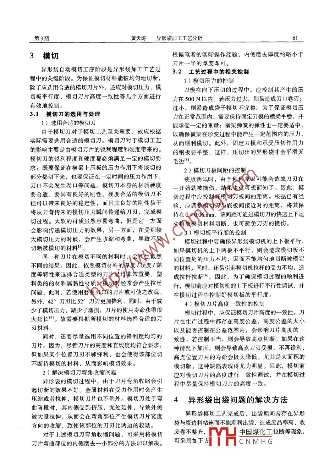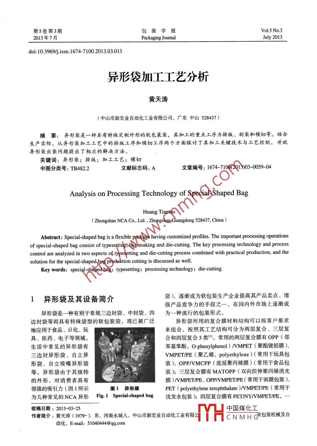 第5卷第3期包裝學(xué)報Vol 5 No. 32013年7月Packaging JournalJuly 2013doi:10.3969issn.16747100.2013.03.013異形袋加工工藝分析黃天濤(中山市新宏業(yè)自動化工業(yè)有限公司,廣東中山528437)摘要:異形袋是一種具有特殊定制外形的軟包裝袋,其加工的重點工序為排版、制袋和模切等。結(jié)合生產(chǎn)實際,從異形袋加工工藝中的排版工序和模切工序兩個方面探討了其加工關(guān)鍵技術(shù)與工藝控制,并就異形袋出袋問題提出了相應(yīng)的解決方法。關(guān)鍵詞:異形袋;排版;加工工藝;模切中圖分類號:TB4822文獻(xiàn)標(biāo)志碼:A文章編號:167471002013)03-0059-04Analysis on Processing Technology of Special-Shaped BagZhongshan NCA Co, Ltd, Zhongshan Guangdong 528437, ChinaAbstract: Special-shaped bag is a flexible package having customized profiles. The important processing operationsof special-shaped bag consist of typesetting, bag making and die-cutting. The key processing technology and processcontrol are analyzed in two aspects of typesetting and die-cutting process combined with practical production, and thesolution for the special-shaped bag production cutting is discussed as wellKey words: special-shaped bag; typesetting; processing technology die-cutting1異形袋及其設(shè)備簡介袋),逐漸成為軟包裝生產(chǎn)企業(yè)提高其產(chǎn)品賣點、增強(qiáng)產(chǎn)品競爭力的手段之一,在國內(nèi)外市場上逐漸成異形袋是一種有別于常規(guī)三邊封袋、中封袋、四為一種流行的包裝形式邊封袋等而具有特殊袋型的軟包裝袋,現(xiàn)已被廣泛異形袋所用的復(fù)合膜材料結(jié)構(gòu)可以按客戶要求地應(yīng)用于食品、日化、玩來組合,按照其工藝結(jié)構(gòu)可分為兩層復(fù)合、三層復(fù)具、醫(yī)藥、電子等領(lǐng)域。合和四層復(fù)合3類。常用的兩層復(fù)合膜有OPP(鄰生活中常見的異形袋有苯基苯酚, O-phenylphenol) /MPET(聚酯鍍鋁膜)三邊封異形袋、自立異VMPET/PE(聚乙烯, polyethylene)(常用于玩具包形袋、自立吸嘴異形袋裝)、 OPP/VMCPP(流延聚丙烯膜)(常用于食品包等。異形袋由于其獨特裝);三層復(fù)合膜有 MATOPP(雙向拉伸聚丙烯消光的外形,對消費者具有膜) /MPET/PE、 OPP/VMPET/PE(常用于面膜包裝)很強(qiáng)的吸引力(圖1所示異形袋PET( polyethylene terephthalate )/VMPET/PE(常用于為幾種常見的NCA異形Fg1 Special-shaped bag洗發(fā)水包裝;四層復(fù)合膜有 PET/NY/MPET/PE,收稿日期:2013-03-25RAH中國煤化工作者簡介:黃天濤(1979-),男,河南永城人,中山市新宏業(yè)自動化工業(yè)有限CNMHG包裝機(jī)械及自動化, E-mail:5104044@qcom包裝學(xué)報2013年般加入尼龍薄膜,以增加復(fù)合袋的柔軟度。題,嚴(yán)重影響產(chǎn)品的外觀;同制袋方向隨著異形袋需求量的不斷增大,其生產(chǎn)加工也時,在模切異形袋時,如果前日漸批量化和規(guī)范化。早期異形袋的加工采用在沖后袋之間留空量太少,則模模機(jī)上成型出袋,但存在較多問題,如生產(chǎn)不便,成切后的廢膜卷橫向連接容易型效果不好,質(zhì)量不穩(wěn)定,流通環(huán)節(jié)較多,成本較被扯斷,造成兩側(cè)廢邊難于高等;或者采用在制袋機(jī)上增加沖膜裝置成型出袋,收齊,從而引起兩側(cè)的廢邊但原有的制袋機(jī)沒有預(yù)留相應(yīng)的模切工位,改造難張力不平衡,導(dǎo)致異形袋的度較大,模切效果不理想。目前,較好的異形袋生模切加工工序無法順利進(jìn)行。產(chǎn)方式是選擇異型袋自動模切機(jī)。新型的異型袋自根據(jù)膜料材質(zhì)以及袋型的不圖2異形袋排版動模切機(jī)可在原有的制袋機(jī)上連線,把異型袋生產(chǎn)同,異形袋的廢邊留量一般Fg2 Special-shaped問題簡單化,既方便又快速,且能很好地解決異型應(yīng)為5mm或5mm以上。因此,bag typesetting袋制袋難、效率低、質(zhì)量差、成本高等問題。異型為了便于批量化生產(chǎn),圖2所示的設(shè)計稿應(yīng)重新進(jìn)行袋自動模切機(jī)適用于軟包裝制袋后工序,應(yīng)用范圍設(shè)計,增加廢邊留量。廣,投入成本低,模切位置精度高,可以方便地連2.2出袋方向的選擇接在現(xiàn)有制袋機(jī)上,在線生產(chǎn)效率較高,是異形袋出袋方向一般有橫出和縱出2種。橫出是指異形軟包生產(chǎn)企業(yè)的最佳選擇,其出現(xiàn)是對異型袋傳統(tǒng)袋正面文字、圖案左邊或右邊在制袋時先出來的加工方法的一次變革。目前,在國內(nèi)已有較多的公種方式;縱出是指異形袋正面文字、圖案腳或頭在司研發(fā)了異形袋自動模切機(jī),其中,中山市新宏業(yè)制袋時先出來的方式。異形袋生產(chǎn)時出袋方向的選自動化工業(yè)有限公司對其研究起步較早,其研發(fā)生擇,應(yīng)綜合考慮異形袋的外形特點,以及其成形方產(chǎn)的NCA6001異形袋自動模切機(jī)已經(jīng)步入市場,且法、后續(xù)加工設(shè)備要求、產(chǎn)品質(zhì)量要求等因素。且成功應(yīng)用于多家軟包生產(chǎn)企業(yè),如:山東旺旺食品應(yīng)在滿足生產(chǎn)要求的前提下,盡量降低廢邊膜量。若有限公司、廣州信安包裝、成都清洋寶柏、道科包出袋方向選擇不當(dāng),會極大地影響生產(chǎn)效率,甚至裝、盈彩包裝等。導(dǎo)致根本無法生產(chǎn)。如圖2所示的異形自立袋若選擇自動模切機(jī)生產(chǎn)異形袋的主要加工工藝分為排“橫出”,可以很好地一次模切成形。一般說來,自版、印刷、復(fù)合、制袋、模切、