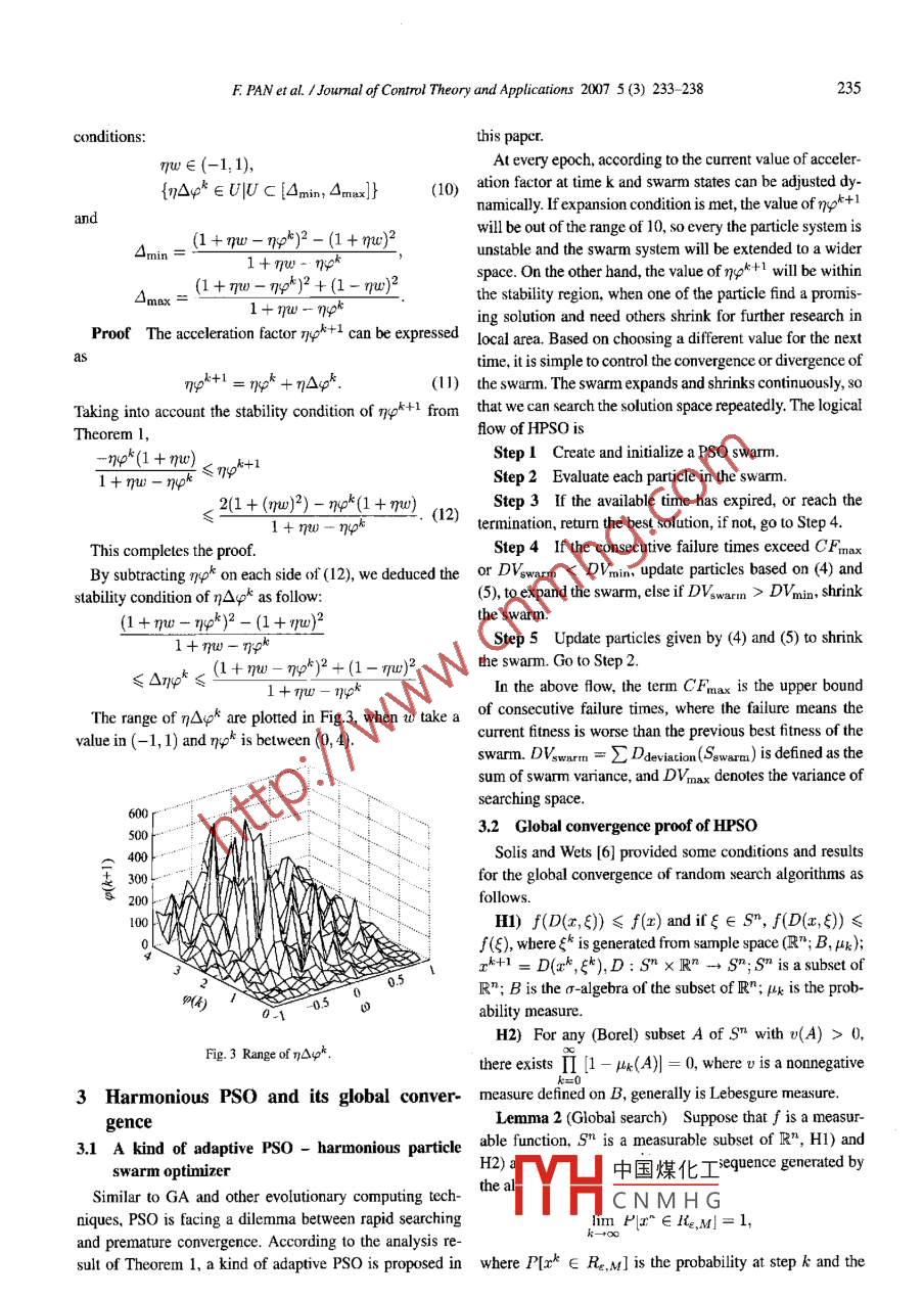 Joumnal of Control Theory and Applications 2007 5(3) 233 -238DOI 10.1007/s1 1768-006-6132-xCommon model analysis and improvement ofparticle swarm optimizerFeng PAN, Jie CHEN, Minggang GAN, Guanghui WANG, Tao CAI(School of Information Science Technology, Beijing Institute of Technology, Beijing 100081, China)Abstract: Particle swarm optimizer (PSO), a new evolutionary computation algorithm, exhibits good performancefor optimization problems, although PSO can not guarantee convergence of a global minimum, even a local minimum.However, there are some adjustable parameters and restrictive conditions which can affect performance of the algorithm.[n this paper, the algorithm are analyzed as a time-varying dynamic system, and the sufcient conditions for asymptoticstability of acceleration factors, increment of acceleration factors and inertia weight are deduced. The value of the inertiaweight is enhanced to (-1, 1). Based on the deduced principle of acceleration factors, a new adaptive PSO algorithm-harmonious PSO (HPSO) is proposed. Furthermore it is proved that HPSO is a global search algorithm. In the experiments,HPSO are used to the model identification of a linear motor driving servo system. An Akaike information criteria basedfitness function is designed and the algorithms can not only estimate the parameters, but also determine the order of themodel simultaneously. The results demonstrate the efectiveness of HPSO.Keywords: Particle swarm optimizer; Asymptotic stability; Global convergence; System identification; Akaike infor-mation criteria1 Introductionby the swarm information pga and its own informationpla.Particle swarm optimizer (PSO) algorithm is aIn this paper, the standard PSO algorithm is analyzed as apopulation-based parallel optimization technique [1], which discrete dynamic system. Sufficient conditions for asymp-exhibits good performance for optimization problems. totic stability are deduccd. On the basis of the analysis,There are some adjustable parameters, such as the inertia a new adaptive PSO algorithm, HPSO, is proposed andweight, acceleration factor, scaled factor, and so on, which proved to be a global search algorithm. Futhermore, com-greatly infuence the convergence performance and stabil- bined with HPSO, a new synthetic method for system iden-ity of the algorithm. Some papers [2~4] about the stability tification, which accomplishes the order selection and pa-analysis have been published with many proposed methods. rameters estimation simultaneously, is applied to a servoAt time k + 1, the update equations of the i-th particle in system. Experiments demonstrate the efctiveness.the d-th dimension search space of the standard PSO algo-2 Stability analysis of PSOrithm are defined as follows:Adjustable parameters of PSO are always tuned empini-嘴1= w0 + C1rpa(pgd -餾) + C2rid(哈-站), (1)cally. The state equations of particles are simplified and an-1物+1=嗡+ moa+1,(2alyzed as a constant coefficient dynamic system [2]. In thiswhich satisfies |u嘴|≤Vmax. where w0 is the inertia weight, section, the suffcient asymptotic stability conditions with-指is the current position of the particle, 哈is the veloc- out Lipschitz condition constrains for acceleration factor 中ity vector,嘴is the personal best position of the particle, and inertia weight w are deduced. First, a lemma is intro-is the swarm best position among all particles, C1 and duced [5].C2 are acceleration factors, respectively, rid and r'gd are ran-Lemma 1 Given time-varying discrete dynamic sys-dom poumbers in the range [0, 1]. As an upper bound of the termns as below:velocity vector in every epoch, Vmaxcan be presented as thex(n + 1)= A(n)x(n).Lipschitz condition of particles dynamic systems.The sufficient condition for asymptotic stability of the|脂1-哈| < Vmax.(3) discrete-time system is that there existIn the search space, the particles“fly" to the target guided中國煤化工4Received 26 July 2006; revised 3 April 2007.YHCNMHGThis work was supported by the Teaching and Rescarch Award Program for Outstanding Young Teacher in Higher Education Instiute of Ministry ofEducation of China (NO. 20010248).234F PAN et al. /Journal of Control Theory and Applications 2007 5(3) 233 -238satistfyingBased on Jury criterion, the sufcient conditionofp(.)< 1p(T(k,k- M))<1,where(mw)2 <1,(9)T(,k-M)=I A(k-i)1 |2rw- L*(1 +ru) + L*np*+1<1+ (mu).問1is the transfer matnix, ρ is the spectral radius andBy calculation, w∈(-1/n, 1/n) satisfying (9) and alsop(T(k,k- M) = max{|\l;i∈n}<1.-np*(1 + mw)≤p+1.Based on Lemma I, Theorem 1 can be deduced.1+mw-npkTheorem 1 The sufcient condition for asymptotic sta-。2(1 + (qu)2)- rp*(1 + mu)bility of PSO algorithm is that: the acceleration factor1+nw-npknpk+1 and inertia weight ηw satisfying the following con-This completes the proof.ditions:At time k + 1, the acleration factor npk + ' and inertianmw∈(-1,1);(4)weight w should meet (4), (5) l0 ensure asymptotic stabil-{πp+1∈U|U C (nt1, ptt)}(5) ity, At a certain moment, if the value range of nηpk+1 sat-andisfies rp*+1∈[UInpmx; mpmin1}, the movement of par--η4*(1 + mw)ticle dynamic system tends to asymptoically stablc; Oth-1+nw-nerwise, the system will diverge. Generally speaking, we canpk+1 =2(1 + (7w)2)- ηp*(1 + nw)assume the initial conditions is that w lake a value in(-1,1)1+mw- ηpand ny° is betwecn (0, 4), then the upper and lower boundProof The standard PSO algoithm can be expressed as curves of nph+1 are potted in Fig.1 and Fig.2.(1 + mw-np*+1) -pu20001500000 t(6)00上0fwhere acceleration factor-50(ψ*+1=p+1+qe+I,-1000-150p:+l=c;Xri,-2000and input vector is2500pf+1.嗜++-p管-0.50.5 1pk+1The transfer matrix of (6) isFig. 1 Range curve of npm故.T(k,k-2)1+mw-np* -nw |「1 + mw-npk+1 -ηw |1000o」500From Lemma 1, if the conditionp(T(k,k- 2)) = max()\i|)< 1- 1000is satisfed, the system described by (6) is asymptoticallystable.|λ- L*Ik+1 + mw nwLk).5|\E -T(k,k -2)1= _τλ+rpw|,(7)0-1-00中國煤化工where Lk =