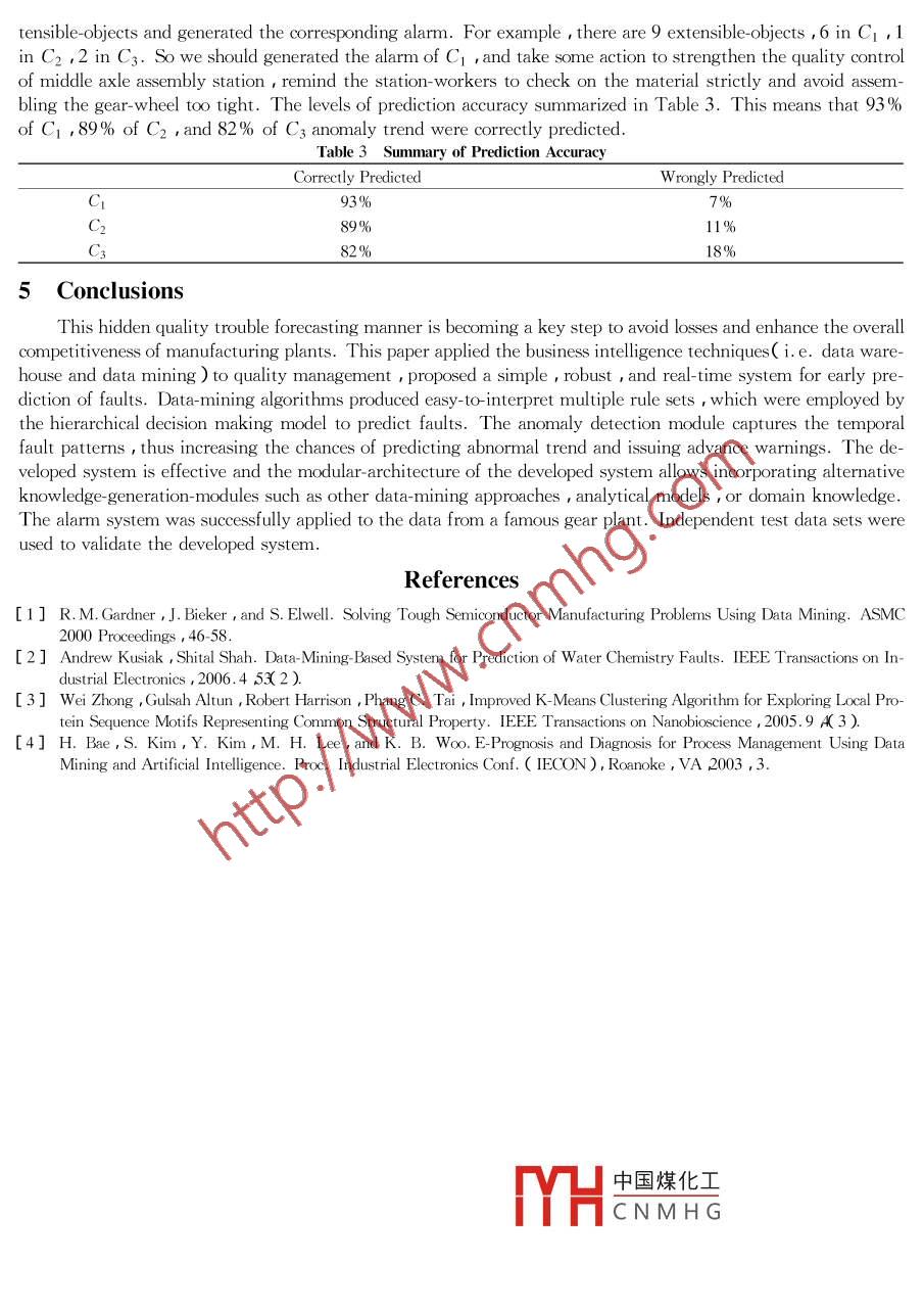 Improved K-means Algorithm for Manufacturing Process AnomalyDetection and RecognitionZHOU Xiaomin' 2 PENG Wei' SHI Haibo'( 1. Shenyang Institution of Automation Chinese Academy of Sciences , Shenyang 1 10016 China E-mail xmzhou@sia. cn ;2. Graduate School , Chinese Academy of Sciences , Beiing 100039 China )Abstract : Anomaly detection and recognition are of prime importance in process industries. Faults are usually rare ,and,therefore , predicting them is difficult. In this paper ,a new greedy initialization method for the K-means algorithm is proposed toimprove traditional K -means clustering techniques. The new initialization method tries to choose suitable initial points , which arerwell separated and hare the potential to form high- quality clusters. Bused on the clustering result of historical disqualificationproduct data in manufacturing process which generated by the Improved- K -means algorithm ,a prediction model which is used todetect and recognize the abnormal trend of the quality problems is constructed . This simple and robust alarmn-system architecture forpredicting incoming faults realizes the transition of quality problems from diagnosis afteruard to prevention be forehand indeed. Inthe end , the alarm model was applied for prediction and avoidance of gear. wheel assembly faults at a gear. plant .Key words: data mining ; clustering ; quality management ; anomaly detection and recognition1 IntroductionFor an enterprise , quality is the life of product and service so implementing the precaution principle is thecore and distillation of modern quality management. The current lag fault diagnosis method is of lttle use to thereal-time manufacturing process quality-control. When the product disqualification is detected , the loss is irre-trievable and this affects the quality and efficiency of production greatly. So how to recognize the early failuresymptom and performance falling-trend , then take a corresponding fault-elimination action beforehand throughmonitoring the process information and product characteristic information becomes more and more important.This manufacturing process excursion forecasting manner is becoming a key step to avoid losses and create a goodproduct reputation.Gearbox is an important component of vehicle drivetrain system and almost 60% gearbox-faults are causedby gear-wheel ,so it is very important to monitor the gear-wheel assembly process and detect the abnormal trendin the gearbox assembly-line. Based on a mass of gearbox performance testing data from a gear plant , this paperanalyzed the gear-wheel assembly process with clustering technology first , then explained the clustering result indomain- expert' s help and formed an anomaly. analysis decision table. To find the hidden quality problem and toprovide abundant decision- making information for the enterprise quality control , the status of each work- stationis monitored with the help of the anomaly forecasting model.2 An Improved K-means Clustering AlgorithmData Clustering is an important technique for exploratory data analysis. Clustering techniques are used forcombining observed objects into clusters which satisfy the criteria that each cluster is homogeneous and should bedifferent from other clusters. K-means is a traditional simple and effective clustering method in common use ,however , there are problems with such a technique :a ) K-means requires the number of clusters to be specifiedbeforehand , but determining the number of clusters is not easy. b ) K-means requires one centroid for each clus-ter , these centroids shoud be placed in a cunning way because of different initial centroids cause different results.c) The abnormality data may be very large , and this may affect the estimation of the data distribution , so thisalgorithm is very sensitive to the abnormality data. To overcome these defects as much as possible , this paperproposed an Improved- K-means clustering algorithm.2.1 Basic Idea of The Improved Algorithm中國(guó)煤化工We' II give you several definitions before describing the id.MYHCNMHGhm:Definition 1 :( ε -neighborhood of a point ) The ε-neighborhood ofapoint p ,denoted by N( p ) , is definedby N( p)= {q∈D|dis( p q)≤e}Definition 2 :( sparse-point ) If the number of points in a e-neighborhood of a point is less than the giventhreshold value MinPts , then this point is called sparse- point , otherwise it is called non- sparse point._ 103Definition 3 :( clustering merging rule ) The cluster center of cluster C; is O; , the cluster center of clusterC;isO{( j≠i ),the center of all the points both in C; and in C; is Ok , then cluster C; and C; satisfty the clus-tering merging ruleif 21p-O;|+ 2|p-0;2q+x2p-O%| (λ∈(0.75 1.5 )). Otherwise ,they don' t satisfy this merging rule. .Definition 4 :( cluster radius ) The maximum distance from points in a cluster to the cluster center.Definition 5 :( the subjection degree of a point to a cluster ) Suppose the center of cluster C; is O; , the clus-ter radius is R , the subjection of a random sample point to cluster C; is :Sul(X ,C)=?。-(r-R312(1)In this formula :r= |X- Ok| , the smaller the σ-value is , the steeper the GAUSS Function is , in general , theσ-value is between 0 and 0.5( σ∈(0 0.5 )).Definition 6 :( the improved maximum- likelihood-classification ) Let the two biggest subjection degree ofsample point X be Sul( X ,Ca )=a andSul( X ,C;)=b ,X belongs to cluster Ca if a and b satisfying the con-dition that a≥( 1 + μ )b otherwise, X belongs to a new cluster. The value of μ is chosen acording to thestrictness of classificatory judgement , they are in direct ratio( commonly μ∈[0 ,1 ]).( 1 ) Because the initialized cluster centroids are crucial to the clustering result of this algorithm , the resultwill be more reasonable and the convergence rate will be faster on the base of the reasonable initialized clustercentroids. So ,the better choice is to place them as much as possible far away from each other