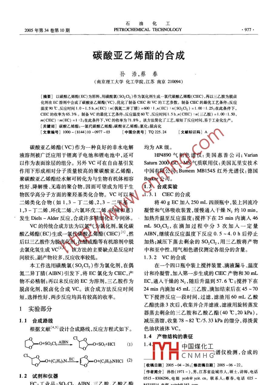石油化工2005年第34卷第10期PETROCHEMICAL TECHNOLOGY●977●碳酸亞乙烯酯的合成孫浩,蔡春(南京理工大學(xué)化工學(xué)院,江蘇南京210094)[摘要]以碳酸乙烯酯( EC)為原料,用磺酰氯(SO2C2 )作為氯化劑生成-氯代碳酸乙烯酯(CIEC) ,再以三乙胺為脫鹵化劑在EC溶劑中合成了碳酸亞乙烯酯( VC) ,優(yōu)化了制備CIEC和VC的工藝參數(shù)。制備CIEC的最優(yōu)工藝條件:反應(yīng)溫度90 C、反應(yīng)時(shí)間1.0-1.5h.n(EC) :m( 偶氮二異丁腈) =00:1 n(EC) :n(SO2Cl) =1.00:1.25;在此條件下,CIEC的收率為65.3%。制備Vc的最優(yōu)工藝條件:反應(yīng)溫度60 C、反應(yīng)時(shí)間1.5h.n(CIEC) :m(三乙胺)=1.00:1.50、m( CIEC) :m(EC) =1 :2;在此條件下,VC的收率為71.8%。該方法簡化了工藝,縮短了反應(yīng)時(shí)間,,易于工業(yè)化生產(chǎn)。[關(guān)鍵詞]磯酸乙嬌酯; -氯代碳酸乙烯酯;碳酸亞乙烯酯;氯化;脫鹵化[文章編號] 100(8144)10 -0977 -03[中圖分類號] TQ 225.24[文獻(xiàn)標(biāo)識碼] A碳酸亞乙烯酯( VC)作為- -種良好的非水電解均為AR級。液溶劑被廣泛應(yīng)用于鋰離子電池和鋰電池中,還可HP4890氣相色譜儀:美國惠普公司; Varian以作為表面涂層的組分。另外VC可在自由基引發(fā)Saturm 2000 GC - MS氣質(zhì)聯(lián)用儀:美國瓦里安技術(shù)作用下形成相對分子質(zhì)量較高的聚碳酸亞乙烯酯,中國 有限公司; Bumem MB154S紅外光譜儀:德國聚碳酸亞乙烯酯經(jīng)水解可轉(zhuǎn)化為與生物有機(jī)體相容Bruker公司。性好、降解慢、無毒的聚合物,因而可望成為用于生1.3合成實(shí)驗(yàn)物醫(yī)學(xué)高分子方面的聚羥基類化合物。VC可以和1.3.1 CIEC 的合成二烯類化合物(如1,3-丁二烯、2,3-二甲基-將40gEC加入250mL四頸瓶中,裝上回流冷1,3-丁二烯環(huán)戊二烯、六氯環(huán)戊二烯、呋喃和蒽) 凝管和氣體吸收裝置, 緩慢通人干燥N2約10 min,發(fā)生Diels - Alder反應(yīng),合成許多精細(xì)化工中間體。、加熱升溫至反 應(yīng)溫度;攪拌下在25 min內(nèi)滴人46VC的傳統(tǒng)合成方法為以氯氣為氯化劑,氯化碳mL SO2Cl2,在滴加過程中分3次加人一定量酸乙烯酯( EC)生成- -氯代碳酸乙烯酯(CIEC)",然AIBN ,繼續(xù)在反應(yīng)溫度下反應(yīng)0.5~4.0h后停止后以三乙胺作為脫鹵化劑,在醚或酯等有機(jī)溶劑中脫加熱;減壓下蒸去剩余的SO2Cl,用三乙胺將產(chǎn)物去氯化氫生成vCl2,3]。該方法的主要缺點(diǎn)是反應(yīng)時(shí)中和至中性,用氣相色譜儀測定各組分的含量。間較長,副產(chǎn)物較多,反應(yīng)收率較低。1.3.2 VC的合成本工作選用磺酰氯( SO2Cl2)作為氯化劑,在偶在一個(gè)四口瓶中裝上攪拌裝置滴液漏斗、溫度氮二異丁腈( AIBN)引發(fā)下,將EC氯化為CIEC,產(chǎn)計(jì)和冷凝管 ,加入第一步生成的CIEC產(chǎn)物和30 mL物不必精制;再以未反應(yīng)的EC為溶劑,三乙胺作為EC,通人干燥的N,隨后升溫到57.6 C ;攪拌下在脫鹵化劑,脫鹵化合成VC。該合成方法反應(yīng)時(shí)間24 min內(nèi)滴加45 mL三乙胺,滴加結(jié)束后在45 ~70短,選擇性好,兩步反應(yīng)均具有較高的收率。C下攪拌反應(yīng)一段時(shí)間,過濾,濾渣用60mL乙酸乙酯洗滌3次后,收集并合并濾液,濾液用旋轉(zhuǎn)蒸發(fā)1實(shí)驗(yàn)部分器蒸去剩余的三乙胺和乙酸乙酯(40 C ,20 kPa),1.1合成路線減壓蒸餾,收集78~82C/5.33kPa的餾分,得淡黃根據(jù)文獻(xiàn)[4,5]設(shè)計(jì)合成路線,反應(yīng)方程式如下。色油狀液體VC。產(chǎn)物結(jié)構(gòu)的表征C8-- -O+SO.CLABN .=0+SO+HCl(1)1.中國煤化工"YHCNMHG譜儀檢測,合成的-O+(CH),NEC .-0+(CH)NHCI (2)[收稿日期] 2005 -04 -26;[修改稿日期] 2005 -06 -22。[作者簡介]孫浩(1971-),男,江蘇省鹽城市人,碩士,講師,電話1.2試劑和儀器0515 - 8306296,電郵ycsh@ yecit. cn。聯(lián)系人:蔡春,電話025 -EC:工業(yè)品;SO2Cl2、AIBN、三乙胺,乙酸乙酯84315514,電郵ycish@ 163. com?!?78.PETROCHEMICAL TECHNOLOGY2005年第34卷.VC紅外光譜數(shù)據(jù)為:1 790 cm -1處為酯羰基特征吸收見表2。由表2可知,當(dāng)反應(yīng)時(shí)間為0.5 h時(shí),CIEC峰,1812cm-1處為碳環(huán)骨架伸縮振動(dòng)吸收峰,3165收率較低;當(dāng)反應(yīng)時(shí)間大于1.0h后,延長反應(yīng)時(shí)cm~'處為= =C- H伸縮振動(dòng)吸收峰,1155,1 105 cm-'間,CIEC收率變化不明顯;當(dāng)反應(yīng)時(shí)間大于4.0h處為C- 0- C 對稱和不對稱伸縮振動(dòng)吸收峰。時(shí),產(chǎn)物CIEC發(fā)黑,發(fā)生了分解。因此選擇反應(yīng)時(shí)1.4.2質(zhì)譜分析間以1.0~1.5h為宜。經(jīng)Varian Satumn 2000 GC - MS氣質(zhì)聯(lián)用儀分表2反應(yīng)時(shí)間對CIEC收率的影響析,產(chǎn)品VC的純度達(dá)98% ,質(zhì)譜譜圖中含有分子Table 2 Effect of reaction time on CIEC yield離子峰(m/z=86)、失去- -分子CO的碎片離子峰Time/h0.51.01.52.04.0Yield, %31.950.852.950.1 DecomposeM- 28(m/z=58)、失去- -分子CO2的碎片離子峰Reaction conitions:n(EC) :n( SO2C2)=1.00:1.25,n(EC) :M -44( m/z=42)。由紅外光譜和質(zhì)譜數(shù)據(jù)證明所n( AIBN)=500:1,90 C.得產(chǎn)物為目標(biāo)產(chǎn)物VC。2.1.3 AIBN 用量的影響2結(jié)果與討論考察引發(fā)劑AIBN用量對CIBC收率的影響,實(shí)驗(yàn)結(jié)果見表3。由表3可知,當(dāng)n(EC) :n (AIBN)=2.1 CIEC 的合成(600~ 700) : 1時(shí), CIEC的收率最高,因此選擇2.1.1反應(yīng)溫度 的影響考察反應(yīng)溫度對CIEC收率的影響,實(shí)驗(yàn)結(jié)果n(EC) :n(AIBN) =600:1較適宜。表3 AIBN 用量對CIEC收率的影