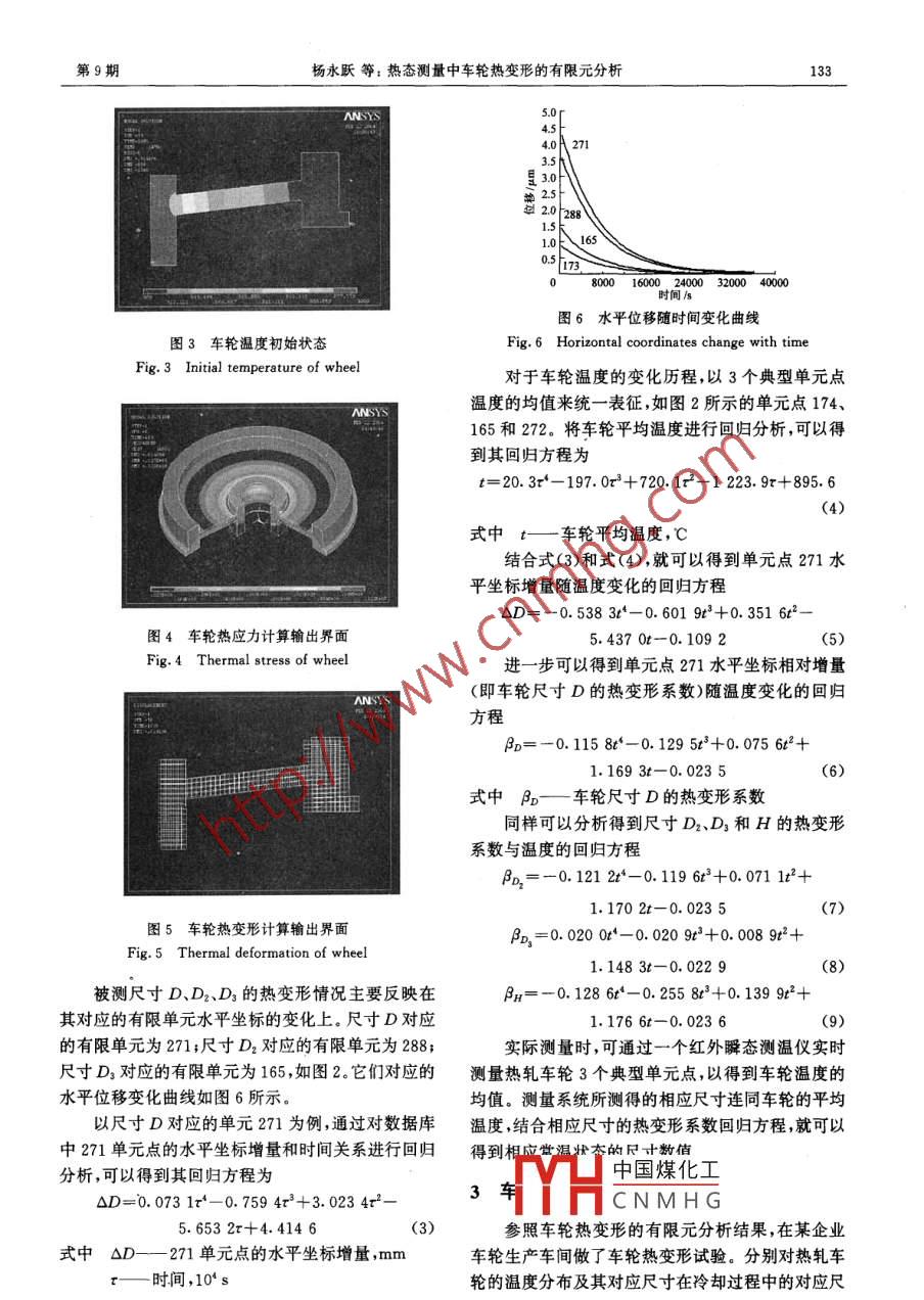 2005年9月農(nóng)業(yè)機(jī)械學(xué)報(bào)第36卷第9期熱態(tài)測(cè)量中車輪熱變形的有限元分析楊永躍鄧善熙梁發(fā)云【摘要】針對(duì)熱軋車輪在線熱態(tài)檢測(cè)中關(guān)鍵的熱變形問題,建立了熱軋車輪的導(dǎo)熱微分方程并對(duì)其進(jìn)行了有限元格式求解。使用有限元方法分析了熱軋車輪的熱應(yīng)力和熱變形歷程,得到了待求熱軋車輪尺寸相應(yīng)的熱變形系數(shù)。試驗(yàn)結(jié)果與理論分析基本吻合。關(guān)鍵詞:車輪熱變形測(cè)量有限元法中圖分類號(hào):TB92文獻(xiàn)標(biāo)識(shí)碼:AFinite Element Analysis of Train Wheel Deformationduring Thermal MeasurementYang Yongyue Deng Shanxi Liang Fayun(Hefei University of TechnologyAbstractThe thermal deformation is a key problem in measuring a roll steel. a heat transfer quationwas set up and solved by the Fe method. the courses of thermal stress and thermal deformationwere analyzed by the Fe method and the coefficients of thermal deformation for the wheeldimensions were obtained. The results from the experiment are accordant with those fromtheoretical analysisKey words Train wheel, Thermal deformation, Measurement, Finite element method引言在進(jìn)行車輪半成品的熱態(tài)測(cè)量時(shí),熱軋車輪的熱變形誤差是影響測(cè)量精度的關(guān)鍵。熱變形誤差約熱軋車輪在線檢測(cè),一直是車輪生產(chǎn)企業(yè)待解占常用儀器總誤差的三分之一,經(jīng)過對(duì)其他誤差源決的問題,要求通過實(shí)時(shí)的熱態(tài)測(cè)量對(duì)應(yīng)得到常溫修正后,儀器總誤差將明顯減小,但熱變形誤差所占態(tài)的構(gòu)件尺寸。由于車輪熱軋生產(chǎn)的連續(xù)性,熱軋車的比例卻上升到總誤差的一半以上因此,采用有限輪溫度高達(dá)千攝氏度,測(cè)量的實(shí)時(shí)性要求高,加之噪元法對(duì)熱態(tài)測(cè)量中車輪熱變形態(tài)和歷程進(jìn)行研究。聲、粉塵,現(xiàn)場(chǎng)條件非常惡劣,給測(cè)量帶來困難目前,工廠用人工對(duì)熱軋車輪進(jìn)行在線檢測(cè)勞1車輪熱變形模型動(dòng)強(qiáng)度大,測(cè)量精度不高,反饋給操作人員的信息不導(dǎo)熱物體內(nèi)部溫度分布規(guī)律的導(dǎo)熱微分方程及時(shí),產(chǎn)品的廢品率高式,是以能量守恒定律和傅里葉定律為基本依據(jù)。作者應(yīng)用主動(dòng)立體視覺測(cè)量技術(shù),在一幀圖像旦解出溫度分布,就可以用傅里葉定律求得物體內(nèi)上獲得過去要用幾個(gè)乃至幾十個(gè)傳感器同時(shí)檢測(cè)才部或表面上任何一點(diǎn)的熱傳導(dǎo)速率,即熱流密度。對(duì)能測(cè)得的多個(gè)參數(shù),實(shí)現(xiàn)熱軋車輪輪廓的高效、可于溫度場(chǎng)隨時(shí)間變化的非穩(wěn)態(tài)導(dǎo)熱問題,通過求得靠在線檢測(cè)。物體內(nèi)部不同時(shí)刻的溫度分布,可以確定部件的熱收稿日期:中國煤化工安徽省“十五”科技攻關(guān)重點(diǎn)項(xiàng)目(項(xiàng)目編號(hào):01022010)CNMHG楊永躍合肥工業(yè)大學(xué)儀器儀表學(xué)院副教授,230009合肥市鄧善熙合肥工業(yè)大學(xué)儀器儀表學(xué)院教授博土生導(dǎo)師梁發(fā)云合肥工業(yè)大學(xué)儀器儀表學(xué)院博土生132農(nóng)業(yè)機(jī)械學(xué)報(bào)2005年應(yīng)力和熱變形。式(1)和式(2)構(gòu)成了熱傳導(dǎo)車輪溫度場(chǎng)的定車輪屬于回轉(zhuǎn)體類零件,其邊界溫度分布完全解。用數(shù)學(xué)方法求解偏微分方程的定解,只有在物體對(duì)稱于中心軸,回轉(zhuǎn)體內(nèi)的溫度分布只是圓柱坐標(biāo)形狀和邊界條件都非常簡(jiǎn)單的情況下才有可能求出中r和z的函數(shù),而與圓周角g無關(guān),采用柱坐標(biāo)較解析解對(duì)于形狀復(fù)雜的工程構(gòu)件,其溫度分布用純?yōu)榉奖?,見圖1。數(shù)學(xué)的方法目前還不能求解,工程中也多是采用近似的方法或數(shù)值的方法計(jì)算。通過構(gòu)造滿足第1類邊界條件近似的溫度場(chǎng)函數(shù),保證第2類、第3類邊界條件的余量加權(quán)積分和為零,利用伽遼金法選擇權(quán)函數(shù),同時(shí)考慮時(shí)間域變(,p, z)量函數(shù),就可以得到熱軋車輪溫度場(chǎng)導(dǎo)熱微分方程的一般有限元格式,相關(guān)證明見文獻(xiàn)[3,4]。2 ANSYS分析結(jié)果ANSYS有限元分析軟件可處理熱傳遞的3種基本類型:傳導(dǎo)、對(duì)流和輻射,可以進(jìn)行穩(wěn)態(tài)和瞬態(tài)圖1微元體導(dǎo)熱分析線性和非線性分析。Fig. 1 Analysis of thermal conduction of element利用 ANSYS軟件對(duì)熱軋車輪從高溫狀態(tài)到常根據(jù)能量守恒定律,軸對(duì)稱構(gòu)件溫度場(chǎng)的導(dǎo)熱溫狀態(tài)的瞬態(tài)冷卻過程進(jìn)行了分析和計(jì)算。為便于微分方程為有限元單元網(wǎng)格的劃分,對(duì)熱軋車輪的幾何形狀進(jìn)aT_13(,3T⊥3|37(1)行了一些簡(jiǎn)化,圖2所示為簡(jiǎn)化后的車輪截面形狀及其有限元單元網(wǎng)格的劃分和定義情況。輸入車輪式中A導(dǎo)熱系數(shù),W/(m·K)材料的熱物理參數(shù)導(dǎo)熱系數(shù)674W/(m·K),T—溫度,KP—密度,kg/m3密度7800kg/m3,比熱容482J/(kg·K),彈性模c—比熱容,J/(kg·K)6—時(shí)間,s量217GPa,線膨脹系數(shù)1.5MK-,泊松比0.32對(duì)于特定的導(dǎo)熱過程,除了用上述導(dǎo)熱微分方程來描述外,還需要有表達(dá)該過程特點(diǎn)的補(bǔ)充說明條件:幾何條件、物理?