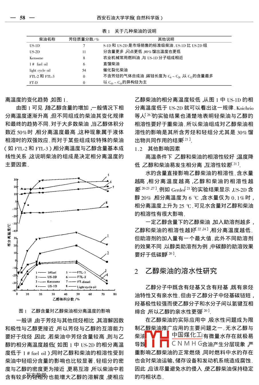 2004年11月西安石油大學(xué)學(xué)報(bào)自然科學(xué)版)Nov.2004第19卷第6期Journal of Xi'an Shiyou Universit( Natural Science EditionVol. 19 No 6文章編號(hào):1001-5362004)60057-06乙醇柴油的研究現(xiàn)狀Present situation of the researches on ethanol diesel oil古文英史權(quán)彭勃徐春明(石油大學(xué)重質(zhì)油加工國(guó)家重點(diǎn)實(shí)驗(yàn)室北京昌平102249)摘要∶綜述了乙醇柴油的研究現(xiàn)狀包括乙醇和柴油的相溶性及其影響因素助溶劑的開(kāi)發(fā),乙醇柴油的主要物化性質(zhì)和燃燒、排放性質(zhì)的研究.乙醇含量越低、柴油中芳烴和輕組分含量越高溫度越高水含量越低勔溶劑表面活性越高則乙醇與柴油旳相溶性越好冋時(shí)乙醇柴油的溶水性也越好柴油中加入乙醇后腐蝕性稍有增大,十六烷值、閃點(diǎn)、黏度、低熱值、初餾點(diǎn)均降低其中閃點(diǎn)降到約16℃初餾點(diǎn)降到約7?℃燒乙醇柴油的發(fā)動(dòng)機(jī)油耗率增大能耗率減小熱效率提高匯O和碳煙及顆粒排放物明顯降低關(guān)鍵詞:乙醇柴油相溶性助溶劑物化性質(zhì)燃燒排放性質(zhì)中圖分類號(hào):IE626.21文獻(xiàn)標(biāo)識(shí)碼由于受到石油資源日益枯竭的嚴(yán)重威脅以及全率高及排放低污染等伉點(diǎn)1l91所以通過(guò)添加乙醇世界對(duì)環(huán)境保護(hù)的高度重視傳統(tǒng)的石油燃料來(lái)增加柴油的用量并解決柴油燃燒所帶來(lái)的高污染汽油和柴油的使用面臨著極大的挑戰(zhàn)世界各國(guó)在問(wèn)題已成為一條行之有效的途徑越來(lái)越受到廣泛不同程度上加緊對(duì)汽車替代燃料和混合燃料的開(kāi)發(fā)重視相關(guān)技術(shù)問(wèn)題也得到進(jìn)一步深入研究和利用1目前對(duì)乙醇柴油的研究重點(diǎn)集中在乙醇與柴乙醇作為可再生的生物能清潔燃料成為最具有油的相溶性、開(kāi)發(fā)助溶劑并考察乙醇柴油的主要物發(fā)展前景的汽車代用燃料之一13在美國(guó)的能源性及燃燒、排放性質(zhì)等幾方面政策法中乙醇作為清潔燃料已有了明確的規(guī)定3由于具有辛烷值高、燃燒低污染等特點(diǎn)目前乙醇作1乙醇和柴油的相溶性硏究為汽油的調(diào)合組分混配成乙醇汽油已得到深入的研究4131并且含乙醇5%~20%的乙醇汽油在美國(guó)乙醇柴油屬于多液混合燃料其相狀態(tài)對(duì)各種巴西及歐洲等國(guó)家得到了廣泛應(yīng)用我國(guó)2001年在物化性質(zhì)有著直接影響柴油屬于烴類燃料乙醇中河南、吉林兩省也進(jìn)行了試點(diǎn)銷售4J5.乙醇柴油含有烴基和羥基這說(shuō)明柴油和乙醇在結(jié)構(gòu)上具有的研究早在20世紀(jì)0年代就已開(kāi)始但由于乙醇定的相似性,一定條件下能夠相互溶解∞其相和柴油的相溶性較羞(需要添加助溶劑改善其相溶溶性受到乙醇含量、柴油組成等因素的影響性)及乙醇柴油成本較高的限制吲3到目前為止只1.1乙醇含量和柴油組成對(duì)相溶性的影響有巴西政府剛剛批準(zhǔn)生產(chǎn)含醇3%的乙醇柴油并在K.R. Gerdes和G.J.Sups52對(duì)乙醇和柴油的市場(chǎng)上銷售16但從總的發(fā)展趨勢(shì)看燃用柴油比相溶性作了較細(xì)致的研究他們針對(duì)不同組成的柴燃用汽油節(jié)約燃料30%,世界車用燃料中柴汽比例油中國(guó)煤化工的增加乙醇柴油相分不斷提高178而且醇類燃料用于柴油機(jī)具有熱效CNMHG收稿日期:2004-07-14作者簡(jiǎn)警提爽(197)女河北青縣人士研究生從事乙醇柴油特性方面的研究西安石油大學(xué)學(xué)報(bào)自然科學(xué)版)表1關(guān)于幾種柴油的說(shuō)明柴油名稱芳烴質(zhì)量分?jǐn)?shù)其他說(shuō)明US-IDs1D和US2D是市場(chǎng)銷售的標(biāo)準(zhǔn)級(jí)柴油.US1D比US2D組US-2D分含量更多閃點(diǎn)更低90%餾出溫度也更低農(nóng)業(yè)機(jī)械常用燃料油與US-1D分子組成相近I fuel oil71864直餾柴油light cycle oil催化裂化柴油FTL2和FT3不含芳烴的氣體合成油碳鏈長(zhǎng)度為C6~Ca以C12的含量最多FT-D以C1-C1的異構(gòu)烴為主離溫度的變化趨勢(shì)如圖1乙醇柴油的相分離溫度較低從圖1中US-ID的相由圖1可見(jiàn)隨乙醇含量的增加,般情況下相分離溫度低于US-2D就可以看岀這一規(guī)律. Koichrio分離溫度逐漸升高但不同組成的柴油其變化規(guī)律等人36的實(shí)驗(yàn)結(jié)果也清楚地表明輕柴油與乙醇的和最終的趨勢(shì)不同對(duì)于大多數(shù)柴油當(dāng)乙醇體積分相溶性要好于重柴油.所以柴油組成對(duì)乙醇柴油相數(shù)近50%時(shí)相分離溫度最高,這種現(xiàn)象屬于液體溶性的影響是其所含芳烴和輕組分尤其是30%餾相溶時(shí)的雙強(qiáng)效應(yīng).而對(duì)于某些組成較特殊的柴油岀物共同作用的結(jié)果21如FL2和PⅢL-3)相分離溫度與乙醇含量基本成1.2其他影響因素線性關(guān)系這說(shuō)明柴油的組成是決定相分離溫度的高溫條件下乙醇和柴油的相溶性較好溫度降主要因素低乙醇和柴油易發(fā)生相分離互溶性較差水的含量直接影響乙醇柴油的相溶性.含水量越高,相分離溫度越高,乙醇和柴油的相溶性越差02327.例如 gerdes21的實(shí)驗(yàn)結(jié)果顯示JS2D含醇20%相分離溫度為6℃含水量?jī)H為0.1%時(shí)相分離溫度上升為25℃.可見(jiàn)水含量對(duì)乙醇和柴油的相溶性有很大影響定乙醇含量下的乙醇柴油加入助溶劑越多乙醇和柴油的相溶性越好2241,相分離