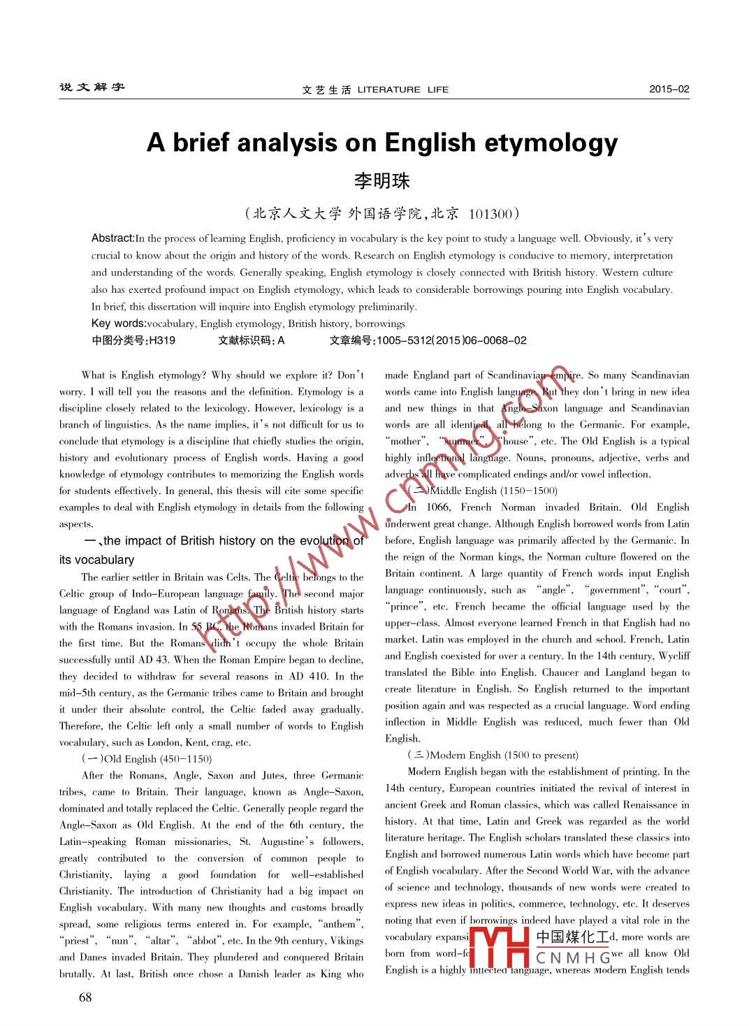 說(shuō)文解字文藝生活LITERATURE LIFE2015-02A brief analysis on English etymology李明珠(北京人文大學(xué)外國(guó)語(yǔ)學(xué)院,北京101300)Abstract:In the process of learning English, proficiency in vocabulary is the key point to study a language well. Obviously, it' s verycrucial to know about the origin and history of the words. Research on English etymology is conducive to memory, interpretationand understanding of the words. Generally speaking, English etymology is closely connected with British history. W estern culturealso has exerted profound impact on English etymology, which leads to considerable borrowings pouring into English vocabulary.In brief, this disertation will inquire into English etymology preliminarily.Key words:vocabulary, English etymology, British history, borrowings中圖分類(lèi)號(hào):H319文獻(xiàn)標(biāo)識(shí)碼:A文章編號(hào):1005- 5312(2015 )06- -0068 -02What is English etymology? Why should we explore it? Don' t made England part of Scandinavian empire. So many Scandinavianworry. I will tell you the reasons and the definition. Etymology is a words came into English language. But they don' t bring in new ideadiscipline closely related to the lexicology. However, lexicology is a and new things in that Anglo- Saxon language and Scandinavianbranch of linguistics. As the name implies, it' s not difficult for us to words are all identical, all belong to the Germanic. For example,conclude that etymology is a discipline that chielly studies the origin,‘mother ’,“ summer',“house' ', etc. The Old English is a typicalknowledge of etymology contributes to memorizing the English words adverbs all have complicated endings and/or vowel inflection.for students effectively. In general, this thesis will cite some specifie(二)Middle English (1150- 1500)examples to deal with English etymology in details from the followingIn 1066, French Norman invaded Britain. Old Englishaspects.underwent great change. Although English borrowed words from Latin-、the impact of British history on the evolution of before, English language was primarily afected by the Germanic. Inits vocabularythe reign of the Norman kings, the Norman culture flowered on theThe earlier sttler in Britain was Celts. The Celtic belongs to theBritain continent. A large quantity of French words input EnglishCeltic group of Indo-Eurpean language family. The second major language continuously,language of England was Latin of Romans. The Brtish history starts prince, etc. French became the oficial language used by thewith the Romans invasion. In 55 BC, the Romans invaded Britain forupper- -class. Almost everyone learned French in that English had nothe frst time. But the Romans didn't oceupy the whole Britain market. Latin was employed in the church and scool. French, Latinsesauly unil AD 43. When the Roman Empire began to dedine, and English coexisted for over a century. In the 14h cntury, Wyelifthey decided to withdraw for several reasons in AD 410. In thetranslated the Bible into English. Chaucer and Langland began tomid-5th century, as the Germanic tribes came to Britain and brought create lierature in English. So Englsh returned to the importatit under their absolute control, the Celie faded away gradually position agin and was respected as a crucial language. Word endingTherefore, the Celtic left only a small number of words to Englishinflection in Middle English was reduced, much fewer than OldEnglish.vocabulary, such as London, Kent, crag, etc.(一)Old English (450-1150)(三)Modern Engish (1500 to present)Afer the Romans, Angle, Saxon and Jutes, three GermanicModern English began with the establishment of printing. In thetribes, came to Britain. Their language, known as Angle- Saxon,14th century, European countries initiated the revival of interest indominated and totally replaced the Celtic. Generally people regard theancient Greek and Roman classics, which was called Renaissance inAngle- -Saxon as Old English. At the end of the 6th century, thehistory. At that time, Latin and Greek was regarded as the worldLatin-speaking Roman missionaries, St. Augustine' s followers,literature heritage. The English scholars translated these classics intogrealy contributed to the convesion of common peple to English and brrowed numerous Latin words which have become partChristianity,laying a good foundation for well-establishedof English vocabulary. After the Second World W ar, with the advanceChristianity. The introduction of Christianity had a big impact onof science and technology, thousands of new words were created toEnglish vocabulary. With many new thoughts and customs broadly express new ideas in politics. conmerce, technology, eltc. It deservesspread, some rligous terms entered in. For example, “amthem”, noing that even if borowings indeed have played a vital role in the“priest”,“nun’ ,‘altar' ,“ abbot”, etc. In the 9th century, Vikings中國(guó)煤化工d, more words areand Danes invaded Britain. They plundered and conquered Britainborn from word: -f(YHCNMH Gwe all know Oldbrutally. At last, British once chose a Danish leader as King who English is a highly Ttteted language, whereas Modem English tends682015- -02.文藝生活LITERATURE LIFE說(shuō)文解字to become the analytic language with words endings mostly lost. They“kulak”is from“kyrak”(Russian)are quite different from each other.4.Semantic-loans二.the influence of foreign words on the Englishvocabularying instead of the form. Their form is native. In other words, the exist-(一) What is the foreign wordsing words of English are endowed with new meanings. Take“ dream”"By origin, English words can be divided into natve words and for example. Its original meaning was‘hppnes" and' 'music ,foreign words. Native words are originated from the Germanic tribes whereas its modem meaning was borowed from Old Norse. Besides,including Angle, Saxon and Jutes, also known as A