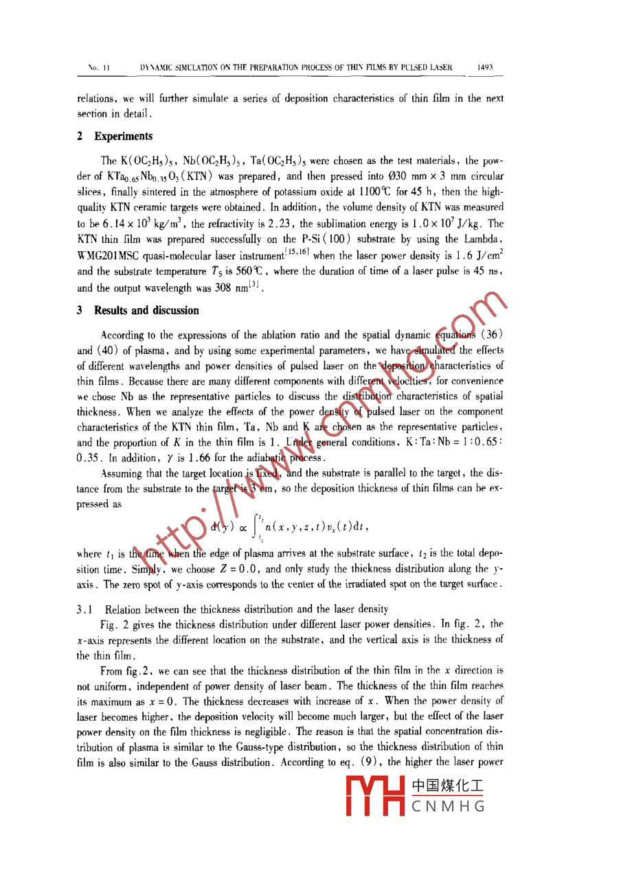 Vvol. 44 Sio. 11 .SCIENCE IN CHINA (Series A)Novenber 2001Dynamic simulation on the preparation process of thin filmsby pulsed laserZHANG Duanming (張端明), LI Zhihua (李智華)', YU Boming (郁伯銘)',HUANG Mingtao (黃明濤)', GUANLi(關(guān)麗)',ZHONG Zhicheng (鐘志成)2 & L Guodong (李國棟)=1. Depatment of Physics, Huazhong University of Science and Technology, Wuhan 430074. China;2. Departnent of Physics. Xiangfan Universily. Xiangfan 410000 ChinaCorespondence should be adresed to Zhang Duanming ( email: zhangd @ public. wuhan. cngb. com)Received March 20, 2001AbstractAn ablation model of targets iradiated by pulsed laser is established. By using the simpleenergy balance conditins, the relationship between ablation surface location and time is derived. Byan adiabatic approximation, the continuous-temperature condition, energy conservation and all bound-ary conditions can be established. By applying the analytical method and integral-. approximationmethod, the solid and liquid phase temperature distributions are obtained and found to be a function oftime and location. The interface of solid and liquid phase is also derived. The results are comparedwith the other published data. In additin, the dynamics process of pulsed laser deposition of KTN(Kta. sNb, xsO,) thin fim is simulated in detail by using fluid dynamics theory. By combining the ex-pression of the target ablation ratio and the dynamic equation and by using the experimental data, theeffects of laser action parameters on the thickness distrbution of thin film and on the thin film compo-nent characterstics are discussed. The results are in good agreement with the experimental data.Keywords: ablation ratio, KTN thin flm, plasma. pulsed laser deposition (PLD).In recent years,with the development of the high-density pulsed laser technique, the PulsedLaser Deposition (PLD) technigue shows its special advantages,2. ,such as high-deposition ve-locity, low substrate temperature and similarity between target and thin flm components. Although many kinds of functional thin flms'. . have been prepared and great progresses in experi-menls have been made, lttle attention was paid to the understanding of the mechanism of thePLD. Singh and Narayan'SI proposed a theoretical model for plasma expansion, but the systemati-cal study in this area was still very limited. lIt is very important 10 prepare the high-quality thinfilm and study the thin flm physics for better understanding the mechanism and dynamie process-es of the interactions between a pulsed laser and a target. In this paper, the PLD mechanism isstudied systematically ,including the ablation process , expansion process and deposition process .First, according to the energy balance conditions, the ablation surface Jocation as a function oftime is derived; then by using the appropriate boundary conditions , we calculate the temperaturedistribution and the interface location of solid and liquid phases . Secondly, based on the modifiedS-N model and on the hydrodynamie theory, the motion equation of plasma generated by pulsedlaser is derived. By combining the ablation process with the spatial-expansion process of plasma,the process equations are obtained which can be used to describe the process of the quasi- molecu-lar deposition for KTN thin films .中國煤化工MYHCNMHG1486SCIENCE IN CHINA (Series A)Vol. 441 Theoretical modelThe process of PLD is generally casified into three separate regimes: (i) the high densityand high lemperature existing on the larget surface iluminated by pulsed laser; (ii) the plasmaexpanding into the vacuum space; (ii) then the plasma depositing on the substrate. We now de-scribe the three processes in the fllowing.1.1 Pulsed-laser ablation modelWhen a high-powered laser beam iradiates on a target surface, the target will absorb thelaser energy and sputter out high-lemperalure and high pressure plasma, and meanwhile, a pantof the target will be liquated. A sketch of the laser- solid interaction is shown infig. I.Fig.1 shows that during the incidence of alaser pulse, three separate purts can be distin-Laser beams guished. (a) High-temperature and high-pressureplasma cloud which can be divided into two re-gions: corona region and conduction region6 ( seec) (b) (a)regions A and B in fig. 1). Ninety-eight percentFig. 1. A sketch of the laser-solid interacin.of laser energy is deposited in corona by the in-verse bremsstrahlung absorption process, and thena part of the absorbed energy will transfer into the ablation surface because of existence of temper-ature gradient. (b) Liquid phase region generated by the liquated target. (c) Solid phase regionabsorbing the conducting energy。In addition, the heating and meling processes of pulsed laserirrudiation on material constitute a three-dimensional heat flow problem. But in the mlliecondprocess, the short thermal difusion distance and the large dimension of the laser beam comparedto the melt depth limit the thermal gradient parallel to the interface to several orders of magnitudeless than the gradient perpendicular to0 the interface. Thus, the problem can be simplified into aone-dimensional heat flow problem . The solid and liquid phase temperatures , ablation surface po-sition and the dynamic interface are discussed in detail in the next seetion.1.1.1 Ablation ratio and the ablaion process of pulsed laser.The ablation ratio for a tar-get for pulsed laser can be expressed asN = pd/(tm),(1)where N is the evaporating ratio of particles for a unit dimension,τ is the duration of time of laserpulse, P represents the target density, d is the depth of ablated target, and m is the ablatedAssuming that the power densily of ineident laser pulse is lo, the absorbing coficient is b,the power density 1(x) at the location x satisfiesd/(x)/dx =- 61(x),(2)with the boundary condition: x=0,1(0)= lo, then1(x) = lge~,(3)When a beam of laser transmits to the location x,,中國煤化工reasesto 1,. thelaser cannot evaporale p