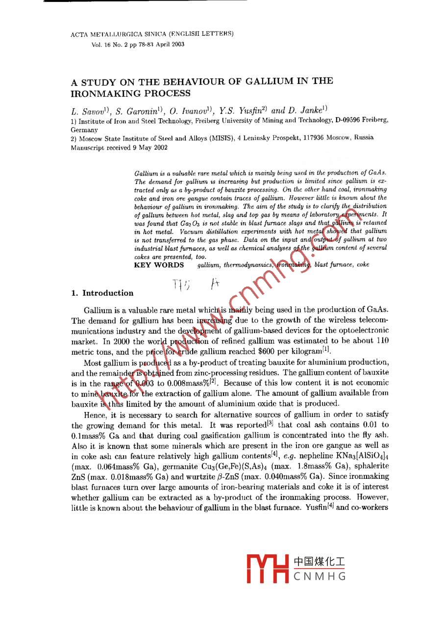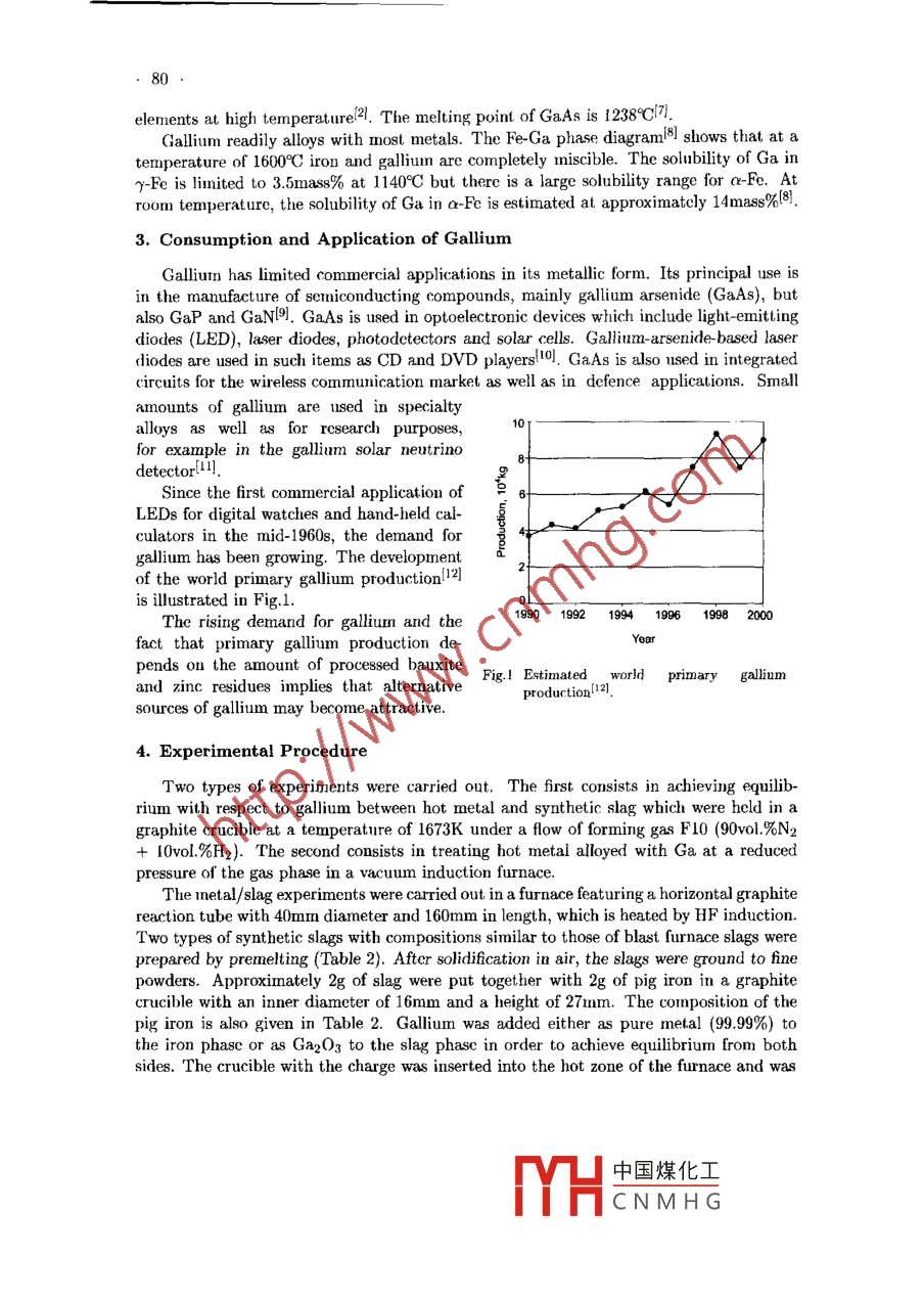 ACTA METALIJURGICA SINICA (ENGLII LETTERS)Vol. 16 No. 2 pp 78-83 April 2003A STUDY ON THE BEHAVIOUR OF GALLIUM IN THEIRONMA KING PROCESSL. Sao), S. Garonin), 0. Ioanov), Y.S. Yusfin2) ard D. Jankse)1) Istitte of Iron and Steel Technology, Freiberg Universty of Mining and Technology, D-09596 Freiberg,Germany2) Moscow State Institute of Steel and Alloys (MISIS), 4 Leninsky Prospekt, 117936 Moscow, RussiaManuscript received 9 May 2002The demand for gallum is increasing but production i8 limited since gallium is ex-tracted only as a by-product of bauxite processing. On the other hand coal, ironmakingcoke and iron ore gangue contain tmaces of galliun. However lttle is known about thebehaviour of gallium in ironmaking. The aim of the study ig to clarify the distributionof gllsum between hot metal, slag and top gas by means of laboratory erperimenls. Itwas found that Ga2O3 is not stable in blast furnace slags and that gllium is relarnedin hot metal. Vacum distillation erperiments with hot metal showed that galliumis not transferred to the gas phase. Data on the input and output of gallium at twoindustrial blast fumaces, as well as chemical analyses of the gallium content of severalcokes are presented, too.KEY WORDSgalium, thermodynamics, irnmaking, blast fumnace, cokeT151. IntroductionGallium is a valuable rare metal which is mainly being used in the production of GaAs.The demand for gallium has been increasing due to the growth of the wireless telecom-munications industry and the development of gallium-based devices for the optoelectronicmarket. In 2000 the world production of refined gallium was estinated to be about 110metric tons, and the price for crude gallium reached $600 per kilogram[4l.Most gallium is produced as a by-product of treating bauxite for aluminium production,and the remainder is obtained from zinc-processing residues. The gallium content of bauxiteis in the range of 0.003 to 0.008mass%l2. Because of this low content it is not economicto mine bauxite for the extraction of gallium alone. The amount of gallium available frombauxite is thus limited by the amount of aluminium oxide that is produced.Hence, it is necessary to search for alternative sources of gallium in order to satisfythe growing demand for this metal. It was reportedl3] that coal ash contains 0.01 to0.1mass% Ga and that during coal gasification gallimn is concentrated into the fty ash.Also it is known that sormne minerals which are present in the iron ore gangue as well asin coke ash can feature relatively high gallium contents(國(guó), e.g. nepheline KNa3[AISiO4]4max.0.064mass% Ga), germanite Cug(Ge,Fe)(S,As)4 (max. 1.8mass% Ga), sphaleriteZnS (max. 0.018mnass% Ga) and wurtzite β ZnS (max. 0.040mass% Ga). Since ironmakingblast furnaces turn over largc amounts of iron-bearing materials and coke it is of interestwhether gallium can be extracted as a by-product of the ironmaking process. However,little is known about the behaviour of gallium in the blast furnace. Yusfin!4i and co-workers中國(guó)煤化工MYHCNMHG79determined the gllium input and output at two Russian blast furnace shops (Table 1).The industrial data show that almnost all of the gallium introduced into the blast furnaceis dissolved in hot metal, and only traces of galliuim are found in slag and dust. It shouldbe noted. too, that the glliumn content of blast furnace sludge is relatively high (Table 1).Table 1 Measured input and output of gallium in g/t material and g/t hot metal(HM), respectively, at blast furnaces in Russial4IronmakingInputOutputplantCokeSinterPelletsHot MetalSlag DustSludgeSeverstal5-10 70- 100 5- 7(*)60- 110 Max.2 Traces 150 - 250(ing/t HM) 2-5 60 - 1202- 360- 110 Traces Traces 1.5 - 3.0Tulachermet 30- 40 20 - 40 5- 10(**) 30- 80 Max.3 Traces Max.200(in g/t HM) 15-25 25- 50 .2- 530 - 80 Traces TracesMax.2Note: (*) 一Kostamuscba pellets; (**)一: Lebedinski pellets.One can expect that Ga and Al in the blast furnace behave in a similar way since theseelements are vertical neighbours in the IIA group of the Periodic Table. However theindustrial data in Table 1 show the opposite because it is well known that most aluminiumintroduced into the blast furnace is found as Al2O3 in the slag. Therefore the aim ofthe present study is to clarify the distribution of gallium between the products of theironmaking process: hot metal, slag and top gas, by means of laboratory experimentscarried out under defined conditions. Chemical analysis of various types of coke werecarried out, too, in order to check whether the gallium content varies strongly dependingon the coke.2. Physico-chemical Behaviour of Gallium at Elevated TemperaturesSome physical and thermal properties[5,6] of gallium are as follows: atormic number 31問(wèn),atomic weight 69.7235, melting point (m.p.) 29.76C51, boiling point (b.p.) 2204C5, den-sity: sol. at 29.69C 5.904g.cm - -3[5] and liq. at 29.89C 6.095g.cm -3[5, viscosity 1.94mPa.sl6]at m.p, 1.266mPasl5 at 200°C and 0.578mPa.sl5 at 11009C, enthalpy of fusion (at m.p.)80.2J.g -3[5, heat capacity (at 25C) 25.86J mol 1.K - 1例), thermal conductivity (at 27C)0.406W.cmn-1.K-16. Gallium is one of the few metals which can be liquid near roomtemperature and features the longest liquid range of any element. The vapour pressures ofgallium and several other metals as a function of temperature can be seen in Ref.[6]. .In its corpounds, the valency of gallium is usually 3. The monovalent state is unstable,although the monovalent gallium compounds Ga2O and GaCl can be isolated2. Liquidgallium oxidises rapidly and forms a protective layer of oxide. The oxygen compounds ofgallium resemnble those of aluninium in that there are bigh and low temperature formsof Ga2O3 and two hydroxides, Ga(OH)3 and GaO.0H. The melting point of Ga2O3 is1800°C171. It is evident from Ref.[7] that Ga2O3 is less stable than Al2O3 but more stablethan the oxides of other group IIA elements. Data in Ref.[7] also shows that Ga2O3 isreduced by carbon at tempera