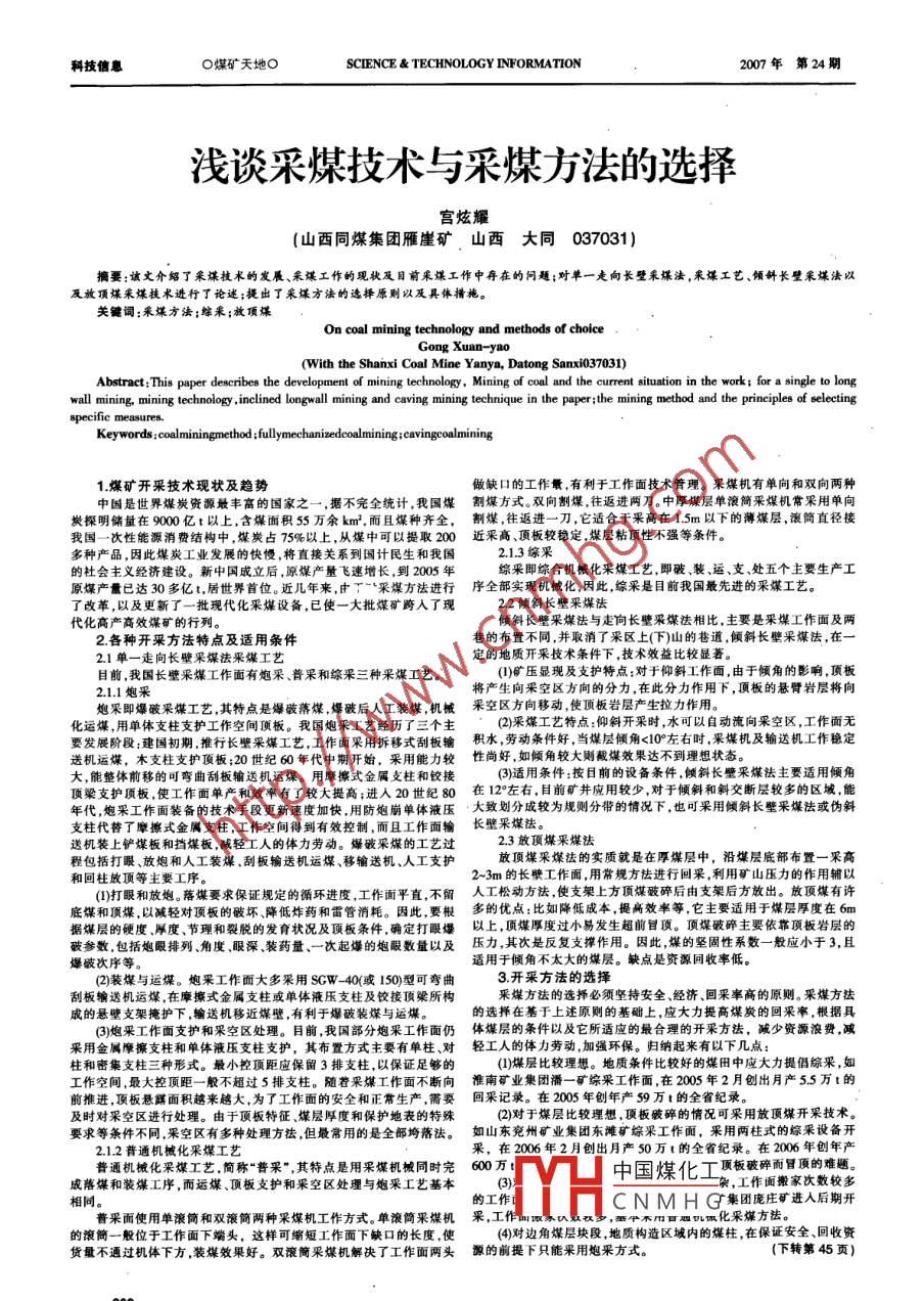 科技信息O煤礦天地口SCIENCE & TECHNOLOGY INFORMATION2007年第24期淺談采煤技術(shù)與采煤方法的選擇宮炫耀(山西同煤集團(tuán)雁崖礦、山西大同037031)摘要:該文介紹了采煤技術(shù)的發(fā)展、采煤工作的現(xiàn)狀及目前采煤工作中存在的問(wèn)題;對(duì)單一走向長(zhǎng)璧采煤法,采煤工藝、傾斜長(zhǎng)壁采煤法以及放頂煤采煤技術(shù)進(jìn)行了論述;提出了采煤方法的選擇原則以及具體措施。關(guān)鍵詞:采煤方法;綜采;放頂煤On coal mining technology and methods of choiceGong Xuan- yao(With the Shanxi Coal Mine Yanya, Datong Sanxi037031)Abstract:This paper describes the development of mining technology, Mining of coal and the current situation in the work; for a single to longwall mining, mining technology ,inclined longwall mining and caving mining technique in the paper ;the mining method and the principles of selectingspecifie measures.1.煤礦開采技術(shù)現(xiàn)狀及趨勢(shì)做缺口的工作最,有利于工作面技術(shù)管理。采煤機(jī)有單向和雙向兩種中國(guó)是世界煤炭資源最豐富的國(guó)家之- ,據(jù)不完全統(tǒng)計(jì),我國(guó)煤割煤 方式。雙向割煤.往返進(jìn)兩刀。中厚煤層單躥簡(jiǎn)采煤機(jī)常采用單向炭探明儲(chǔ)量在90億t以上,含媒面積55萬(wàn)余kmr,而且煤種齊全,割煤 ,往返進(jìn)一-刀,它適合于采高在1.5m以下的薄煤層,讓筒直徑接我國(guó)一次性能源消費(fèi)結(jié)構(gòu)中,煤炭占75%以上,從煤中可以提取200近采高 頂板較穩(wěn)定,煤層粘頂性不強(qiáng)等條件。多種產(chǎn)品,因此煤炭工業(yè)發(fā)展的快慢,將直接關(guān)系到國(guó)計(jì)民生和我國(guó)綜采即綜合機(jī)械化采煤工藝,即破、裝、運(yùn)、支處五個(gè)主要生產(chǎn)工2.1.3綜采的社會(huì)主義經(jīng)濟(jì)建設(shè)。新中國(guó)成立后,原煤產(chǎn)量飛速增長(zhǎng),到2005年原煤產(chǎn)量已達(dá)30多億t,居世界首位。近幾年來(lái),由下一采煤方法進(jìn)行序全部實(shí)現(xiàn)機(jī)械化 .因此,綜采是目前我國(guó)最先進(jìn)的采煤工藝。了改革,以及更新了一批現(xiàn)代化采煤設(shè)備,已使- -大批煤礦跨人了現(xiàn)2.2傾斜長(zhǎng)壁采煤法傾斜長(zhǎng)壁采煤法與走向長(zhǎng)壁采煤法相比,主要是采煤工作面及兩代化高產(chǎn)高效煤礦的行列。2.各種開采方法特點(diǎn)及適用條件巷的布置不同,并取消了采區(qū)上(下)山的巷道,傾斜長(zhǎng)壁采煤法,在一2.1單一走向長(zhǎng)壁采煤法采煤工藝定的地質(zhì)開采技術(shù)條件下,技術(shù)效益比較顯著。目前,我國(guó)長(zhǎng)壁采煤工作面有炮采、普采和絳采三種采煤工藝?!?1)礦壓顯現(xiàn)及支護(hù)特點(diǎn):對(duì)于仰斜工作面,由于傾角的影響,頂板2.1.1 炮采將產(chǎn)生向采空區(qū)方向的分力,在此分力作用下,頂板的懸臂巖層將向炮采即爆破采煤工藝,其特點(diǎn)是爆破落煤,爆破后人工裝煤,機(jī)械采空區(qū)方向移動(dòng) ,使頂板巖層產(chǎn)生拉力作用?;\(yùn)煤,用單體支柱支護(hù)工作空間頂板。我國(guó)炮采工藝經(jīng)歷了三個(gè)主(2)采煤工藝特點(diǎn):仰斜開采時(shí),水可以自動(dòng)流向采空區(qū),工作面無(wú)要發(fā)展階段:建國(guó)初期,推行長(zhǎng)壁采煤工藝,工作面采用拆移式刮板輸積水,勞動(dòng)條件好,當(dāng)煤層傾角<10°左右時(shí).采煤機(jī)及輸送機(jī)工作穩(wěn)定送機(jī)運(yùn)煤,木支柱支護(hù)頂板;20世紀(jì)60年代中期開始,采用能力較性尚好 ,如傾角較大則藏煤效果達(dá)不到理想狀態(tài)。大,能整體前移的可彎曲刮板輸送機(jī)運(yùn)煤。用摩擦式金屬支柱和鉸接(3)適用條件:按目前的設(shè)備條件.傾斜長(zhǎng)璧采煤法主要適用傾角頂梁支護(hù)質(zhì)板,使工作面單產(chǎn)和效率有了較大提高;進(jìn)人20世紀(jì)80在 12°左右,目前礦井應(yīng)用較少,對(duì)于傾斜和斜交斷層較多的區(qū)域,能年代,炮采工作面裝備的技術(shù)手段更新速度加快,用防炮崩單體液壓大致劃分成較為規(guī)則分帶的情況下,也可采用傾斜長(zhǎng)壁采煤法或偽斜支柱代替了摩擦式金屬支柱,工作空間得到有效控制,而且工作面輸長(zhǎng)璧采煤法。送機(jī)裝上鏟煤板和擋煤板,減輕工人的體力勞動(dòng)。爆破采煤的工藝過(guò)放頂煤采煤法的實(shí)質(zhì)就是在厚煤層中,沿煤層底部布置一采高2.3放頂煤采煤法程包括打眼、放炮和人工裝煤,刮板輸送機(jī)運(yùn)煤移輸送機(jī)、人工支護(hù)2~-3m的長(zhǎng)晚工作面,用常規(guī)方法進(jìn)行回采,利用礦山壓力的作用輔以和回柱放頂?shù)戎饕ば颉?)打眼和放炮。落煤要求保證規(guī)定的循環(huán)進(jìn)度.工作面平直,不留人工松動(dòng)方法 ,使支架上方頂煤破碎后由支架后方放出。放頂煤有許底煤和頂煤,以減輕對(duì)頂板的破壞、降低炸藥和雷管消耗。因此,要根多的優(yōu)點(diǎn): 比如降低成本.提高效率等,它主要適用于煤層厚度在6m據(jù)煤層的硬度厚度、節(jié)理和裂脫的發(fā)有狀況及頂板條件確定打眼爆以上,質(zhì)煤厚度過(guò)小易發(fā)生 超前管頂。頂煤破碎主要依靠頂板巖層的破參數(shù),包括趣眼排列角度、眼深、裝藥量、一次起燥的炮眼數(shù)量以及壓力 ,其次是反復(fù)支撐作用。因此,煤的堅(jiān)固性系數(shù)-般應(yīng)小于 3,且爆破次序等。適用于傾角