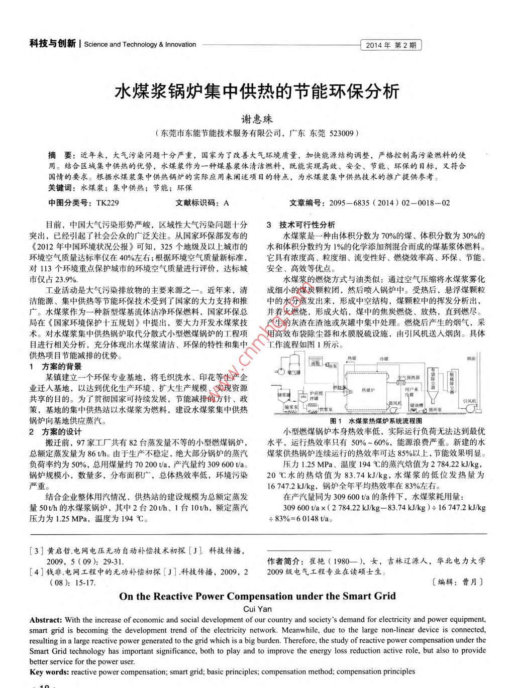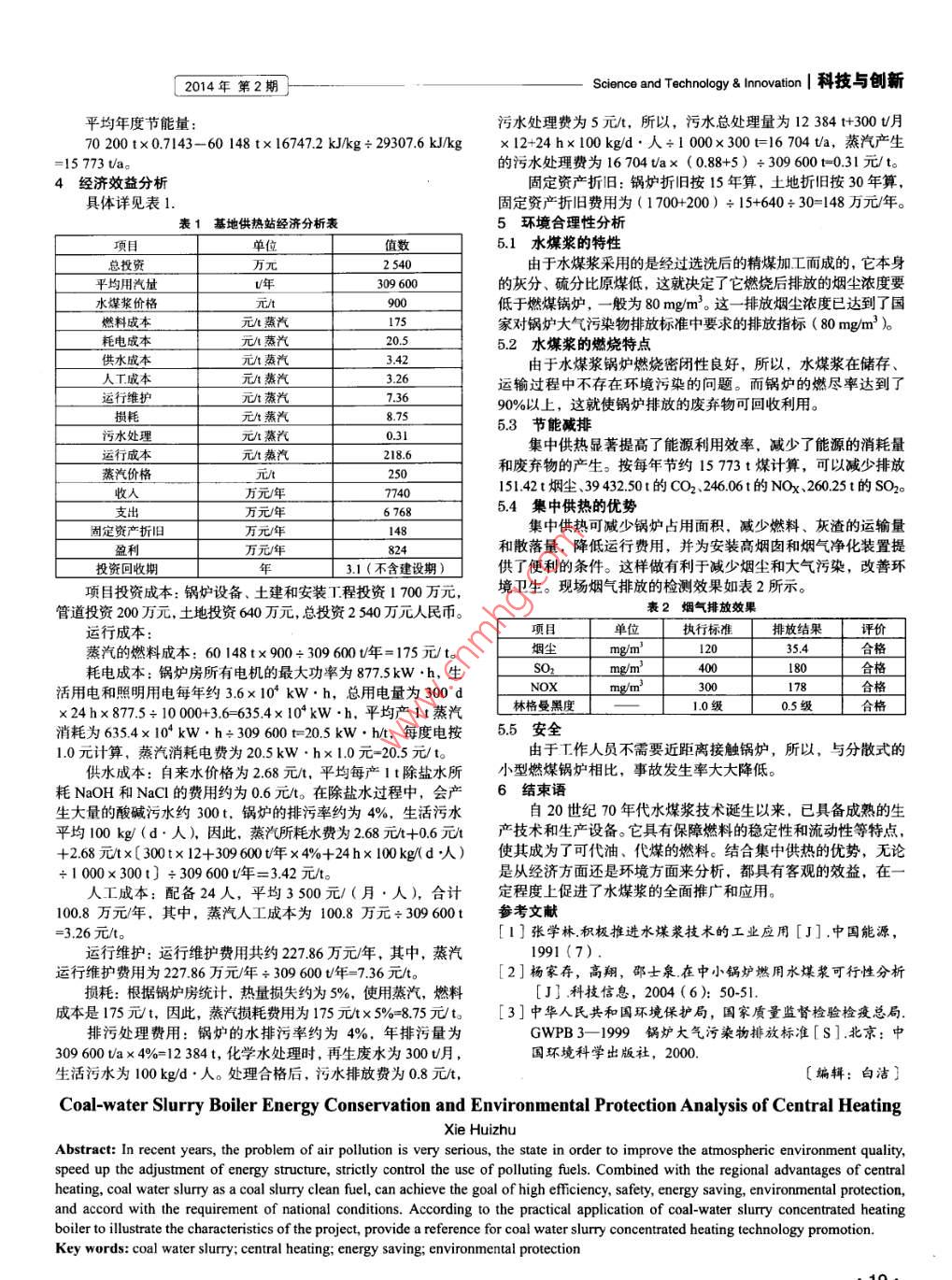 科技與創(chuàng)新 Science and Technology& Innovation2014年第2期水煤漿鍋爐集中供熱的節(jié)能環(huán)保分析謝惠珠(東莞市東能節(jié)能技術服務有限公司,廣東東莞523009)摘要:近年來,大氣污染問題十分嚴重,國家為了改善大氣環(huán)境質量,加快能源結構調整,嚴格控制高污染燃料的使用。結合區(qū)域集中供熱的優(yōu)勢,水煤漿作為一種煤基漿體清潔燃料,既能實現高效、安全、節(jié)能、環(huán)保的目標,又符合國情的要求。根據水煤漿集中供熱鍋爐的實際應用來闡述項目的特點,為水煤漿集中供熱技術的推廣提供參考。關鍵詞:水煤漿;集中供熱;節(jié)能;環(huán)保中圖分類號:TK229文獻標識碼:A文章編號:2095-6835(2014)02-0018-02目前,中國大氣污染形勢嚴峻,區(qū)域性大氣污染問題十分3技術可行性分析突出,已經引起了社會公眾的廣泛關注。從國家環(huán)保部發(fā)布的水煤漿是一種由體積分數為70%的煤、體積分數為30%的《2012年中國環(huán)境狀況公報》可知,325個地級及以上城市的水和體積分數約為1%的化學添加劑混合而成的煤基漿體燃料。環(huán)境空氣質量達標率僅在40%左右;根據環(huán)境空氣質量新標準,它具有濃度高、粒度細、流變性好、燃燒效率高、環(huán)保、節(jié)能、對113個環(huán)境重點保護城市的環(huán)境空氣質量進行評價,達標城安全、高效等優(yōu)點市僅占23.9%水煤漿的燃燒方式與油類似:通過空氣壓縮將水煤漿霧化工業(yè)活動是大氣污染排放物的主要來源之一。近年來,清成細小的煤炭顆粒閉,然后噴入鍋爐中。受熱后,懸浮煤顆粒潔能源、集中供熱等節(jié)能環(huán)保技術受到了國家的大力支持和推中的水分蒸發(fā)出來,形成中空結構,煤顆粒中的揮發(fā)分析出,廣。水煤漿作為一種新型煤基流體潔凈環(huán)保燃料,國家環(huán)??偛⒅鹑紵?形成火焰,煤中的焦炭燃燒、放熱,直到燃盡。局在《國家環(huán)境保護十五規(guī)劃》中提出,要大力開發(fā)水煤漿技產生的灰渣在渣池或灰罐中集中處理。燃燒后產生的煙氣,采術。對水煤漿集中供熱鍋爐取代分散式小型燃煤鍋爐的工程項用高效布袋除塵器和水膜脫硫設施,由引風機送入煙囪。具體目進行相關分析,充分體現出水煤漿清潔、環(huán)保的特性和集中工作流程如圖1所示。供熱項目節(jié)能減排的優(yōu)勢1方案的背景某鎮(zhèn)建立一個環(huán)保專業(yè)基地,將毛織洗水、印花等生產企葡氣罐氣預熱器業(yè)遷人基地,以達到優(yōu)化生產環(huán)境、擴大生產規(guī)模、實現資源妒前捏=熱共享的目的。為了貫徹國家可持續(xù)發(fā)展,節(jié)能減排的方針、政策,基地的集中供熱站以水煤漿為燃料,建設水煤漿集中供熱6循環(huán)泵鍋爐向基地供應蒸汽。圖1水煤漿熱煤爐系統流程圖2方案的設計小型燃煤鍋爐本身熱效率低,實際運行負荷無法達到最優(yōu)搬遷前,97家工廠共有82臺蒸發(fā)量不等的小型燃煤鍋爐,水平,運行熱效率只有50%~60%,能源浪費嚴重。新建的水總額定蒸發(fā)量為86th。由于生產不穩(wěn)定,絕大部分鍋爐的蒸汽煤漿供熱鍋爐連續(xù)運行的熱效率可達85%以上,節(jié)能效果明顯負荷率約為50%,總用煤量約70200ta,產汽量約309600ta壓力1.25MPa、溫度194℃的蒸汽焓值為278422kJ/kg,鍋爐規(guī)模小,數量多,分布面積廣,總體熱效率低,環(huán)境污染20℃水的熱焓值為83.74kJ/kg,水煤漿的低位發(fā)熱量為嚴重。16747.2kJkg,鍋爐全年平均熱效率在83%左右。結合企業(yè)整體用汽情況,供熱站的建設規(guī)模為總額定蒸發(fā)在產汽量同為309600ta的條件下,水煤漿耗用量:量50th的水煤漿鍋爐,其中2臺20th、1臺10th,額定蒸汽309600tax(278422kJ/kg-83.74kJkg)÷16747.2kJkg壓力為1.25MPa,溫度為194℃?!?3%=60148t/a。3]黃啟哲電網電壓無功自動補償技術初探[J!科技傳播,2009,5(09):29-31作者簡介:崔艷(1980—),女,吉林遼源人,華北電力大學[4]錢非.電網工程中的無功補償初探[J]科技傳播,2009,22009級電氣工程專業(yè)在讀碩士生。(08):15-17〔編輯:曹月〕On the Reactive power Compensation under the smart gridCui YaAbstract: With the increase of economic and social development of our country and societys demand for electricity and power equipment,smart grid is becoming the development trend of the electricity network. Meanwhile, due to the large non-linear device is connected,resulting in a large reactive power generated to the grid which is a big burden. Therefore, the study of reactive power compensation under theSmart Grid technology has important significance, both to play and to improve the energy loss reduction active role, but also to providebetter service for the power user.Key words: reactive power compensation; smart grid; basic principles; compensation method; compensation principles2014年第2期Science and Technology& t Innovation|科技與創(chuàng)新平均年度節(jié)能量污水處理費為5元,所以,污水總處理量為12384t+300t月70200t×07143-60148t×16747.2kJ/kg÷29307.6kJ/kg×12+24h×100kg/d·人÷1000×300t=16704ta,蒸汽產生=15773ta。的污水處理費為16704ta×(0.88+5)÷3096001t=0.31元/t4經濟效益分固定資產折舊:鍋爐折舊按15年算,土地折舊按30年算具體詳見表1固定資產折舊費用為(1700+200)÷15+640÷30=148萬元/年。表1基地供熱站經濟分析表5環(huán)境合理性分析項目單位值數51水煤漿的特性總投資由于水煤漿采用的是經過選洗后的精煤加工而成的,它本身平均用汽量309600的灰分、硫分比原煤低,這就決定了它燃燒后