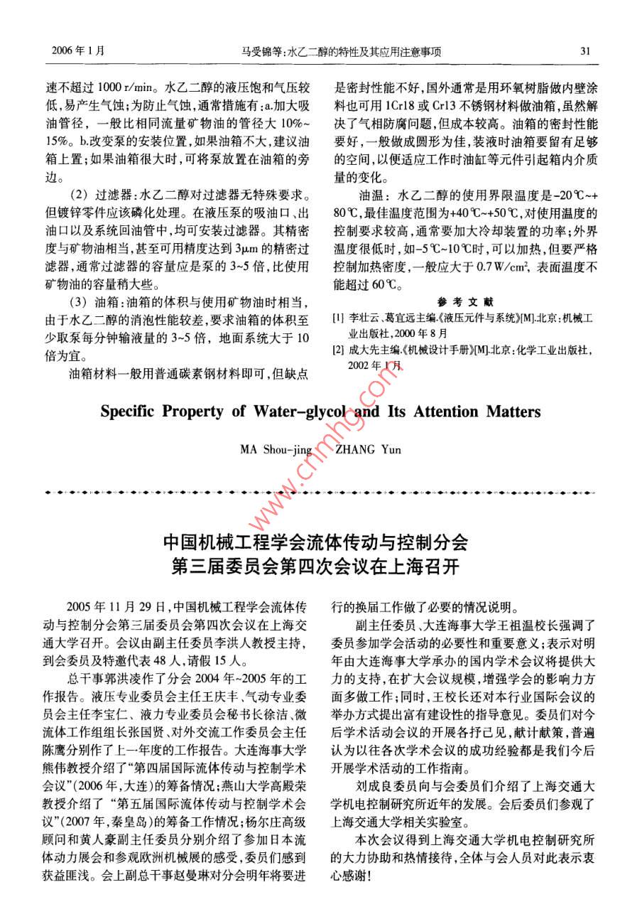 第1期(總第14期)流體傳動與控制 No.(Serial No.14)2006年1月 Fluid Power Transmission and ControlJan,2006水乙二醇的特性及其應(yīng)用注意事項馬受錦張淑云郝利(濟(jì)鋼集團(tuán)機(jī)械設(shè)備制造廠山東濟(jì)南250101)摘要:該文介紹了水乙二醇的特性和選用時應(yīng)注意的事項為有關(guān)人員提供了使用水乙二醇的經(jīng)驗(yàn)。關(guān)鍵詞:液壓介質(zhì);水乙二醇;抗燃中圖分類號:TH137文獻(xiàn)標(biāo)識碼:B文章編1-1921/00一般的液壓閥、泵可直接使用,使用水乙二醇的密1前言封件不能使用聚氨酯材料(水乙二醇會使其軟化變水乙二醇是由乙二醇、丙二醇或其聚合物溶于形,破壞密封性)目前使用較好的密封材料是氟橡水而形成的一種含水35%-55%的透明真溶液,其中膠,其次是丁晴橡膠。金屬材料如鋅、鎘、鉛和未經(jīng)還加入相應(yīng)的增粘抗磨、防銹、消泡等添加劑。它陽極處理的鋁等均能與水乙二醇發(fā)生化學(xué)反應(yīng),產(chǎn)具有良好的抗燃性,低溫流動性和穩(wěn)定性,是一種生污染物。有機(jī)玻璃制成的液位計,濾油器、液位理想的抗燃液壓介質(zhì),在冶金、礦山和鑄鍛等要求計、空氣濾清器等附件要選特制的產(chǎn)品,例如溫州防火的液壓系統(tǒng)中得到了廣泛應(yīng)用,在很多國家已黎明液壓機(jī)電廠生產(chǎn)的產(chǎn)品中,需要水乙二醇做介經(jīng)成為難燃液壓液的主流。它的特性與礦物油液壓質(zhì)的系統(tǒng)就需要在其型號中標(biāo)注BH的字樣。一般液相比有著諸多獨(dú)特的方面,只有全面了解了它,工業(yè)用漆等也不適用于水乙二醇液壓介質(zhì)系統(tǒng),油才能最好的發(fā)揮其優(yōu)點(diǎn),使它最大限度為我們服漆需要使用環(huán)氧型油漆,普通油漆與水乙二醇是不務(wù)。否則,不但不能給我們提供方便,還會給我們帶相容的,無法起到應(yīng)有的作用。來很多的麻煩,造成不必要的損失。(3)揮發(fā)性:水乙二醇在敞開的環(huán)境中會慢慢的揮發(fā),它的水溶液會蒸發(fā),也可吸收空氣中的水1水乙二醇的特性分或其他氣體成分,導(dǎo)致其性質(zhì)改變。合格的水乙(1)水乙二醇的粘度隨溫度的升高而降低,如二醇含有氣相防腐劑,可保護(hù)封閉油箱內(nèi)介質(zhì)上方N46水乙二醇在20℃運(yùn)動粘度為80mm2/s;4℃時的金屬不被氧化。使用水乙二醇的油箱不能敞開過運(yùn)動粘度為43mm/s;50℃時運(yùn)動粘度為31mm2/s,久,應(yīng)密閉處理,以保氣相防腐劑不被揮發(fā),這一特粘度指數(shù)不小于140粘度對水的變化較敏感,與水點(diǎn)與普通的液壓系統(tǒng)不同。在維修過程中,外表留的含量成反比,而與礦物油的濃度成正比。通常因下的殘液要擦干凈,否則會引起腐蝕。因此,使用水不慎會混入礦物油,但含量最高極限不得超過3%,乙二醇的液壓系統(tǒng)最好采用不銹鋼板焊成的油箱。因?yàn)樗叶寂c礦物油混合極易形成油泥,輕則會(4)潤滑性:它與礦物油相比,對運(yùn)動摩擦的發(fā)生堵塞過濾器,壓力閥失靈,重則會造成液壓閥潤滑性能稍差,不能在金屬表面產(chǎn)生牢固的極壓潤嚴(yán)重磨損,整個系統(tǒng)失去應(yīng)有功能。在濟(jì)鋼焦化廠滑膜,這一點(diǎn)對流體動力潤滑影響較小,但對重載五號焦?fàn)t裝煤車的安裝調(diào)試時,就發(fā)生過因系統(tǒng)中的滾動軸承影響較大。通常,滾動軸承支撐的葉片殘留了過多的試驗(yàn)用礦物油造成全部換向閥串油泵仍可按額定參數(shù)使用。滾動軸承的齒輪泵和軸向的惡劣事件,使整個系統(tǒng)無法工作。從此,我廠凡是柱塞泵,一般只能按50%的額定壓力工作。閥配流用水乙二醇做介質(zhì)的系統(tǒng),均采用水乙二醇做試驗(yàn)的三柱塞泵,因無重載滾動軸承,即使使用水乙二和沖洗管路,徹底的避免了這種現(xiàn)象的發(fā)生。因此,醇液壓液,仍能輸出45MPa的工作壓力。要嚴(yán)格控制礦物油的混人。(2)防腐性:水乙二醇呈強(qiáng)堿性,一般其PH值2應(yīng)用注意事項在9-11之間,合格的水乙二醇含有液相防銹劑,對(1)液壓泵:常用的葉片泵、齒輪泵、柱塞泵均金屬材料、銅或黃銅(青銅除外)不產(chǎn)生腐蝕作用,能使用水乙二醇液壓液做介質(zhì)??紤]目前的技術(shù)水平,普通的葉片泵和齒輪泵的工作壓力以不高于收稿日期:2005-09-197Ma為宜,高壓齒輪泵和柱塞泵可用至16MPa,轉(zhuǎn)作者簡介:馬受錦,高級工程師。2006年1月馬受錦等:水乙二醇的特性及其應(yīng)用注意事項31速不超過1000r/min。水乙二醇的液壓飽和氣壓較是密封性能不好,國外通常是用環(huán)氧樹脂做內(nèi)壁涂低,易產(chǎn)生氣蝕;為防止氣蝕,通常措施有:a加大吸料也可用1Cr18或Cr13不銹鋼材料做油箱,雖然解油管徑,一般比相同流量礦物油的管徑大0%決了氣相防腐問題,但成本較高。油箱的密封性能15%b改變泵的安裝位置,如果油箱不大,建議油要好,一般做成圓形為佳,裝液時油箱要留有足夠箱上置;如果油箱很大時,可將泵放置在油箱的旁的空間,以便適應(yīng)工作時油缸等元件引起箱內(nèi)介質(zhì)邊。量的變化。(2)過濾器:水乙二醇對過濾器無特殊要求。油溫:水乙二醇的使用界限溫度是-20℃~+但鍍鋅零件應(yīng)該磷化處理。在液壓泵的吸油口、出80℃,最佳溫度范圍為+40℃~+50℃,對使用溫度的油口以及系統(tǒng)回油管中,均可安裝過濾器。其精密控制要求較高,通常要加大冷卻裝置的