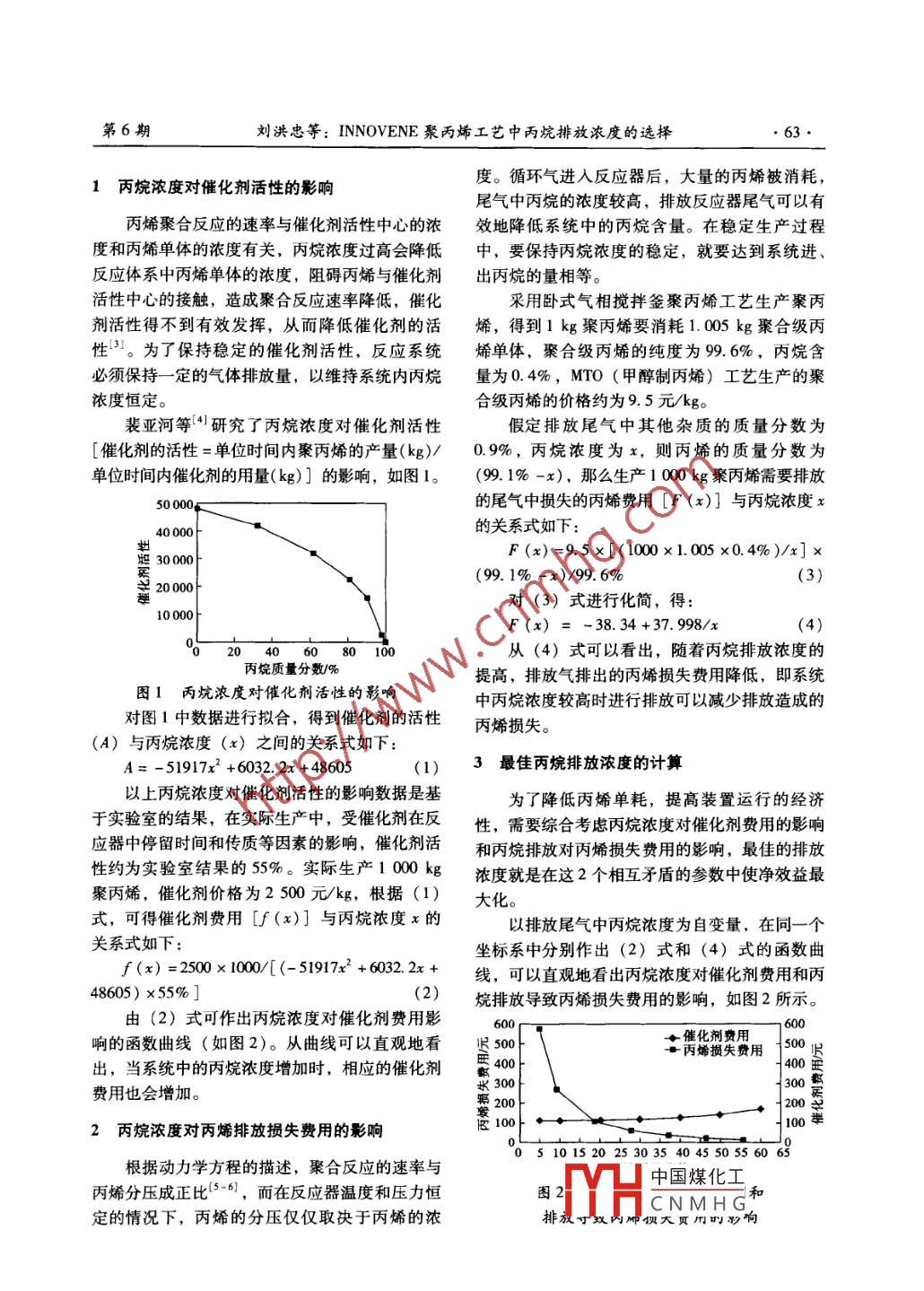 第6期中氮肥No 62014年1l月M-Sized Nitrogenous Fertilizer ProgressNov.2014INNOVENE聚丙烯工藝中丙烷排放濃度的選擇劉洪忠,楊韜,王躍(中國(guó)神華煤制油化工有限公司榆林化工分公司,陜西榆林719000[摘要]從丙烷濃度對(duì)催化劑活性的影響人手,擬合出了丙烯聚合反應(yīng)系統(tǒng)中丙烷濃度與催化劑費(fèi)用的關(guān)系式,建立了體系中丙烷濃度與丙烯排放損失費(fèi)用之間的數(shù)學(xué)關(guān)系式。將2個(gè)關(guān)系式的曲線放入同個(gè)坐標(biāo)系中,得到最經(jīng)濟(jì)的丙烷排放濃度[關(guān)鍵詞]聚丙烯;丙烷;經(jīng)濟(jì)性;排放濃度中圖分類號(hào)]TQ325.14[文獻(xiàn)標(biāo)志碼]B[文章編號(hào)]1004-9932(2014)06-0062-03Selection of Propane Emission Concentration inINNOVENE Polypropylene ProcessLIU Hongzhong, YANG Tao, WANG YueChina Shenhua Coal to Liquid Chemical Co, Ltd, Yulin Chemical Company, Yulin 719000, China)Abstract: Starting with the impact of propane concentration on catalyst activity, the relation of propane con-centration and the expenses of catalyst in propylene polymerization reaction system has been fitted, and themathematical relation of propane concentration and propylene discharge economic loss has been establishedThe most economical propane emission concentration is obtained by putting the curves of the two relations intethe same coordinate systemKey Words polypropylene; propane; economy; emission concentration0引言產(chǎn)的PP粉料通過粉料轉(zhuǎn)移系統(tǒng)進(jìn)入第二反應(yīng)器。該轉(zhuǎn)移系統(tǒng)主要由氣鎖器和沉降器組成,共INNOVENE臥式氣相攪拌釜工藝技術(shù)屬于2條線,通過壓差以脈沖的方式將粉料送入第二氣相本體聚合工藝,采用獨(dú)特的臥式帶攪拌活塞反應(yīng)器。該轉(zhuǎn)移系統(tǒng)亦可防止兩反應(yīng)器之間反應(yīng)流反應(yīng)器,用2臺(tái)聚合釜串聯(lián),可生產(chǎn)均聚物、物的返混1-21無(wú)規(guī)共聚物和抗沖共聚物。聚合級(jí)丙烯中一般會(huì)含有約0.4%(質(zhì)量分主催化劑、助催化劑和改性劑加入第一反應(yīng)數(shù))的丙烷雜質(zhì),丙烷和丙烯一起進(jìn)入反應(yīng)系器。在第一反應(yīng)器中,丙烯單體在催化劑表面發(fā)統(tǒng),隨著丙烯的消耗,反應(yīng)器中丙烷不斷積累,生聚合反應(yīng),以氣相方式連續(xù)聚合形成結(jié)晶的聚濃度不斷升高,導(dǎo)致催化劑活性下降。為了提高丙烯(P)顆粒。反應(yīng)器頂部氣體丙烯經(jīng)旋風(fēng)催化劑的效率,正常生產(chǎn)期間必須對(duì)系統(tǒng)中的丙分離器分離出攜帶的細(xì)粉后,進(jìn)入第一反應(yīng)器頂部冷凝器。部分冷凝后的丙烯和補(bǔ)充的新鮮丙烯烷進(jìn)行排放。再由泵送回反應(yīng)器,噴灑到PP粉料床層上,通丙烷排放濃度(質(zhì)量分?jǐn)?shù),下同)的選擇過蒸發(fā)移去反應(yīng)熱。反應(yīng)器尾氣中未冷凝的氣體是一個(gè)十分關(guān)鍵的問題,假如選擇系統(tǒng)中丙烷濃經(jīng)壓縮并循環(huán)至第一反應(yīng)器底部。第一反應(yīng)器生度較高時(shí)排放,系統(tǒng)中較高濃度的內(nèi)烷會(huì)導(dǎo)致催化劑活性降低,為了保證生產(chǎn)負(fù)荷,必須增加催[收稿日期]2014.02-26化劑的進(jìn)料玉娛化工加;若選擇[作者簡(jiǎn)介】劉洪忠(1985-),男,內(nèi)蒙古巴彥漳爾市入,助系統(tǒng)中丙烷CNMHG致大量的丙理工程師。烯隨丙烷一從捍,綻價(jià)工義個(gè)合理。第6期劉洪忠等: INNOVENE聚丙烯工藝中丙烷排放濃度的選擇1丙烷濃度對(duì)催化劑活性的影響度。循環(huán)氣進(jìn)入反應(yīng)器后,大量的丙烯被消耗,尾氣中丙烷的濃度較高,排放反應(yīng)器尾氣可以有丙烯聚合反應(yīng)的速率與催化劑活性中心的濃效地降低系統(tǒng)中的丙烷含量。在穩(wěn)定生產(chǎn)過程度和丙烯單體的濃度有關(guān),丙烷濃度過高會(huì)降低中,要保持丙烷濃度的穩(wěn)定,就要達(dá)到系統(tǒng)進(jìn)、反應(yīng)體系中丙烯單體的濃度,阻礙丙烯與催化劑出丙烷的量相等活性中心的接觸,造成聚合反應(yīng)速率降低,催化采用臥式氣相攪拌釜聚丙烯工藝生產(chǎn)聚丙劑活性得不到有效發(fā)揮,從而降低催化劑的活烯,得到1kg聚丙烯要消耗1.005kg聚合級(jí)丙性3。為了保持穩(wěn)定的催化劑活性,反應(yīng)系統(tǒng)烯單體,聚合級(jí)丙烯的純度為996%,丙烷含必須保持一定的氣體排放量,以維持系統(tǒng)內(nèi)丙烷量為0.4%,MTO(甲醇制丙烯)工藝生產(chǎn)的聚濃度恒定。合級(jí)丙烯的價(jià)格約為95元/kg裴亞河等4研究了丙烷濃度對(duì)催化劑活性假定排放尾氣中其他雜質(zhì)的質(zhì)量分?jǐn)?shù)為[催化劑的活性=單位時(shí)間內(nèi)聚丙烯的產(chǎn)量(kg)/0.9%,丙烷濃度為x,則丙烯的質(zhì)量分?jǐn)?shù)為單位時(shí)間內(nèi)催化劑的用量(kg)]的影響,如圖1。(99.1%-x),那么生產(chǎn)1000kg聚丙烯需要排放30的尾氣中損失的丙烯費(fèi)用[F(x)]與丙烷濃度x的關(guān)系式如下地30000F(x)=95×[(1000×1.005×0.4%)/x]×(99.1%-x)/99.6%(3)對(duì)(3)式進(jìn)行化簡(jiǎn),得:10000F(x)=-38.34+37.998/x(4)204060801從(4)式可以看出,隨著丙烷排放濃度的丙烷質(zhì)量分?jǐn)?shù)%提高,排放氣排出的丙烯損失費(fèi)用降低,即系統(tǒng)圖1丙炕濃度對(duì)催化劑活性的影響中丙烷濃度較高時(shí)進(jìn)行排放可以減少排放造成的對(duì)圖1中數(shù)據(jù)進(jìn)行擬合,得到催化劑的活性丙烯損失(A)