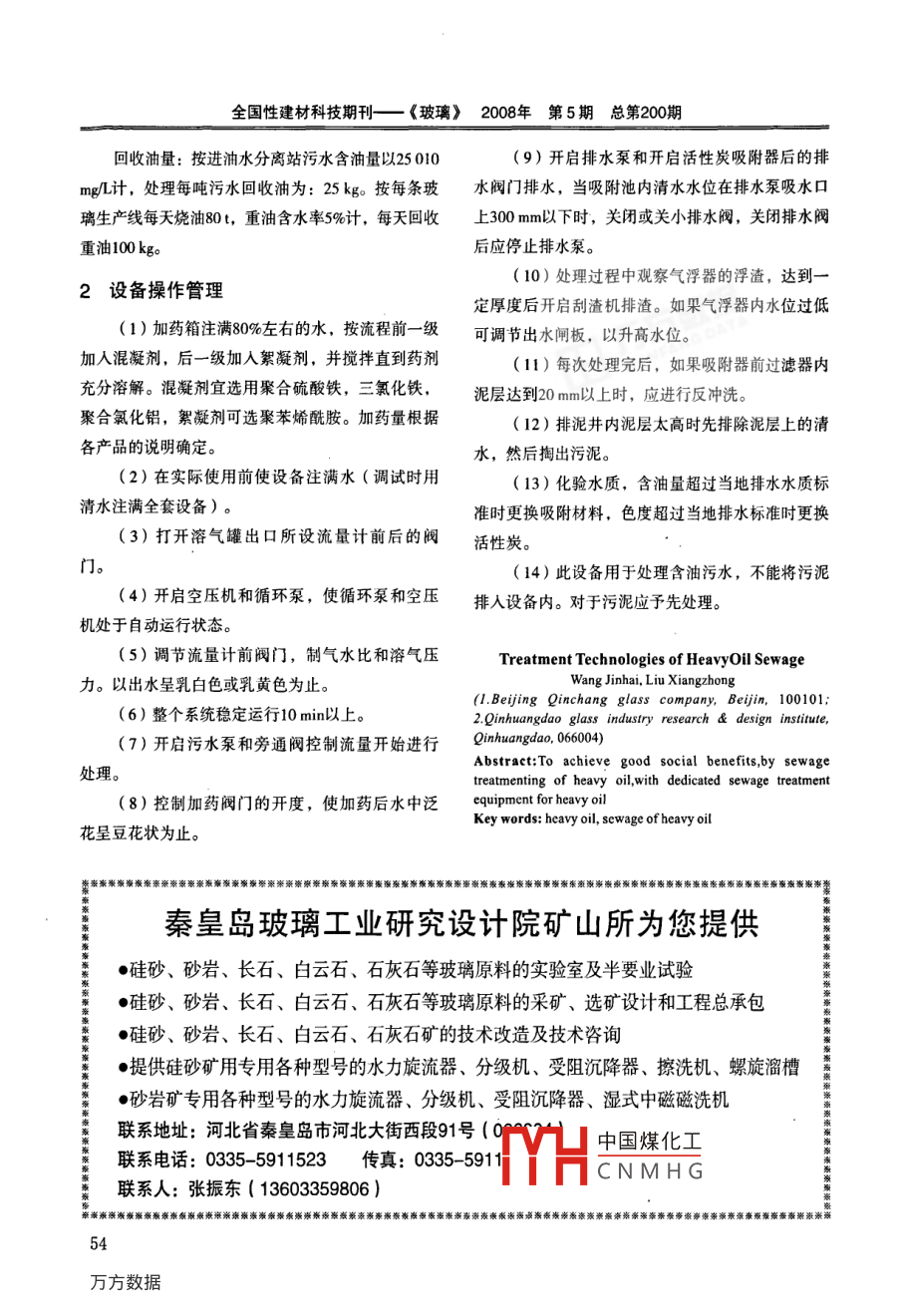 節(jié)能與環(huán)保.重油污水處理技術(shù)王金海'劉相仲2( 1.北京秦昌玻璃有限公司北京市100101; 秦皇島玻璃工業(yè)研究設(shè)計院秦皇島市066001 )摘要通過專用重油污水處理設(shè)備,處理含重油污水,取得良好社會效應(yīng)。關(guān)鍵詞重油, 含油污水。圍分類號: TQ171文獻標識碼: A文章編號: 1003- 1987 ( 2008 ) 05-0053-02重油是化工生產(chǎn)過程中的副產(chǎn)品,可作為工業(yè)由于吸附能力差,只能起到過濾等輔助作用。生產(chǎn)的燃料,如浮法玻璃生產(chǎn)線大多采用重油作為(6)隔油浮選沉淀吸附活性碳燃料。然而,在重油的形成過程中產(chǎn)生大量的水,重油分子量大,黏度高,比重接近于1.00。因重油輸送時需要用蒸汽加熱,也產(chǎn)生大量水,在使而國內(nèi)現(xiàn)有油水分離設(shè)備不適于處理它。該工藝是用前必須將重油中水排除。此排水中含有大量重在國內(nèi)各種處理含油污水工程實例基礎(chǔ)上并結(jié)合多油,氨氮,硫化物,揮發(fā)酚,氰化物。尤其是重油年的處理重油污水的實踐基礎(chǔ)上而總結(jié)出的一種工很難被生化氧化,阻礙水體的溶氧從而影響其它污藝,簡稱重油污水處理設(shè)備。染物的凈化。含油污水,如果不經(jīng)凈化直接排放對該工藝主要原理是:用隔油段除去大于1 mm塊環(huán)境的危害性比生活污水大得多。狀油;浮選段除去比重小于0.98的機械油和乳化油;用沉淀段除去比重大于1.01的機械油,硫,懸1含油污水處理 工藝的各種方案及其優(yōu)缺點浮物;吸附段用專用吸油材料除去溶解油和比重接(1)斜板(管過濾粗?;?的機械油;最后活性碳段除去色度。該工藝該方法適用于處理輕質(zhì)油,輕工,機械,船舶工在正常運行中不出現(xiàn)堵塞情況,除添藥,反洗和清業(yè)。由于重油黏度高,很容易堵塞設(shè)備,不宜選用。池外全部自動運行,操作方便,維修量,運行費用(2)氣浮超濾低,對進水含油量無嚴格要求,出水含油量低于10該方法適用于處理輕質(zhì)油,輕工,機械,船舶mg/L。工業(yè)。由于重油黏度高,很容易堵塞超濾材料,不各工段進水含油量:隔油10 000 mg/L浮選2000宜選用。mg/L沉淀800 mg/L吸附600 mg/活性碳10 mg/L。(3)電解氣浮該方法在設(shè)備運行中消耗電,藥,蒸汽。消耗該方法對重油有很大去除能力,但耗電量很大量按每噸水計為:電2*;藥0.10元;蒸汽0.01 t。維修工作量大,操作管理不便,排水含油量仍高于吸附材料費用: 3萬元年。10 mg/L。.從污水中回收的油送回油罐供生產(chǎn)使用,處理(4)離心分離后的污水送到循環(huán)水系統(tǒng)作為補沖水,失效的吸附該方法主要缺點是,要求設(shè)備轉(zhuǎn)速高,容易損材料作概燒外理,- :次污染很小。壞,油粘附在桶壁上不宜脫落,處理效果差。天津某中國煤化工省某廠投入使用,廠在調(diào)試以后就停止使用。從1JMYHCN M H很好。得到國家環(huán)(5)煤渣保局,云南省環(huán)保局,昆明市環(huán)保局的好評。53全國性建材科技期刊一《玻璃》2008年第5期總 第200期回收油量:按進油水分離站污水含油量以25 010(9)開啟排水泵和開啟活性炭吸附器后的排mg/L計,處理每噸污水回收油為: 25kg。 按每條玻水閥門排水,當吸附池內(nèi)清水水位在排水泵吸水口璃生產(chǎn)線每天燒油80t,重油含水率5%計,每天回收上300 mm以下時,關(guān)閉或關(guān)小排水閥,關(guān)閉排水閥重油100 kgo后應(yīng)停止排水泵。(10)處理過程中觀察氣浮器的浮渣,達到一2設(shè)備操作管理定厚度后開啟刮渣機排渣。如果氣浮器內(nèi)水位過低(1)加藥箱注滿80%左右的水,按流程前一級可調(diào)節(jié)出水閘板,以升高水位。加人混凝劑,后一級加人絮凝劑,并攪拌直到藥劑(11)每次處理完后,如果吸附器前過濾器內(nèi)充分溶解。混凝劑宜選用聚合硫酸鐵,三氯化鐵,泥層達到20 mm以上時,應(yīng)進行反沖洗。聚合氯化鋁,絮凝劑可選聚苯烯酰胺。加藥量根據(jù)(12)排泥井內(nèi)泥層太高時先排除泥層上的清各產(chǎn)品的說明確定。水,然后掏出污泥。(2)在實際使用前使設(shè)備注滿水(調(diào)試時用(13)化驗水質(zhì),含油量超過當?shù)嘏潘|(zhì)標清水注滿全套設(shè)備)。準時更換吸附材料,色度超過當?shù)嘏潘畼藴蕰r更換(3)打開溶氣罐出口所設(shè)流量計前后的閥,活性炭。門。(14)此設(shè)備用于處理含油污水,不能將污泥(4)開啟空壓機和循環(huán)泵,使循環(huán)泵和空壓排入設(shè)備內(nèi)。對于污泥應(yīng)予先處理。機處于自動運行狀態(tài)。(5)調(diào)節(jié)流量計前閥門,制氣水比和溶氣壓Treatment Technologies of HeavyOil Sewage力。以出水呈乳白色或乳黃色為止。Wang Jinhai, Liu Xiangzhong(1.Beijing Qinchang glass company, Beijin, 100101;(6)整個系統(tǒng)穩(wěn)定運行10 min以上。2.Qinhuangdao glass industry research & design institute,(7)開啟污水泵和旁通閥控制流量開始進行Qinhuangdao, 066004)Abstraet:To achieve good social benefits,by sewage處理。treatmenting of heavy oil,with dedicated sewage treatment(8)控制加藥閥門的開度,使加藥后水中泛equipment for heavy oilKey words: heavy oil, sewage of heavy oil花呈豆花狀為止。秦皇島玻璃工業(yè)研究設(shè)計院礦山所為您提供●硅砂、砂巖、長石、白云石、石灰石等玻璃原料的實驗室及半要業(yè)試驗●硅砂、砂巖、長石、白云石、石灰石等玻璃原料的采礦、選礦設(shè)計和工程總承包●硅砂、砂巖、長石、白云石、石灰石