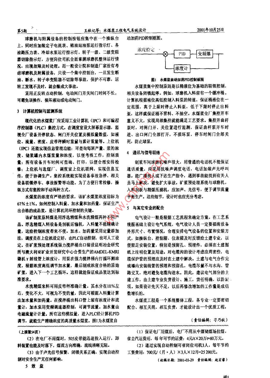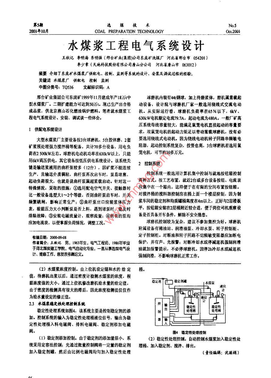選煤技術(shù)200】年10月COAL PREPARATION TECHNOLOGYOt200】水煤漿工程電氣系統(tǒng)設(shè)計(jì)王秋記李明海齊明強(qiáng)(邢臺(tái)礦業(yè)(集團(tuán))公司東龐礦洗煤廠河北省那臺(tái)市054201)事少幸(天地科技股份有限公司唐山分公司河北省唐山市063012)摘要介紹了東龐礦水堞漿廠供配電、控制、監(jiān)測(cè)等系統(tǒng)的設(shè)計(jì)、安裝及調(diào)試過(guò)程的經(jīng)驗(yàn),關(guān)鍵詞水煤漿廠供配電控制監(jiān)測(cè)中圖分類(lèi)號(hào):T536文獻(xiàn)標(biāo)識(shí)碼:A邢臺(tái)礦業(yè)集團(tuán)公司東龐礦199年1月建成年產(chǎn)18萬(wàn)中球磨機(jī)內(nèi)裝有44鋼球,加上待磨漿體,磨機(jī)屬重載起型水煤漿廠·二期擴(kuò)建能力可達(dá)到50萬(wàn)t,現(xiàn)已生產(chǎn)出合格動(dòng)設(shè)備,設(shè)計(jì)院與球磨機(jī)廠家一般選用繞線式交流電動(dòng)成品漿,供北京燕山石化燃油鍋爐燃料。筆者就水煤漿工機(jī)從實(shí)際運(yùn)行看,球磨機(jī)負(fù)荷率在65%以下,6kV程電氣系統(tǒng)設(shè)計(jì)、安裝、調(diào)試談一些體會(huì)630kW電機(jī)額定電流797A,起動(dòng)電流為480A.一般廠礦高壓系統(tǒng)母線容量較大,能滿足鼠籠電機(jī)直接起動(dòng)的容量要供配電系統(tǒng)設(shè)計(jì)求,雙鼠籠電機(jī)的起動(dòng)力矩足以帶動(dòng)重載球磨機(jī),沒(méi)有必大型水煤漿廠主要設(shè)備按3臺(tái)球磨機(jī)、5臺(tái)膠體磨、2套要選用繞線式電動(dòng)機(jī),因?yàn)槔@線電動(dòng)機(jī)轉(zhuǎn)子回路串頻敏電礦漿預(yù)處理強(qiáng)力攪拌桶等配備,共計(jì)70多臺(tái)設(shè)備,用電負(fù)阻器,起動(dòng)控制系統(tǒng)復(fù)雜,投資也高,3臺(tái)球機(jī)若選用鼠荷在250kW左右,球磨機(jī)電動(dòng)機(jī)功率在630kW以上,只能籠電機(jī),可節(jié)約30多萬(wàn)元用6kV高壓供電,其它設(shè)備按低壓供電系統(tǒng)設(shè)計(jì),該系統(tǒng)關(guān)鍵是輸送漿液用的曲桿泵較多(12臺(tái)),因礦漿不能連續(xù)生產(chǎn),且輸送介質(zhì)稠粘,曲桿泵再次啟車(chē)時(shí),泵易堵塞,控制系統(tǒng)一般選用計(jì)算機(jī)集中控制與就地按鈕箱控制起動(dòng)負(fù)荷很大,也就是說(shuō)曲桿泵屬超重載啟動(dòng),針對(duì)這一兩種方式。按工藝布置,就近2臺(tái)或多臺(tái)設(shè)備按鈕、電流表特殊情況,采取的措施:①選用配電空氣開(kāi)關(guān)、接觸器時(shí)應(yīng)集中在一個(gè)箱內(nèi),這樣便于在有限的空間布置按鈕箱,比一般設(shè)備選型大1~2個(gè)等級(jí),否則曲桿泵啟車(chē)時(shí),開(kāi)關(guān)對(duì)攪拌桶的攪料器控制應(yīng)在桶上面一個(gè)樓層控制,因?yàn)橹祁l繁跳閘,影響正常生產(chǎn);②曲桿泵出口應(yīng)裝漿體壓力漿車(chē)間的穩(wěn)定劑和均質(zhì)罐桶高度在4m以上,正好與2層樓板表,根據(jù)壓力大小判斷泵是否上料,遇到堵泵時(shí),能及時(shí)平,按鈕箱安裝在2層桶附近較合適,便于崗位司機(jī)觀察設(shè)排除故障:③安裝電磁流量計(jì),觀察流量;④所有的泵均備是否具備開(kāi)車(chē)條件,解除不安全隱患應(yīng)加電流表,以便掌握負(fù)荷情況,調(diào)整工況。球磨機(jī)控制較為復(fù)雜,建議不參加集控為好,球磨機(jī)附屬設(shè)備有稀油站、潤(rùn)滑油泵、冷卻水泵、轉(zhuǎn)子控制柜收稿日期:20000908定子控制柜。對(duì)斷油和轉(zhuǎn)子回路不切頻敏變阻器應(yīng)加斷電作者筒介:王秋記男,1%53年生,電氣工程,1986年業(yè)保護(hù),并有聲、光報(bào)警:對(duì)斷冷卻水或停減速機(jī)強(qiáng)制潤(rùn)滑于河北煤炭建工學(xué)院,電氣自動(dòng)化專業(yè),一直從事選煤電氣設(shè)油就加報(bào)警提示,不必停球磨機(jī)。因停2h冷卻水或減速機(jī)計(jì)、繼修工作,曾發(fā)表多論文。強(qiáng)制潤(rùn)滑,不影響球磨機(jī)正常工作(2)水煤漿濃度控制。由上位機(jī)設(shè)定煤和水的給定桶值,待磨機(jī)出漿以后,通過(guò)密度計(jì)檢測(cè)水煤漿的濃度,根據(jù)濃度值的大小,通過(guò)上位機(jī)修改磨機(jī)給水量的給定值隱定劑由于密度的檢測(cè)具有很大的滯后,因此濃度檢測(cè)值僅僅作為給水量設(shè)定的修正值23水煤漿穗定性處理控制系就穩(wěn)定性處理系統(tǒng)如圖4,該系統(tǒng)主要是控制穩(wěn)定劑的添處理桶加,控制系統(tǒng)的輸入為穩(wěn)定性處理桶液位出為穩(wěn)定性處理桶入料電磁閥、排料電磁閥、穩(wěn)定劑添加電磁閥日4氌定性處理控制(1)穩(wěn)定劑添加控制。由于穩(wěn)定劑的添加量很小,系(2)穩(wěn)定性處理控制。自動(dòng)控制水煤漿加入穩(wěn)定性處統(tǒng)采用定容法控制:先通過(guò)批量控制閥將一定量的穩(wěn)定劑理桶、加入穩(wěn)定劑、攪拌、排出加入穩(wěn)定劑罐,然后由比例電磁閥均勻加入穩(wěn)定性處理(責(zé)任編輯:沈麗娟)王記水程電系貼敵計(jì)2013球磨機(jī)與附屬設(shè)備的控制按鈕應(yīng)集中在一個(gè)操縱臺(tái)動(dòng)加藥PI控制框圖上,同時(shí)應(yīng)加裝定子電流表、稀油站油泵運(yùn)行指示燈、各油路壓力表、冷卻水泵運(yùn)行指不燈,轉(zhuǎn)子一級(jí)、二級(jí)變阻濃度給變頻器器切除指示燈,方便崗位司機(jī)全面掌握球磨機(jī)整體運(yùn)行情況,出現(xiàn)故障及時(shí)處理。而一般設(shè)計(jì)