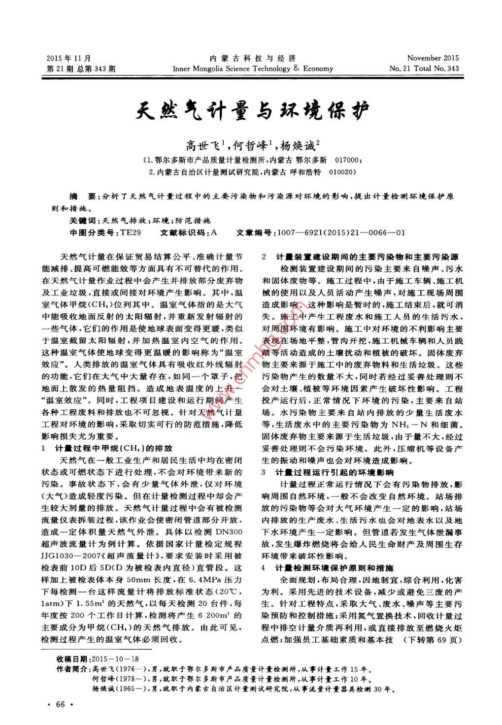 2015年11月內(nèi)蒙古科技與經(jīng)濟(jì)November 2015第21期總第343Inner Mongolia Science Technology & EconomyNo 21 Total No 343天然氣計(jì)量與環(huán)境保護(hù)高世飛1,何哲峰1,楊煥誠(chéng)2(1.鄂爾多斯市產(chǎn)品質(zhì)量計(jì)量檢測(cè)所,內(nèi)蒙古鄂爾多斯017000;2.內(nèi)蒙古自治區(qū)計(jì)量測(cè)試研究院,內(nèi)蒙古呼和浩特010020)摘要:分析了天然氣計(jì)量過(guò)程中的主要污染物和污染源對(duì)環(huán)境的影響,提出計(jì)量檢測(cè)環(huán)境保護(hù)原則和措施關(guān)犍詞:天然氣排放;環(huán)境;防范措施中圖分類號(hào):TE29文獻(xiàn)標(biāo)識(shí)碼:A文章編號(hào):1007-6921(2015)21-0066-01天然氣計(jì)量在保證貿(mào)易結(jié)算公平、準(zhǔn)確計(jì)量節(jié)2計(jì)量裝置建設(shè)期間的主要污染物和主要污染源能減排、提高可燃能效等方面具有不可替代的作用。檢測(cè)裝置建設(shè)期間的污染主要來(lái)自噪聲、污水在天然氣計(jì)量作業(yè)過(guò)程中會(huì)產(chǎn)生并排放部分廢棄物和固體廢物等。施工過(guò)程中,由于施工車輛、施工機(jī)及工業(yè)垃圾,直接或間接對(duì)環(huán)境產(chǎn)生影響。其中,溫械的使用以及人員活動(dòng)產(chǎn)生噪聲,對(duì)施工現(xiàn)場(chǎng)周圍室氣體甲烷(CH4)位列其中。溫室氣體指的是大氣造成影響。這種影響是暫時(shí)的,施工結(jié)束后,就可消中能吸收地面反射的太陽(yáng)輻射,并重新發(fā)射輻射的失。施工中產(chǎn)生工程廢水和施工人員的生活污水,些氣體,它們的作用是使地球表面變得更暖,類似對(duì)周圍環(huán)境有影響。施工中對(duì)環(huán)境的不利影響主要于溫室截留太陽(yáng)輻射,并加熱溫室內(nèi)空氣的作用。表現(xiàn)在場(chǎng)地平整,管溝開(kāi)挖,施工機(jī)械車輛和人員踐這種溫室氣體使地球變得更溫暖的影響稱為“溫室踏等活動(dòng)造成的土壤擾動(dòng)和植被的破壞。固體廢棄效應(yīng)”。人類排放的溫室氣體具有吸收紅外線輻射物主要來(lái)源于施工中的廢棄物料和生活垃圾。這些的功能,它們?cè)诖髿庵写罅看嬖?如同一個(gè)罩子,把污染物產(chǎn)生的數(shù)量不大,同時(shí)若經(jīng)過(guò)妥善處理則不地面上散發(fā)的熱量阻擋。造成地表溫度的上升—會(huì)對(duì)土壤、植被等環(huán)境因素產(chǎn)生破壞性影響。工程溫室效應(yīng)”。同時(shí),工程項(xiàng)目建設(shè)和運(yùn)行期間產(chǎn)生投產(chǎn)運(yùn)行后,正常情況下環(huán)境的污染,主要來(lái)自站各種工程廢料和排放也不可忽視。針對(duì)天然氣計(jì)量場(chǎng)。水污染物主要來(lái)自站內(nèi)排放的少量生活廢水工程對(duì)環(huán)境的影響,釆取切實(shí)可行的防范措施,降低等,生活廢水中的主要污染物為NH2-N和細(xì)菌。影響損失尤為重要。固體廢棄物主要來(lái)源于生活垃圾,由于量不大,經(jīng)過(guò)計(jì)量過(guò)程中甲烷(CH4)的排放妥善處理則不會(huì)污染環(huán)境。此外,壓縮機(jī)等設(shè)備產(chǎn)天然氣在一般工業(yè)生產(chǎn)和居民生活中均在密閉生的振動(dòng)和噪聲也會(huì)對(duì)環(huán)境造成影響狀態(tài)或可燃狀態(tài)下進(jìn)行處理,不會(huì)對(duì)環(huán)境帶來(lái)新的3計(jì)量過(guò)程運(yùn)行引起的環(huán)境影響污染。事故狀態(tài)下,會(huì)有少量氣體外泄,僅對(duì)環(huán)境計(jì)量過(guò)程正常運(yùn)行情況下會(huì)有污染物排放,影大氣)造成輕度污染。但在計(jì)量檢測(cè)過(guò)程中卻會(huì)產(chǎn)響周圍自然環(huán)境,一般不會(huì)改變自然環(huán)境。站場(chǎng)排生較大劑量的排放。天然氣計(jì)量過(guò)程中會(huì)有被檢測(cè)放的污染物等會(huì)對(duì)大氣環(huán)境產(chǎn)生一定的影響,站場(chǎng)流量?jī)x表拆裝過(guò)程,該作業(yè)會(huì)使密閉管道部分開(kāi)放,內(nèi)排放的生產(chǎn)廢水、生活污水也會(huì)對(duì)地表水以及地造成一定體積量天然氣外泄。具體以檢測(cè)DN300下水環(huán)境產(chǎn)生一定影響。但管道若發(fā)生氣體泄漏事超聲波流量計(jì)為例計(jì)算。依據(jù)國(guó)家計(jì)量檢定規(guī)程故,發(fā)生爆炸燃燒將會(huì)給人民生命財(cái)產(chǎn)及周圍生存JJG1030—2007《超聲流量計(jì)》,要求安裝時(shí)采用被環(huán)境帶來(lái)破壞性影響。檢表前10D后5D(D為被檢表內(nèi)直徑)直管段。這4計(jì)量檢測(cè)環(huán)境保護(hù)原則和措施樣加上被檢表體本身50mm長(zhǎng)度,在6.4MPa壓力全面規(guī)劃,布局合理,因地制宜,綜合利用,化害下每檢測(cè)一臺(tái)這樣流量計(jì)將排放標(biāo)準(zhǔn)狀態(tài)(20℃,為利。采用先進(jìn)的技術(shù)設(shè)備,減少或避免三廢的產(chǎn)latm)下1.55m3的天然氣,以每天檢測(cè)20臺(tái)件,每生。針對(duì)工程特點(diǎn),采取大氣、廢水、噪聲等主要污年度按200個(gè)工作日計(jì)算,檢測(cè)將產(chǎn)生6200m3的染預(yù)防和控制措施;采用氮?dú)庵脫Q技術(shù),回收計(jì)量過(guò)主要成分為甲烷(CH4)的天然氣排放。由此可見(jiàn),程中排空計(jì)量介質(zhì)再利用,或直接排放至燃燒火炬檢測(cè)過(guò)程產(chǎn)生的溫室氣體必須回收。點(diǎn)燃;加強(qiáng)員工基礎(chǔ)素質(zhì)和基本技(下轉(zhuǎn)第69頁(yè))收藕日期:2015-10-18作者簡(j