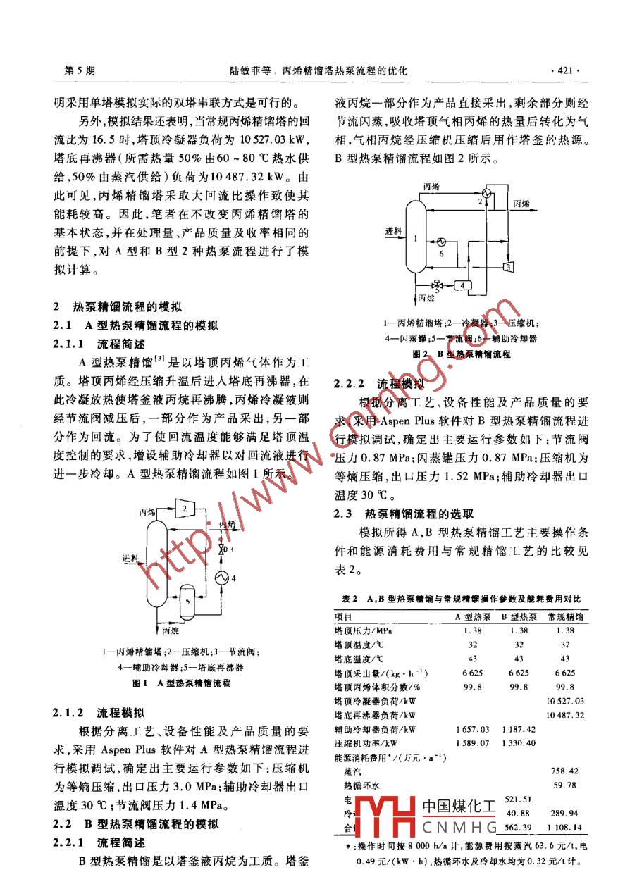 第25卷第5期石化技術(shù)與應(yīng)用Vol 25 No 52007年9月Petrochemical Technology ApplicationSep.2007工業(yè)技術(shù)(420~424)丙烯精餾塔熱泵流程的優(yōu)化陸敏菲,馮霄(西安交通大學(xué)化學(xué)工程系,陜西西安710049)摘要:利用 Aspen Plus流程模擬軟件,選用RK-S0AVE物性模型和 RADFRAC精餾模型,對常規(guī)丙烯精餾塔的操作工況進行了模擬。在此基礎(chǔ)上,對丙烯精餾塔的2種熱泵流程即塔頂蒸汽直接壓縮式熱泵流程和塔釜液閃燕再沸式熱泵流程進行了模擬計算。結(jié)果表明,對于丙烯精餾塔而言采用塔釜液閃蒸再沸式熱泵流程吏有利。所選熱泵精餾流程優(yōu)化操作參數(shù)如下:丙烯精餾塔進料佗置為第125塊塔板,回流比為16.5,節(jié)流閥壓力為10MPa。通過對操作參數(shù)進行優(yōu)化,在處理量相同的情況下,可使塔釜液閃蒸再沸式熱泵精餾流程壓縮機功率降低352.39kW,輔助冷卻器負荷降低31.72kW。關(guān)鍵詞:丙烯;精餾;熱泵;精餾塔;內(nèi)烷; Aspen Plus軟件;流程模擬中圖分類號:TQ221.212文獻標識碼:B文章編號:1009-0045(2007)05-0420-05在氣體分餾裝置的丙烯精餾塔中,由于丙烯從丙烯精餾塔第125塊塔板進入,其所含丙烷、丙和丙烷的沸點非常接近,當采用常規(guī)丙烯-丙烷烯、異丁烯的質(zhì)量分數(shù)介別為2218%,779%精餾流程對二者加以分離時,通常都要求精餾塔70.03%。產(chǎn)品中丙烯體積分數(shù)要求不低于99.6%控制較大回流比以保證產(chǎn)品純度,而這卻使得丙1.2模擬結(jié)果烯精餾單元在整個氣體分餾裝置中的能耗比例利用 Aspen Plus軟件12,采用 RADFRAC(嚴偏高。因此,如何降低丙烯精餾塔的能耗就成為格精餾/吸收)模型模擬丙烯塔(采用單塔模氣體分餾裝置節(jié)能的關(guān)鍵。擬),選用RK-SOAⅤE物性集計算汽液相平衡熱泵是在精餾過程中通常采用的一種有效及焓。的節(jié)能技術(shù)。采用熱泵工藝,不僅可使生產(chǎn)能耗將裝置基礎(chǔ)工藝數(shù)據(jù)和物性計算模型輸入大幅降低,而且叮使冷卻介質(zhì)的溫度在生產(chǎn)操作軟件進行模擬計算,所得結(jié)果與實際數(shù)據(jù)的比中不再具有決定性的作用。因此,該工藝非常適較見表1。合丙烯-丙烷這種沸點非常接近的精餾系統(tǒng)"。表1丙烯精餾塔模擬結(jié)果與實際數(shù)據(jù)的比較常用的熱泵精餾流程有2種類型,即塔頂蒸汽直模擬值實測值接壓縮式(以下簡稱為A型熱泵流程)和塔釜液塔頂壓力/MPa閃燕冉沸式(以下簡稱為B型熱泵流程)。塔頂溫度/℃32.0塔底溫度/℃43.0筆者從節(jié)能的角度出發(fā),運用 Aspen Plus流塔頂采出量(kg,b-")66256580程模擬軟件,確定出適合內(nèi)烯-內(nèi)烷常規(guī)精餾分塔頂丙烯體積分數(shù)/%998離要求的熱泵流程,并對熱泵精餾的操作參數(shù)進行了優(yōu)化。由表1可見,模擬值與實測值非常接近。這表I常規(guī)丙烯精餾塔的模擬1.1甚礎(chǔ)數(shù)據(jù)常規(guī)內(nèi)烯精餾塔共設(shè)有200塊塔板,采用雙塔TH中國煤化工CNMH G(20436040中聯(lián)方式,操作壓力1.38MPa,回流比16.5。溫度作者簡介:陸敏菲(1982一),女,江蘇常州人,碩士研究生。研究方向為過程系統(tǒng)工程。為40℃、壓力為20MPa、流量為8500kg/h的進料通訊聯(lián)系人。第5期陸敏菲等,丙烯精餾塔熱泵流程的優(yōu)化421明采用單塔模擬實際的雙塔串聯(lián)方式是可行的。液丙烷一部分作為產(chǎn)品直接采出,剩余部分則經(jīng)另外,模擬結(jié)果還表明,當常規(guī)內(nèi)烯精餾塔的回節(jié)流閃蒸,吸收塔頂氣相丙烯的熱量后轉(zhuǎn)化為氣比為16.5時,塔頂冷凝器負荷為10527.03kW,相,氣相丙烷經(jīng)壓縮機壓縮后用作塔釜的熱源。塔底再沸器〔所需熱量50%由60~80℃熱水供B型熱泵精餾流程如圖2所示。給,50%由蒸汽供給)負荷為10487.32kW。由丙烯此可見,內(nèi)烯精餾塔采取大回流比撅作致使其能耗較高。因此,筆者在不改變丙烯精餾塔的基本狀態(tài),并在處理量、產(chǎn)品質(zhì)量及收率相同的進料前提下,對A型和B型2種熱泵流程進行了模擬計算。2熱泵精餾流程的模擬2.1A型熱泵精餾流程的模擬1—丙烯精餾塔;2-冷凝器;3一壓縮機;2.1.1流程簡述4一閃蒸;5一節(jié)流閥;6一輔助冷卻器A型熱泵精餾'是以塔頂丙烯氣體作為T圖2B型熱泵精流程質(zhì)。塔頂丙烯經(jīng)壓縮升溫后進入塔底再沸器,在2.2.2流程模擬此冷凝放熱使塔釜液丙烷再沸騰,丙烯冷凝液則根據(jù)分離工藝、設(shè)備性能及產(chǎn)品質(zhì)量的要經(jīng)節(jié)流閥減壓后,一部分作為產(chǎn)品采出,另一部求,采用 Aspen Plus軟件對B型熱泵精餾流程進分作為回流。為了使回流溫度能夠滿足塔頂溫行模擬調(diào)試,確定出主要運行參數(shù)如下:節(jié)流閥度控制的要求,增設(shè)輔助冷卻器以對回流液進行壓力0.87MPa;閃蒸罐壓力0.87MPa;壓縮機為進一步冷卻。A型熱泵精餾流程如圖1所示。等熵壓縮,出口壓力1.52MPa;輔助冷卻器出口溫度30℃。2.3熱泵精餾流程的選取模擬所得A,B型熱泵精餾工藝主要操作條件和能源消耗費用與常規(guī)精餾L藝的比較見進料表2。4表2AB型熱泵精與常規(guī)精餾捐作參數(shù)及能耗費用對比A型熱泵B型熱泵常規(guī)精餾塔頂壓力/MPa1.38L.38塔頂溫度/℃32丙烯精餾塔;2-壓縮機;3—節(jié)流閥塔底溫度/℃4一輔助冷卻器;5一塔底再沸器塔頂采出量/(kg·h-)1A型熱泵精餾流程塔頂丙烯體積分數(shù)/%99.8塔頂冷凝器負荷/kWt0527.032.