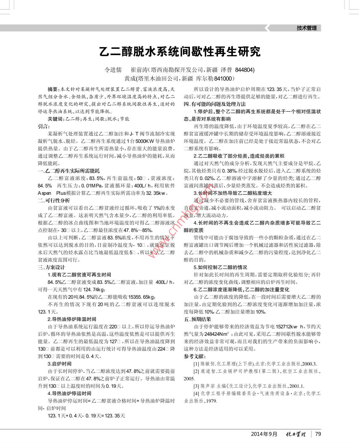乙二醇脫水系統(tǒng)間歇性再生研究