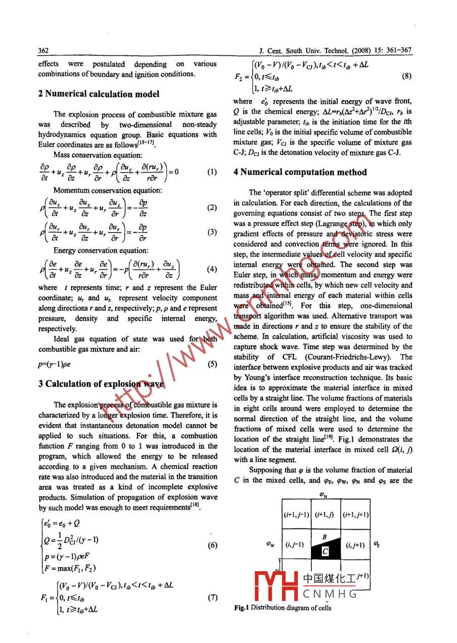 J Cent. South Univ Technol. (2008)15: 361-367DOI:10.1007/l1771-0080068-xNumerical simulation for explosion wave propagation ofcombustible mixture gasWANG Cheng(王成, NING Jian-guo(寧建國), MA Tian-bao(馬天寶(State Key Laboratory of Explosion Science and Technology, Beijing Institute of Technology,Beijing 100081, China)Abstract: A two-dimensional multi-material code was indigenously developed to investigate the effects of duct boundary conditionsand ignition positions on the propagation law of explosion wave for hydrogen and methane-based combustible mixture gas In thecode, Youngs technique was employed to track the interface between the explosion products and air, and combustible function modelwas adopted to simulate ignition process. The code was employed to study explosion flow field inside and outside the duct and toobtain peak pressures in different boundary conditions and ignition positions. Numerical results suggest that during the propagationin a duct, for point initiation, the curvature of spherical wave front gradually decreases and evolves into plane wave due to themultiple reflections on the duct wall, multi-peak values appear on pressure-time curve, and peak pressure strongly relies on the ductemition model and multi-material interface treatment method are feasibleKey words: combustible mixture gas; explosion wave; interface treatment; combustion function modefront tracking method with a godunov-type solver fo1 Introductionthe Euler equations, BIELERT and SICHE2investigated the propagation process of detonation ofIn mining and other related industries, explosion ethylene/oxygen and methane/air mixtures at differentrelated accidents occur frequently, the main cause is the mixing ratios in the duct. WANG and XU3I usedcombustible gases!-2). These occurrences normally five-order WENO scheme and elementary reactionattribute to leakage of combustible mixture gas in the model to simulate the propagation process of themining or industrial ducts. When mixed with air, such detonation wave for H2-O2 mixture gas in heart-shapedgases react violently. If ignited by some initiation sources, duct, and analyzed the process of wave system evolutiothey form a turbulent flow, and become combustible, and chemical dynamics accompanying the secondaryexplosive and even detonable due to disturbance from initiation. ZHANG et al 4) adopted simplified two-stagebarriers such as equipment and ducts. It is, therefore, chemical reaction model and improved high precisionof great significance to conduct research on propagation space-time conservation method (CE/Se)to simulateprocess of explosive wave produced by combustible deflagration-to-detonation process of combustible gasmixture gas after ignition. This resembles an explosion All these previous numerical simulation studies wereof a non-ideal explosive. In contrast to explosion of performed using single gas and only one material incondensed explosives, such a gas explosion is calculation domain. Up to our knowledge, there is nocharacterized by slowering pressure-rise, longer energy substantial understanding on the explosion characteristicsrelease time and longer over-pressure acting time on of combustible mixture gas and two or more materials instructures/9-10). Due to this fact and unavailability of calculation domain. The need therefore arises to studyanalytical solutions for the explosive wave produced by such situations. With our indigenously developedcombustible mixture gas, the research on explosion of two-dimensional Euler code based on Youngs techniccombustible mixture gas was mainly carried out by for processing multi-material interface and combustionnumerical simulation. In recent years, ORAN et all function model to simulate ignition process,numericalnumerically have simulated the cellular detonation of analyses were performed for the evolution process of theHr-Oz-Ar mixture gas. Their results indicated that the explosive flow field inside and outside the duct whencollision of triple wave points plays a very important role hydrogerne-based combustible mixture gasin the secondary initiation. With the combination ofplod中國煤化工 nations, variousFoundation item: Project(10572026)supported by the National Natural Science FoundatiCNMHGRecelved date: 2008-01-05: Accepted date: 2008-03-24nding author: WANG Cheng, Associate professor, PhD; TeL: +86-10-68912762; E-mail: wangcheng@biteducnJ.Cent. South Univ. Technol. (2008)15: 361-367effects were postulated depending on various(-1(-V)<1