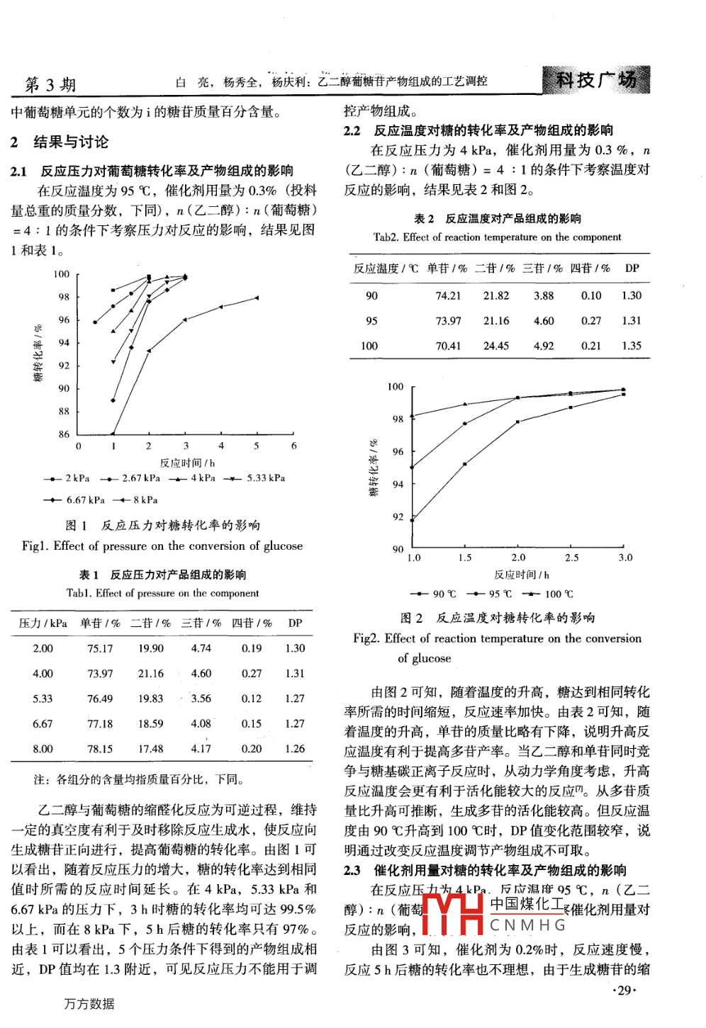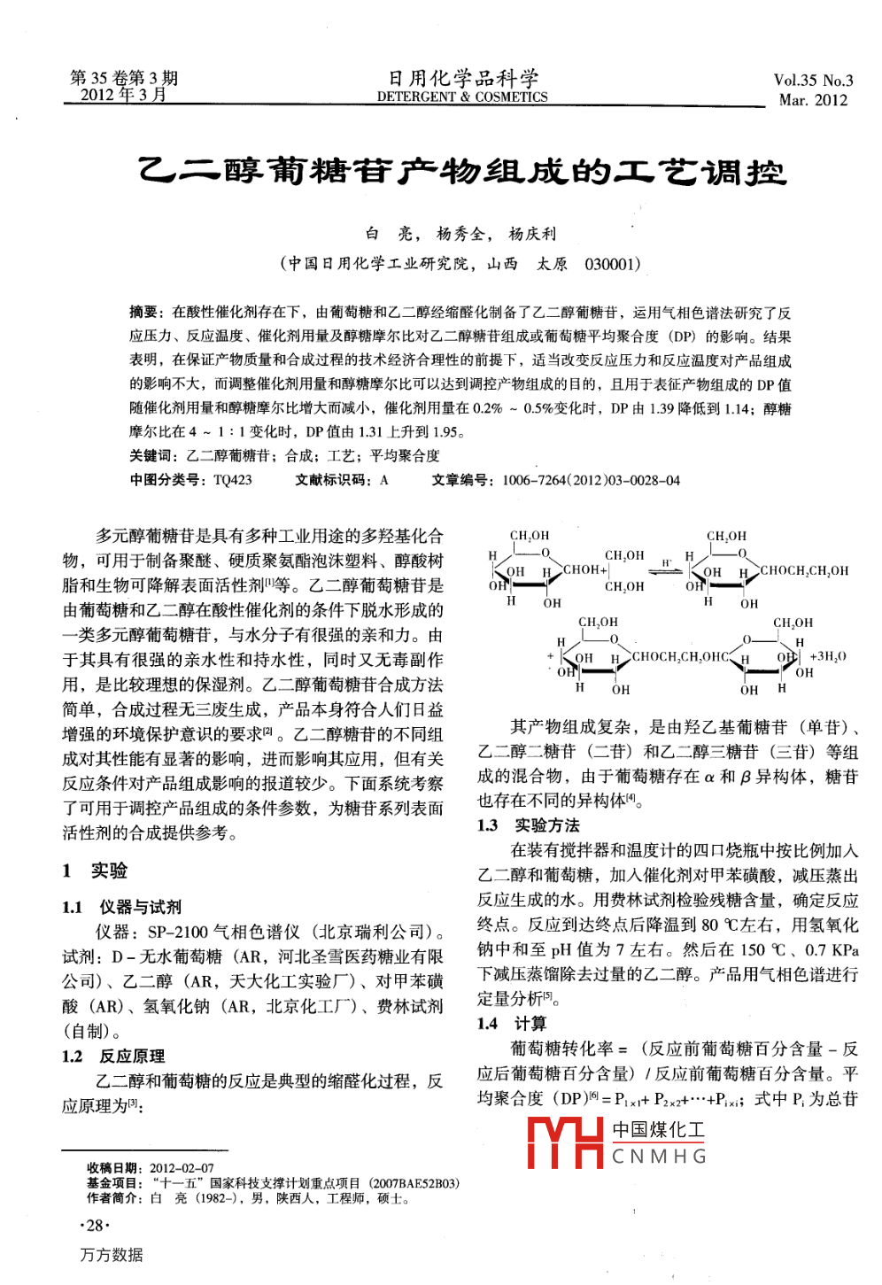 第35卷第3期日用化學品科學Vol 35 No. 3dEtERGENT COSMeticsMar.2012乙二醇葡糖苷產(chǎn)物組成的工藝調(diào)控白亮,楊秀全,楊慶利(中國日用化學工業(yè)研究院,山西太原030001)摘要:在酸性催化劑存在下,由葡萄糖和乙二醇經(jīng)縮醛化制備了乙二醇葡糖苷,運用氣相色譜法研究了反應(yīng)壓力、反應(yīng)溫度、催化劑用量及醇糖摩爾比對乙二醇糖苷組成或葡萄糖平均聚合度(DP)的影響。結(jié)表明,在保證產(chǎn)物質(zhì)量和合成過程的技術(shù)經(jīng)濟合理性的前提下,適當改變反應(yīng)壓力和反應(yīng)溫度對產(chǎn)品組成的影響不大,而調(diào)整催化劑用量和醇糖摩爾比可以達到調(diào)控產(chǎn)物組成的目的,且用于表征產(chǎn)物組成的DP值隨催化劑用量和醇糖摩爾比增大而減小,催化劑用量在02%~05%變化時,DP由1.39降低到1.14;醇糖摩爾比在4~1:1變化時,DP值由1.31上升到1.95關(guān)鍵詞:乙二醇葡糖苷;合成;工藝;平均聚合度中圖分類號:TQ423文獻標識碼:A文章編號:1006-7264(201203-0028-04多元醇葡糖苷是具有多種工業(yè)用途的多羥基化合CH OHCH,OH物,可用于制備聚醚、硬質(zhì)聚氨酯泡沫塑料、醇酸樹CH,OHCHOH+OH H, CH,OH脂和生物可降解表面活性劑等。乙二醇葡萄糖苷是CH OH由葡萄糖和乙二醇在酸性催化劑的條件下脫水形成的OHCHOHCHOH類多元醇葡萄糖苷,與水分子有很強的親和力。由于其具有很強的親水性和持水性,同時又無毒副作OH HCCHOCH2CH,OHC、H3H O用,是比較理想的保濕劑。乙二醇葡萄糖苷合成方法OHOH H簡單,合成過程無三廢生成,產(chǎn)品本身符合人們?nèi)找嬖鰪姷沫h(huán)境保護意識的要求叫。乙二醇糖苷的不同組其產(chǎn)物組成復雜,是由羥乙基葡糖苷(單苷)成對其性能有顯著的影響,進而影響其應(yīng)用,但有關(guān)乙二醇二糖苷(二苷)和乙二醇三糖苷(三苷)等組反應(yīng)條件對產(chǎn)品組成影響的報道較少。下面系統(tǒng)考察成的混合物,由于葡萄糖存在a和β異構(gòu)體,糖苷了可用于調(diào)控產(chǎn)品組成的條件參數(shù),為糖苷系列表面也存在不同的異構(gòu)體?;钚詣┑暮铣商峁﹨⒖?。13實驗方法在裝有攪拌器和溫度計的四口燒瓶中按比例加入1實驗乙二醇和葡萄糖,加入催化劑對甲苯磺酸,減壓蒸出11儀器與試劑反應(yīng)生成的水。用費林試劑檢驗殘?zhí)呛?確定反應(yīng)儀器:SP-2100氣相色譜儀(北京瑞利公司)。終點。反應(yīng)到達終點后降溫到80℃左右,用氫氧化試劑:D-無水葡萄糖(AR,河北圣雪醫(yī)藥糖業(yè)有限鈉中和至p值為7左右。然后在10℃、07KPa公司)、乙二醇(AR,天大化工實驗廠)、對甲苯磺下減壓蒸餾除去過量的乙二醇。產(chǎn)品用氣相色譜進行酸(AR)、氫氧化鈉(AR,北京化工廠)、費林試劑定量分析。(自制)。14計算12反應(yīng)原理葡萄糖轉(zhuǎn)化率ε(反應(yīng)前葡萄糖百分含量-反乙二醇和葡萄糖的反應(yīng)是典型的縮醛化過程,反應(yīng)后葡萄糖百分含量)/反應(yīng)前葡萄糖百分含量。平應(yīng)原理為均聚合度(DP)=P1x+P2x+…+Px;式中P為總苷中國煤化工CNMHG收稿日期:2012-02-07基金項目:“十一五”國家科技支撐計劃重點項目(2007BAE52B03)作者簡介:白亮(1982-),男,陜西人,工程師,碩士。第3期白亮,楊秀全,楊慶利:乙二醇葡糖苷產(chǎn)物組成的工藝調(diào)控科技廣場中葡萄糖單元的個數(shù)為i的糖苷質(zhì)量百分含量。控產(chǎn)物組成。22反應(yīng)溫度對糖的轉(zhuǎn)化率及產(chǎn)物組成的影響2結(jié)果與討論在反應(yīng)壓力為4kPa,催化劑用量為03%,n21反應(yīng)壓力對葡萄糖轉(zhuǎn)化率及產(chǎn)物組成的影響(乙二醇):n(葡萄糖)=4:1的條件下考察溫度對在反應(yīng)溫度為95℃,催化劑用量為0.3%(投料反應(yīng)的影響,結(jié)果見表2和圖2。量總重的質(zhì)量分數(shù),下同),n(乙二醇):n(葡萄糖)表2反應(yīng)溫度對產(chǎn)品組成的影響4:1的條件下考察壓力對反應(yīng)的影響,結(jié)果見圖Tab2. Effect of reaction temperature on the component1和表1。反應(yīng)溫度/℃單苷/%二苷/%三苷/%四苷/%DP74.2121823880.101.30739721.164.600.271.31e100704124454920.211.35反應(yīng)時間/h2 kP2. 67 kPa4 kP5.33 kPa-6. 67 kPa -8kP圖1反應(yīng)壓力對糖轉(zhuǎn)化率的影響Figl. Effect of pressure on the conversion of glucose1.5表1反應(yīng)壓力對產(chǎn)品組成的影響反應(yīng)時間/hTabl. Effect of pressure on the component壓力/kPa單苷/%二苷/%三苷/%四苷/%DP圖2反應(yīng)溫度對糖轉(zhuǎn)化率的影響Fig 2. Effect of reaction temperature on the conversion2.0019904.74191.3073.9721.160.271.315.3376.4919833.560.121.27由圖2可知,隨著溫度的升高,糖達到相同轉(zhuǎn)化率所需的時間縮短,反應(yīng)速率加快。由表2可知,隨77.1818.594.080.151.27著溫度的升高,單苷的質(zhì)量比略有下降,說明升高反78.1517484.170.201.26應(yīng)溫度有利于提高多苷產(chǎn)率。當乙二醇和單苷同時競注:各組分的含量均指質(zhì)量百分比,下同爭與糖基碳正離子反應(yīng)時,從動力學角度考慮,升高反應(yīng)溫度會更有利于活化能較大的反應(yīng)四。從多苷質(zhì)乙二醇與葡萄糖的縮醛化反應(yīng)為可逆過程,維持量比升高可推斷,生成多苷的活化能較髙。但反應(yīng)溫定的真空度有利于及時移除反應(yīng)生成水,使反應(yīng)向度由90℃升高到100℃時,DP值變化范圍較窄,說生成糖苷正向進行,提高葡萄糖的轉(zhuǎn)化率。由圖1可明通過改變反應(yīng)溫度調(diào)