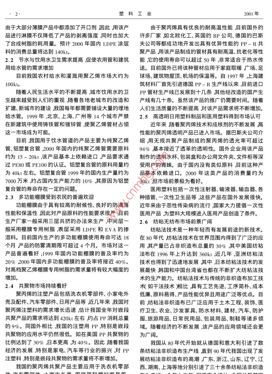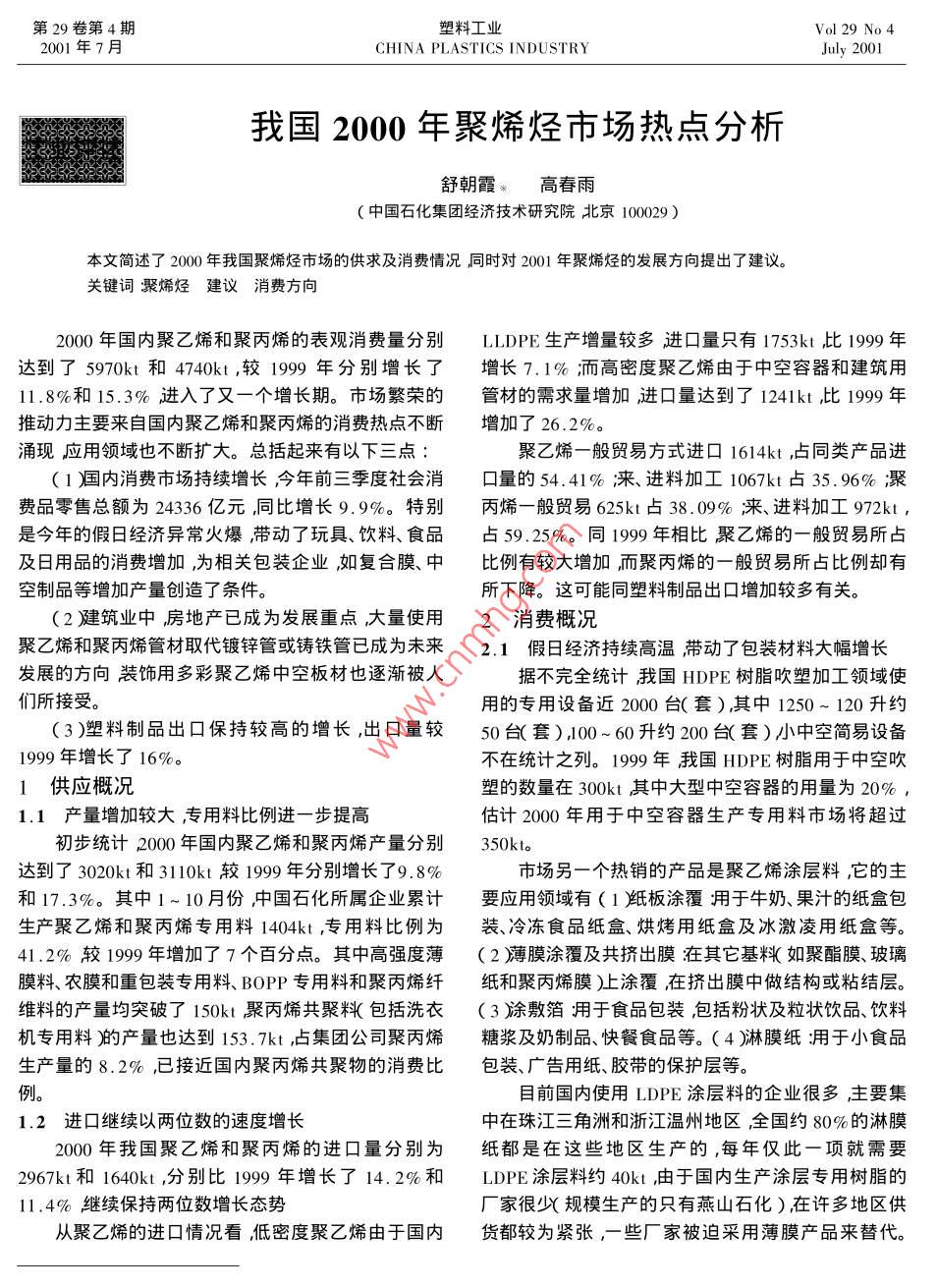 第29卷第4期.塑料工業(yè)Vol 29 No42001年7月CHINA PLASTICS INDUSTRYJuly 2001我國2000年聚烯烴市場熱點分析舒朝霞*高春雨 .(中國石化集團經(jīng)濟技術(shù)研究院北京100029 )本文簡述了2000年我國聚烯烴市場的供求及消費情況同時對2001年聚烯烴的發(fā)展方向提出了建議。關(guān)鍵詞聚烯烴建議消費方向2000年國內(nèi)聚乙烯和聚丙烯的表觀消費量分別LLDPE生產(chǎn)增量較多進(jìn)口量只有1753kt比1999年達(dá)到了5970kt 和4740kt,較 1999年分別增長了增長7.1%;而高密度聚乙烯由于中空容器和建筑用11.8%和15.3%進(jìn)入了又一個增長期。市場繁榮的管材的需求量增加進(jìn)口量達(dá)到了1241kt比1999年推動力主要來自國內(nèi)聚乙烯和聚丙烯的消費熱點不斷增加了26.2%。涌現(xiàn)應(yīng)用領(lǐng)域也不斷擴大??偫ㄆ饋碛幸韵氯c:聚乙烯一般貿(mào)易方式進(jìn)口1614kt ,占同類產(chǎn)品進(jìn)( 1 )國內(nèi)消費市場持續(xù)增長今年前三季度社會消口量的54.41% ;來、 進(jìn)料加工1067kt占35.96% ;聚費品零售總額為24336億元,同比增長9.9%。特別丙烯-般貿(mào)易625kt占38.09%;來、進(jìn)料加工972kt,是今年的假日經(jīng)濟異?;鸨?帶動了玩具飲料、食品占59.25%。 同1999年相比聚乙烯的一般貿(mào)易所占及日用品的消費增加,為相關(guān)包裝企業(yè),如復(fù)合膜、中比例有較大增加,而聚丙烯的一般貿(mào)易所占比例卻有空制品等增加產(chǎn)量創(chuàng)造了條件。所下降。這可能同塑料制品出口增加較多有關(guān)。(2 )建筑業(yè)中房地產(chǎn)已成為發(fā)展重點大量使用2消費概況聚乙烯和聚丙烯管材取代鍍鋅管或鑄鐵管已成為未來2.1假日經(jīng)濟持續(xù)高溫 ,帶動了包裝材料大幅增長發(fā)展的方向裝飾用多彩聚乙烯中空板材也逐漸被人據(jù)不完全統(tǒng)計我國HDPE樹脂吹塑加工領(lǐng)域使們所接受。用的專用設(shè)備近2000臺(套),其中1250~ 120升約(3 )塑料制品出口保持較高的增長,出口量較50臺(套),100~60升約200臺(套)小中空簡易設(shè)備1999年增長了16%。不在統(tǒng)計之列。1999 年我國HDPE樹脂用于中空吹1供應(yīng)概況塑的數(shù)量在300kt其中大型中空容器的用量為20% ,1.1 產(chǎn)量增加較大專用料比例進(jìn)-步提高估計2000年用于中空容器生產(chǎn)專用料市場將超過初步統(tǒng)計2000 年國內(nèi)聚乙烯和聚丙烯產(chǎn)量分別350kt。達(dá)到了3020kt和3110kt較1999年分別增長了9.8%市場另一個熱銷的產(chǎn)品是聚乙烯涂層料,它的主和17.3%。其中1~10月份中國石化所屬企業(yè)累計要應(yīng)用領(lǐng)域有( 1 )紙板涂覆用于牛奶、果汁的紙盒包生產(chǎn)聚乙烯和聚丙烯專用料1404kt ,專用料比例為裝、冷凍食品紙盒、烘烤用紙盒及冰激凌用紙盒等。41.2%較1999年增加了7個百分點。其中高強度薄(2)薄膜涂覆及共擠出膜在其它基料(如聚酯膜、玻璃膜料、農(nóng)膜和重包裝專用料、BOPP專用料和聚丙烯纖紙和聚丙烯膜)上涂覆在擠出膜中做結(jié)構(gòu)或粘結(jié)層。維料的產(chǎn)量均突破了150kt 聚丙烯共聚料(包括洗衣(3涂敷箔:用于食品包裝,包括粉狀及粒狀飲品、飲料機專用料)的產(chǎn)量也達(dá)到153.7kt ,占集團公司聚丙烯糖漿及奶制品、快餐食品等。(4 )淋膜紙:用于小食品生產(chǎn)量的8.2%,已接近國內(nèi)聚丙烯共聚物的消費比包裝、廣告用紙、膠帶的保護(hù)層等。例。目前國內(nèi)使用LDPE涂層料的企業(yè)很多,主要集1.2 進(jìn)口繼續(xù)以兩位數(shù)的速度增長中在珠江三角洲和浙江溫州地區(qū)全國約80%的淋膜2000年我國聚乙烯和聚丙烯的進(jìn)口量分別為紙都是在這些地區(qū)生產(chǎn)的,每年僅此一項就需要2967kt和1640kt ,分別比1999 年增長了14. 2%和LDPE涂層料約40kt ,由于國內(nèi)生產(chǎn)涂層專用樹脂的11.4%繼續(xù)保持兩位數(shù)增長態(tài)勢廠家很少(規(guī)模生產(chǎn)的只有燕山石化),在許多地區(qū)供從聚乙烯的進(jìn)口情況看低密度聚乙烯由于國內(nèi)貨都較為緊張,-些廠家被迫采用薄膜產(chǎn)品來替代。作者簡介舒朝霞高級工程師現(xiàn)任研究院市場營銷研究所所長。多年來主要從事石油化工的市場研究、項目可研評估、企業(yè)規(guī)劃國蒙石化行業(yè)規(guī)劃工作。曾多次在國家級刊物上發(fā)表文章。塑料工業(yè)2001年由于大部分薄膜產(chǎn)品中都添加了開口劑,因此用該產(chǎn)由于聚丙烯具有優(yōu)良的耐高溫性能,目前國外的品進(jìn)行淋膜不僅降低了產(chǎn)品的剝離強度同時也加大許多廠家如北歐化工、英國的BP公司、德國的巴斯了合成樹脂的耗用量。預(yù)計2000年國內(nèi)LDPE涂層夫公司等都成功地開發(fā)出具有優(yōu)異性能的PP- R共料的消費總量將達(dá)到140kto .聚產(chǎn)品用該產(chǎn)品制成的管材具有耐高溫、抗老化等性2.2節(jié)水與飲用水衛(wèi)生需求提高,促使農(nóng)用管和建筑能,它的使用壽命可以超過50年非常適合于熱水傳用給水管的需求增加送。目前國外已將該種管材應(yīng)用于家庭取暖廣場、足目前我國農(nóng)村給水和灌溉用聚乙烯市場大約為球場、建筑物屋頂、機場的保溫等。自1997 年,上海建100kt。筑材料廠首先引進(jìn)德國PP- R生產(chǎn)線以來,目前進(jìn)口隨著人民生活水平的不斷提高,城市飲用水的衛(wèi)PP管材生產(chǎn)線已發(fā)展到十幾條其他經(jīng)改造的國產(ch