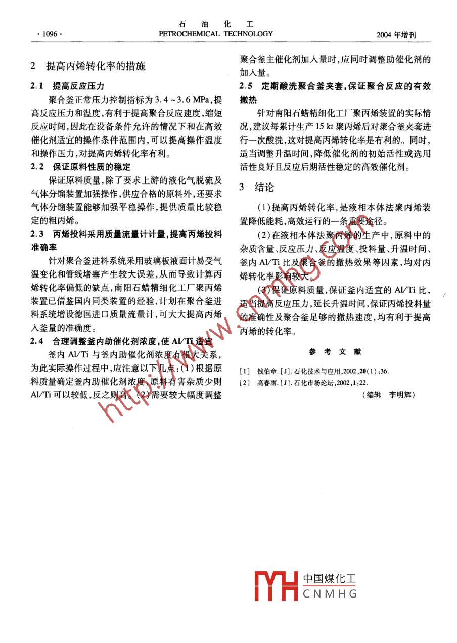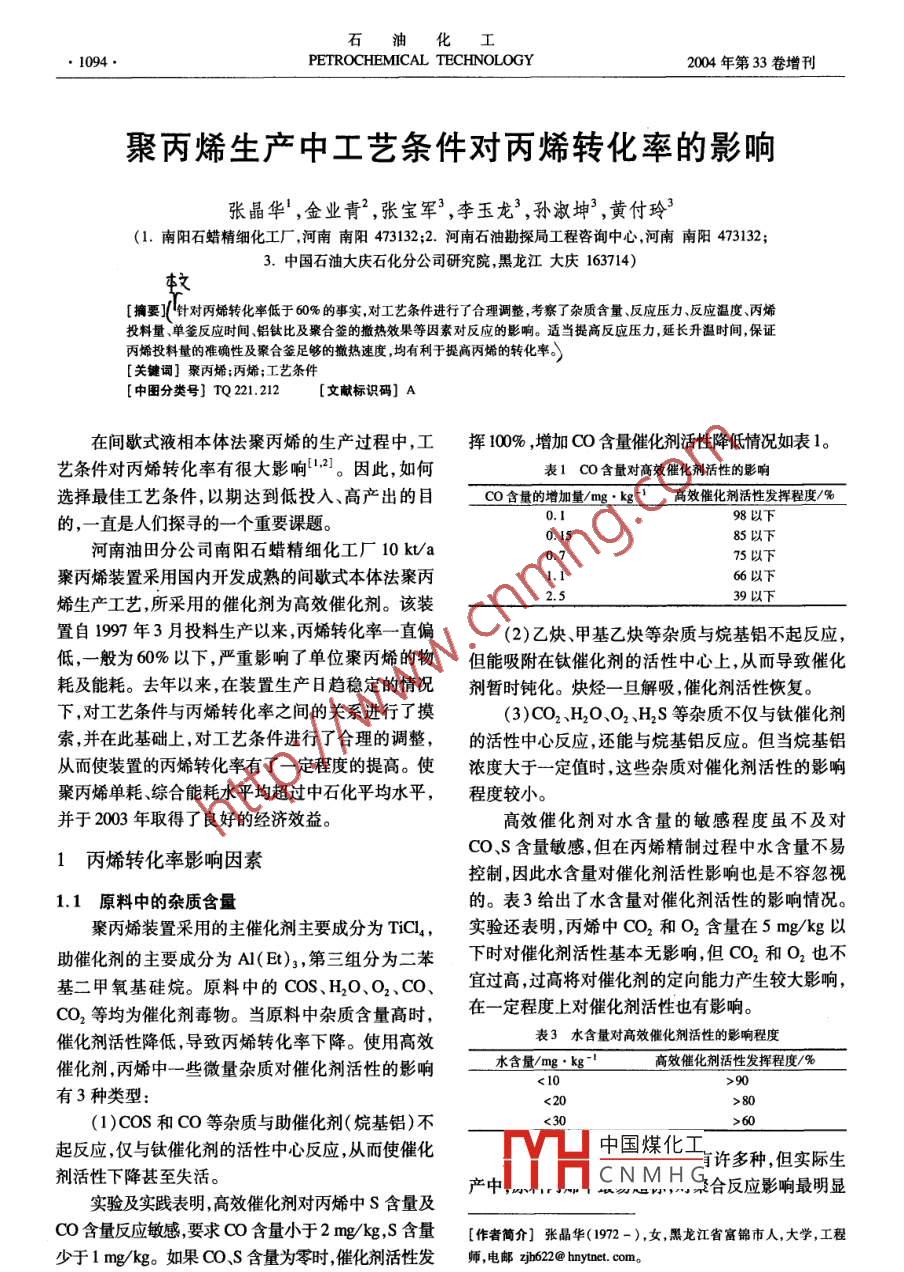 石油化工PETROCHEMICAL TECHNOLOGY2004年第33卷增刊聚丙烯生產(chǎn)中工藝條件對丙烯轉(zhuǎn)化率的影響張晶華,金業(yè)青2,張寶軍3,李玉龍3,孫淑坤3,黃付玲(1.南陽石蠟精細化工廠河南南陽473132;2.河南石油勘探局工程咨詢中心河南南陽473132;3.中國石油大慶石化分公司研究院,黑龍江大慶163714)文[摘要]針對丙烯轉(zhuǎn)化率低于60%的事實對工藝條件進行了合理調(diào)整考察了雜質(zhì)含量反應(yīng)壓力反應(yīng)溫度、丙烯投料量、單釜反應(yīng)時間、鋁鈦比及聚合釜的撤熱效果等因素對反應(yīng)的影響。適當提高反應(yīng)壓力,延長升溫時間,保證丙烯投料量的準確性及聚合釜足夠的撤熱速度,均有利于提高丙烯的轉(zhuǎn)化率[關(guān)鍵詞]聚丙烯;丙烯;工藝條件[中圖分類號]TQ221.22[文獻標識碼]A在間歇式液相本體法聚丙烯的生產(chǎn)過程中,工揮100%,增加CO含量催化劑活性降低情況如表1。藝條件對丙烯轉(zhuǎn)化率有很大影響2。因此,如何表1co含量對高效催化劑活性的影響選擇最佳工藝條件,以期達到低投入、高產(chǎn)出的目c0含量的增加量/mg·kg-1高效催化劑活性發(fā)揮程度/%的,一直是人們探尋的一個重要課題98以下0.1585以下河南油田分公司南陽石蠟精細化工廠10ka75以下聚丙烯裝置采用國內(nèi)開發(fā)成熟的間歇式本體法聚丙66以下烯生產(chǎn)工藝,所采用的催化劑為高效催化劑。該裝2.539以下置自1997年3月投料生產(chǎn)以來,丙烯轉(zhuǎn)化率一直偏2)乙炔、甲基乙炔等雜質(zhì)與烷基鋁不起反應(yīng)低,一般為60%以下,嚴重影響了單位聚丙烯的物但能吸附在鈦催化劑的活性中心上,從而導致催化耗及能耗。去年以來,在裝置生產(chǎn)日趨穩(wěn)定的情況劑暫時鈍化。炔烴一旦解吸,催化劑活性恢復(fù)。下,對工藝條件與丙烯轉(zhuǎn)化率之間的關(guān)系進行了摸(3)CO2H2O、O2H2S等雜質(zhì)不僅與鈦催化劑索,并在此基礎(chǔ)上,對工藝條件進行了合理的調(diào)整,的活性中心反應(yīng)還能與烷基鋁反應(yīng)。但當烷基鋁從而使裝置的丙烯轉(zhuǎn)化率有了一定程度的提高。使?jié)舛却笥谝欢ㄖ禃r,這些雜質(zhì)對催化劑活性的影響聚丙烯單耗綜合能耗水平均超過中石化平均水平,程度較小。并于2003年取得了良好的經(jīng)濟效益。高效催化劑對水含量的敏感程度雖不及對丙烯轉(zhuǎn)化率影響因素CO、S含量敏感,但在丙烯精制過程中水含量不易控制,因此水含量對催化劑活性影響也是不容忽視1.1原料中的雜質(zhì)含量的。表3給出了水含量對催化劑活性的影響情況聚丙烯裝置釆用的主催化劑主要成分為TCl4,實驗還表明,丙烯中CO2和O2含量在5mg/kg以助催化劑的主要成分為A(Et)3,第三組分為二苯下時對催化劑活性基本無影響但CO2和O2也不基二甲氧基硅烷。原料中的Cos、H1O、O2、Co、宜過高,過高將對催化劑的定向能力產(chǎn)生較大影響CO2等均為催化劑毒物。當原料中雜質(zhì)含量高時在一定程度上對催化劑活性也有影響。催化劑活性降低,導致丙烯轉(zhuǎn)化率下降。使用高效表3水含量對高效催化劑活性的影響程度催化劑,丙烯中一些微量雜質(zhì)對催化劑活性的影響水含量/mg·kg-高效催化劑活性發(fā)揮程度/%<10有3種類型:(1)COS和CO等雜質(zhì)與助催化劑(烷基鋁)不30起反應(yīng),僅與鈦催化劑的活性中心反應(yīng),從而使催化H中國煤化工許多種,但實際生劑活性下降甚至失活。產(chǎn)中四以,錄合反應(yīng)影響最明顯實驗及實踐表明,高效催化劑對丙烯中S含量及CO含量反應(yīng)敏感要求CO含量小于2mg/kg,S含量[作者簡介]張晶華(1972-),女,黑龍江省富錦市人,大學,工程少于1mg/kg。如果OOS含量為零時,催化劑活性發(fā)師電郵z622@hnytnet.com增刊張晶華等.聚丙烯生產(chǎn)中工藝條件對丙烯轉(zhuǎn)化率的影響的雜質(zhì)則為S、H2O等。近年來,隨著原料性質(zhì)變故投料量除考慮溫度變化外,還應(yīng)把這0.3m化,砷及雜烴對聚合反應(yīng)的影響也較大。南陽石蠟丙烯考慮進去,才能確保一定轉(zhuǎn)化率。精細化工廠聚丙烯裝置自投產(chǎn)以來,由于氣分裝置14單釜反應(yīng)時間頻繁開停工的原因,原料丙烯中雜質(zhì)含量頻繁超標,間歇反應(yīng)釜是間歇操作,間歇反應(yīng)釜中,反應(yīng)物當原料丙烯中雜質(zhì)超標嚴重時,常常發(fā)生聚合反應(yīng)料丙烯達到一定轉(zhuǎn)化率所需的反應(yīng)時間,只取決于終止(“清湯”),產(chǎn)生反應(yīng)很?;蚣ち椰F(xiàn)象。在此狀反應(yīng)速度,對于丙烯聚合反應(yīng)來就,不管反應(yīng)物料丙態(tài)下,大量未參與反應(yīng)的丙烯經(jīng)回收后進入高壓回烯的加料量多少,要達到相同的轉(zhuǎn)化率所需的反應(yīng)收系統(tǒng),部分進入閃蒸系統(tǒng),形成聚合尾氣,由此導時間相等。因而,要保證一定的轉(zhuǎn)化率,必需有足夠致丙烯轉(zhuǎn)化率偏低。的反應(yīng)時間,一般應(yīng)控制在3.0~4.0h較好1.2聚合反應(yīng)壓力和反應(yīng)溫度1.5鋁鈦比反應(yīng)壓力和溫度是聚合反應(yīng)中最重要的控制參A/Ti是一個重要參數(shù),在液相本體聚合反應(yīng)數(shù)之一,也是內(nèi)烯轉(zhuǎn)化率最重要的影響因素之一。中,AT有一個最佳值,約為250,過低,則催化劑當聚合溫度升高時,對應(yīng)的聚合反應(yīng)壓力相應(yīng)升高,活性急劇下降;過高,即A過量時,催化劑活性反而這時丙烯與催化劑活性中