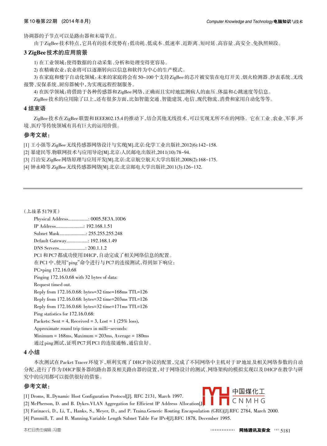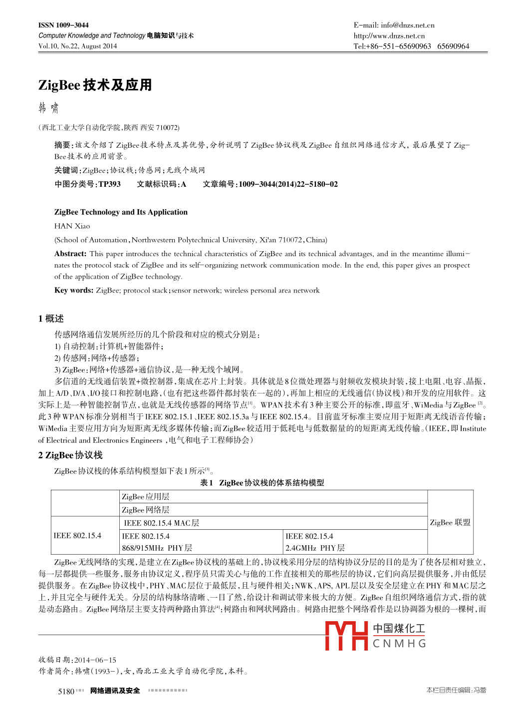 SN1009-304E-mail: info@@dnzs net cnComputer Knowledge and Technology電腦知識與技術(shù)http://www.dnzs.net.cnVol 10. No 22. August 2014Tel:+86-551-6569096365690964Zig Bee技術(shù)及應(yīng)用韓嘯(西北工業(yè)大學(xué)自動化學(xué)院,陜西西安710072)摘要:該文介紹了 Zigbee技術(shù)特點及其優(yōu)勢,分析說明了 ZigBee協(xié)議棧及 ZigBee自組織網(wǎng)絡(luò)通信方式,最后展望了zigBee技術(shù)的應(yīng)用前景關(guān)鍵詞: ZigBee;協(xié)議棧;傳感網(wǎng);無線個域網(wǎng)中圖分類號:TP393文獻(xiàn)標(biāo)識碼:A文章編號:100930442014)22-5180-02ZigBee Technology and Its ApplicationHAN XIao(School of Automation, Northwestern Polytechnical University, Xi'an 710072, China)Abstract: This paper introduces the technical characteristics of ZigBee and its technical advantages, and in the meantime illuminates the protocol stack of ZigBee and its self-organizing network communication mode. In the end, this paper gives an prospectKey words: ZigBee; protocol stack; sensor network; wireless personal area network1概述傳感網(wǎng)絡(luò)通信發(fā)展所經(jīng)歷的幾個階段和對應(yīng)的模式分別是:1)自動控制:計算機+智能器件;2)傳感網(wǎng):網(wǎng)絡(luò)+傳感器3) Zigbee:網(wǎng)絡(luò)+傳感器+通信協(xié)議,是一種無線個域網(wǎng)。多信道的無線通信裝置+微控制器,集成在芯片上封裝。具體就是8位微處理器與射頻收發(fā)模塊封裝,接上電阻、電容、晶振,加上A/D、DA、VO接口和控制電路,(也有把這些器件都封裝在一起的),再加上相應(yīng)的無線通信(協(xié)議棧)和開發(fā)的應(yīng)用軟件。這際上是一種智能控制節(jié)點,也就是無線傳感器的網(wǎng)絡(luò)節(jié)點"。WPAN技術(shù)有3種主要公開的標(biāo)準(zhǔn),即藍(lán)牙、 WiMedia與 ZigBee l此3種wPAN標(biāo)準(zhǔn)分別相當(dāng)于IEEE802.151、IEEE802.153a與IEE802.154。目前藍(lán)牙標(biāo)準(zhǔn)主要應(yīng)用于短距離無線語音傳輸;WiMedia主要應(yīng)用方向為短距離無線多媒體傳輸;而 ZigBee較適用于低耗電與低數(shù)據(jù)量的的短距離無線傳輸。(IEEE,即 Instituteof electrical and electronics engineers,電氣和電子工程師協(xié)會)2 Zigbee協(xié)議棧Zigbee協(xié)議棧的體系結(jié)構(gòu)模型如下表1所示。表1 ZigBee協(xié)議棧的體系結(jié)構(gòu)模型Zigbee應(yīng)用層Zigbee網(wǎng)絡(luò)層802154MAC層zie聯(lián)盟IEEE80215.4802.154IEEE802.15.4868/915 MHZ PHY層24 GMHz PHY層Zigbee無線網(wǎng)絡(luò)的實現(xiàn),是建立在 Zigbee協(xié)議棧的基礎(chǔ)上的,協(xié)議棧采用分層的結(jié)構(gòu)協(xié)議分層的目的是為了使各層相對獨立,每一層都提供一些服務(wù),服務(wù)由協(xié)議定義,程序員只需關(guān)心與他的工作直接相關(guān)的那些層的協(xié)議,它們向高層提供服務(wù),并由低層提供服務(wù)。在 Zigbee協(xié)議棧中,PHY、MAC層位于最低層,且與硬件相關(guān);NWK、APS,APL層以及安全層建立在PHY和MAC層之上,并且完全與硬件無關(guān)。分層的結(jié)構(gòu)脈絡(luò)清晰、一目了然,給設(shè)計和調(diào)試帶來極大的方便。 Zigbee自組織網(wǎng)絡(luò)通信方式,指的就是動態(tài)路由。 Zigbee網(wǎng)絡(luò)層主要支持兩種路由算法":樹路由和網(wǎng)狀網(wǎng)路由。樹路由把整個網(wǎng)絡(luò)看作是以協(xié)調(diào)器為根的一棵樹,而H中國煤化工CNMHG稿日期:2014-06-15作者簡介:韓嘯(1993-),女,西北工業(yè)大學(xué)自動化學(xué)院,本5180網(wǎng)絡(luò)通訊及安全1m第10卷第22期(2014年8月)Computer Knowledge and Technology電腦知識技術(shù)協(xié)調(diào)器的子節(jié)點可以是路由器和末端節(jié)點。由于 Zigbee z技術(shù)特點,它具有的技術(shù)優(yōu)勢有:低功耗、低成本、低速率、近距離、短時延、高容量、高安全、免執(zhí)照頻段3 Zigbee技術(shù)的應(yīng)用前景1)在工業(yè)領(lǐng)域:使得數(shù)據(jù)的自動采集、分析和處理變得更容易。2)在精確農(nóng)業(yè):農(nóng)業(yè)將可以逐漸轉(zhuǎn)向以信息和軟件為中心的生產(chǎn)模式。3)在家庭和樓宇自動化領(lǐng)域:未來的家庭將會有50-100個支持 Zigbee的芯片被安裝在電燈開關(guān)、煙火檢測器、抄表系統(tǒng)、無線報警、安保系統(tǒng)、廚房器械中,為實現(xiàn)遠(yuǎn)程控制服務(wù)。4在醫(yī)學(xué)領(lǐng)域:將借助于各種傳感器和 Zigbee網(wǎng)絡(luò),正確而且實時地監(jiān)測病人的血壓體溫和心跳速度等信息。Zigbee技術(shù)的應(yīng)用除了以上,還有很多方面,比如智能交通、智能建筑、電信、現(xiàn)代物流、消費和家用自動化等等4結(jié)束語ZigBee技術(shù)在 ZigBee聯(lián)盟和IEE802.154的推動下,結(jié)合其他無線技術(shù),可以實現(xiàn)無所不在的網(wǎng)絡(luò)。它在工業(yè)、農(nóng)業(yè)、軍事、環(huán)境、醫(yī)療等傳統(tǒng)領(lǐng)域有具有巨大的運用價值。參考文獻(xiàn)王小強等 Zigbe無線傳感器網(wǎng)絡(luò)設(shè)計與實現(xiàn)M]北京:化學(xué)工業(yè)出版社,2012(6:142-1582]暴建民等物聯(lián)網(wǎng)技術(shù)與應(yīng)用導(dǎo)論[M]北京:人民郵電出版社,2011(10:78-943]呂治安, ZigBee l網(wǎng)絡(luò)原理與應(yīng)用開發(fā)[M]北京:北京航空航天大學(xué)出版社,2008(2:168-1754]鐘永峰等 ZigBe無線傳感器網(wǎng)絡(luò)[M北京:北京郵電大學(xué)出版社2011(3:126-132(上接第5179頁)Physical Address0005.5E3A.10D6IP Address192.168.