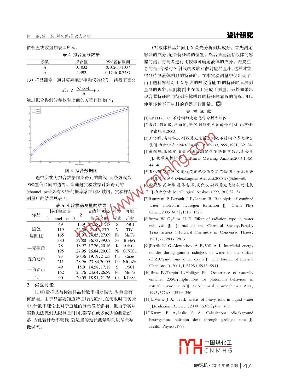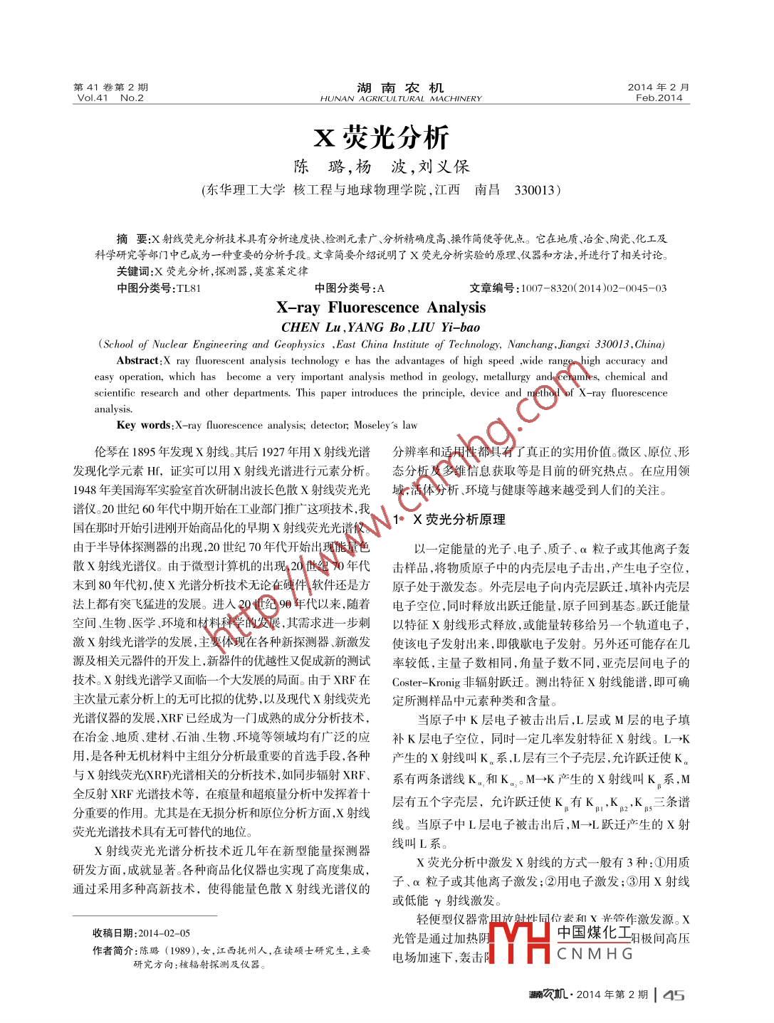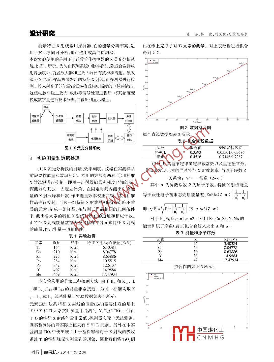 湖南農(nóng)機(jī)2014年2月Vol.41 No.2HUNAN, ARICURMAHINERYFeb.2014X熒光分析陳璐,楊波,劉義保(東華理工大學(xué)核工程與地球物理學(xué)院,江西南昌330013)摘要:X射線熒 光分析技術(shù)具有分析速度快、檢測(cè)元素廣、分析精確度高、操作簡(jiǎn)便等優(yōu)點(diǎn)。它在地質(zhì)、冶金、陶瓷、化工及科學(xué)研究等部門中已成為一種重要的分析手段。文章簡(jiǎn)要介紹說明了X熒光分析實(shí)驗(yàn)的原理、儀器和方法,并進(jìn)行了相關(guān)討論。關(guān)鍵詞:X熒光分析,探測(cè)器,莫塞萊定律中圖分類號(hào):TL81中圖分類號(hào):A文章編號(hào): 1007-8320( 2014)02- -0045-03X -ray Fluorescence AnalysisCHEN Lu,YANG Bo ,LIU Yi-bao(School of Nuclear Engineering and Geophysics , East China Institute of Technology, Nanchang, Jiangxi 330013,China)Abstract:X ray fluorescent analysis technology e has the advantages of high speed ,wide range, high accuracy aneasy operation, which has become a very important analysis method in geology, metallurgy and ceramics, chemical anscientific research and other departments. This paper introduces the principle, device and method of X-ray fluorescenceanalysis.Key words:X-ray fluorescence analysis; detector;, Moseley's law倫琴在1895年發(fā)現(xiàn)X射線。后1927年用X射線光譜分辨率和適用性都具有了真正的實(shí)用價(jià)值。微區(qū)、原位、形發(fā)現(xiàn)化學(xué)元素Hf,證實(shí)可以用X射線光譜進(jìn)行元素分析。態(tài)分析及多維信息獲取等是目前的研究熱點(diǎn)。在應(yīng)用領(lǐng)1948年美國(guó)海軍實(shí)驗(yàn)室首次研制出波長(zhǎng)色散X射線熒光光域, 活體分析、環(huán)境與健康等越來越受到人們的關(guān)注。譜儀。20世紀(jì)60年代中期開始在工業(yè)部]推廣這項(xiàng)技術(shù),我1 X 熒光分析原理國(guó)在那時(shí)開始引進(jìn)剛開始商品化的早期x射線熒光光譜儀。由于半導(dǎo)體探測(cè)器的出現(xiàn),20世紀(jì)70年代開始出現(xiàn)能量色以一定能量的光子、電子、質(zhì)子、a粒子或其他離子轟散X射線光譜儀。由于微型計(jì)算機(jī)的出現(xiàn),20世紀(jì)70年代擊樣品,將物質(zhì)原子中的內(nèi)殼層電子擊出,產(chǎn)生電子空位,末到80年代初,使X光譜分析技術(shù)無論在硬件、軟件還是方原子處 于激發(fā)態(tài)。外殼層電子向內(nèi)殼層躍遷,填補(bǔ)內(nèi)殼層法上都有突飛猛進(jìn)的發(fā)展。進(jìn)人20世紀(jì)90年代以來,隨著電子空位,同時(shí)釋放出躍遷能量,原子回到基態(tài)。躍遷能量空間生物醫(yī)學(xué)、環(huán)境和材料科學(xué)的發(fā)展,其需求進(jìn)一步刺以特征X射線形式釋放,或能量轉(zhuǎn)移給另一個(gè)軌道電子,激X射線光譜學(xué)的發(fā)展,主要體現(xiàn)在各種新探測(cè)器、新激發(fā)使該電子發(fā)射出來,即俄歇電子發(fā)射。另外還可能存在幾源及相關(guān)元器件的開發(fā)上,新器件的優(yōu)越性又促成新的測(cè)試率較低,主量子數(shù)相同,角量子數(shù)不同,亞殼層間電子的技術(shù)。X射線光譜學(xué)又面臨-一個(gè)大發(fā)展的局面。由于XRF在Coster- -Kronig非輻射躍遷。測(cè)出特征X射線能譜,即可確主次量元素分析上的無可比擬的優(yōu)勢(shì),以及現(xiàn)代x射線熒光定所測(cè)樣品中元素種類和含量。光譜儀器的發(fā)展, XRF已經(jīng)成為一-1 成熟的成分分析技術(shù),當(dāng)原子中K層電子被擊出后,L層或M層的電子填在冶金、地質(zhì)、建材、石油、生物、環(huán)境等領(lǐng)域均有廣泛的應(yīng)補(bǔ)K層電子空位,同時(shí)- -定幾率發(fā)射特征X射線。L→K用,是各種無機(jī)材料中主組分分析最重要的首選手段,各種產(chǎn)生的X射線叫K。系,L層有三個(gè)子殼層,允許躍遷使K。與X射線熒光(XRF光譜相關(guān)的分析技術(shù),如同步輻射XRF、系有兩條譜線K。和K。0 M→K產(chǎn)生的X射線叫K。系,M反射XRP光譜技術(shù)等,在痕量和超痕量分析中發(fā)揮著十層有五個(gè)字殼層,允許躍遷使K。有K。,K,K。三條譜分重要的作用。尤其是在無損分析和原位分析方面,X射線線。當(dāng)原子中L層電子被擊出后,M→L躍遷產(chǎn)生的X射熒光光譜技術(shù)具有無可替代的地位。x射線熒光光譜分析技術(shù)近幾年在新型能量探測(cè)器線叫L系。研發(fā)方面,成就顯著。各種商品化儀器也實(shí)現(xiàn)了高度集成,X熒光分析中激發(fā)X射線的方式- -般有 3種:①用質(zhì)通過采用多種高新技術(shù),使得能量色散X射線光譜儀的子、a粒子或其他離子激發(fā);②用電子激發(fā);③用X射線或低能γ射線激發(fā)。輕便型儀器常用放射性同位素和x光管作激發(fā)源。x收稿日期:2014-02-05光管是通過加熱陰中國(guó)煤化工陽極間高壓作者簡(jiǎn)介:陳璐(1989), 女,江西撫州人,在讀碩士研究生,主要電場(chǎng)加速下,轟擊CNMH G研究方向:核輻射探測(cè)及儀器。潞農(nóng)機(jī).2014年第2期| 45設(shè)計(jì)研究陳璐,楊波,劉義保:X熒光分析.測(cè)量特征X射線常用探測(cè)器,它的能量分辨率高,適出在紙上完成了對(duì)Ti元素的測(cè)量。對(duì)上表數(shù)據(jù)進(jìn)行擬合用于多元素同時(shí)分析,也可選用或高純探測(cè)器。得到圖2:本次實(shí)驗(yàn)使用的是用正比計(jì)數(shù)管作探測(cè)器的X熒光分析系統(tǒng),如圖1所示。為防止探測(cè)系統(tǒng)中脈沖疊加,除適合選擇放w