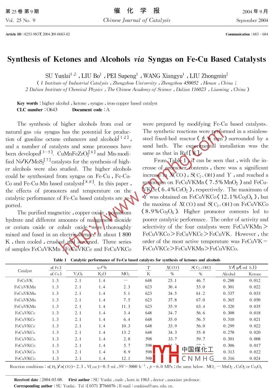 改性Fe-Cu催化劑上由合成氣合成酮和醇