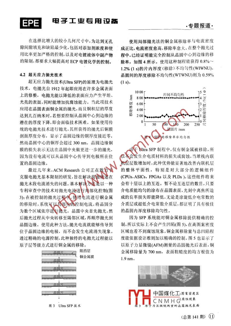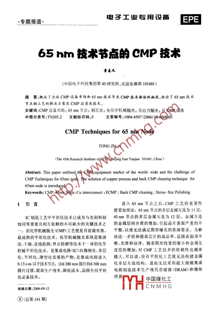 ●專(zhuān)題報(bào)道●電子工業(yè)專(zhuān)用設(shè)備EPE65 nm技術(shù)節(jié)點(diǎn)的CMP技術(shù)童志義(中國(guó)電子科技集團(tuán)第45研究所,北京東燕郊101601 )摘要:概述了全球CMP設(shè)備市場(chǎng)和65nm技術(shù)節(jié)點(diǎn)CMP技術(shù)面臨的挑戰(zhàn),給出了65nm技術(shù)節(jié)點(diǎn)銅工藝的解決方案及CMP后清洗技術(shù)。關(guān)鍵詞:CMP設(shè)備市場(chǎng); 65 nm節(jié)點(diǎn);銅互連;電化學(xué)機(jī)械拋光;無(wú)應(yīng)力拋光;后CMP清洗中圖分類(lèi)號(hào):TN305.2文獻(xiàn)標(biāo)識(shí)碼:B文章編號(hào): 1004-4507 (2006) 10-0008-05CMP Techniques for 65 nm NodeTONG Zhi-yi(The 45th Research Insititute of CETC, Beiing East Yanjiao 101601, China )Abstract: This paper outined the CMP equipment market of the world- wide and the challenge ofCMP Techniques for 65nm node. The solution of copper process and back CMP cleaning technique for65nm node is introduced.Keywords: CMP: 65nm Node; Cu interconnect ; ECMP ; Back CMP cleaning ; Stress- free Polishing引言進(jìn)入65nm節(jié)點(diǎn)之后,CMP工藝的重要性便更加突出。65 nm節(jié)點(diǎn)的多層金屬互連為11層,IC制造工藝中平坦化技術(shù)已成為與光刻和刻45 nm節(jié)點(diǎn)的多層金屬互連為12層。金屬互連蝕同等重要且相互依賴(lài)的不可缺少的關(guān)鍵技術(shù)之的金屬層間介質(zhì)的增加,引起晶片表面嚴(yán)重的不一。而化學(xué)機(jī)械拋光(CMP)工藝便是目前最有效、平整,以致無(wú)法滿足圖形曝光的焦深要求。為解最成熟的平坦化技術(shù)。化學(xué)機(jī)械拋光系統(tǒng)是集清決這一矛盾和提高芯片的成品率,晶圓表面須平洗、干燥、在線檢測(cè)、終點(diǎn)檢測(cè)等技術(shù)于一體的化學(xué)整、光滑和潔凈。隨著圖形線寬的縮小和金屬互機(jī)械平坦化技術(shù)。是集成電路(IC)向微細(xì)化、多層連層的增加,對(duì)CMP工藝技術(shù)的依賴(lài)性也越來(lái)化、平坦化、薄型化發(fā)展的產(chǎn)物,是集成電路進(jìn)入越大??梢哉f(shuō),沒(méi)有平坦化工藝就無(wú)法構(gòu)建金屬0.13 um以下技術(shù)節(jié)點(diǎn),中200 mm圓片向中300 mm化多層互連結(jié)構(gòu),進(jìn)而無(wú)法采用超大規(guī)模集成圓片過(guò)渡、提高生產(chǎn)效率、降低成本、晶圓全局平坦電路制造技術(shù)生產(chǎn)現(xiàn)代存儲(chǔ)器(DRAM)和微處化必備技術(shù)。理器中國(guó)煤化工收稿日期:2006-09-12.MYHCNMHG⑧(總第141期)電子工業(yè)專(zhuān)用設(shè)備EPE●專(zhuān)題報(bào)道.2CMP設(shè)備市場(chǎng)800廠23700■全球銷(xiāo)售量隨著圓片直徑的增大和工藝復(fù)雜性的不和600.中國(guó)銷(xiāo)售量斷提高,CMP設(shè)備的價(jià)格也在逐漸增加,一般糕50000499..42來(lái)說(shuō),φ 200mm的CMP機(jī)器大約是300萬(wàn)美元,300bs6φ 300mm晶圓的CMP機(jī)器大約是400萬(wàn)美元,器20019204晶圓尺寸越小價(jià)格越低。平均價(jià)格上漲始于001995年的75萬(wàn)美元至2010年的600萬(wàn)美元以上。在2006年的SEMICON West展會(huì)上,SE-1年份MI公布了其年度中期半導(dǎo)體設(shè)備市場(chǎng)預(yù)測(cè),預(yù)計(jì)圍1B 1995 2010年全球CMP設(shè)備銷(xiāo)售量2006年全球半導(dǎo)體市場(chǎng)規(guī)模將增長(zhǎng)18%,達(dá)到3工藝需求.388.1億美元。而中國(guó)市場(chǎng)漲幅將達(dá)到78%,達(dá)23.7億美元。SEMI表示,今年亞洲半導(dǎo)體市場(chǎng)的漲隨著φ300 mm和65 nm時(shí)代的到來(lái),用于互幅要高于全球其他地區(qū),其中尤以中國(guó)市場(chǎng)最為突連技術(shù)的新導(dǎo)體、新介質(zhì)材料已成為滿足未來(lái)半導(dǎo)出。2004年是全球CMP設(shè)備市場(chǎng)的高峰年,共銷(xiāo)體技術(shù)要求所必需。銅金屬化中的阻擋層,有效介售CMP設(shè)備374臺(tái),銷(xiāo)售額達(dá)12.9億美元。預(yù)計(jì)電常 數(shù)及金屬互連層的技術(shù)要求在不斷提高,從而今年全球CMP設(shè)備市場(chǎng)可望達(dá)到14.47億美元,對(duì)CMP技術(shù)提出了更多新的挑戰(zhàn)。阻擋層開(kāi)發(fā)目出售CMP設(shè)備400臺(tái)以上。到2010年,全球市場(chǎng)標(biāo)正在瞄準(zhǔn)不犧牲擴(kuò)散阻擋層特性的前提下使阻將銷(xiāo)售CMP設(shè)備450臺(tái),銷(xiāo)售額超過(guò)21億美元。擋層厚度和電阻率的最小化。國(guó)際半導(dǎo)體技術(shù)發(fā)展據(jù)SEMI預(yù)計(jì),到2010年我國(guó)還將新建20條路線(表 1)提出了將阻擋層厚度從2004年的100 nmφ 200~ φ 300 mm晶圓生產(chǎn)線。其中以φ 300 mm、節(jié)點(diǎn)的12nm減少到2007年65nm節(jié)點(diǎn)的7nm,90nm線5條、65 nm生產(chǎn)線2條計(jì)算,其余以絕緣體有效介電常數(shù)由100 nm節(jié)點(diǎn)的3.3~3.6降φ 200 mm.180~130 nm計(jì)算,設(shè)備總計(jì)投資將在到65 nm節(jié)點(diǎn)的2.7~3.0,金屬互連層數(shù)將由100nm240億美元左右,CMP設(shè)備市場(chǎng)以4.5%計(jì)算,約為節(jié)點(diǎn)的9層增加到65 nm節(jié)點(diǎn)的11層。10.8億美元。圖1給出了1995~ 2010年全球CMP銅互連和低介電常數(shù)材料的引入,以及雙嵌設(shè)備市場(chǎng)。.入式結(jié)構(gòu)的應(yīng)用對(duì)于CMP技術(shù)的發(fā)展起到了至關(guān)重要的影響作用,一個(gè)6層布線的MPU在制2 500備過(guò)程中需要至少8次CMP工藝,可以說(shuō)21.60■全球市場(chǎng)1964CMP對(duì)布線質(zhì)量和產(chǎn)品性能起著非常關(