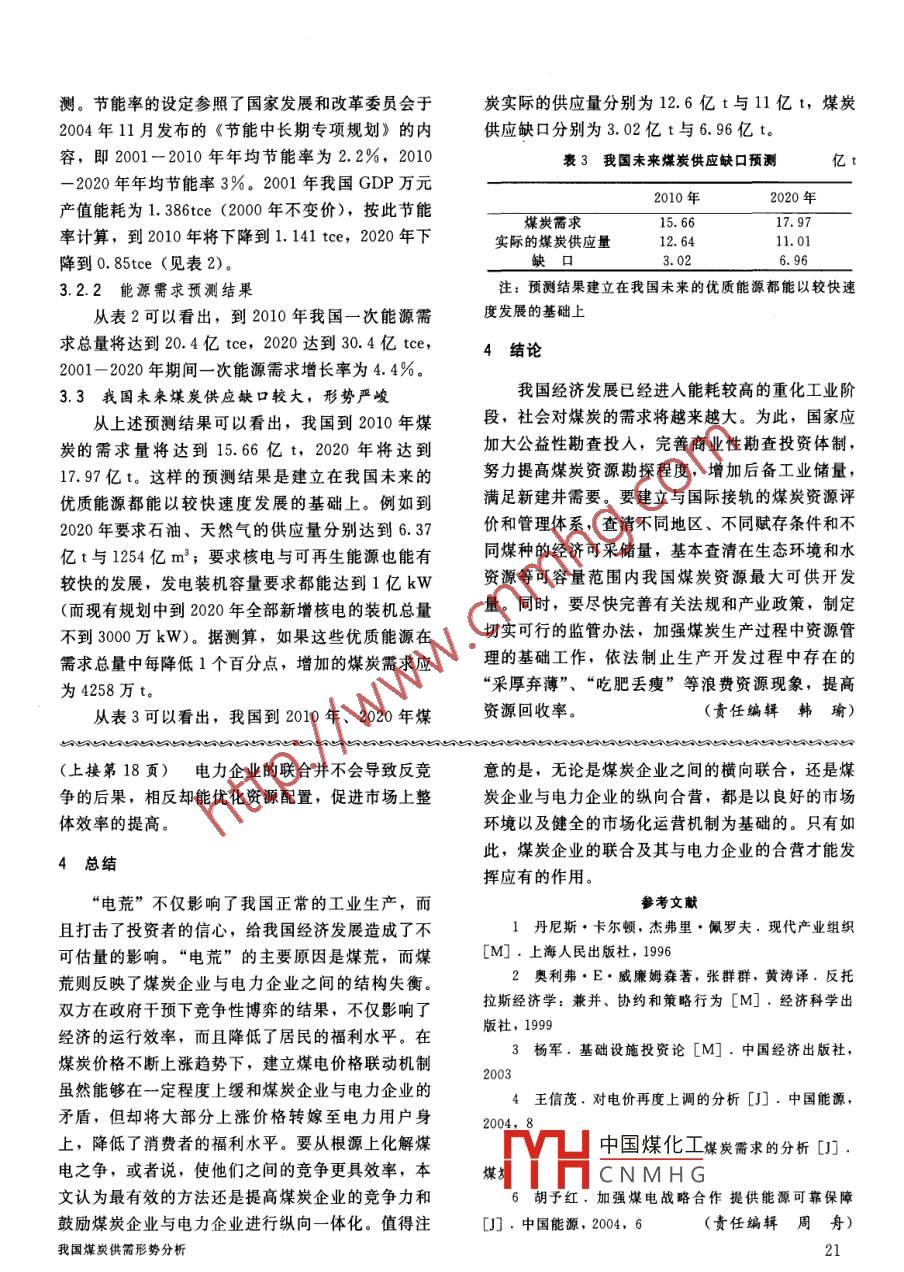 ★煤炭市場★我國煤炭供需形勢分析張建民(國家發(fā)展和改革委員會能源研究所,北京市西城區(qū),100038)摘要通過對我國國有重點煤礦及小煤礦現(xiàn)狀的具體分析,從而對我國未來煤炭需求進行預(yù)測,總結(jié)出我國煤炭行業(yè)未來發(fā)展方向。關(guān)鍵詞煤炭需求預(yù)測國有重點煤礦超能力生產(chǎn)反映出我國煤炭生產(chǎn)1我國大型煤礦現(xiàn)狀能力嚴重不足。這不僅直接增大安全生產(chǎn)事故隱1.1 基本情況患,增加事故發(fā)生率,而且大大縮短了礦井服務(wù)年我國原煤產(chǎn)量從長期來看呈逐年上升的態(tài)勢。限,造成新老礦井接續(xù)失調(diào),增加了國家對煤炭供1980- 1993年,我國原煤產(chǎn)量穩(wěn)步增長,產(chǎn)量由需平衡宏觀調(diào)控的難度。1980年的620Mt增長到1993年的1150Mt,年均引起超產(chǎn)的原因很多,主要有:我國煤炭需求增長率達4.9%。1993 年后原煤產(chǎn)量增速加快,強烈拉動的結(jié)果;與關(guān)閉年產(chǎn)30萬t以下(含301994- 1996年原煤產(chǎn)量由1150 Mt上升為1397萬t)小煤礦的宏觀政策有關(guān)。有人做過預(yù)測,如Mt, 1996 年產(chǎn)量為歷年間的最高值,隨后原煤產(chǎn)果關(guān)閉所有的這些小煤礦,我國原煤供應(yīng)將出現(xiàn)至量呈逐年減少局面,2000 年原煤產(chǎn)量為1000 Mt.少6億t,即煤炭需求量約-半的供應(yīng)缺口,屆時,2001年原煤產(chǎn)量開始回升,達1160 Mt, 2002 年大中型煤礦超產(chǎn)運行將會更加嚴重。產(chǎn)量增至1380 Mt.其中,我國國有重點煤礦產(chǎn)量從1980年的2小煤礦現(xiàn)狀344.4 Mt.上升至2002年的711.6Mt,年均增長率近20年來,我國小煤礦的發(fā)展經(jīng)歷了數(shù)量少、達3.35%,產(chǎn)量在1996年間有所起伏,但總體來產(chǎn)量比重小到數(shù)量多、產(chǎn)量比重大再到數(shù)量正在減說增速較均勻,呈逐年穩(wěn)步增長態(tài)勢。少、產(chǎn)量比重正在下降的發(fā)展軌跡。目前,小煤礦1.2 超產(chǎn)情況正經(jīng)歷著無序競爭向有序競爭的轉(zhuǎn)變,這是國家對據(jù)調(diào)查,我國10大煤炭公司2001年的總產(chǎn)量小型煤礦宏觀調(diào)控政策的結(jié)果。20 世紀80年代初達25294萬t,比2000年上升20.3%。2001 年,期,中國小型煤礦數(shù)量少,產(chǎn)量占全國煤炭產(chǎn)量的10大煤炭公司煤炭產(chǎn)量與其核定能力相比都存在比重小。后來國家對煤炭工業(yè)實施“有水快流”的不同程度的超產(chǎn)。超產(chǎn)的程度比2000年高出很多,指導方針,以鄉(xiāng)鎮(zhèn)煤礦為主的小型煤礦盲目發(fā)展。2000年平均超產(chǎn)率為2%,到2001年則達到到1995年,全國小型煤礦達7.6萬個,造成布局22%。2002 年底,國有重點煤礦和國有地方煤礦不合理、粗放經(jīng)營、與國有企業(yè)爭資源、安全事故核定原煤生產(chǎn)能力約8.35億t,卻生產(chǎn)了11.24 億頻繁發(fā)生等問題。1998 年,國務(wù)院發(fā)布實施了t,超能力生產(chǎn)約2.89億t,超產(chǎn)率達35%,一些《礦產(chǎn)資源開采登記管理辦法》,將原來規(guī)定的煤炭因資源枯竭應(yīng)該關(guān)閉的大中型煤礦仍在生產(chǎn)。2003中國煤化工E- 負責(可以授權(quán)年,我國國有重點煤礦生產(chǎn)原煤8.3億t,超能力省下煤礦采礦許可證),生產(chǎn)約1.4億t,超產(chǎn)率達20%以上。之鹿MHCNMHG.1998年因煤炭銷售困難,國務(wù)院決定關(guān)井壓產(chǎn)。1999- 2001年,作者為國家發(fā)展和改革委員會能源研究所研究員全國暫時停止發(fā)放中小型煤礦采礦許可證。通過換19證和治理整頓,全國小煤礦由1998年的51736個,392萬t,衰減能力153萬t,合計為545萬t。減少到了2002年年底的28532個,減少了近一半,3.1.4 我國煤礦煤炭生產(chǎn)衰減能力估算全國煤炭產(chǎn)量由1998年的10.34 億t增至2003年從表1可以看出,我國煤礦生產(chǎn)衰減量到的16.67億t?!?010 年將達1.3億t, 2020 年將達1.63億t;全國煤炭生產(chǎn)能力由2002年的13. 94億t削減為20103我 國未來煤炭供應(yīng)存在較大缺口年12.64億t,到2020年僅為11.01億t。3.1不同類型煤礦生產(chǎn)衰減能力估算3.2 我國未來能源需求預(yù)測3.1.1 國有重點煤礦表2我國2001-2020年一次能源需求預(yù)測國有重點煤礦的產(chǎn)量由三部分礦井組成,即現(xiàn)2001年.2010年2020年有生產(chǎn)礦井(老井), 現(xiàn)有生產(chǎn)礦區(qū)周圍建設(shè)新井GDP產(chǎn)值/億元(老區(qū)新井)以及新區(qū)開發(fā)(新區(qū))。(2000年不變價)97314. 8178927357872現(xiàn)有生產(chǎn)礦井是當前煤炭生產(chǎn)的主力礦井,GDP產(chǎn)值能耗1.3861.1410. 8502000年生產(chǎn)原煤5.35億t,但是這部分礦井多為/tce.萬元1965年前投產(chǎn)的老井,趨于報廢。預(yù)測2001-節(jié)能率2. 2%%(2001- 2010) (2010- 2020)2020年報廢能力將達到1.08億t,年平均報廢能力為568萬t;2021-2050年報廢能力將達2.02.能源需求量134914204156304104/萬tce億t以上,年平均報廢能力為697萬t。即使通過煤炭擴建和改造,預(yù)計到2050年,現(xiàn)有礦井將只有約88099111877128332/萬t1262111566281796652.25億t剩余能力,占現(xiàn)有礦井總能力的42%。/%65. 354.842.23.1.2地方國有煤礦石油1986- 2000年期間,我國地方國營煤礦3萬t327845348990927213433745763674及以上報廢礦井總數(shù)達895處,合計達6654萬t,24. 326.229. 9平均每年因礦井報廢而減少的煤炭產(chǎn)量達512萬t。天然氣其中“七五”期間388處,合計2355萬t;“八五”3643714516726/億m'274535.91254. 4和