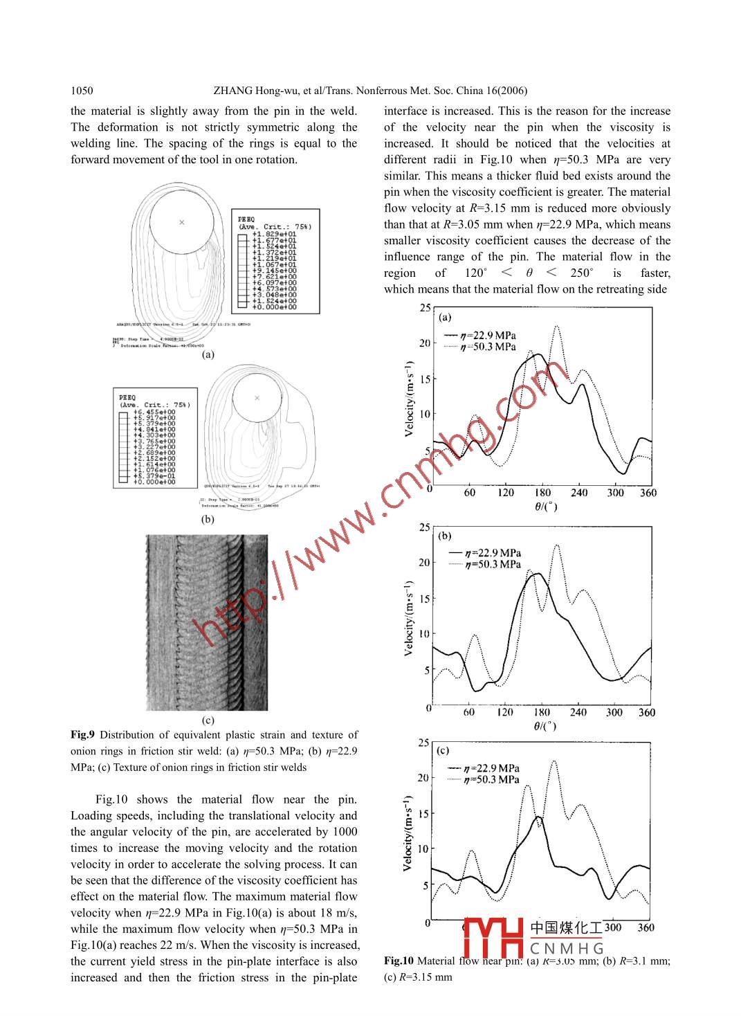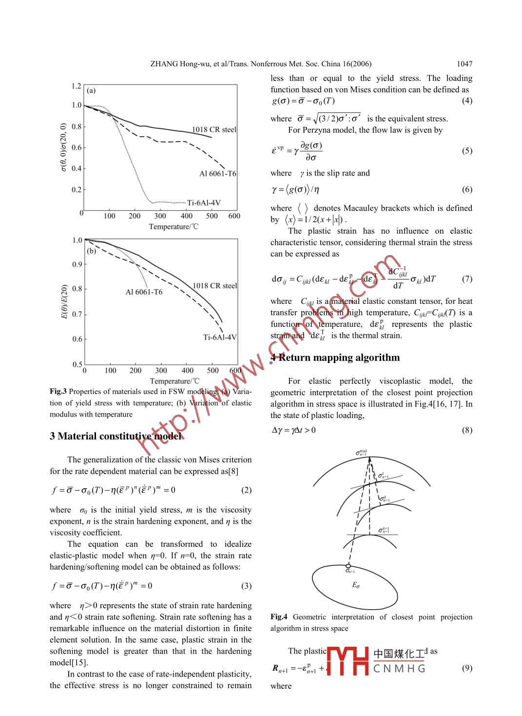 Available online at www.sciencedirect.comSCIENCEdoIREcT.Transactions ofNonferrous MetalsSociety of ChinaScienceTrans. Nonferrous Met. Soc. China 16(2006) 1045-1052Presswww.csu.edu.cn/ysxb/Effect of viscosity on material behavior in friction stir welding processZHANG Hong-wu(張洪武),ZHANG Zhao(張昭),BIE Jun(別俊), ZHOU Lei(周雷), CHEN Jin-tao(陳金濤)State Key Laboratory of Structural Analysis for Industrial Equipment, Department of Engineering Mechanics,Dalian University of Technology, Dalian 116024, ChinaReceived 25 November 2005; accepted 8 May 2006Abstract: Temperature dependent elastic viscoplastic material model was used for the numerical simulation of the friction stirwelding process. The non-elastic response of the rate-dependent material in the large deformation problems was calculated by usingthe closest point algorithm. The numerical results show that the shape of the equivalent plastic strain looks like onion rings and thespacing of the rings is approximately equal to the forward movement of the tool in one rotation. The equivalent plastic strain isincreased with the increase of viscosity coefficient due to the increase of friction stress in the pin-plate interface. The region which isinfluenced by the rotating tool is decreased with the decrease of viscosity coefficient. The radial and circumferential stresses in frontof the pin are greater than the ones behind the pin. This difference can be reduced with the decrease of viscosit.Key words: rate-dependent model; constitutive relationship; radial return mapping algorithm; friction stir weldingfracture location characterizations in friction stir welds1 Introductionand the friction stir welding characteristic of aluminumalloy plates with different thicknesses.Friction stir welding(FSW) is a new solid-stateAs a solid-state joining technique, the materialjoining process invented by TWI, in which joining ofaround the pin will generate great thermal plastic strainmaterial is achieved without melting. The usual flawsduring FSW. The mechanical properties of the material atsuch as slag-inclusions and porosity can be minimized orhigh temperature can be related to time. Thus, theeven can be eliminated in friction stir welds. This newunderstanding of the mechanism of FSW can betechnique is successfully being applied to the aerospace,improved by use of the visco-plasticity model.automobile and ship-building industries. NumericalA time-continuous model normally forms the basissimulation is important for investigating the mechanismfor the constitutive equations in the modeling of theand even optimizing the process parameters of frictionelasto-plastic material behavior. In this time-continuousstir welding. DENG et al[1] used solid-mechanics basedmodel the relation between strain and stress in thefinite element method with adaptive meshing to simulateinelastic domain is defined in a rate formulation. So inthe friction stir welding process. Two different interfacethe numerical solution procedure, it becomes necessarymodels with rate-independent material were used toto integrate the constitutive equation to obtain thstudy the material flow. SANTIAGO et al[2] simulatedincremental formulation. It is recognized that the returnthe 3D thermally coupled FSW process and presented themapping algorithm is very efficient for large scaletemperature field distribution using a general finiteinelastic computations[7]. This integration scheme iselement code. The strain hardening and texture evolutionboth inexpensive and accurate[8]. In order to preservein the friction stir welds of stainless steel has beenthe quadratic rate of asymptotic convergence, it is crucialstudied by CHO et al[3]. Recently, ZHANG et al[4]to ensure the consistency between the tangent modulusstudied the stress and strain distributions in FSW byand the integration algorithm especially for the widelyfinite element method. LIU et al[5, 6] studied the tensileused iterative schemes based on Newton' s method.中國煤化工Foundation item: Porjects( 10225212; 10421002; 10302007) supported by the National Natural s: spprted by theProgram of Changjiang Scholars and the Innovative Research Team in UniveMHC N M H G2005CB321704)supported by the National Basic Research Program of ChinaCorresponding author: ZHANG Hong-wu; Tel/Fax: +86-411-84706249; E-mail: zhanghw@dlut.edu.cn.1046ZHANG Hong-wu, et al/Trans. Nonferrous Met. Soc. China 16(2006)ZHANG[9] presented a method whereby an explicit.30mm小30mmexpression for the tangent moduli consistent with aRetreatingAdvancingclosest point return mapping algorithm may besideuideveloped for generalized pressure-dependent elasto-plasticity models. One significant advantage of thisWeldingmethod is that no matrix inversion is necessary in the; lineconsistent tangent modulus expression. SERCOMBE etal[10] investigated the consistent returm mappingalgorithm for chemo-plastic constitutive laws withinternal couplings. A closest point project algorithm wasdeveloped to preserve the quadratic rate of convergenceR,=3. mm0of the Newton-Raphson iteration scheme.dO)rIn the high temperature state, the effect of the↓Dlviscosity on material behavior becomes important. IFSW, the temperature near the pin is high enough toFig.1 Sketch of friction stir weldingmake the material soft, and it is believed that thetemperature ranges 80%-90% of the melting point of thetion and causes the solving difficulty of double non-material[11]. So the effect of the viscosity on materiallinearity[12]. In order to solve this problem thebehavior becomes more obvious. The study of the effecttemperature field from experiment[13] is used. In theof the viscosity becomes useful and interesting in theexperimental test, the angular velocity of the rotating toolFSW process.is 0=400 r/min and the translational velocity v=2 mm/s.The return mapping algorithm is implemented forFig.2 shows the history of temperature. In the FSWthe massive computations on the flow properties aroundprocess, the friction