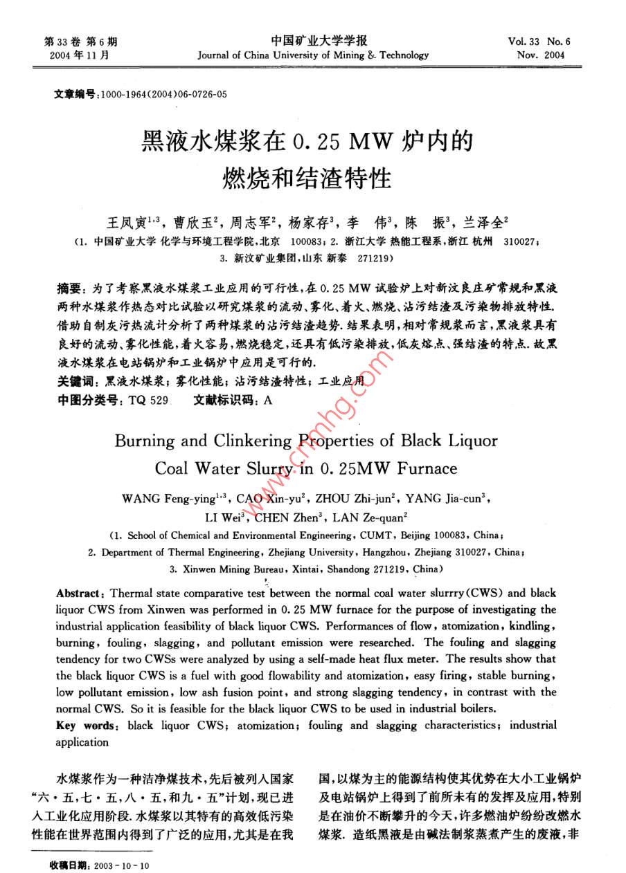 黑液水煤漿在0.25 MW爐內(nèi)的燃燒和結(jié)渣特性