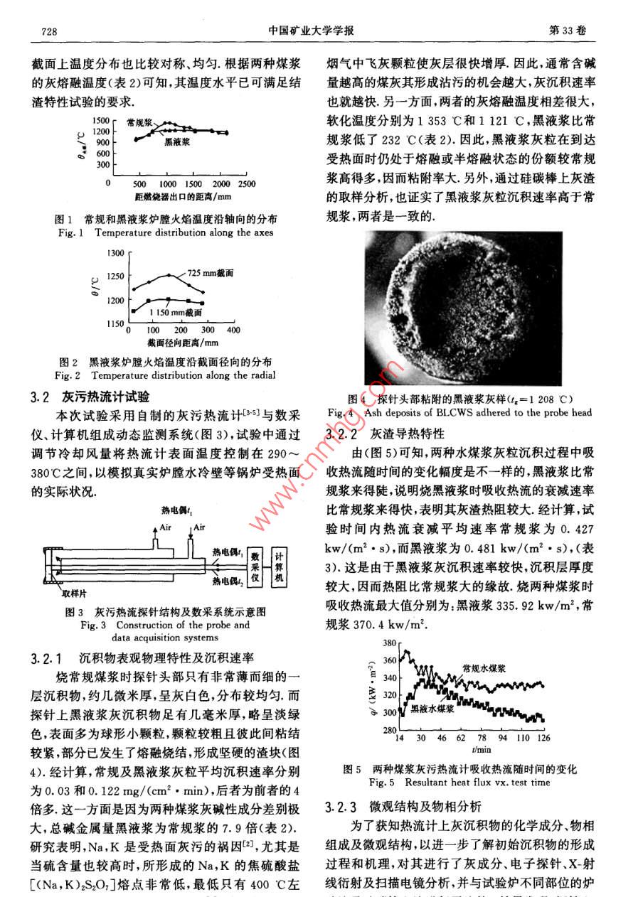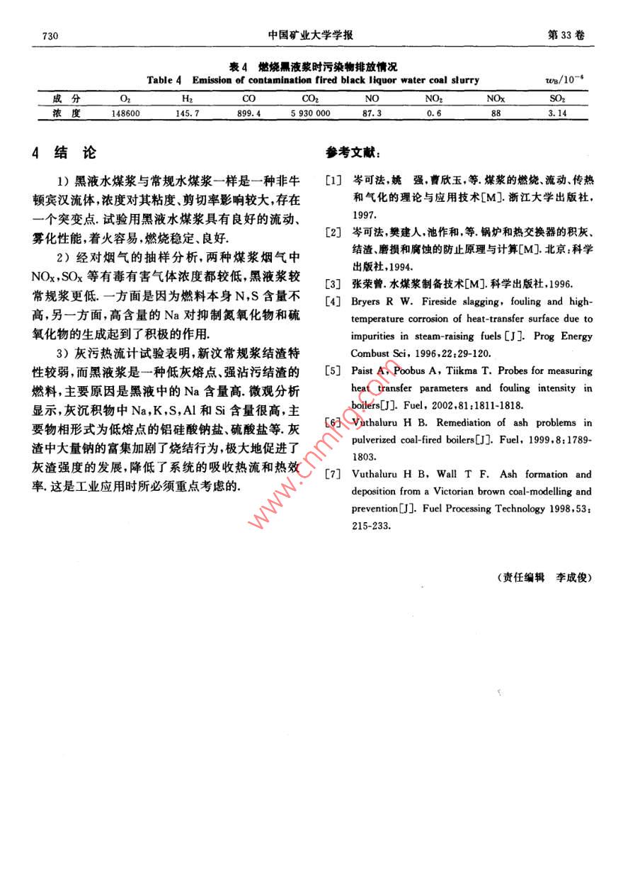 第33卷第6期中國礦業(yè)大學學報2004年11月Journal of China University of Mining & TechnologyNov.2004文章編號:1000-1964(2004)06-0726-05黑液水煤漿在0.25MW爐內(nèi)的燃燒和結(jié)渣特性王鳳寅3,曹欣玉2,周志軍2,楊家存3,李偉3,陳振3,蘭澤全2(1.中國礦業(yè)大學化學與環(huán)境工程學院北京100083;2.浙江大學熱能工程系,浙江杭州310027;3.新汶礦業(yè)集團,山東新泰271219)摘要:為了考察黑液水煤漿工業(yè)應用的可行性,在0.25MW試驗爐上對新汶良莊礦常規(guī)和黑液兩種水煤漿作熱態(tài)對比試驗以研究煤漿的流動、霧化、著火、燃燒、沾污結(jié)渣及污染物排放特性借助自制灰污熱流計分析了兩種煤漿的沾污結(jié)渣趨勢.結(jié)果表明,相對常規(guī)漿而言,黑液漿具有良好的流動、霧化性能,著火容易,燃燒穩(wěn)定,還具有低污染排放,低灰熔點、強結(jié)渣的特點.故黑液水煤漿在電站鍋爐和工業(yè)鍋爐中應用是可行的關(guān)鍵詞:黑液水煤漿;霧化性能;沾污結(jié)渣特性;工業(yè)應用中圖分類號:TQ529文獻標識碼:ABurning and Clinkering Properties of black LiquorCoal Water Slurry in 0. 25MW FurnaceWANG Feng-ying, CAO Xin-yu, ZHOU Zhi-jun, YANG Jia-cun,LI Wei, CHEN Zhen, LAN Ze-quan2(1. School of Chemical and Environmental Engineering, CUMT, Beijing 100083, China:2. Department of Thermal Engineering, Zhejiang University, Hangzhou, Zhejiang 310027, China:3. Xinwen Mining Bureau, Xintai, Shandong 271219, China)Abstract: Thermal state comparative test between the normal coal water slurry(CwS)and blackliquor CwS from Xinwen was performed in 0. 25 MW furnace for the purpose of investigating theindustrial application feasibility of black liquor CWS. Performances of flow, atomization, kindlingburning, fouling, slagging, and pollutant emission were researched. The fouling and slaggingtendency for two CwSs were analyzed by using a self-made heat flux meter. The results show thathe black liquor CWS is a fuel with good flowability and atomization, easy firing, stable burninglow pollutant emission, low ash fusion point, and strong slagging tendency, in contrast with thenormal CWS. So it is feasible for the black liquor CwS to be used in industrial boilers.Key words: black liquor CWS; atomization; fouling and slagging characteristics; industrialapplication水煤漿作為一種潔凈煤技術(shù),先后被列入國家國,以煤為主的能源結(jié)構(gòu)使其優(yōu)勢在大小工業(yè)鍋爐“六·五,七·五,八·五,和九·五”計劃,現(xiàn)已進及電站鍋爐上得到了前所未有的發(fā)揮及應用,特別入工業(yè)化應用階段水煤漿以其特有的高效低污染是在油價不斷攀升的今天,許多燃油爐紛紛改燃水性能在世界范圍內(nèi)得到了廣泛的應用,尤其是在我煤漿.造紙黑液是由堿法制漿蒸煮產(chǎn)生的廢液,非收稿日期:2003-10-10第6期王風寅等:黑液水煤漿在0.25MW試驗爐內(nèi)的燃燒和結(jié)渣特性研究727常難以處理,尤以草漿處理難度最大,是危害水資用?目前還很少有研究本實驗研究正是基于此目源的一大污染源因此,如何處置、利用造紙黑液一的而進行的.直是一個重大的課題造紙黑液中含有鈉等堿性物質(zhì)而水煤漿的添加劑正是以鈉基為主,因此,若1兩種煤漿的燃料特性能在黑液中加入煤粉制成黑液水煤漿,與常規(guī)水煤本次對比試驗的對象為新汶礦業(yè)集團良莊煤漿一樣進行燃燒.這樣既解決了黑液對環(huán)境的污礦常規(guī)和黑液水煤漿(以下分別簡稱為常規(guī)漿和黑染,又可替代水煤漿的添加劑,真正做到“物盡其液漿).黑液漿濃度為60.45%,而常規(guī)漿濃度為用變廢為寶”,對我國草漿業(yè)產(chǎn)生重大影響,具有65,86%表1,2所示分別為兩種煤漿的元素分析、廣闊的應用前景工業(yè)分析、發(fā)熱量及灰成分和灰熔點與常規(guī)漿相我國的煤炭、麥、稻草資源豐富,黑液水煤漿是比,黑液漿發(fā)熱量、揮發(fā)份以及SN含量都較低,適合我國國情的又一項“潔凈煤技術(shù)”然而,黑液而其灰中Na,K含量非常高,分別為21.59%和水煤漿不同于傳統(tǒng)意義上的水煤漿(常規(guī)水煤漿),5.51%,是常規(guī)漿的8.18倍和6.97倍,這主要來其最大特點是堿含量很高,工業(yè)應用時極易造成燃自煤漿制備時的造紙黑液,由此導致其軟化溫度燒設(shè)備的沾污結(jié)渣,嚴重影響鍋爐的安全、經(jīng)濟運低,僅1121℃,比常規(guī)水煤漿灰低232℃,十分容行黑液水煤漿作為一種既不同常規(guī)水煤漿又不同易帶來燃燒設(shè)備的沾污結(jié)渣這極有可能成為妨礙于黑液的新型燃料,其流動、霧化、著火燃燒、污染黑液漿工業(yè)應用的主要因素物排放及沾污結(jié)渣情況到底如何?能否投入工業(yè)應表1新汶良莊礦常規(guī)和黑液水煤漿的工業(yè)分析元素分析及發(fā)熱量Table 1 Ultimate and proximate analyses of two water coal slurries from Xinwen樣品Qm,a/(·g-1)常規(guī)漿52.180.980.9419083.93黑液漿44.929128.683.5814940.49表2新汶常規(guī)和黑液水煤漿的灰成份及灰熔融特征溫度Table 2 Ash composition and fusion temperature of Xinwen two cws6/CSiOz Al2O3 Fe2O3 Cao Mgo Na O K,O TiOz DT常規(guī)漿灰389144.807.233.181.162.640.791.301254135313791429黑液漿灰34.1528.735.222.680.8121.595.511.2810951121120812102試驗進行微觀結(jié)構(gòu)(XRD,SEM和電子探針)分析,從而研究初始沉積層的化學成分、物相組成等;兩種煤漿的熱態(tài)對比試驗是在浙江大學0.253)每次試驗結(jié)束后打開爐頂蓋,觀察、比較兩MW試驗爐(圖略)上進行的,試驗爐呈“U”字型,種煤漿在爐內(nèi)
