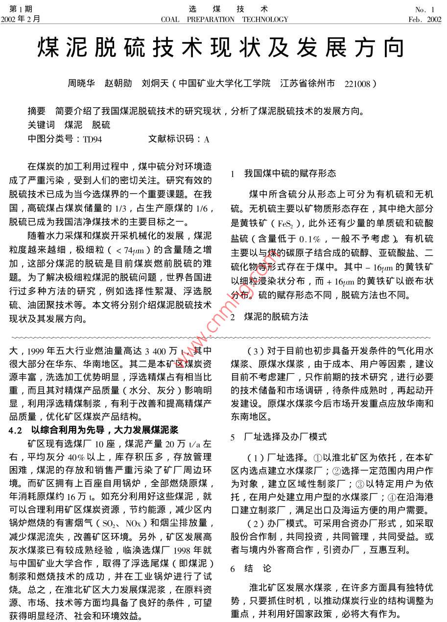 第1期選煤技術(shù)2002年2月COAL PREPARATION TECHNOLOGYFeb. 200淺談淮北礦區(qū)水煤漿技術(shù)開發(fā)李玉才江渭清(淮北礦業(yè)集團(tuán)煤質(zhì)運(yùn)銷處安徽省淮北市235006)摘要文章介紹了淮北礦區(qū)水煤漿技術(shù)開發(fā)的現(xiàn)狀、內(nèi)容、優(yōu)勢,提出了建議,展望了礦區(qū)發(fā)展水煤漿的前景。關(guān)鍵詞水煤漿技術(shù)開發(fā)建議展望中圖分類號:TQ536文獻(xiàn)標(biāo)識(shí)碼:A1前言大型企業(yè)?,F(xiàn)有生產(chǎn)礦井14對,年產(chǎn)原煤17Mt以水煤漿具有與油一樣的流動(dòng)性和良好的穩(wěn)定上,尚有1對在建礦井。生產(chǎn)選煤廠10座,設(shè)計(jì)性,便于裝卸、儲(chǔ)存、管道運(yùn)輸和泵送,可在爐中洗選加工能力15.8M/a,洗選加工工藝先進(jìn),裝備霧化燃燒。其燃燒效率高,有害物排放量低,是目精良,系統(tǒng)靈活,是華東地區(qū)重要的能源基地。前理想的代油、代煤、節(jié)能、清潔型燃料。礦區(qū)煤炭資源豐富,煤種齊全,煤炭品質(zhì)優(yōu)經(jīng)過20年的研究和開發(fā),我國與水煤漿技術(shù)良,含硫量特低,磷、砷等有害元素含量極少,可相關(guān)的制漿、儲(chǔ)運(yùn)、燃燒、工程等技術(shù)已趨成熟。曆性好。礦區(qū)地理位置優(yōu)越,交通便捷。各種水煤漿已分別在電站鍋爐、工業(yè)鍋爐、工業(yè)窯3.2現(xiàn)狀爐燃燒成功,取得了巨大的經(jīng)濟(jì)、社會(huì)和環(huán)境效淮北礦區(qū)水煤漿技術(shù)開發(fā)始自1998年。臨渙益。目前已經(jīng)形成了科研開發(fā)、設(shè)備制造、生產(chǎn)及選煤廠與中國礦業(yè)大學(xué)合作,取得了浮選尾煤制漿應(yīng)用完整的產(chǎn)業(yè)化體系。和燃燒技術(shù)的成功,建立了礦區(qū)第一個(gè)浮選尾煤制2水煤漿的市場前景漿生產(chǎn)線,且已在4t鍋爐上試燒成功目前已建立了課題組,確定了研究方向,初步1999年燃料行業(yè)統(tǒng)計(jì)資料表明,用于發(fā)電、石化、建材、冶金鋼鐵、化工五大行業(yè)的燃油約制訂了礦區(qū)水煤漿技術(shù)發(fā)展規(guī)劃。3400萬t,占全國燃油量的85%,若只將其中的33適合淮北礦區(qū)煤質(zhì)特點(diǎn)的水煤漿品種50%用水煤漿代替,每年可代油2000萬t以上?;幢钡V區(qū),水煤漿品種大致可分為4大類型5(1)據(jù)調(diào)查,安徽省內(nèi)五大行業(yè)每年消耗重油個(gè)品種52.4萬t,其中電廠燃油4.1萬t;江蘇省僅南京市(1)精煤水煤漿。選用浮選精煤(灰分小于年消耗重油量約10萬t;加上華東、華南及中南地10%)作為制漿原料,產(chǎn)品可作鍋爐代油燃料。區(qū)鍋爐燃燒重油量,數(shù)量非??捎^。若按2水煤(2)經(jīng)濟(jì)型水煤漿。考慮開發(fā)兩個(gè)品種,一是漿替代1t重油計(jì)算,僅安徽省內(nèi)每年就需要水煤選用原生煤泥(灰分15%~25%)作為制漿原料漿約105萬t,市場前景非常廣闊。產(chǎn)品可作鏈條鍋爐燃料。二是選用浮選尾煤作為制〔2〕用水煤漿代替煤炭在鍋爐中燃燒,環(huán)保效漿原料,產(chǎn)品可作沸騰爐、鏈條爐燃料。益好。省內(nèi)及華東地區(qū)大中城市采暖燃煤鍋爐數(shù)量(3)氣化用水煤漿。選用原煤(灰分小于大,這也是水煤漿的潛在用戶。25%)作制漿原料,產(chǎn)品可作德士古爐氣化造氣用(3)目前淮北礦區(qū)自用鍋爐年用煤量16萬原料左右,在臨渙選煤廠煤泥漿試燒成功后,全礦區(qū)鍋(4)原煤水煤漿。選用灰分大于20%原料爐均可考慮改燒煤泥漿。產(chǎn)品作工業(yè)窯爐燃料。3淮北礦區(qū)水煤漿開發(fā)條件4淮北礦區(qū)發(fā)展水煤漿建議3.1礦區(qū)簡介4.1以浮選精煤為原料,大力發(fā)展代油水煤漿淮北礦業(yè)(集團(tuán))有限責(zé)任公司是國有獨(dú)資特以華東地區(qū)用戶為重點(diǎn)供貨對象,在礦區(qū)以發(fā)收稿日期:2001-10-25展精煤水煤漿為重點(diǎn),尤其是發(fā)展以浮選精煤為制第1作者簡介:李玉才男,1952年生,高工,19年畢漿原料的精煤水煤漿。其有利條件如下:我國石油第1期選煤技術(shù)2002年2月COAL PREPARATION TECHNOLOGYFeb. 200煤泥脫硫技術(shù)現(xiàn)狀及發(fā)展方向周曉華趙朝勛劉炯天(中國礦業(yè)大學(xué)化工學(xué)院江蘇省徐州市221008)摘要簡要介紹了我國煤泥脫硫技術(shù)的研究現(xiàn)狀,分析了煤泥脫硫技術(shù)的發(fā)展方向。關(guān)鍵詞煤泥脫硫中圖分類號:TD94文獻(xiàn)標(biāo)識(shí)碼:A在煤炭的加工利用過程中,煤中硫分對環(huán)境造我國煤中硫的賦存形態(tài)成了嚴(yán)重污染,受到人們的密切關(guān)注。研究有效的脫硫技術(shù)已成為當(dāng)今選煤界的一個(gè)重要課題。在我煤中所含硫分從形態(tài)上可分為有機(jī)硫和無機(jī)國,高硫煤占煤炭儲(chǔ)量的13,占生產(chǎn)原煤的1陌6,硫。無機(jī)硫主要以礦物質(zhì)形態(tài)存在,其中絕大部分脫硫已成為我國潔凈煤技術(shù)的主要目標(biāo)之一是黃鐵礦(FeS3),此外還有少量的單質(zhì)硫和硫酸著水力采煤和煤炭開采機(jī)械化的發(fā)展,煤泥鹽硫(含量低于0.1%,一般不予考慮)有機(jī)硫粒度越來越細(xì),極細(xì)粒〔<74rm)的含量隨之增主要以與煤的碳原子結(jié)合成的硫醇、亞硫酸鹽、加,這部分煤泥的脫硫是目前煤炭燃前脫硫的難硫化物等形式存在于煤中。其中-16m的黃鐵礦題。為了解決極細(xì)粒煤泥的脫硫問題,世界各國進(jìn)以細(xì)粒浸染狀分布,而+16m的黃鐵礦以