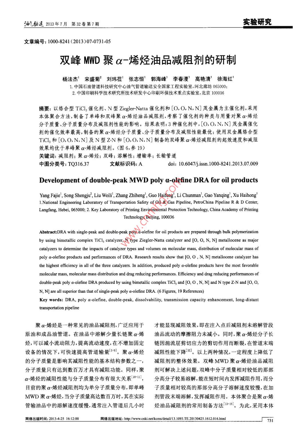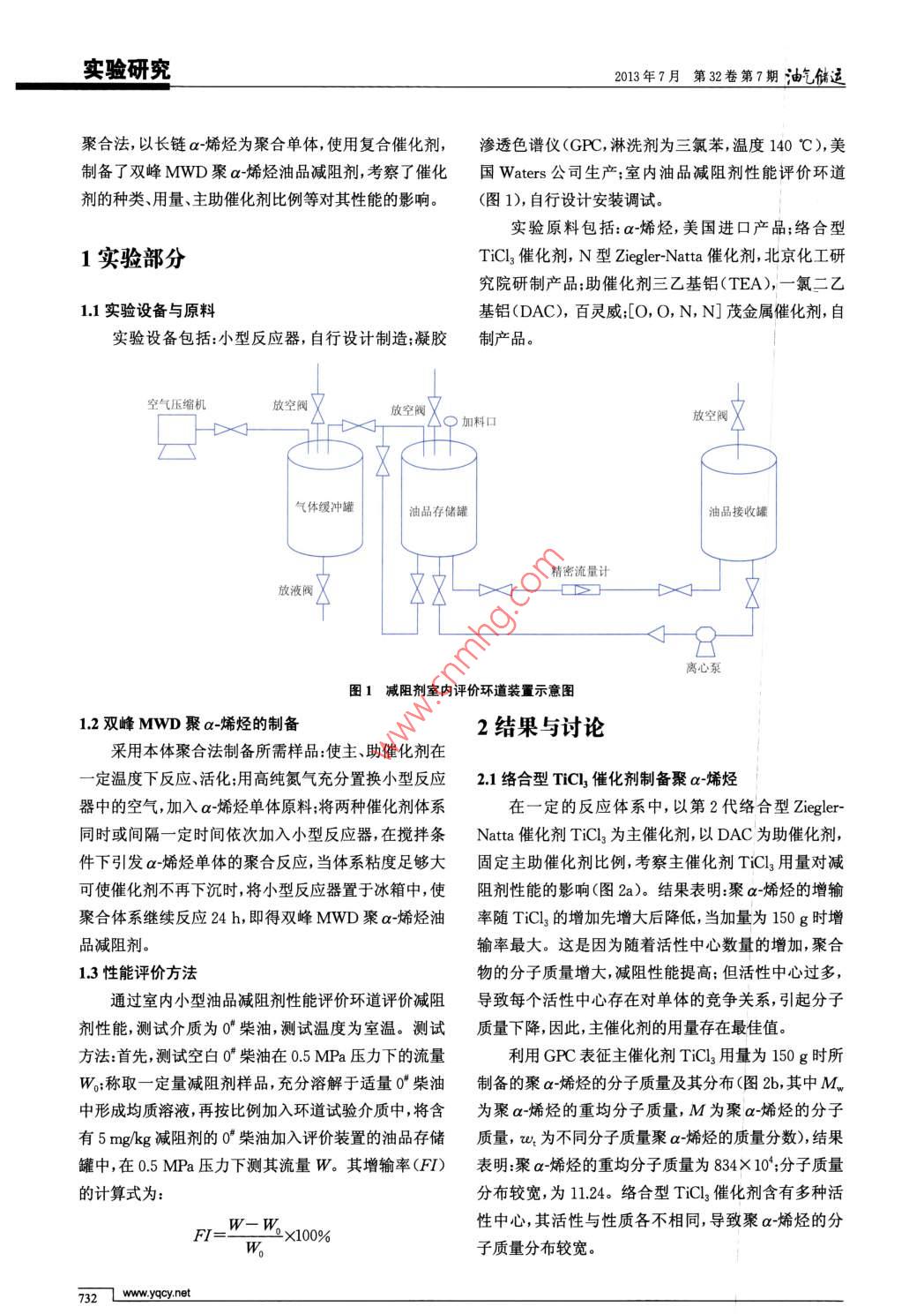 油氣儲運(yùn)2013年7月 第32卷 第7期實(shí)驗(yàn)研究_文章編號: 1000-8241 (2013)07-0731-05雙峰MWD聚a-烯烴油品減阻劑的研制楊法杰'宋盛菊’ 劉瑋蒞' 張志恒’ 鄡海峰’ 李春漫' 高艷清' 徐海紅'1.中國石油管道科技研究中心油氣管道輸送安全國家工程實(shí)驗(yàn)室,河北廊坊065000;2.中國印刷科學(xué)技術(shù)研究所技術(shù)研發(fā)中心印刷環(huán)保技術(shù)重點(diǎn)實(shí)驗(yàn)室,北京100036摘要:以絡(luò)合型TiCl,催化劑、N型Ziegler-Natta催化劑和[O, O, N, N]茂金屬為主催化劑,采用本體聚合方法,制備了單峰和雙峰聚a-烯烴油品減阻劑,考察了催化劑的種類與用量對聚a-烯烴分子質(zhì)量、分子質(zhì)量分布及減阻劑性能的影響。結(jié)果表明: 3種催化劑中,[O,0,N,N]茂金屬催化劑的催化效率最高,制備的聚a-烯烴分子質(zhì)量、分子質(zhì)量分布及減阻性能最優(yōu);使用雙金屬絡(luò)合型TiCl,和[O,O,N,N]及N型Z-N和[O,O,N,N]制備的雙峰聚a-烯烴減阻劑的起效速度和減阻效果均優(yōu)于單峰聚a-烯烴減阻劑。(圖6,參19)關(guān)鍵詞:減阻劑;聚a-烯烴;雙峰;溶解性;增輸率;長輸管道中圖分類號: TQ316.37文獻(xiàn)標(biāo)識碼: Adoi: 10.6047/jissn. 1000-8241.2013.07.009Development of double-peak MWD poly d.- olefine DRA for oil productsYang Fajie', Song Shengju', Liu Weili' , Zhang Zhiheng', Guo Haifeng', Li Chunman', Gao Yanqing , Xu Haihong'1.National Engineering Laboratory of Transportation Safety of Oil & Gas Pipeline, PetroChina Pipeline R & D Center,Langfang, Hebei, 065000; 2. Key Laboratory of Printing Environmental Protection Technology, China Academy of PrintingTechnology, Beijing, 100036Abstract:DRA with single peak and double-peak poly a-olefine for oil products are prepared through bulk polymerizationby using bimetallic complex TiCl, catalyzer, N type Ziegler-Natta catalyzer and [0, O, N, N] metallocene as majorcatalyzers to determine the impacts of catalyzer types and volumes on molecular mass, distribution of molecular mass ofpoly a-olefine products and performances of DRA. Research results show that [O, 0 , N, N] metallocene catalyzer hasthe highest efficiency in all of the three catalyzers. In addition, produced poly a-olefne products have the most favorablemolecular mass, molecular mass distribution and drag reducing performances. Efficiency and drag reducing performances ofdouble-peak poly a oleine DRA produced by using bimetallic complex TiCl, and [O, 0 , N, N] and N type Z-N and [0, 0,N, N] are all superior than that of single-peak poly a-olefine DRA. (6 Figures, 19 References)Key words: DRA, poly a-olefine, double-peak, dissolvability, transmission capacity enhancement, long-distanttransportation pipeline聚a-烯烴是一種常見的油品減阻劑,廣泛應(yīng)用于才能顯現(xiàn)減阻效果,即在注入點(diǎn)后減阻劑未溶解管段原油和成品油管道。在油品中溶解少量長鏈聚a-烯油品流動的摩擦阻力未減小。同時,聚a-烯烴分子長烴,可以減小流動阻力,提高流動速度,在不增加固定鏈因湍流層剪切應(yīng)力的剪切作用而斷裂,在管道末端設(shè)備的情況下,可快速提高管道輸量(1-9]。聚a-烯烴減阻性能下降(12]。以上兩種情況,一定程度上降低了的分子質(zhì)量是影響其減阻性能的基本結(jié)構(gòu)參數(shù)之一,減阻劑的整體效果。雙峰MWD聚a-烯烴油品減阻分子質(zhì)量只有達(dá)到數(shù)百萬才具有減阻功能。同樣,聚劑可解決上述問題,雙峰中分子質(zhì)量相對較低的那部a-烯烴的減阻性能與分子質(zhì)量分布有很大關(guān)系011,分高分子較易溶解,能在短時間內(nèi)發(fā)揮減阻作用,而分目前的聚a-烯烴減阻劑均為單分子質(zhì)量分布,即單峰子質(zhì)量相對較高的那部分高分子溶解速度較慢,在加MWD聚a-烯烴,當(dāng)分子質(zhì)量高達(dá)數(shù)百萬時,其在實(shí)際劑管段末端溶解,發(fā)揮減阻作用。本體聚合是聚a-烯管輸油品中的溶解速度緩慢,通常注入管道后幾小時烴油品減阻劑的常用制備方法13-19。為此,采用本體網(wǎng)絡(luò)出版時間: 2013-4-25 16:12:00網(wǎng)絡(luò)出版地址: hp:/:/ww cnki. netkcms/detai/13.1093.TE.20130425.1612.016.html廠731實(shí)驗(yàn)研究2013年7月第32 卷第7期油氣儲運(yùn)聚合法,以長鏈a-烯烴為聚合單體,使用復(fù)合催化劑,滲透色譜儀(GPC,淋洗劑為三氯苯,溫度140 C),美制備了雙峰MWD聚a-烯烴油品減阻劑,考察了催化國Waters公司生產(chǎn);室內(nèi)油品減阻劑性能評價環(huán)道劑的種類、用量、主助催化劑比例等對其性能的影響。(圖1),自行設(shè)計安裝調(diào)試。實(shí)驗(yàn)原料包括:a-烯烴,美國進(jìn)口產(chǎn)品;絡(luò)合型1實(shí)驗(yàn)部分TiCl3催化劑,N型Ziegler-Natta催化劑,北京化工研究院研制產(chǎn)品;助催化劑三乙基鋁(TEA),一氯二乙1.1實(shí)驗(yàn)設(shè)備與原料基鋁(DAC),百靈威;[O, O, N, N]茂金屬催化劑,自實(shí)驗(yàn)設(shè)備包括:小型反應(yīng)器,自行設(shè)計制造;凝膠制產(chǎn)品??諝鈮嚎s機(jī)放空閥__個-r放空閥文。4o加料口文F↓文(S|氣體緩沖罐油品存儲罐油品接收罐精密流量計放液閥44離心泵圖1減阻劑室內(nèi)評 價環(huán)道裝置示意圖1.2雙峰MWD聚a烯烴的制備2結(jié)果與討論采用本體聚合法制備所需樣品:使主、助催化劑在一定溫度 下反應(yīng)、活化;用高純氮?dú)獬浞种脫Q小型反應(yīng)2.1絡(luò)合型TiCl,催化劑制備聚a-烯烴器中的空氣,加入a-烯烴單體原料:將兩種催化劑體系在--.定的反應(yīng)體系中,以第2代絡(luò)合型Ziegler-同時或間隔一定時間依
