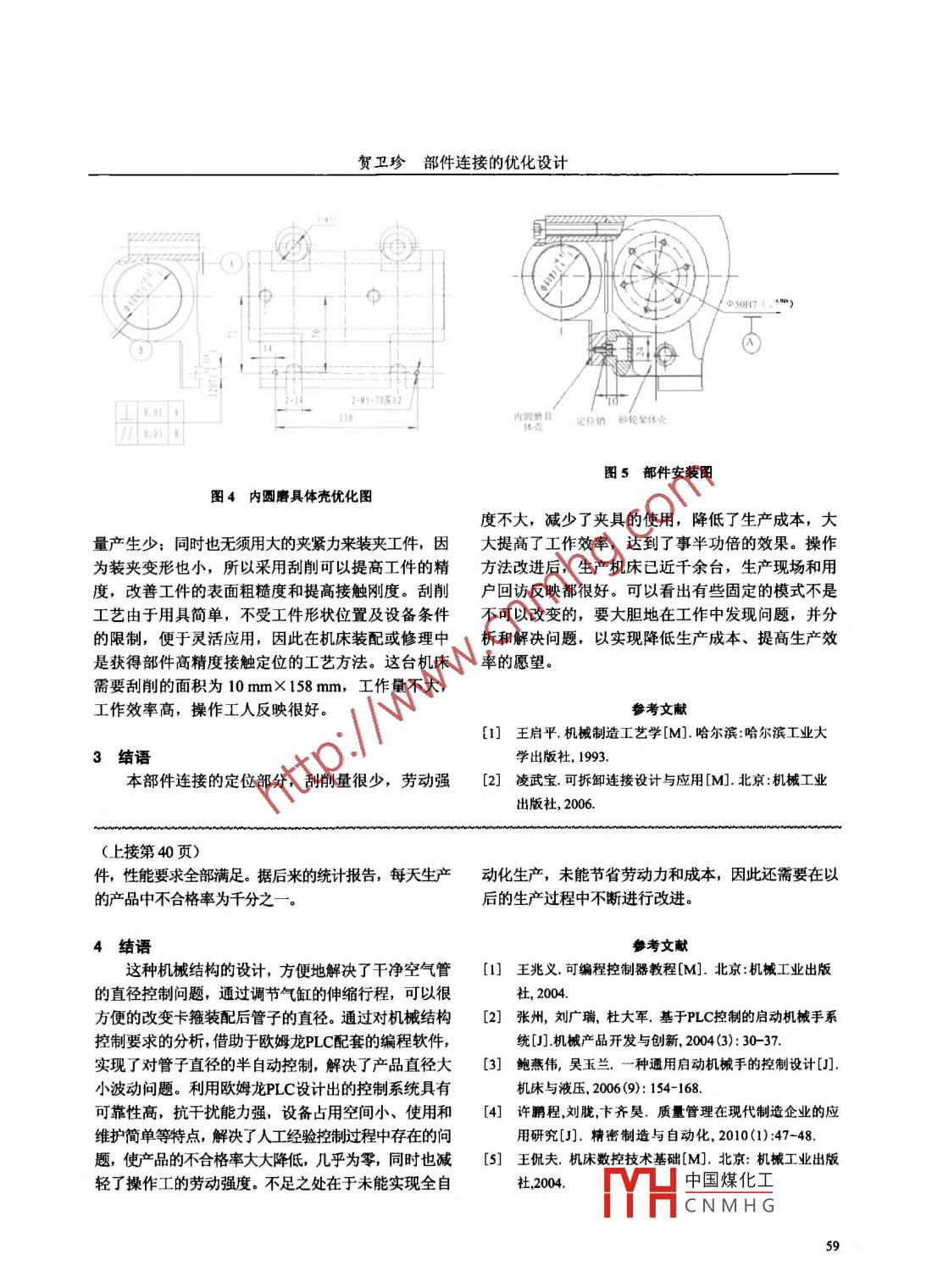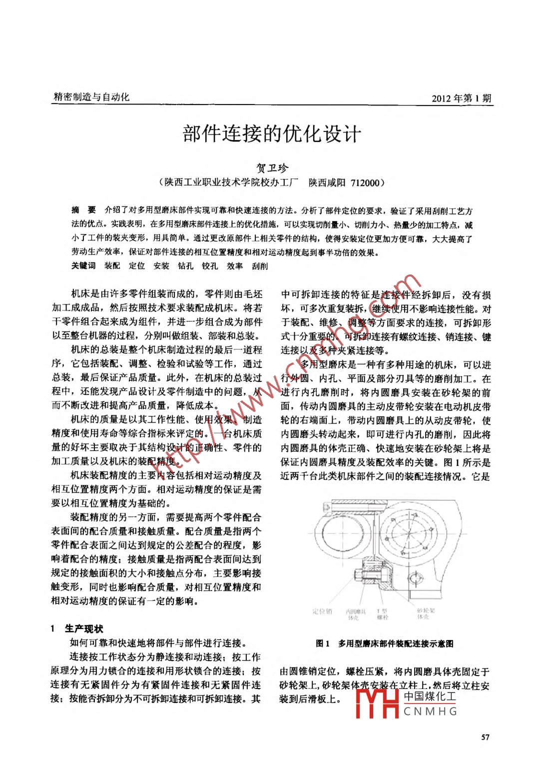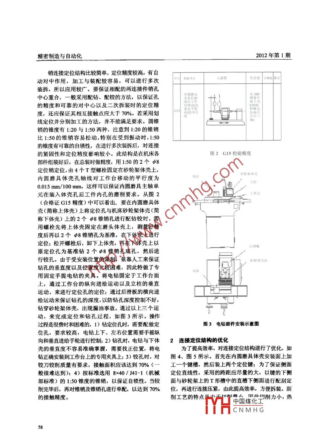 精密制造與自動(dòng)化2012年第1期銷連接定位結(jié)構(gòu)比較簡(jiǎn)單,定位精度較高,有自動(dòng)對(duì)中作用,加工與裝配較容易,可以進(jìn)行多次水日檢的項(xiàng)目示意圖允差值實(shí)測(cè)位備注裝拆,所以應(yīng)用較廣。要保證相配的兩連接件銷孔中心重合,一般采用配鉆、配鉸的方法,以保證孔內(nèi)圓磨頭在100線對(duì)工作的精度和可靠的對(duì)中心以及二次拆裝時(shí)的定位精臺(tái)移動(dòng)(在00151.度,還應(yīng)保證其相互接觸點(diǎn)應(yīng)大于70%。若采用劃G1s內(nèi))的平行度”線定位并分別加工的方法,并不能滿足要求。圓錐銷的錐度有1:20與1:50 兩種,注意到1:20的錐銷比1:50的錐銷容易松動(dòng),特別在受到振動(dòng)時(shí),1:50的錐度有可靠的自鎖性,在進(jìn)行多次裝拆后,對(duì)連接的緊固性和定位精度影響較小。此結(jié)構(gòu)是在機(jī)床各圖2 G15 檢驗(yàn)精度部件組裝好后,在總裝時(shí)做精度,用1:50的2個(gè)φ8定位銷定位,由4個(gè)T型螺栓固定在砂輪架體殼上, .砂輪架體殼內(nèi)圓磨具體殼孔軸線對(duì)工作臺(tái)移動(dòng)的平行度為立柱0.015 mm/100 mm,這樣可以保證內(nèi)圓磨具主軸單元在裝入體殼孔后工件內(nèi)孔的磨削要求。從圖2工作臺(tái)(合格證G15精度)中可以看出,要在內(nèi)圓磨具體殼(簡(jiǎn)稱上體殼).上將定位孔與機(jī)床砂輪架體殼(簡(jiǎn)廣稱下體殼)。上的2個(gè)φ8錐銷孔進(jìn)行配鉆鉸時(shí),需用螺栓先將.上體殼固定在磨頭體殼上,測(cè)量好精度后再以2個(gè)φ8 錐銷孔為基準(zhǔn),在下體殼上進(jìn)行定位;松開(kāi)螺栓后,卸下上體殼,再在下體殼上以原定位孔為基準(zhǔn)鉆2個(gè)φ8錐銷孔底孔,然后進(jìn)行鉸孔。由于受安裝位置的限制,依靠人工來(lái)保證砂輪體殼面鉆孔的垂直度以及位置度比較困難,因此特做了專鉆用固定手提電鉆的夾具。將電鉆固定于工作臺(tái)面上,通過(guò)工作臺(tái)的縱向進(jìn)給運(yùn)動(dòng)以及立柱的垂直運(yùn)動(dòng),來(lái)進(jìn)行定位孔的定位:通過(guò)后滑板的橫向進(jìn)給運(yùn)動(dòng)來(lái)保證鉆孔的深度,以防鉆孔深度控制不好,鉆穿砂輪架體殼,出現(xiàn)漏油事故。通過(guò)以上三個(gè)運(yùn)動(dòng),來(lái)完成定位和鉆孔過(guò)程,如圖3所示。操作過(guò)程是很費(fèi)時(shí)和困難的,1) 鉆定位孔時(shí),需要配做定圖3 電鉆部件安裝示意圖位孔,要求較高,電鉆上下、左右位置需要手搖縱向和垂直進(jìn)給手輪進(jìn)行控制: 2)鉆孔時(shí),電鉆與下體2連接定位結(jié)構(gòu)的優(yōu)化殼的垂直度不容易準(zhǔn)確掌握,需要找正位置,將電為了提高效率,對(duì)連接定位結(jié)構(gòu)進(jìn)行了優(yōu)化,如鉆正確安裝到工作臺(tái)上的專用夾具上; 3)鉸孔時(shí),對(duì)圖4、圖5所示。首先在內(nèi)圓磨具體殼安裝面上加鉸刀鉸削質(zhì)量有要求,接觸面積應(yīng)該達(dá)到70% (-工一個(gè)鍵槽,然后裝上兩個(gè)定位鍵;為了保證側(cè)面般很難達(dá)到); 4)按標(biāo)準(zhǔn)選用8x40/ J41-1 (機(jī)械定位直線性,采用的跨距應(yīng)盡量的大,以鍵的下側(cè)部標(biāo)準(zhǔn))的1:50錐度的錐銷,以保證自鎖性。當(dāng)鉸面與砂輪架上的T形槽中的直槽下側(cè)面進(jìn)行配刮定削完畢后,再對(duì)錐銷及錐銷孔進(jìn)行單配,以達(dá)到70%位,再進(jìn)行連接壓緊,由此提高效率,方便拆裝。刮的接觸精度。削工藝的特點(diǎn)是中手切削景小用此切削力小, 熱中國(guó)煤化工TYHCNMHG58賀衛(wèi)珍部件 連接的優(yōu)化設(shè)計(jì).zzzzz代=太開(kāi)中-φ50H7 (O用2-95-18612/-+-內(nèi)觀磨幾定位銷 妙輪架體光0.03可圖5部件安裝圖圖4內(nèi)圓磨具體殼優(yōu)化圖度不大,減少了夾具的使用,降低了生產(chǎn)成本,大量產(chǎn)生少:同時(shí)也無(wú)須用大的夾緊力來(lái)裝夾工件,因大提高了工作效率,達(dá)到了事半功倍的效果。操作為裝夾變形也小,所以采用刮削可以提高工件的精方法改進(jìn)后,生產(chǎn)機(jī)床已近千余臺(tái),生產(chǎn)現(xiàn)場(chǎng)和用度,改善工件的表面粗糙度和提高接觸剛度。刮削戶回訪反映都很好??梢钥闯鲇行┕潭ǖ哪J讲皇枪に囉捎谟镁吆?jiǎn)單,不受工件形狀位置及設(shè)備條件不可以改變的,要大膽地在工作中發(fā)現(xiàn)問(wèn)題,并分的限制,便于靈活應(yīng)用,因此在機(jī)床裝配或修理中析和解決問(wèn)題,以實(shí)現(xiàn)降低生產(chǎn)成本、提高生產(chǎn)效是獲得部件高精度接觸定位的工藝方法。這臺(tái)機(jī)床率的愿望。需要刮削的面積為10 mmX 158 mm,工作量不大,工作效率高,操作工人反映很好。.參考文獻(xiàn)[1] 王啟 平.機(jī)械制造工藝學(xué)[M].哈爾濱:哈爾濱工業(yè)大3結(jié)語(yǔ)學(xué)出版社, 1993.本部件連接的定位部分,刮削量很少,勞動(dòng)強(qiáng)[2] 凌武寶. 可拆卸連接設(shè)計(jì)與應(yīng)用[M].北京:機(jī)械工業(yè)出版社, 2006.(上接第40頁(yè))件,性能要求全部滿足。據(jù)后來(lái)的統(tǒng)計(jì)報(bào)告,每天生產(chǎn)動(dòng)化生產(chǎn),未能節(jié)省勞動(dòng)力和成本,因此還需要在以的產(chǎn)品中不合格率為千分之一。后的生產(chǎn)過(guò)程中不斷進(jìn)行改進(jìn)。4結(jié)語(yǔ)這種機(jī)械結(jié)構(gòu)的設(shè)計(jì),方便地解決了干凈空氣管[1] 王兆義. 