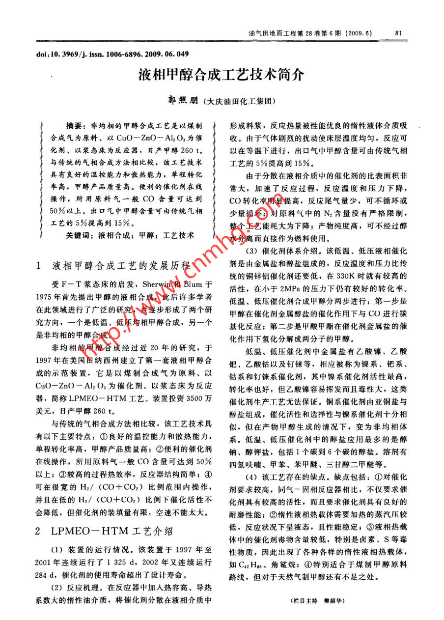 油氣田地面工程第28卷第6期(2009. 6)31doi:10. 3969/j. issn. 1006-6896. 2009.06. 049液相甲醇合成工藝技術(shù)簡(jiǎn)介郭照朋(大慶油田化工集團(tuán))摘要:非均相的甲醇合成工藝是以煤制形成料漿,反應(yīng)熱量被性能優(yōu)良的惰性液體介質(zhì)吸合成氣為原料、以CuO- ZnO- Al2O3為催收。由于氣體劇烈的擾動(dòng)使床層溫度均勻,反應(yīng)可化劑、以漿態(tài)床為反應(yīng)器,日產(chǎn)甲醇260 t。以在等溫下進(jìn)行,出口氣中甲醇含量可由傳統(tǒng)氣相與傳統(tǒng)的氣相合成方法相比較,該工藝技術(shù)工藝的5%提高到15%。具有良好的溫控能力和散熱能力,單程轉(zhuǎn)化由于分散在液相介質(zhì)中的催化劑的比表面積非率高,甲醇產(chǎn)品質(zhì)量高。便利的催化劑在線常大,加速了反應(yīng)過程,反應(yīng)溫度和壓力下降,操作,所用原料氣一般CO含量可達(dá)到CO轉(zhuǎn)化率明顯提高,反應(yīng)尾氣量少,可不循環(huán)或50%以上。出口氣中甲醇含量可由傳統(tǒng)氣相少量循環(huán);對(duì)原料氣中的N2含量沒有嚴(yán)格限制,整個(gè)工藝能耗大為下降;產(chǎn)物純度高,可不經(jīng)過醇關(guān)鍵詞:液相合成;甲醇;工藝技術(shù)水分離而直接作為燃料使用。(3)催化劑體系介紹。該低溫、低壓液相催化1液相甲醇合成工藝的發(fā)展歷程劑是由金屬鹽和醇鹽組成的,反應(yīng)溫度和壓力比傳統(tǒng)的銅鋅鋁催化劑還要低,在330K時(shí)就有較高的受F- T漿態(tài)床的啟發(fā),Sherwin 和Blum于活性,在小于2MPa的壓力下仍有較好的轉(zhuǎn)化率。1975年首先提出甲醇的液相合成,此后許多學(xué)者低溫、低壓催化劑合成甲醇分兩步進(jìn)行:第一步是在此領(lǐng)域進(jìn)行了廣泛的研究,并逐步形成了兩個(gè)研甲醇在催化劑金屬醇鹽的催化作用下與CO進(jìn)行羰究方向,一個(gè)是低溫、低壓均相甲醇合成,另一個(gè)基化反應(yīng);第二步是甲酸甲酯在催化劑金屬鹽的催是非均相的甲醇合成。化作用下氫化分解成兩分子的甲醇。.非均相的甲醇合成經(jīng)過近20年的研究,于低溫、低壓催化劑中金屬鹽有乙酸鎳、乙酸1997年在美國田納西州建立了第一套液相甲醇合鈀、乙酸鈷以及釘錸等,相應(yīng)被稱為鎳系、鈀系、成的示范裝置,它是以煤制合成氣為原料、以鈷系和釕錸系催化劑,其中鎳系催化劑活性最高,Cu0- ZnO - Al2O3為催化劑、以漿態(tài)床為反應(yīng)轉(zhuǎn)化率也好,但乙酸鎳容易揮發(fā)而且毒性大,這類器,簡(jiǎn)稱LPMEO- HTM工藝。裝置投資3500萬催化劑生產(chǎn)工藝無法保證。銅系催化劑由亞銅鹽與美元,日產(chǎn)甲醇260 t.醇鹽組成,催化活性和選擇性與鎳系催化劑十分相與傳統(tǒng)的氣相合成方法相比較,該工藝技術(shù)具似,但在產(chǎn)物甲醇生成的情況下,變?yōu)榉蔷囿w有以下主要特點(diǎn):①良好的溫控能力和散熱能力,系。低溫、低壓催化劑中的醇鹽應(yīng)用最多的是醇單程轉(zhuǎn)化率高,甲醇產(chǎn)品質(zhì)量高;②便利的催化劑鈉、醇鉀鹽,包括1個(gè)碳到6個(gè)碳的醇鹽。溶劑有在線操作,所用原料氣一般CO含量可達(dá)到50%四氫呋喃、甲苯、苯甲醚、三甘醇二甲醚等。以上;③較高的過程熱效率,反應(yīng)器結(jié)構(gòu)簡(jiǎn)單;④(4)該工藝存在的缺點(diǎn)。缺點(diǎn)包括:①對(duì)催化可在很寬的H2/ (CO+CO2)比例范圍內(nèi)操作,劑要求較高,同氣-固相反應(yīng)器相比,不僅要求催并且在低的H2/ (CO+CO2)比例下催化活性不化劑具有較高的活性,而且要求催化劑具有良好的會(huì)降低,但催化劑的裝填量有限,空速不能太大。耐磨性能;②惰性液相熱載體需要加熱的蒸汽壓較2 LPMEO-HTM工藝介紹低,反應(yīng)狀況下呈液態(tài),且性能穩(wěn)定;③液相熱載.體中的催化劑毒物含最較低,特別是鹵素、S等毒.(1)裝置的運(yùn)行情況。該裝置于1997年至性物質(zhì),因此出現(xiàn)了各種各樣的惰性液相熱載體,2001年連續(xù)運(yùn)行了1325d,2002年又連續(xù)運(yùn)行如CqzH8、角鯊?fù)?④特別適合于煤制甲醇原料284 d,催化劑的使用壽命超出了設(shè)計(jì)壽命。路線,但對(duì)于天然氣制甲醇還有不足之處。(2)反應(yīng)機(jī)理。在反應(yīng)器中加人熱容高、導(dǎo)熱系數(shù)大的惰性油介質(zhì),將催化劑分散在液相介質(zhì)中(欄目主持樊韶華)
