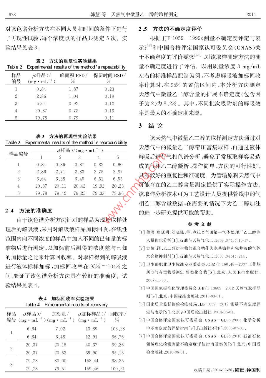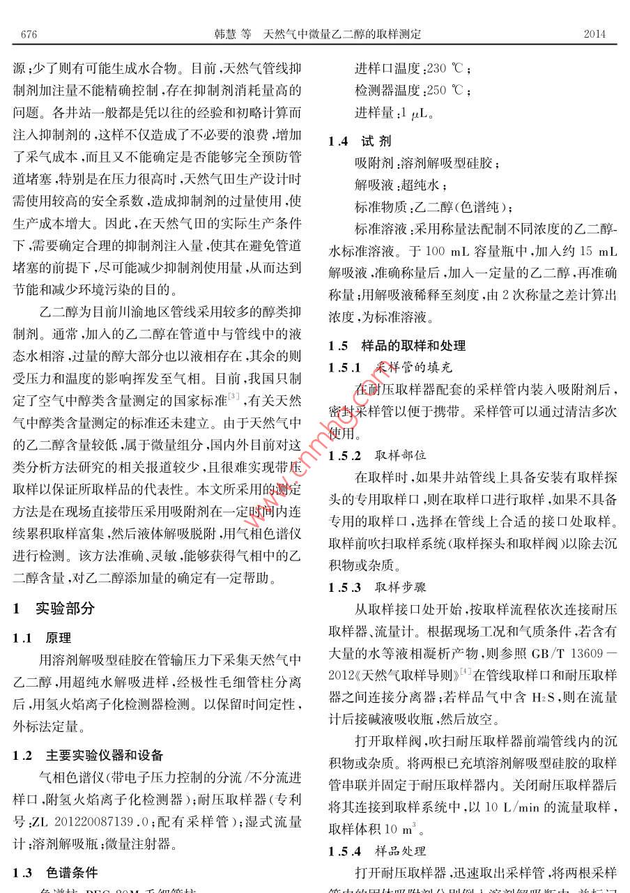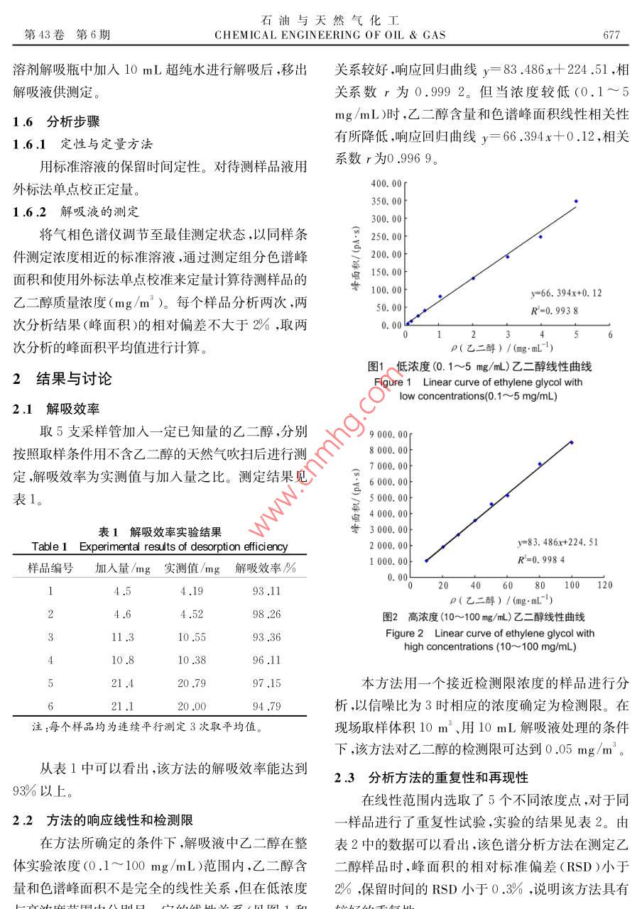 石油與天然氣化工第43卷第6期CHEMICAL ENGINEERING OF OIL gas675UREMENT AND天然氣中微量乙二醇的取樣測定韓慧王曉琴分析計量與標準化(1.中國石油西南油氣田公司天然氣研究院)(2,石油工業(yè)天然氣質(zhì)量監(jiān)督檢驗中摘要夭然氣采出后通過人工注入乙二醇作為水合物抑制劑,以預防設備和管道的堵塞。建立可行有效的夭然氣中微量乙二醇取樣測定方法,有利于對乙二醇加注量的指導。本方法采用溶劑解吸型硅膠在管輸壓力下富集夭然氣中微量的♂二醇,再通過液體解吸后進行氣相色譜分析在現(xiàn)場取樣體積10m3、用10mL解吸液處理的條件下,乙二醇的檢測限可達到0.05mg/m。關鍵詞天然氣乙二醇取樣氣相色譜分析中圖分類號:TE648文獻標志碼:ADO1:10.3969/isn.10073426.2014.06.020Sampling and determination of trace ethylene glycol in natural gasHan Hui, Wang Xiaoqin( Research Institute of Natural gas Technology of Petro China Southwest Oil GasfieldCom pany, Chengdu 610213, Sichuan, China; 2. Natural Gas Quality Supervision andIns pection Center for Pertoleum Industry, Chengdu 610213, Sichuan, China)Abstract Natural gas after produced is often served as a hy drate inhibitor by manual injectionof ethy lene glycol to prevent plugging of equipment and pipeline. The viable and effective methodwas established for sampling and determination of trace ethy lene glycol in natural gas. It's beneficial guidance to the injection amount of ethy lene glycol. The trace ethy lene glycol in natural gaswas enriched w ith the solvent desorption silica gel under pipeline pressure, and then desorptionliquid was analyzed by gas chromatography after desorbing. The detection limits of ethy lene glycol can reach 0.05 mg/m when the sample volume is 10 m and the liquid used for desorption isKey words: natural gas, ethylene glycol, sampling, gas chromatography analyze天然氣中的乙二醇主要為人工采出后為脫水和合物而堵塞設備和管道,影響裝置的正常操作和安防凍而人為添加所引入的2。通常的氣井采出物全平穩(wěn)運行,通??稍诘蜏胤蛛x工藝中注入水合物不僅僅是天然氣,而且還含有油、水、沙、巖屑等雜抑制劑。抑制劑注入量的多少對低溫分離工藝非常質(zhì)。為了防止天然氣在輸往處理站的過程中形成水重要,注入量多了,注醇泵的功率消耗較大,浪費能基金項目:2012年國家質(zhì)檢公益科研專項項目“天然氣互換性技術和標準研究”(201210235)作者簡介:韓慧(1980—),女,2008年6月畢業(yè)于四川大學分析化學專業(yè),研究生,理學碩士,現(xiàn)任職于中國石油西南油氣676韓慧等天然氣中微量乙二醇的取樣測定2014源;少了則有可能生成水合物。目前,天然氣管線抑進樣口溫度:230℃制劑加注量不能精確控制,存在抑制劑消耗量高的檢測器溫度:250℃;問題。各井站一般都是憑以往的經(jīng)驗和初略計算而進樣量:1L注入抑制劑的,這樣不僅造成了不必要的浪費增加14試劑了采氣成本,而且又不能確定是否能夠完全預防管吸附劑:溶劑解吸型硅膠;道堵塞,特別是在壓力很高時,天然氣田生產(chǎn)設計時解吸液:超純水;需使用較高的安全系數(shù),造成抑制劑的過量使用,使標準物質(zhì):乙二醇(色譜純);生產(chǎn)成本增大。因此,在天然氣田的實際生產(chǎn)條件標準溶液:采用稱量法配制不同濃度的乙二醇-下,需要確定合理的抑制劑注入量,使其在避免管道水標準溶液。于100mL容量瓶中,加入約15mL堵塞的前提下,盡可能減少抑制劑使用量,從而達到解吸液,準確稱量后,加入一定量的乙二醇,再準確節(jié)能和減少環(huán)境污染的目的。稱量;用解吸液稀釋至刻度,由2次稱量之差計算出乙二醇為目前川渝地區(qū)管線采用較多的醇類抑濃度,為標準溶液。制劑。通常,加入的乙二醇在管道中與管線中的液態(tài)水相溶,過量的醇大部分也以液相存在,其余的則1.5樣品的取樣和處理受壓力和溫度的影響揮發(fā)至氣相。目前,我國只制1.5.1采樣管的填充在耐壓取樣器配套的采樣管內(nèi)裝入吸附劑后定了空氣中醇類含量測定的國家標準3,有關天然氣中醇類含量測定的標準還未建立。由于天然氣中密封采樣管以便于攜帶。采樣管可以通過清潔多次的乙二醇含量較低,屬于微量組分,國內(nèi)外目前對這使用。1.5.2取樣部位類分析方法研究的相關報道較少,且很難實現(xiàn)帶壓取樣以保證所取樣品的代表性。本文所采用的測定在取樣時,如果井站管線上具備安裝有取樣探頭的專用取樣口,則在取樣口進行取樣,如果不具備方法是在現(xiàn)場直接帶壓采用吸附劑在一定時間內(nèi)連續(xù)累積取樣富集,然后液體解吸脫附,用氣相色譜儀專用的取樣口,選擇在管線上合適的接口處取樣取樣前吹掃取樣系統(tǒng)(取樣探頭和取樣閥)以除去沉進行檢測。該方法準確、靈敏,能夠獲得氣相中的乙積物或雜質(zhì)。醇含量,對乙二醇添加量的確定有一定幫助。1.5.3取樣步驟1實驗部分從取樣接口處開始,按取樣流程依次連接耐壓1.1原理取樣器、流量計。根據(jù)現(xiàn)場工況和氣質(zhì)條件,若含有用溶劑解吸型硅膠在管輸壓力下采集天然氣中大量的水等液相凝析產(chǎn)物,則參照GB/T13609乙二醇,用超純水解吸進樣,經(jīng)極性毛細管柱分離2012《天然氣取樣導則》在管線取樣口和耐壓取樣后,用氫火焰離子化檢測器檢測。以保留時間定性,器之間連接分離器;若樣品氣中含H2S,則在流量外標法定量計后接堿液吸收瓶,然后放空打開取樣閥,吹掃耐壓取樣器前端管線內(nèi)