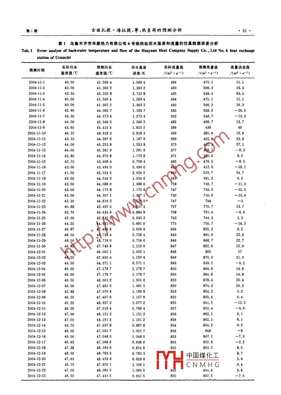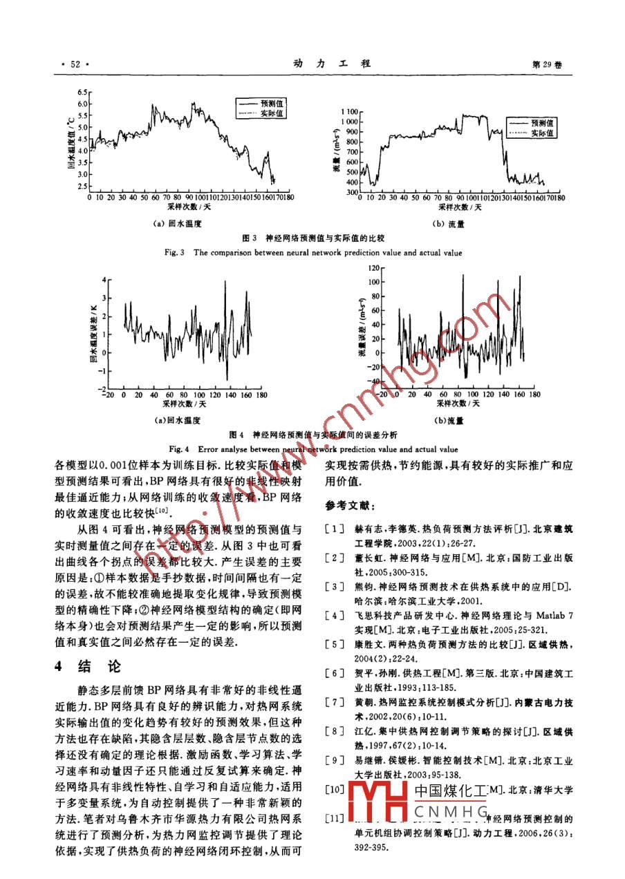 第29卷第1期動力工程Vol 29 No. 12009年1月Journal of Power engineeringJan.2009文章編號:1000-6761(2009)01-0049-04中圖分類號:TP393.09文獻(xiàn)標(biāo)識碼:A學(xué)科分類號:510.40熱負(fù)荷的預(yù)測分析古麗扎提·海拉提1,加瑪力汗·庫馬什1,李俊2,李金龍2(1.新疆大學(xué)電氣工程學(xué)院,烏魯木齊830008;2.烏魯木齊市華源熱力有限公司,烏魯木齊830054)摘要:應(yīng)用 Matlab神經(jīng)網(wǎng)絡(luò)工具箱函數(shù),建立了可用于熱網(wǎng)供暖短期預(yù)測的前向反饋BP網(wǎng)絡(luò)模型,并根據(jù)烏魯木齊市華源熱力公司的實(shí)際供熱網(wǎng)絡(luò)數(shù)據(jù),對所建立的網(wǎng)絡(luò)進(jìn)行了訓(xùn)練和檢驗結(jié)果表明:該模型具有較好的預(yù)測特性,為熱網(wǎng)監(jiān)控與調(diào)節(jié)提供了依據(jù),從而可實(shí)現(xiàn)按需供熱,節(jié)約能源關(guān)鍵詞:熱力網(wǎng);熱負(fù)荷;神經(jīng)網(wǎng)絡(luò);短期預(yù)測;BP網(wǎng)絡(luò)Prediction Analysis of heat loadGulzat Hailati', Jamalihan Kumashi, LI Jun', LI Jin-long(l. Electrical Engineering College, XinJiang University, Urumchi 830008, China;2. Huayuan Heat Supply Co, Ltd. of Urumchi, Urumchi 830054, China)Abstract: Based on the Matlab neural network toolbox, a forward feedback BP network model was built topredict short-term heat demand for heat-supply network. The actual data from Huayuan Heat Supply Co.Ltd. of Urumchi was used to train and verify the network model. results show that the model has betterprediction characteristic. The model provides theory basis for heat network monitor and regulation, so theheat supply can be accomplished according to the demand, and power consumption can be reduced at thesame timeKey words: heat supply network; heat load; neural network; short-term prediction; BP network應(yīng)用計算機(jī)監(jiān)測和控制熱網(wǎng)系統(tǒng)的運(yùn)行,由此從而實(shí)現(xiàn)按需供熱,節(jié)約能源采集的眾多數(shù)據(jù)只起到對運(yùn)行工況的監(jiān)督作用,而沒有用于熱網(wǎng)的優(yōu)化運(yùn)行及調(diào)度如果根據(jù)所采集1BP網(wǎng)絡(luò)與學(xué)習(xí)算法的數(shù)據(jù)分析供熱負(fù)荷的大小、特征及變化規(guī)律,實(shí)現(xiàn)BP網(wǎng)絡(luò)是一種多層前饋神經(jīng)網(wǎng)絡(luò),其神經(jīng)元的對未來的負(fù)荷和特性進(jìn)行預(yù)測,對熱網(wǎng)動態(tài)系統(tǒng)實(shí)變換函數(shù)是S型函數(shù),由于權(quán)值的調(diào)整采用反向傳行前饋監(jiān)督控制,避免運(yùn)行人員操作的盲目性才能播的學(xué)習(xí)算法,因此稱其為BP網(wǎng)絡(luò).BP網(wǎng)絡(luò)的優(yōu)真正體現(xiàn)出計算機(jī)控制的優(yōu)勢.筆者應(yīng)用 Matlab神勢主要表現(xiàn)在模式匹配、模式分類、模式識別和模式經(jīng)網(wǎng)絡(luò)工具箱函數(shù),建立了可用于熱網(wǎng)供暖短期預(yù)分析等方面,可用于復(fù)雜類的模式識別、語言識別測的前向反饋BP網(wǎng)絡(luò)模型.這將為供熱系統(tǒng)負(fù)荷自適應(yīng)目標(biāo)識別和函數(shù)逼近等領(lǐng)域預(yù)測提供理論依據(jù)積累實(shí)際運(yùn)行的調(diào)節(jié)經(jīng)驗12作隨珊可概挺為網(wǎng)絡(luò)某一層的處中國煤化工收稿日期:20080505修訂日期:2008-06-02CNMHG基金項目:烏魯木齊華源熱力有限公司供熱系統(tǒng)熱負(fù)荷調(diào)節(jié)控制研究資助項目作者簡介;古麗扎提·海拉提(1985-),女,哈薩克族新疆富蘊(yùn)縣人士研究生,研究方向為:電氣控制與仿真HR(Tel):1399992492E-mail:glzt128@gmail.com.29理單元接受來自所有較低層次的信號,然后將這些信號按照一定的規(guī)則處理后送給較高層次的處理單YAD元權(quán)值的更新按BP算法從最高層次向最低層次進(jìn)行,并通過改變增益項和動量因子的大小來調(diào)整y(k+1)權(quán)值.BP算法旨在求誤差函數(shù)的最小值,誤差函數(shù)的權(quán)值調(diào)整是一個始于輸出層的反向傳播遞歸過圖1神經(jīng)網(wǎng)絡(luò)辨識熱網(wǎng)的動態(tài)系統(tǒng)Fig 1 Sketch of neural network system for heat supply程,即誤差項的傳播方向與信息的傳播方向相反,通network dynamic identification system過對多個樣本的反復(fù)訓(xùn)練并向減小誤差的方向修改報提供依據(jù)權(quán)值,直到達(dá)到滿意的精度為止BP網(wǎng)絡(luò)模型的系統(tǒng)采用3層網(wǎng)絡(luò)結(jié)構(gòu),隱含層圖1為神經(jīng)網(wǎng)絡(luò)辨識熱網(wǎng)動態(tài)系統(tǒng)的示意圖.和輸出層激活函數(shù)可選擇 tan s1g和 purelin函數(shù),其中,A為被辨識的熱網(wǎng)動態(tài)系統(tǒng);B為由神經(jīng)網(wǎng)路tan $1g函數(shù)的表達(dá)式為:構(gòu)成的一個辨識模型;d為系統(tǒng)干擾,即室外溫度T圖中A與B是并聯(lián)的將輸入x(k)-T(k),qmf i(r)=tanh([)=i-exp(+ exp((k)同時加到A和B上,測量其輸出y(k+1)purelin函數(shù)的表達(dá)式為:(k+1)和Th(k+1),并利用誤差e(k+1)=Th(k+f2(r)= k(2)1)-Th(k+1)修正B的參數(shù)使e(k+1)趨近于0輸出為:此時辨識模型B能很好地近似熱網(wǎng)動態(tài)系統(tǒng)Ay,=f2[(∑f1(x·v-)·w-.](3)筆者結(jié)合烏魯木齊市華源熱力有限公司供暖的實(shí)際情況,提取了輸入樣本數(shù)據(jù).該熱力有限公司1式中:x為供熱網(wǎng)輸入?yún)?shù);w為輸入層節(jié)點(diǎn)i至隱含層節(jié)點(diǎn)j之間的權(quán)值;6,為隱含層節(jié)點(diǎn)j的閾天采集3次數(shù)據(jù),即每8h做1次數(shù)據(jù)記錄,取值;